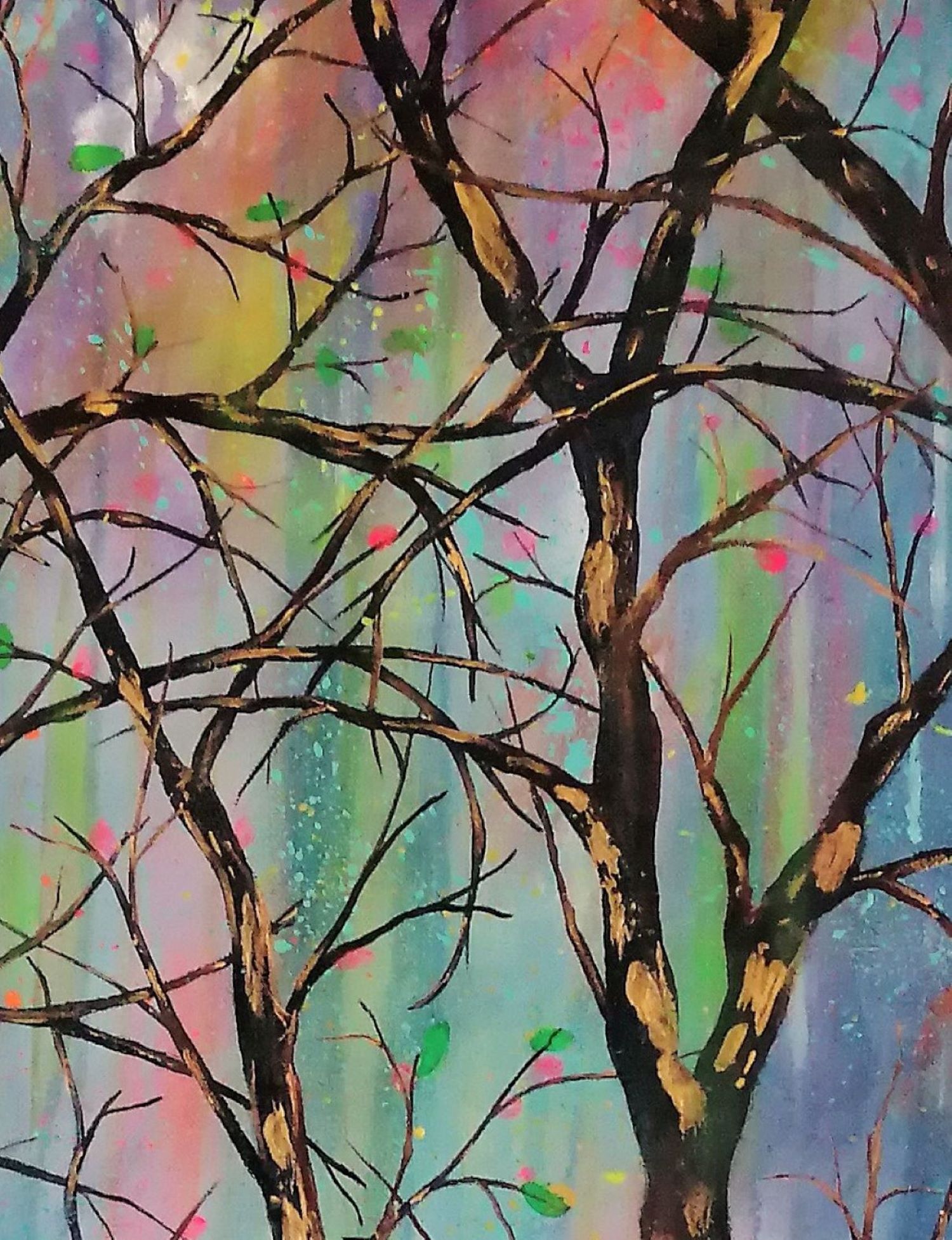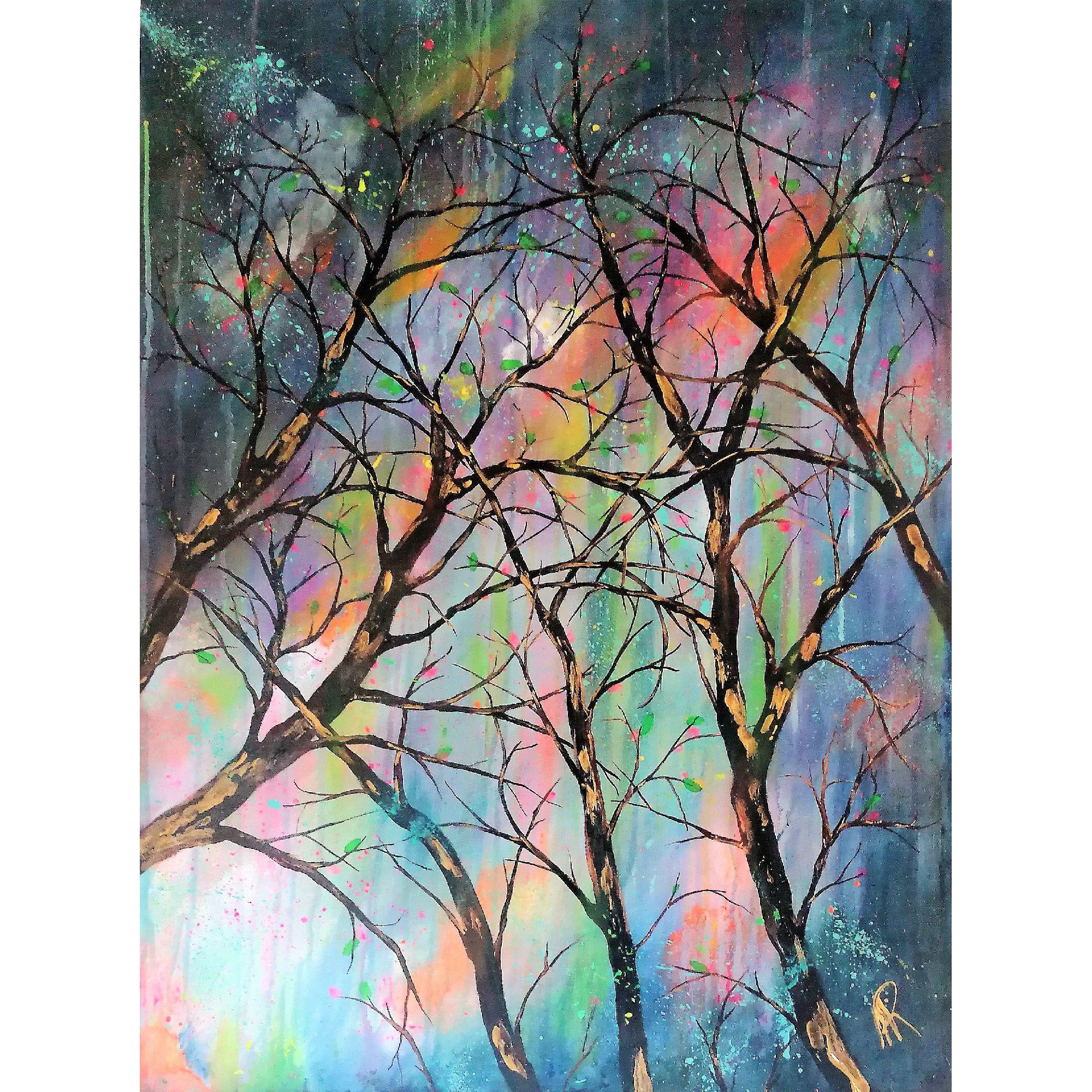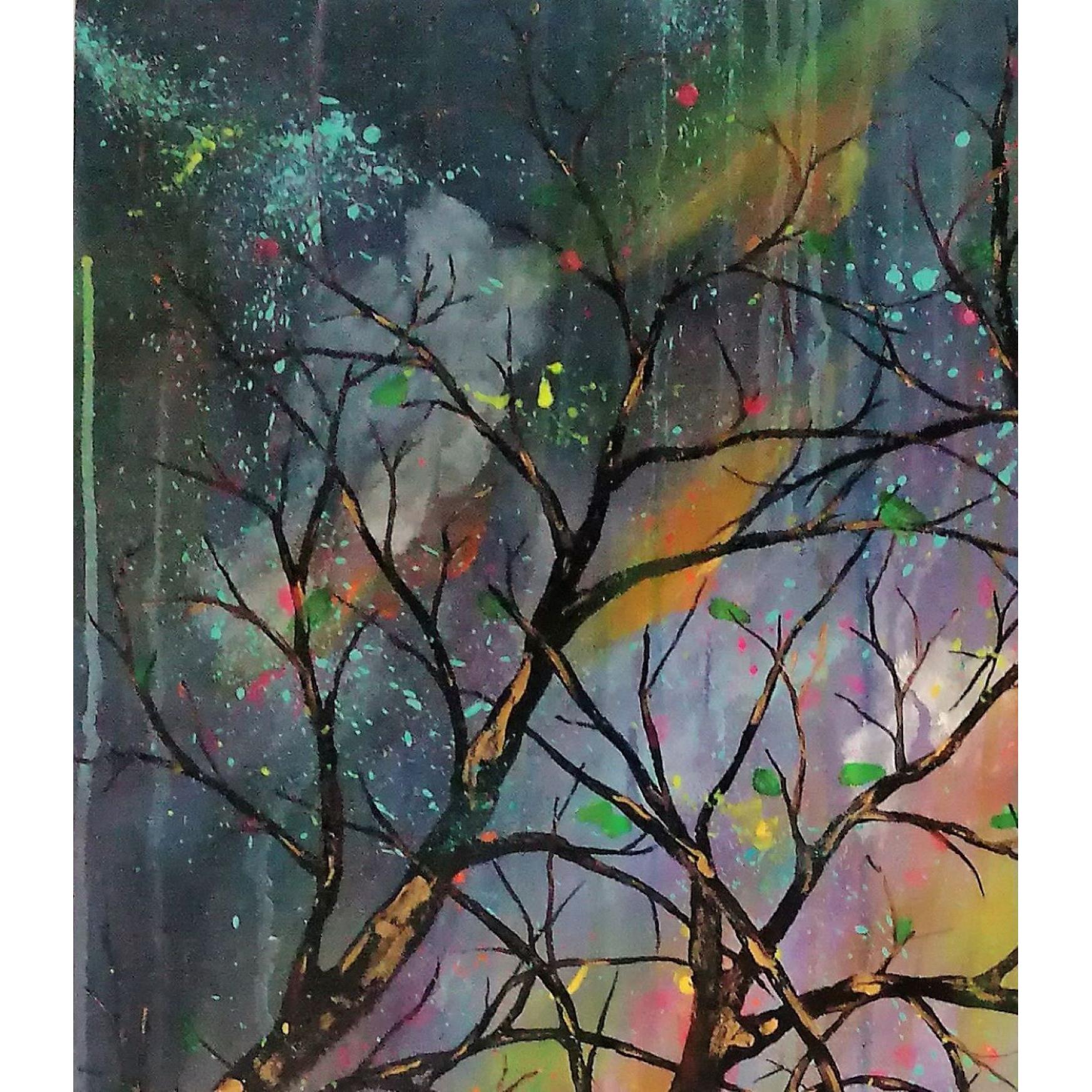 Ce châssis entoilé de 73x54x3.5 cm propose le spectacle du printemps qui revient, dans une symphonie de couleurs et l'apparition, la naissance de petites fleurs et feuilles éparses sur les branches. Acrylique. Finition vernis.