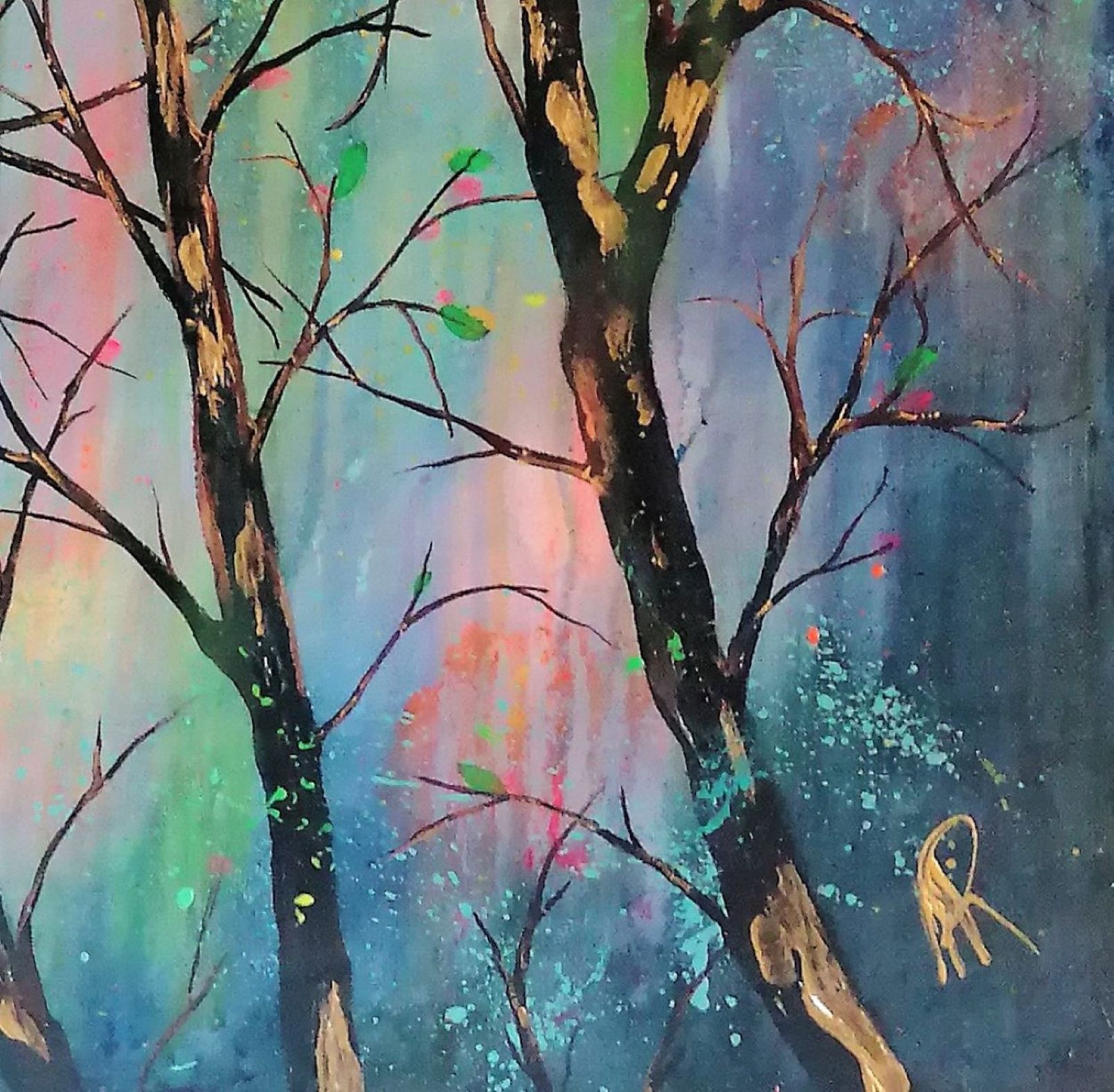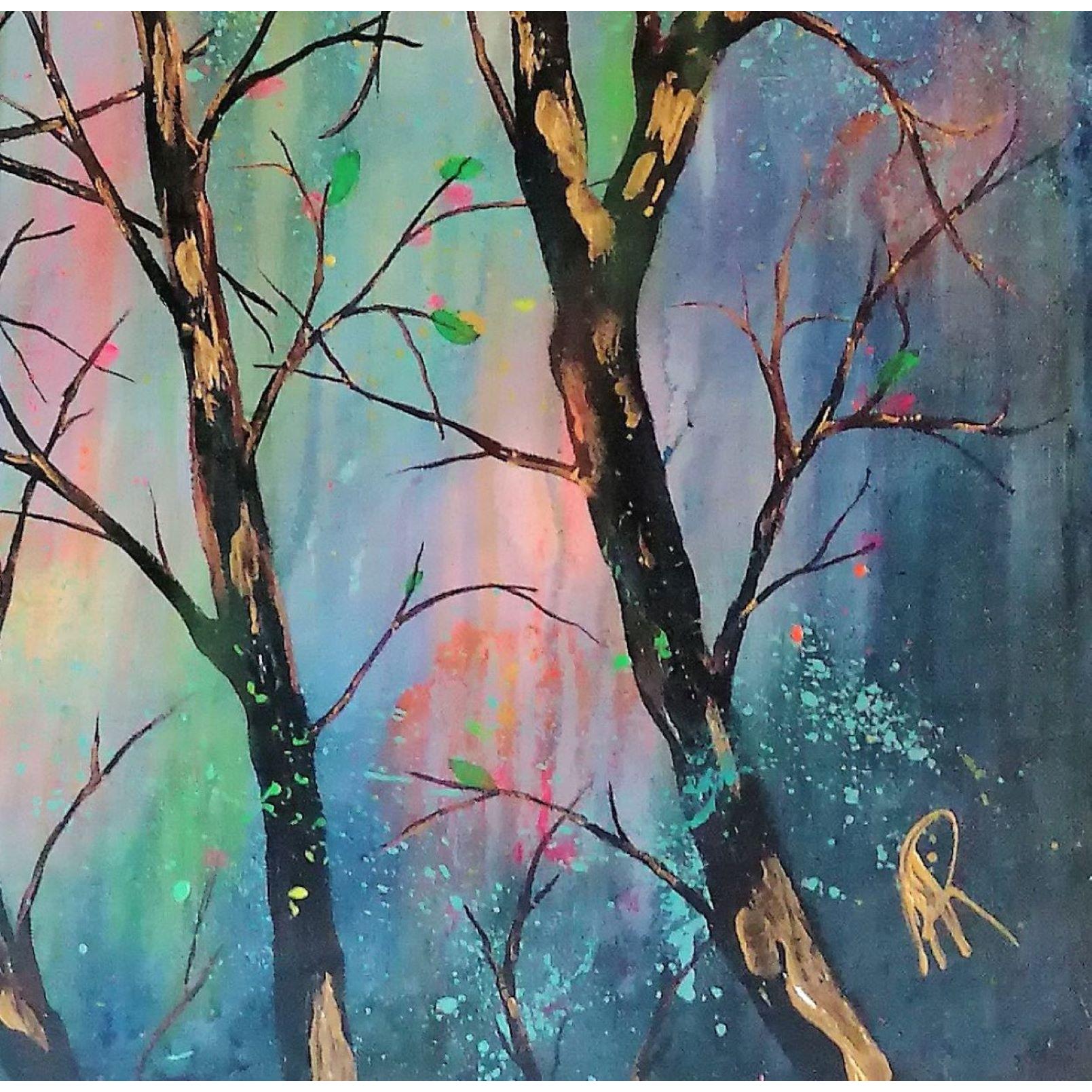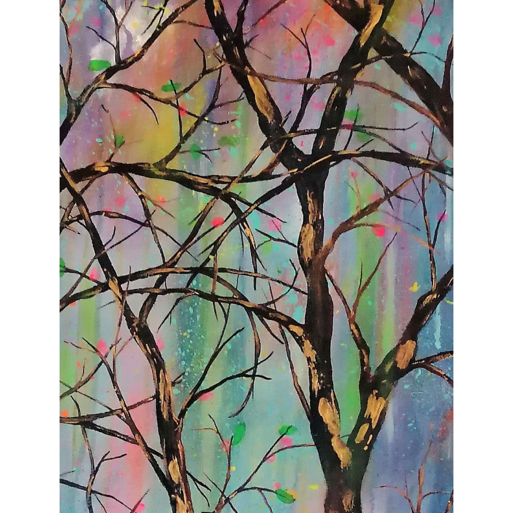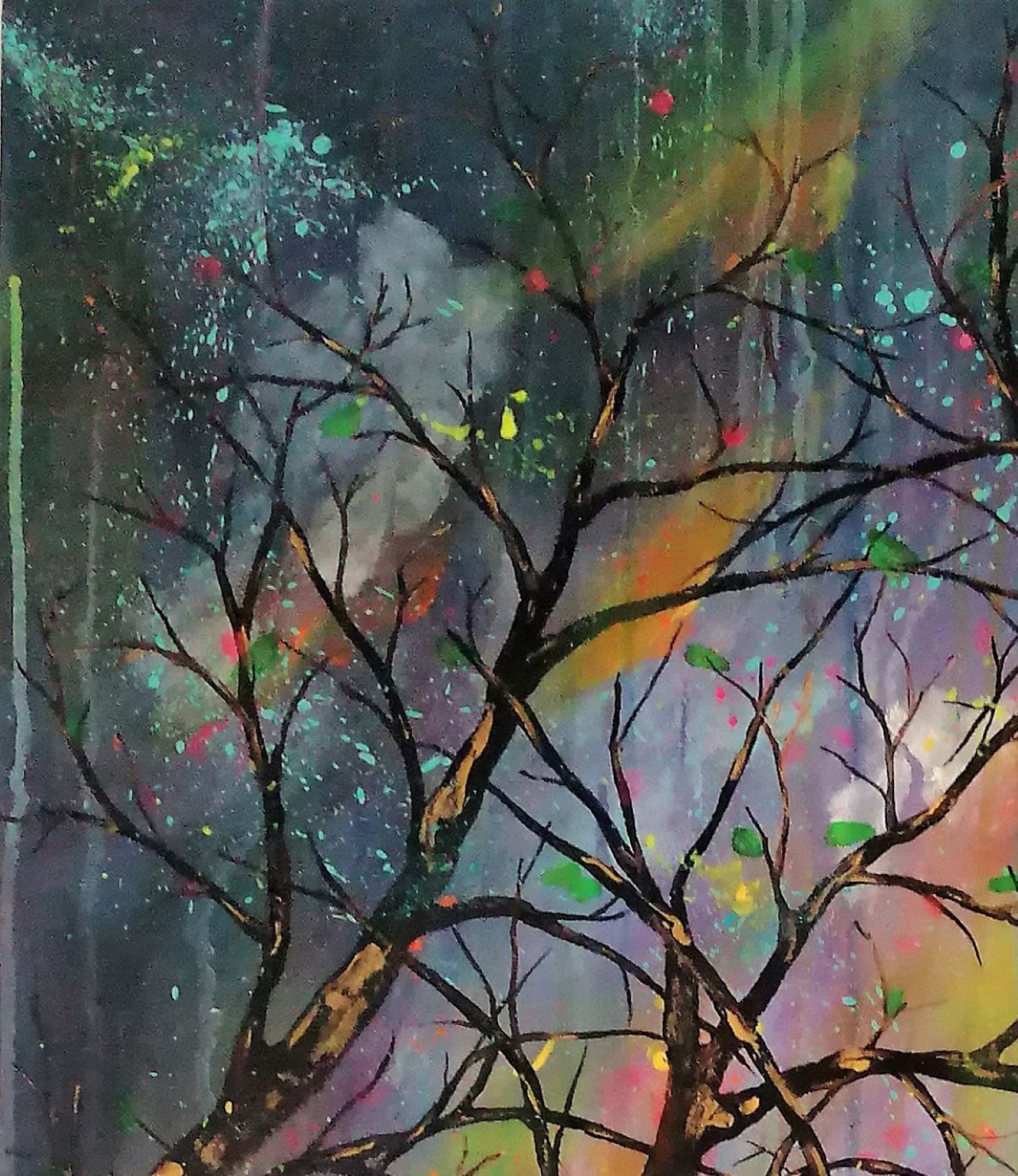 Ce châssis entoilé de 73x54x3.5 cm propose le spectacle du printemps qui revient, dans une symphonie de couleurs et l'apparition, la naissance de petites fleurs et feuilles éparses sur les branches. Acrylique. Finition vernis.