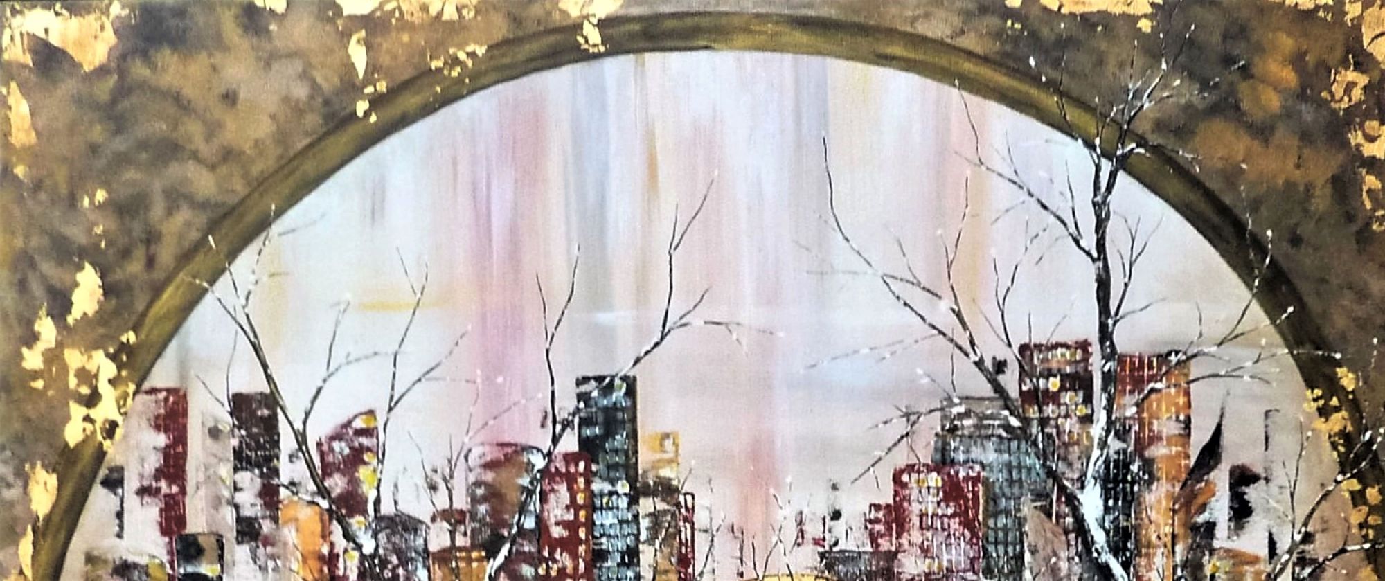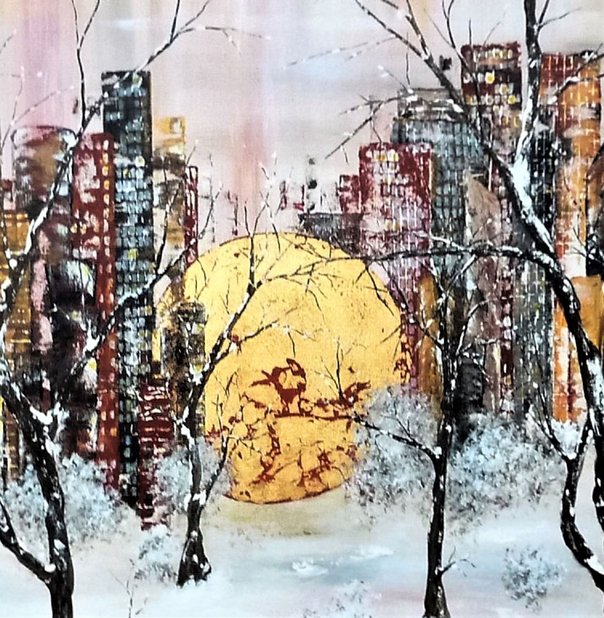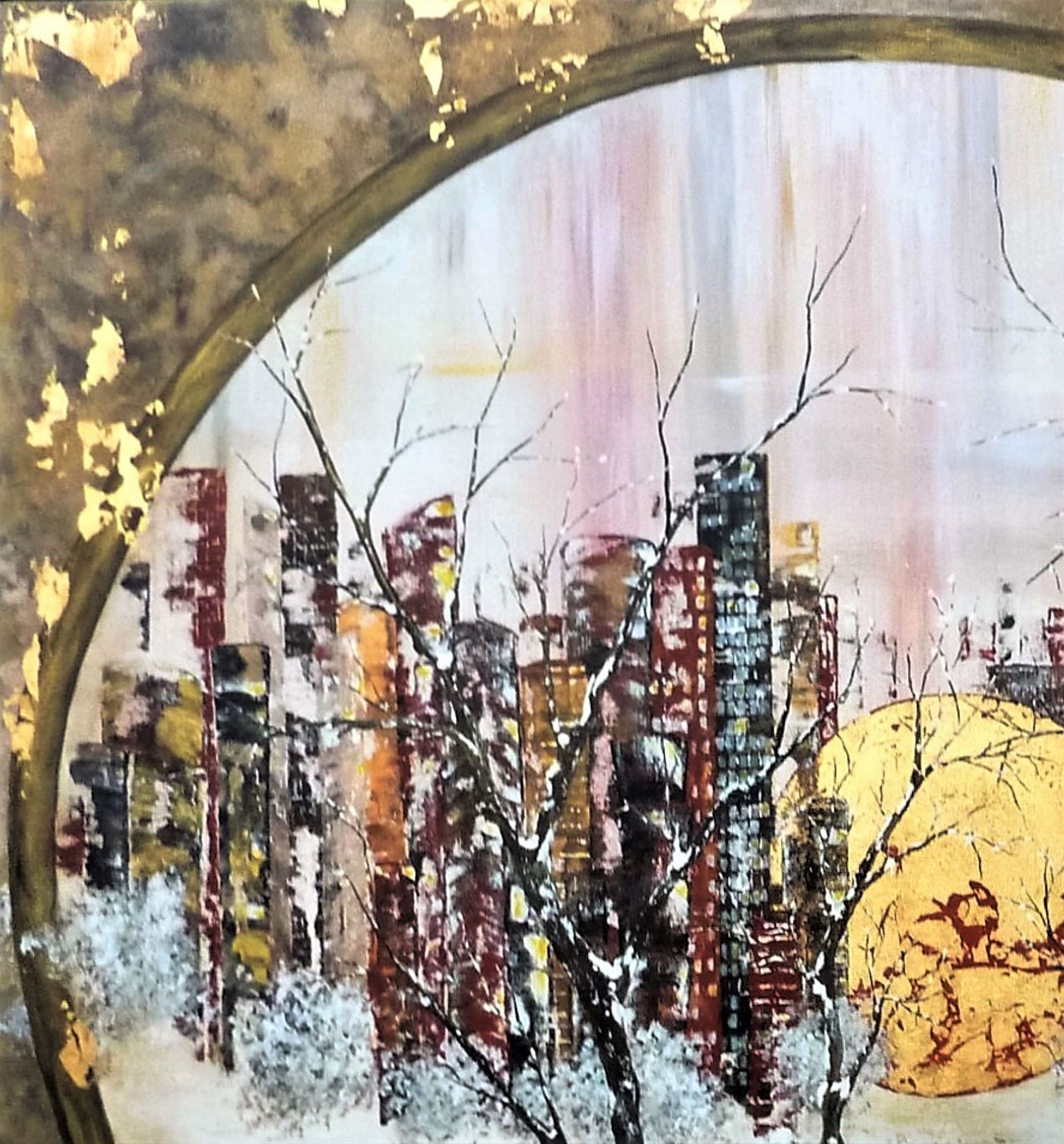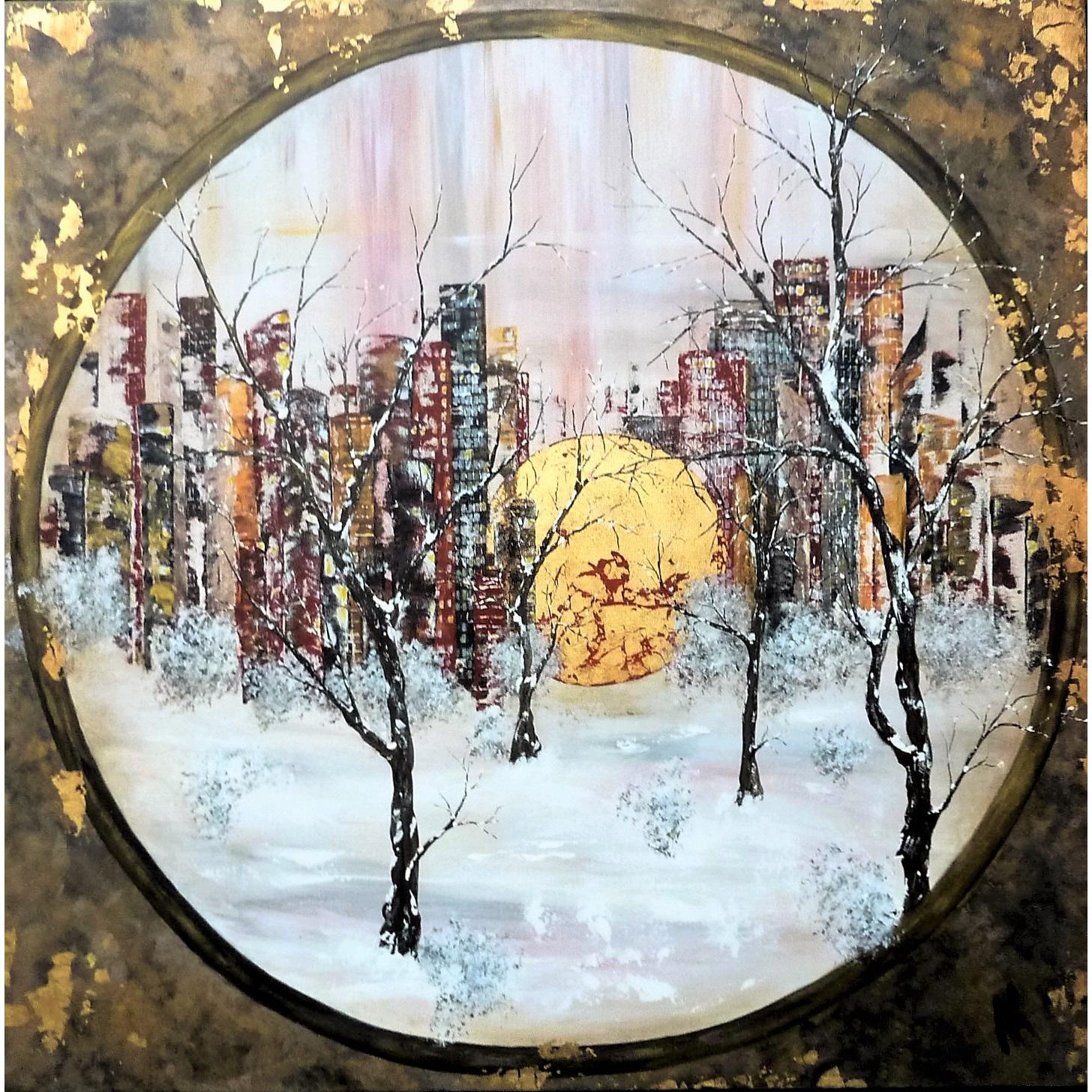 Quelle finesse dans les branches des arbres ! Bien que majoritairement de couleur sombre, ce tableau n'est pas triste, l'or omniprésent et discret à la fois lui donne beaucoup d'éclat, et la blanc et les couleurs pastel donnent beaucoup de douceur. Acrylique et feuille d'or sur toile. Finition vernis.