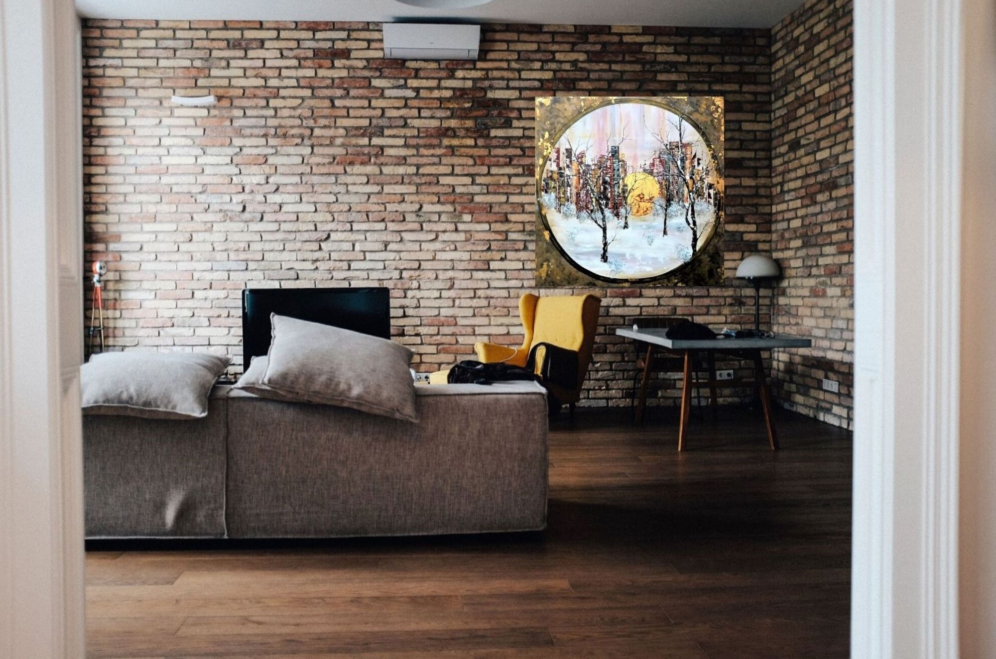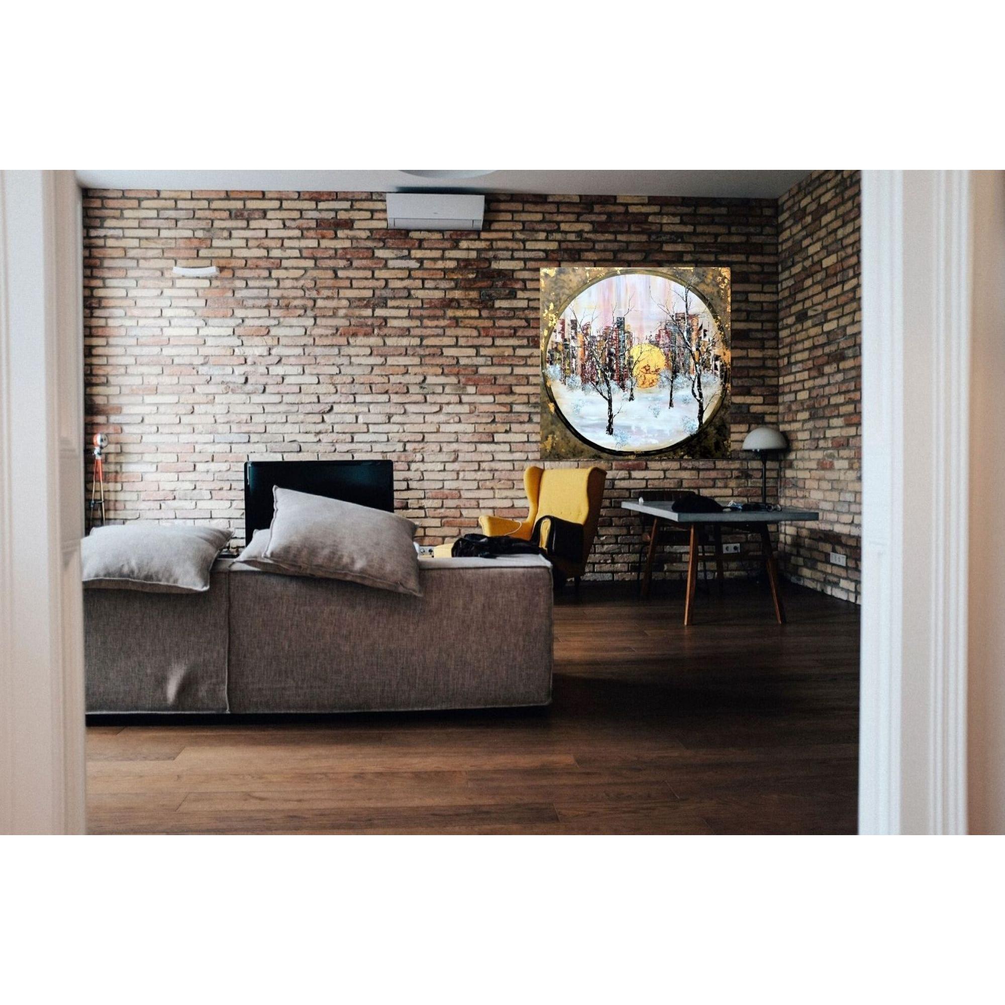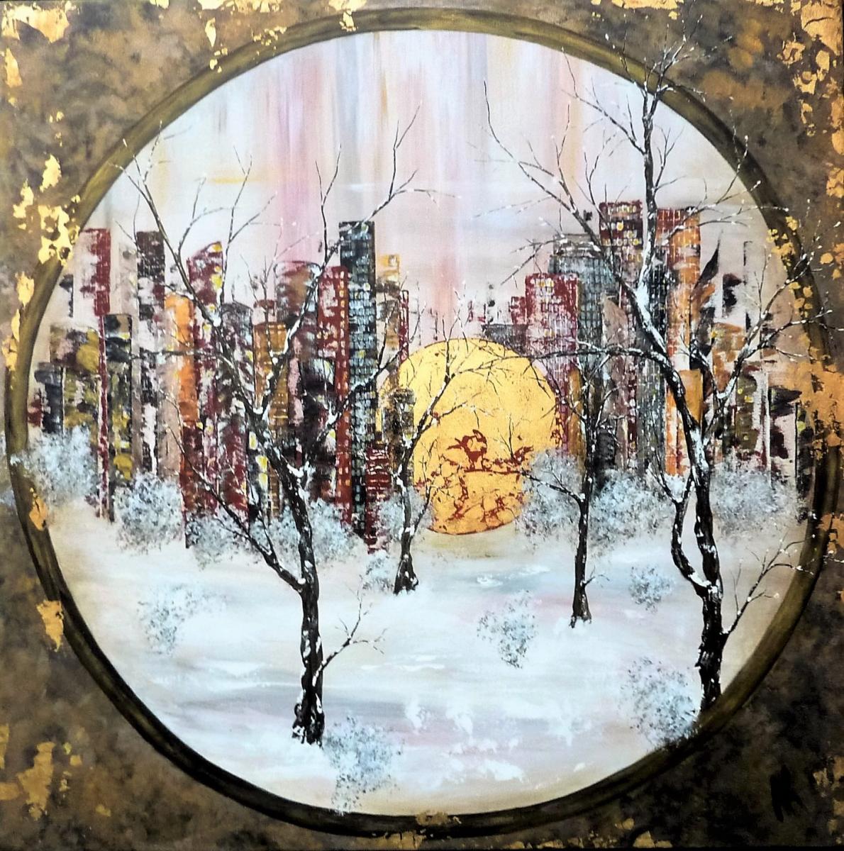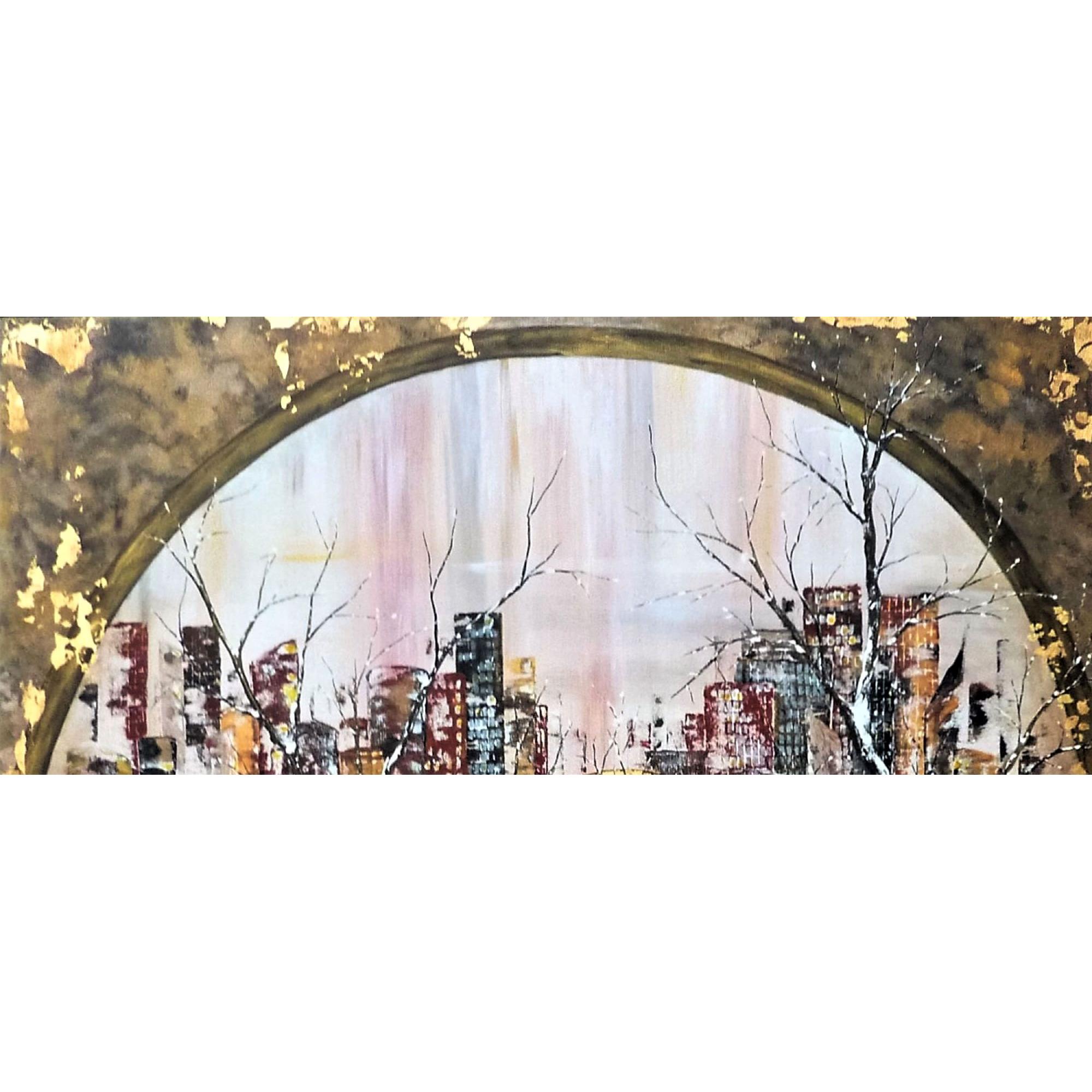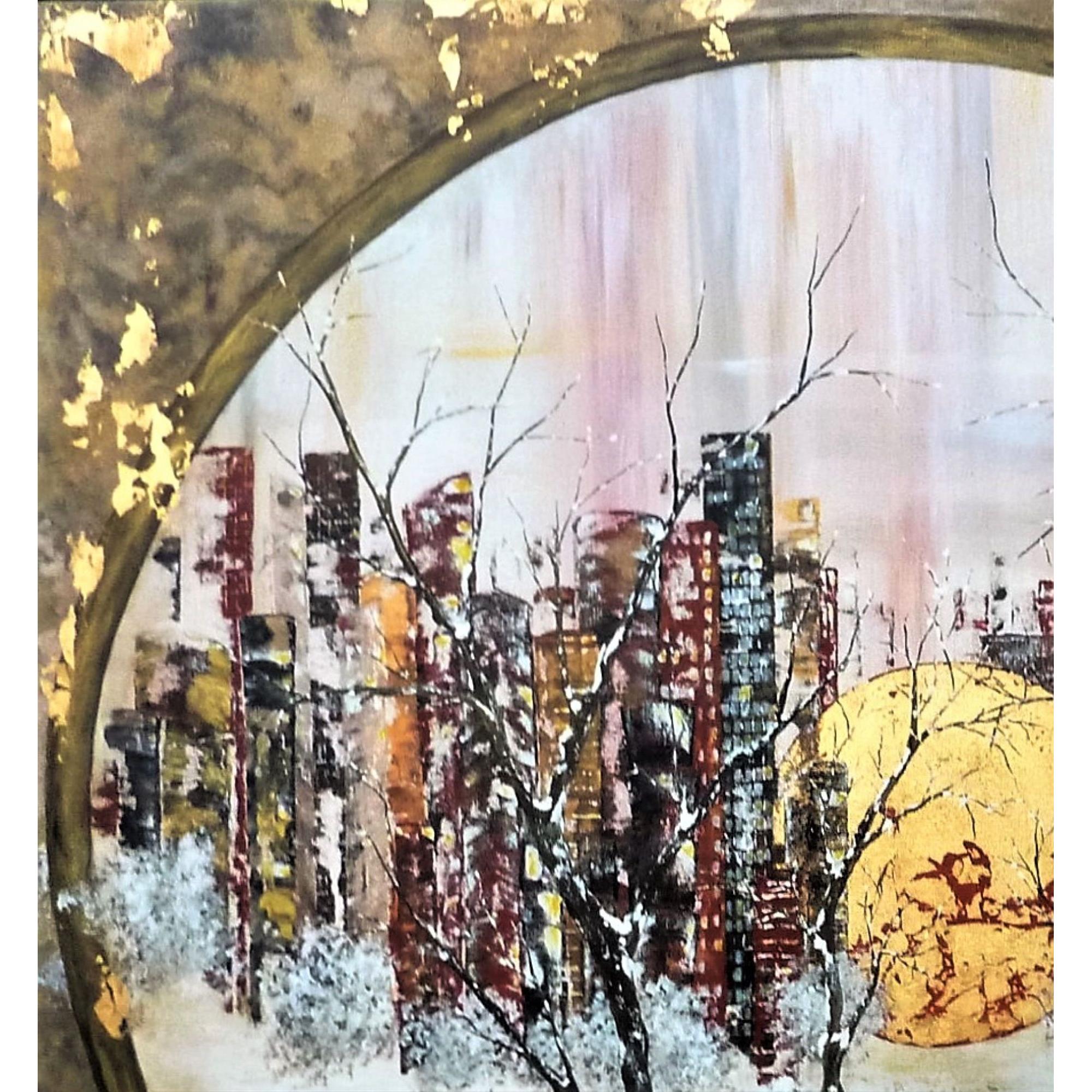 Quelle finesse dans les branches des arbres ! Bien que majoritairement de couleur sombre, ce tableau n'est pas triste, l'or omniprésent et discret à la fois lui donne beaucoup d'éclat, et la blanc et les couleurs pastel donnent beaucoup de douceur. Acrylique et feuille d'or sur toile. Finition vernis.