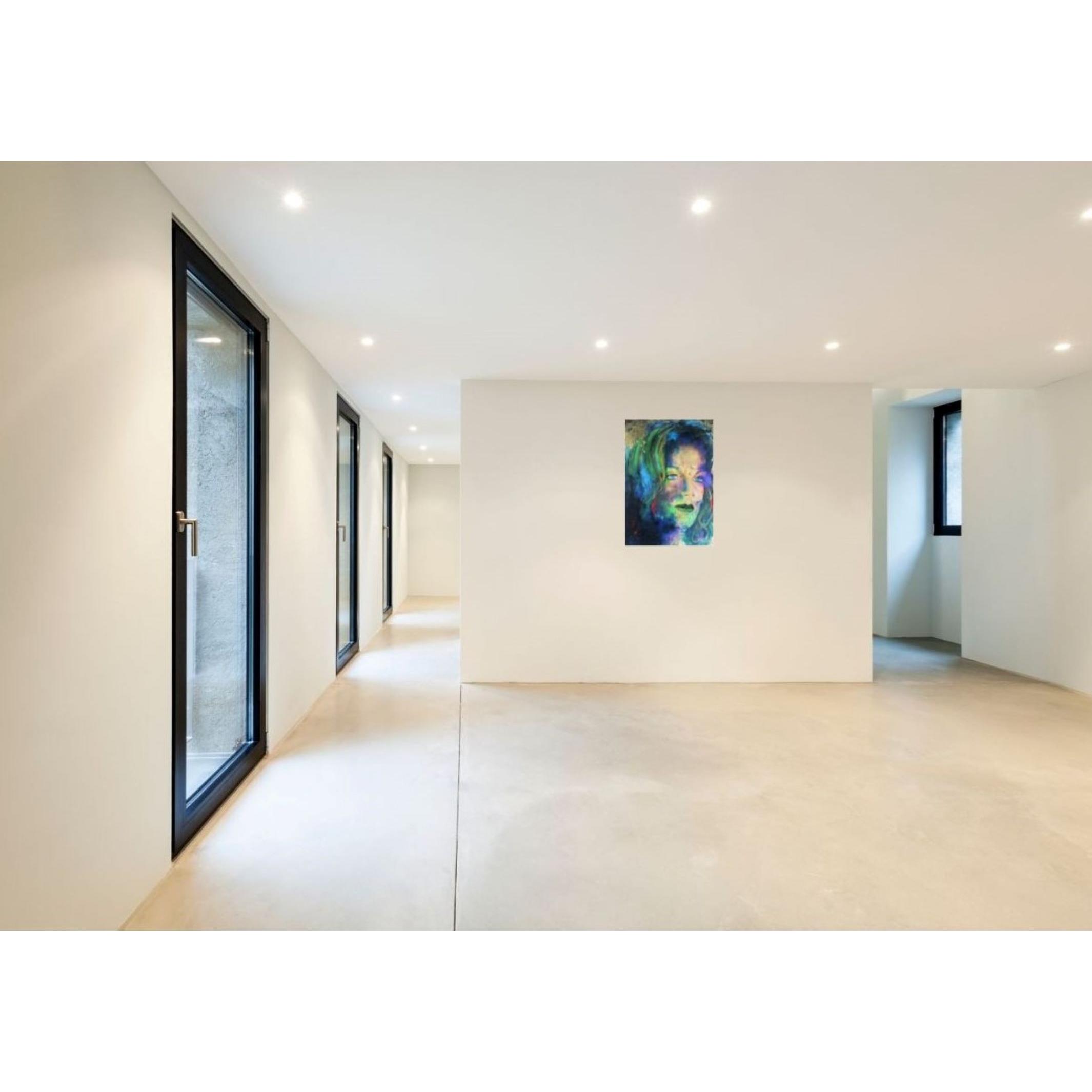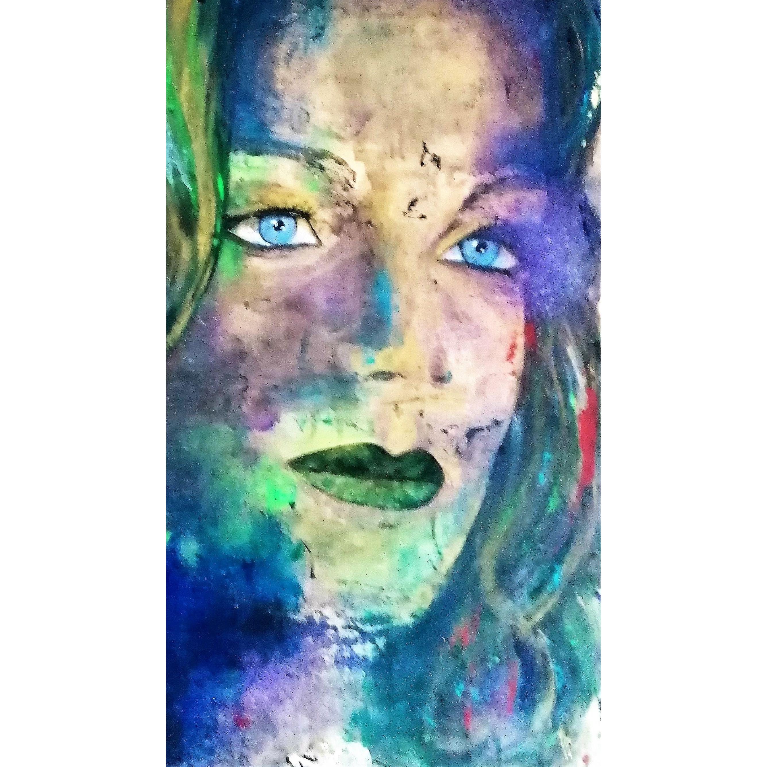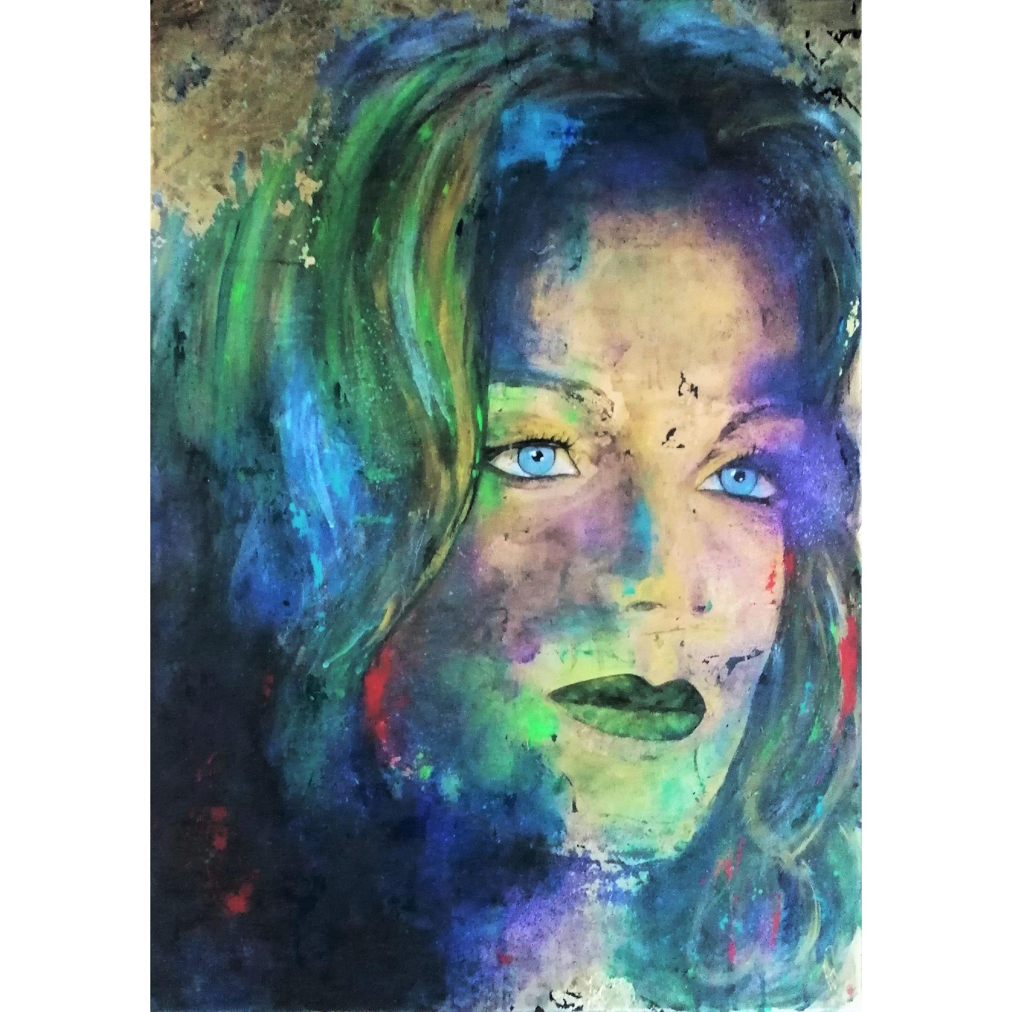 Portrait coloré et semi-abstrait de Romy Schneider réalisé à l'acrylique sur une toile tendue de 70x50 cm, et entièrement recouvert de feuilles d'or dont certaines zones ont été oxydées à la main. Finition vernie.