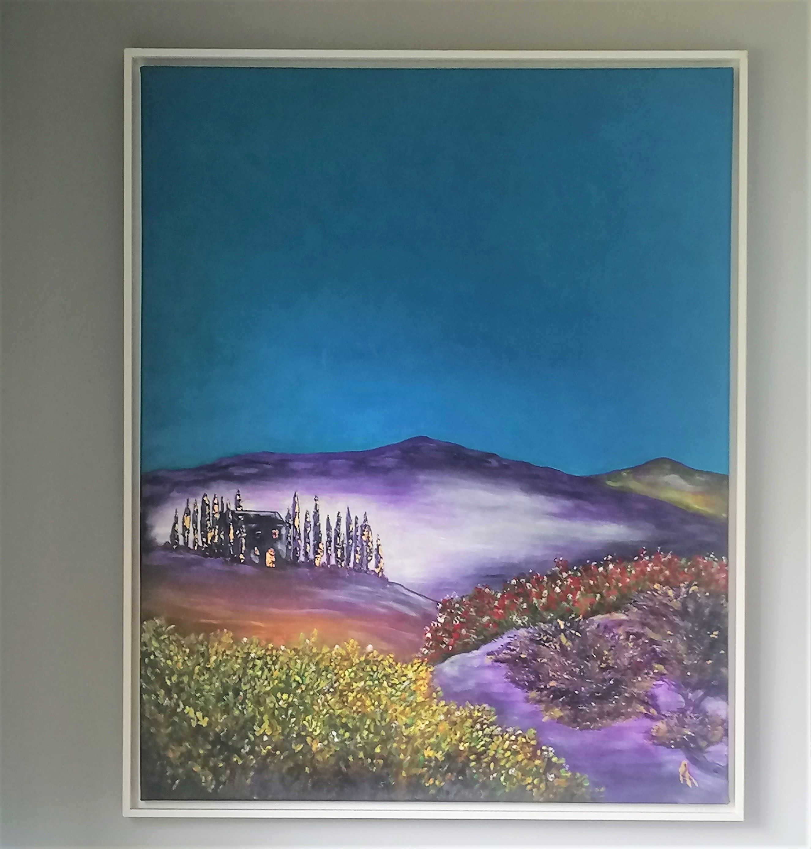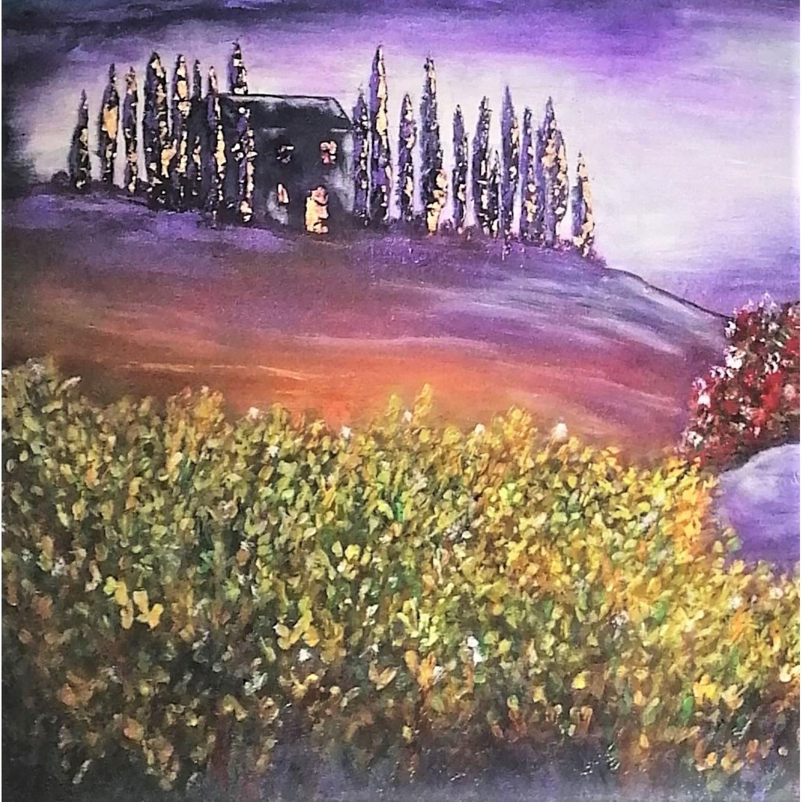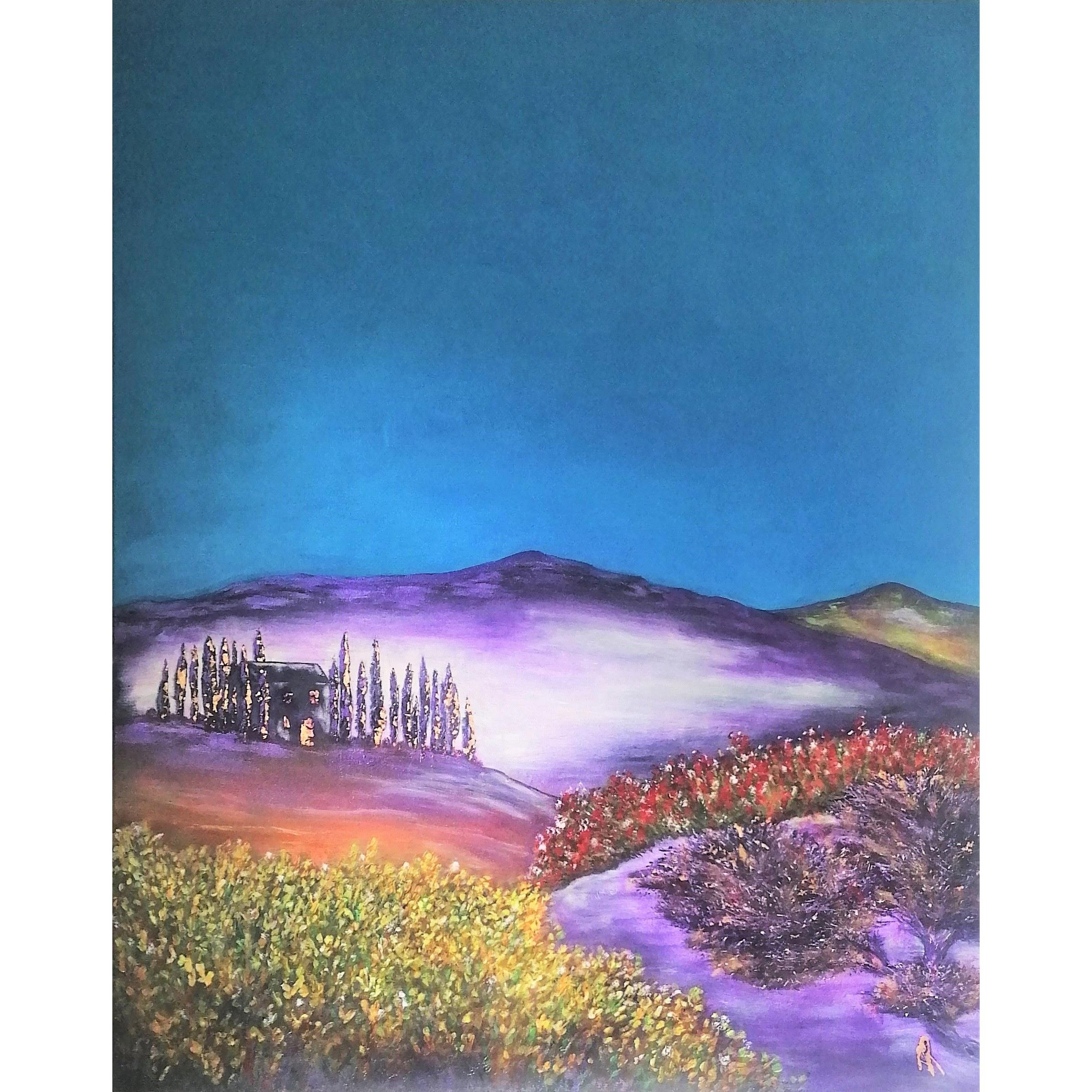 Couleurs d'Italie, de la Toscane avec ses paysages si particuliers et si typiques, ses cyprès et ses chemins qui mènent à travers les champs à une de ces grandes propriétés si caractéristiques de la région. Pour faire rêver ceux qui connaissent et donner envie à ceux qui ne connaissent pas. Peinture acrylique, feuille dorée sur châssis entoilé, avec finition vernis. Chassis entoilé de 100x80 cm. Dimensions finales encadré:104x84 cm.