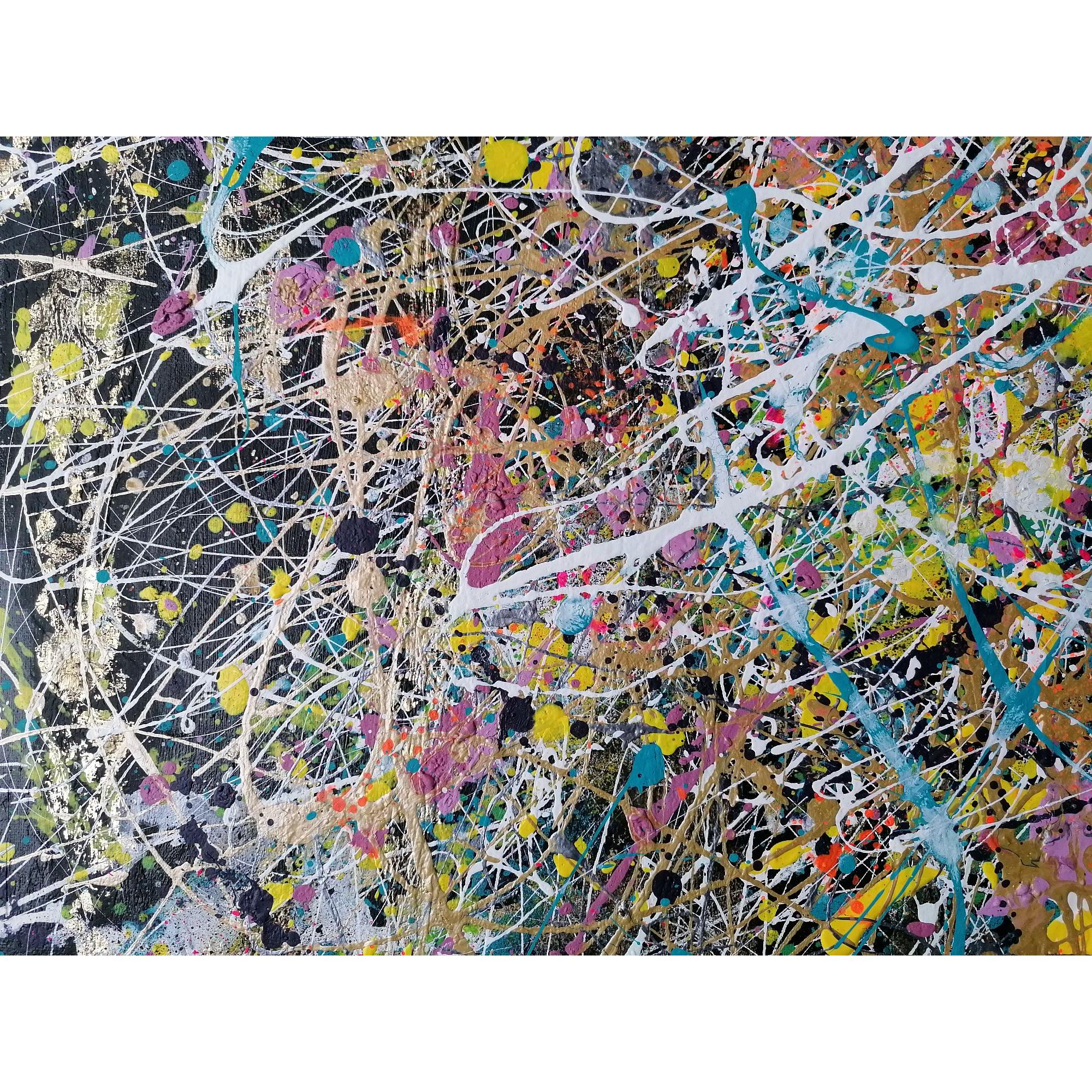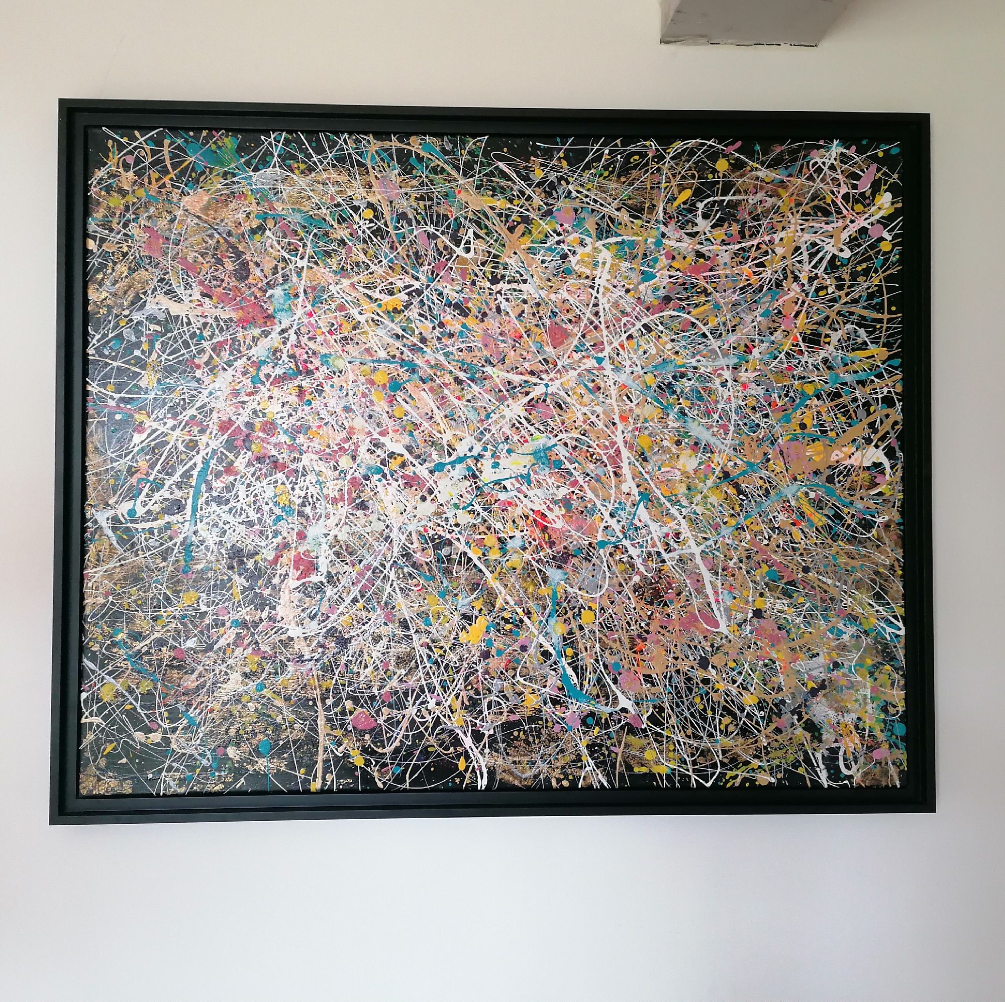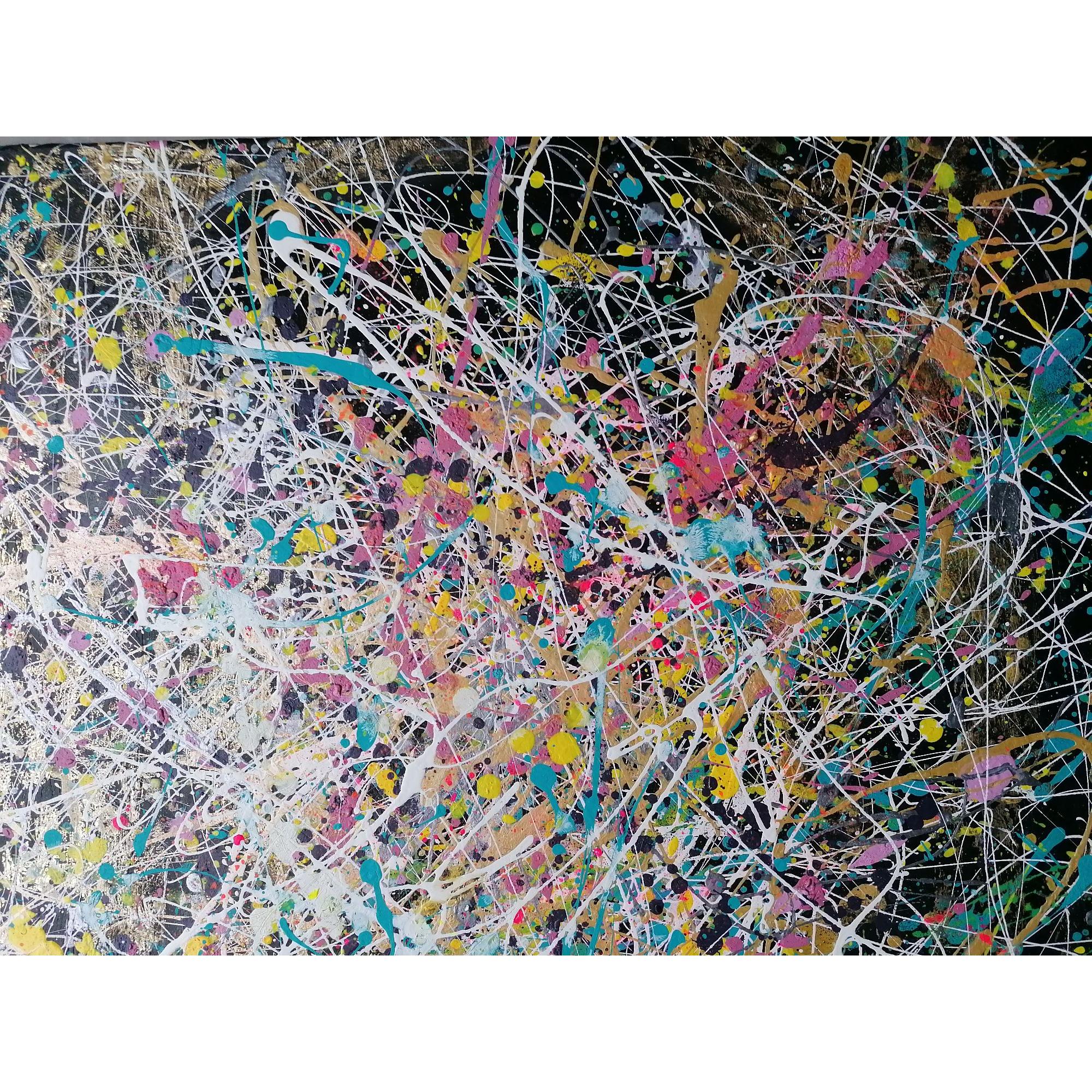 Technique du dripping en multicolore sur fond noir incluant des zones de feuille dorée, avec une finition vernis. C'est une véritable explosion de couleurs à la fois tendres et acidulées, incluant aussi des tons or et argent, très gaie et dynamique. Peinture acrylique sur toile avec chassis de 80x100cm . Encadrement cadre américain noir, taille totale: 86x105.7 cm