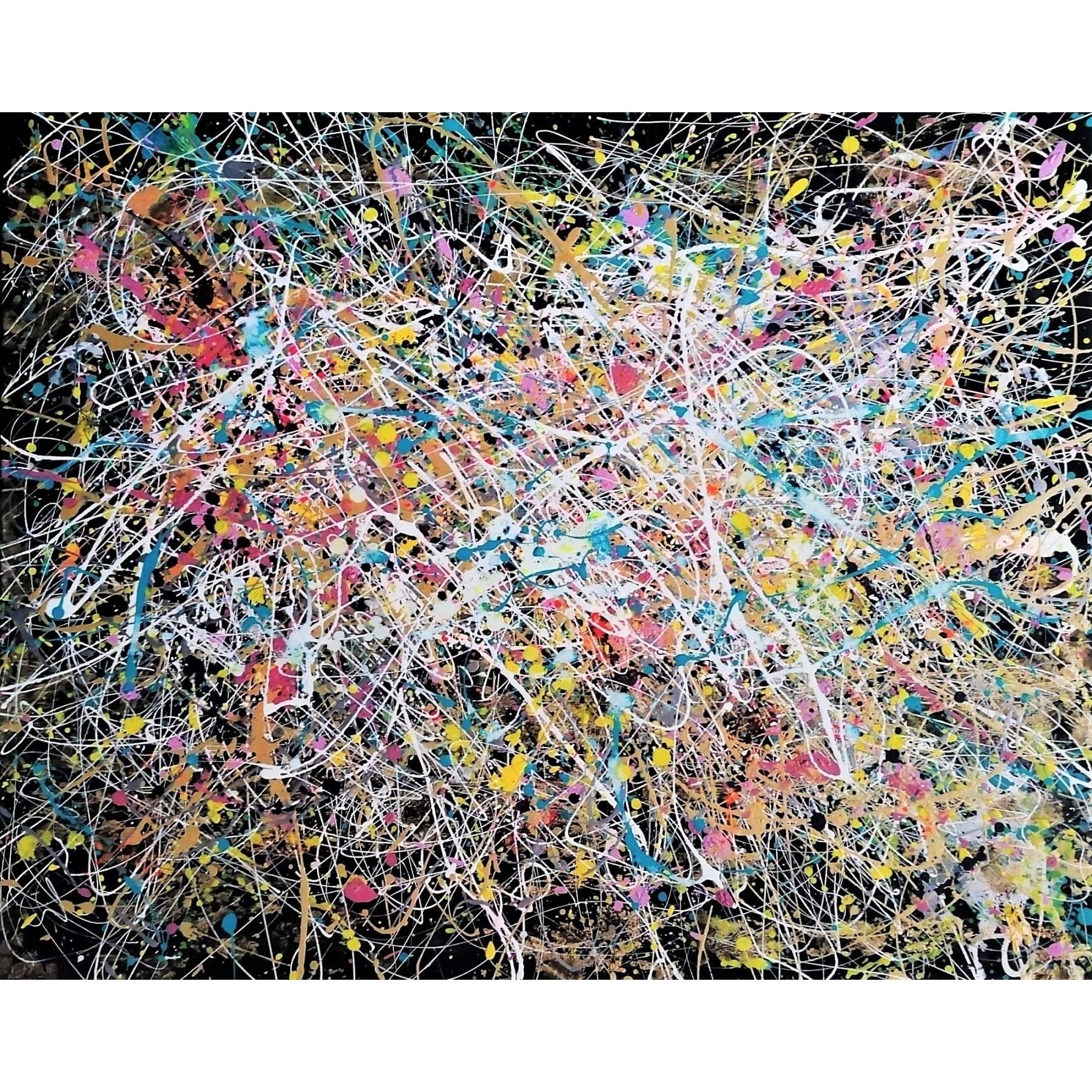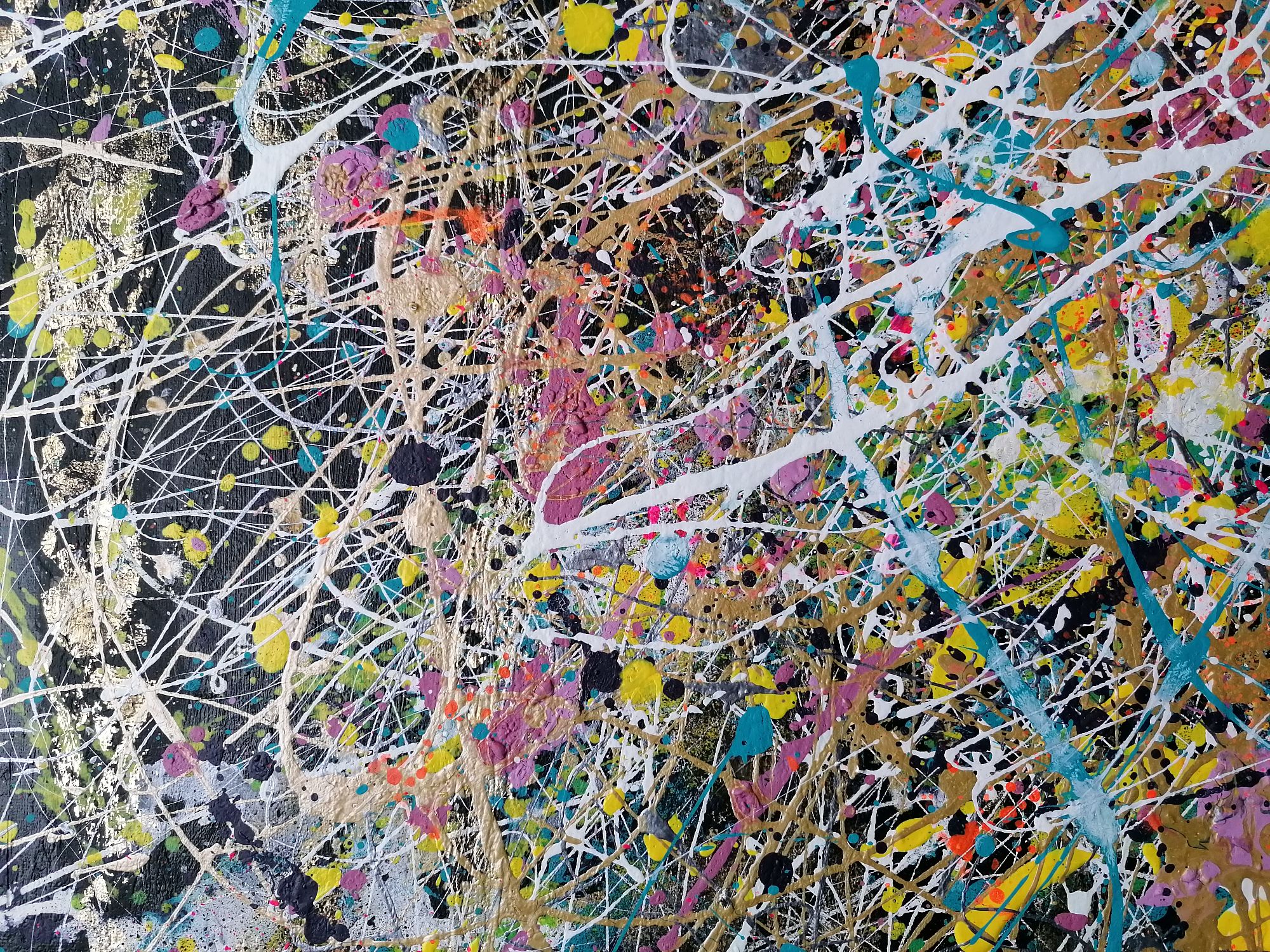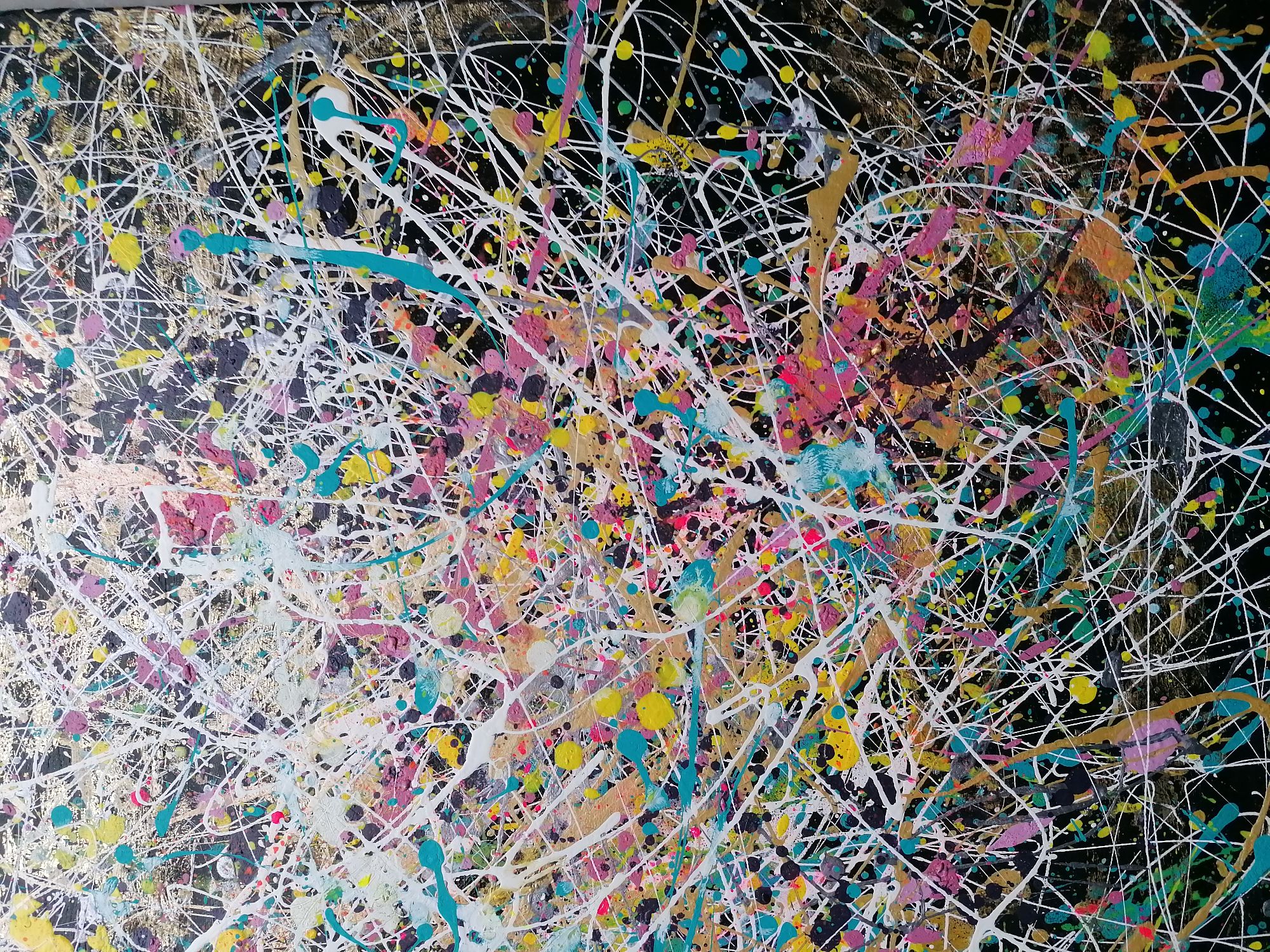 Technique du dripping en multicolore sur fond noir incluant des zones de feuille dorée, avec une finition vernis. C'est une véritable explosion de couleurs à la fois tendres et acidulées, incluant aussi des tons or et argent, très gaie et dynamique. Peinture acrylique sur toile avec chassis de 80x100cm . Encadrement cadre américain noir, taille totale: 86x105.7 cm