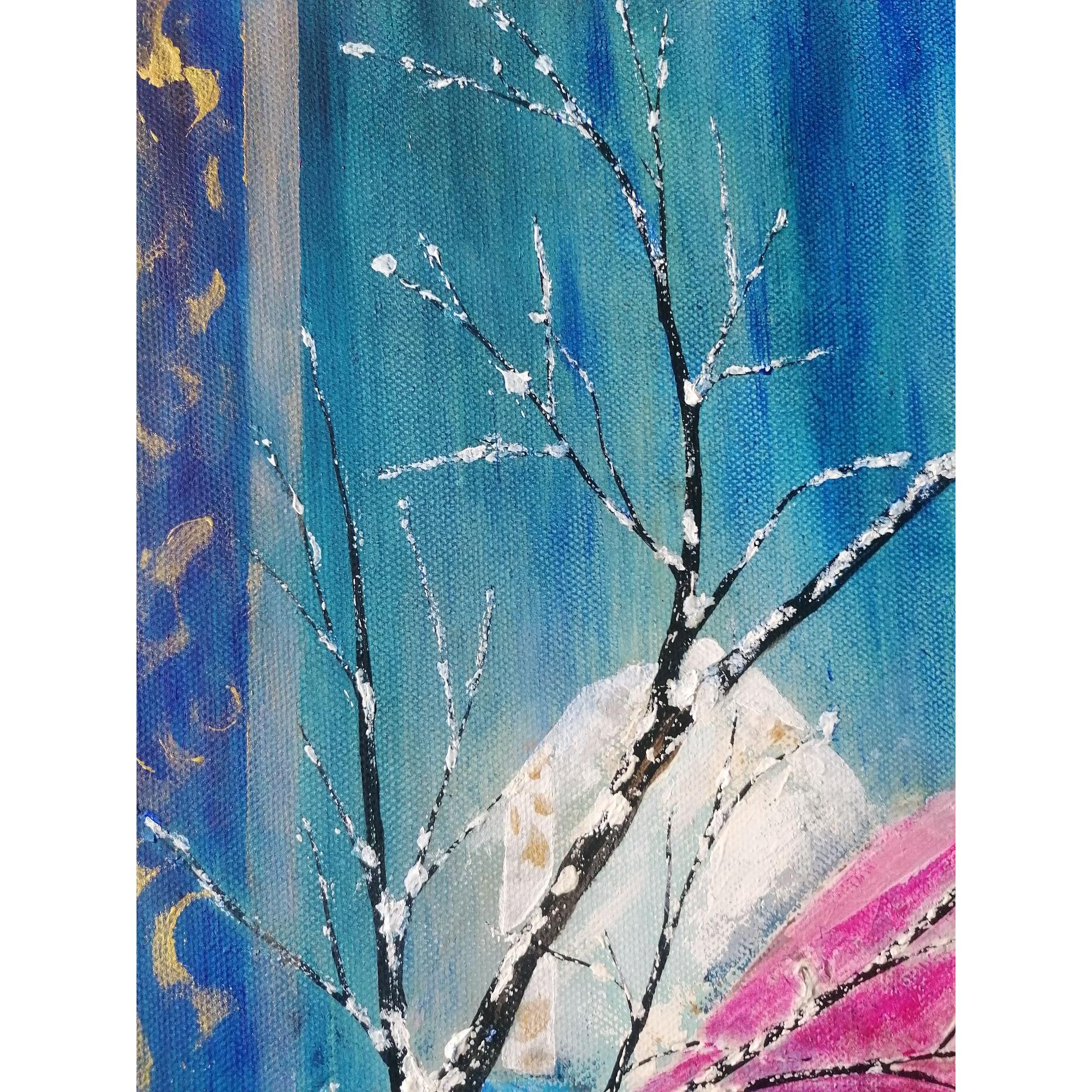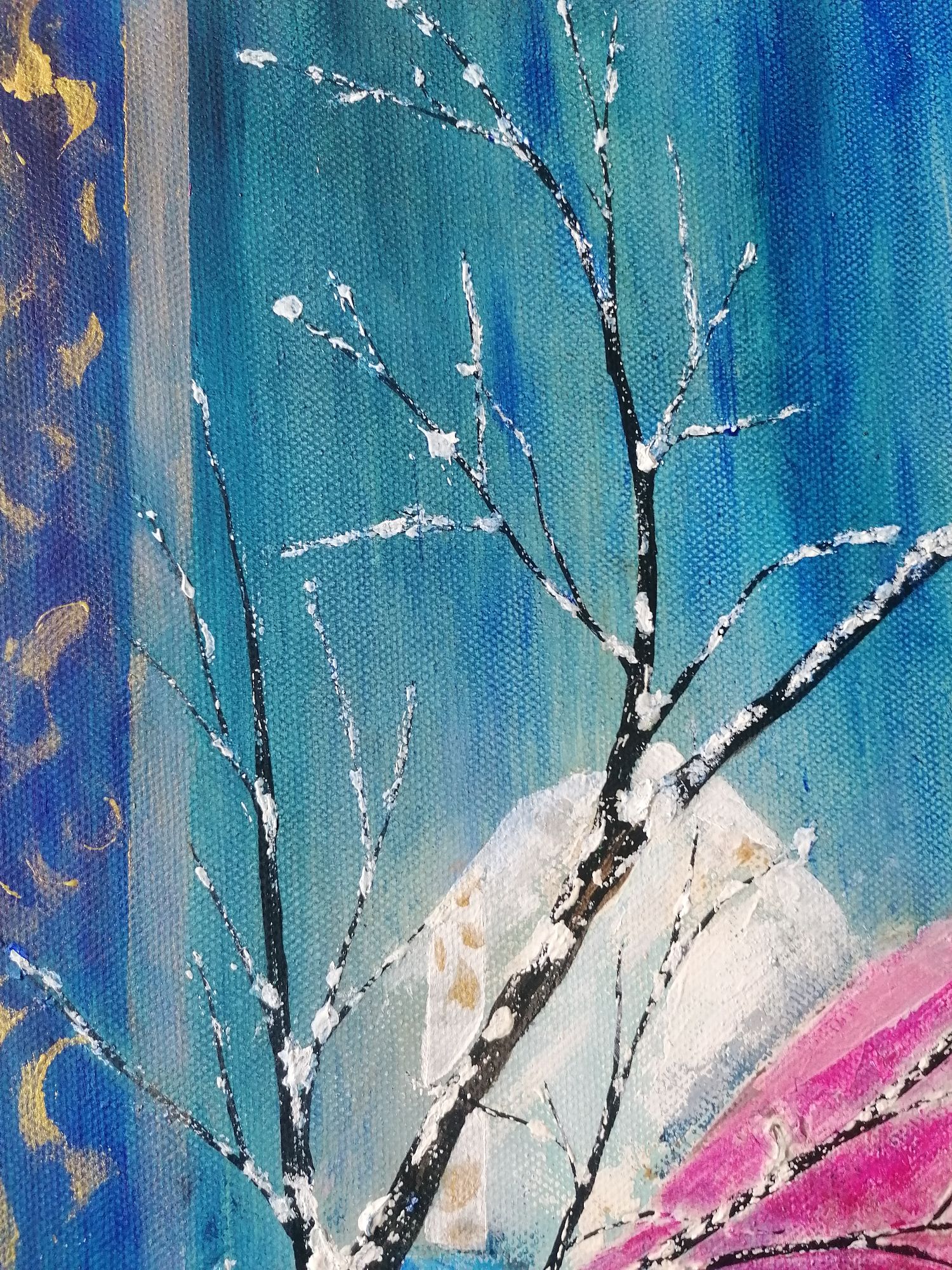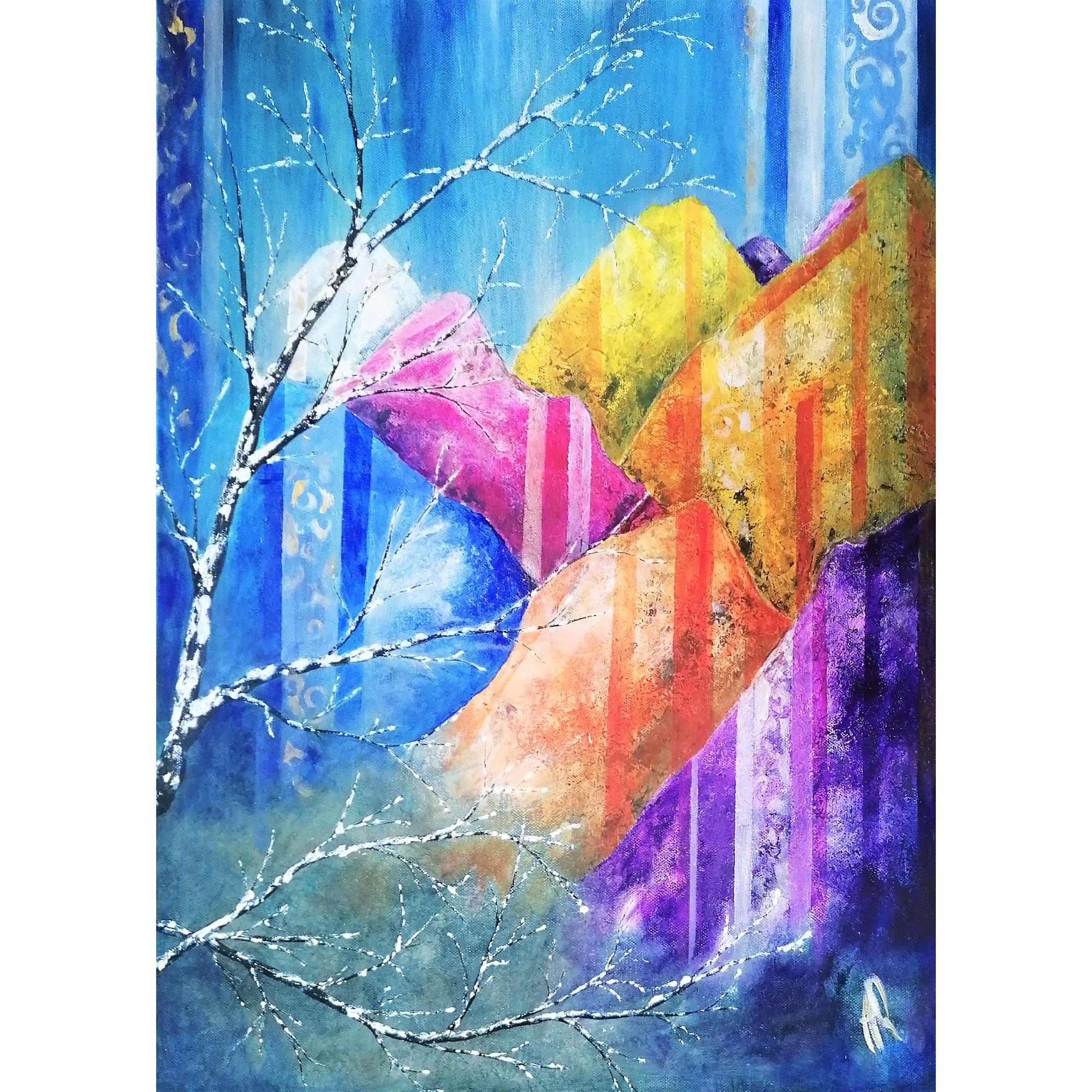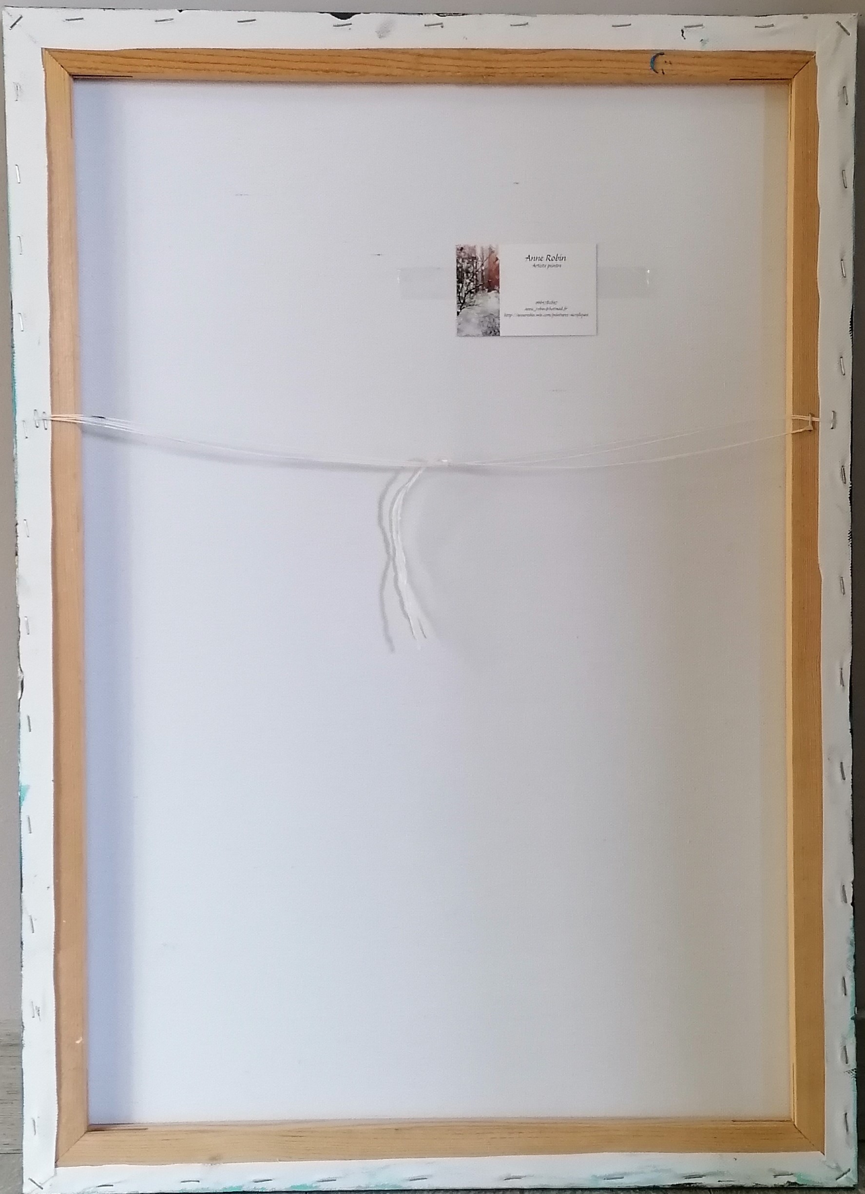 Montagnes colorées pour réchauffer ce paysage entre hiver et printemps, et dont la base se perd dans les brumes. Acrylique sur châssis entoilé de 70x50 cm, finition vernis.