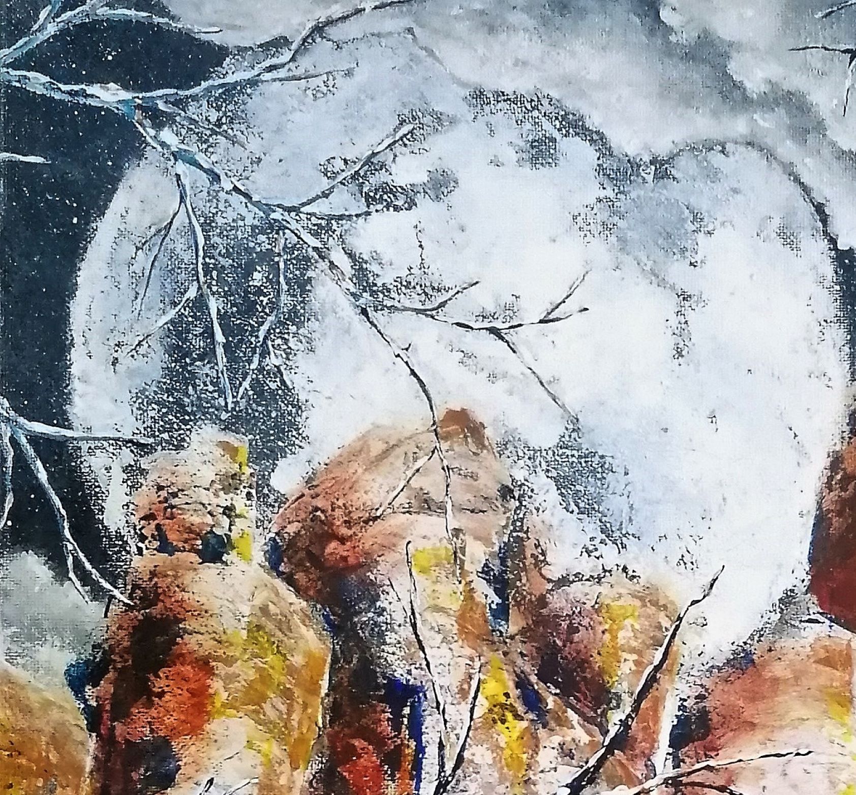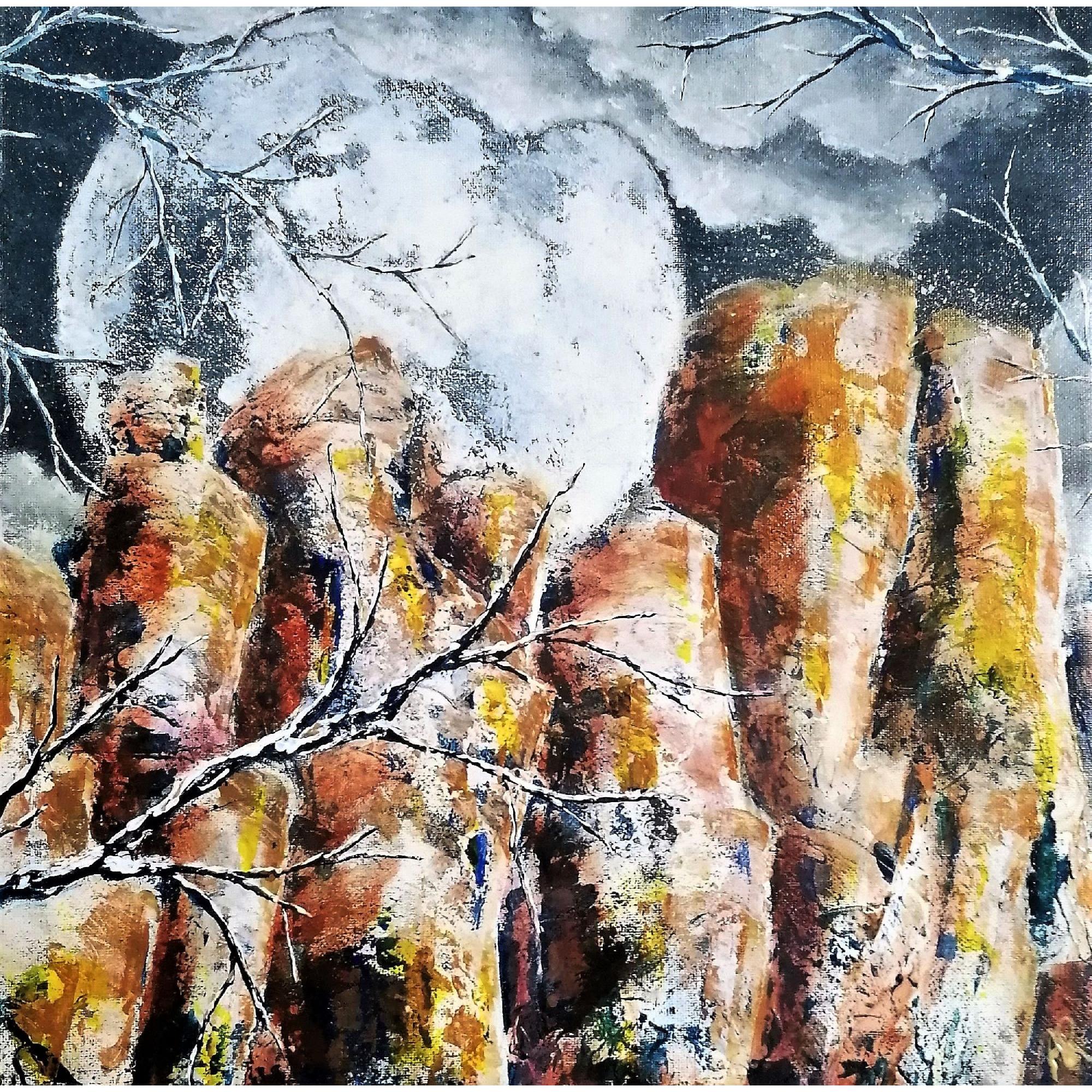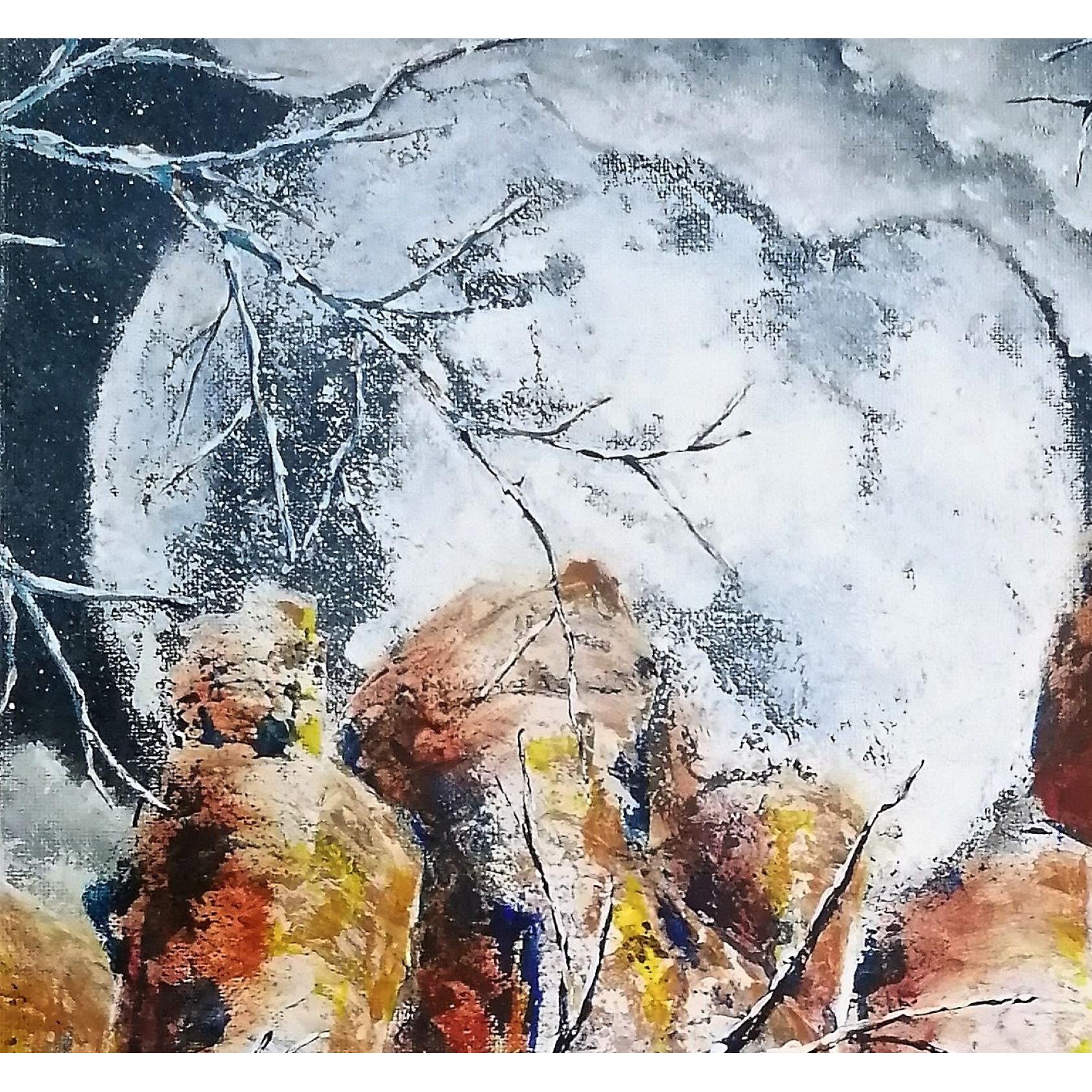 Une évocation de canyon sous la super lune, qui donne à cette toile peinte en acrylique et tendue sur planche de bois de 30x30 cm, un air d'évasion et de voyage au bout du monde. Finition vernis.