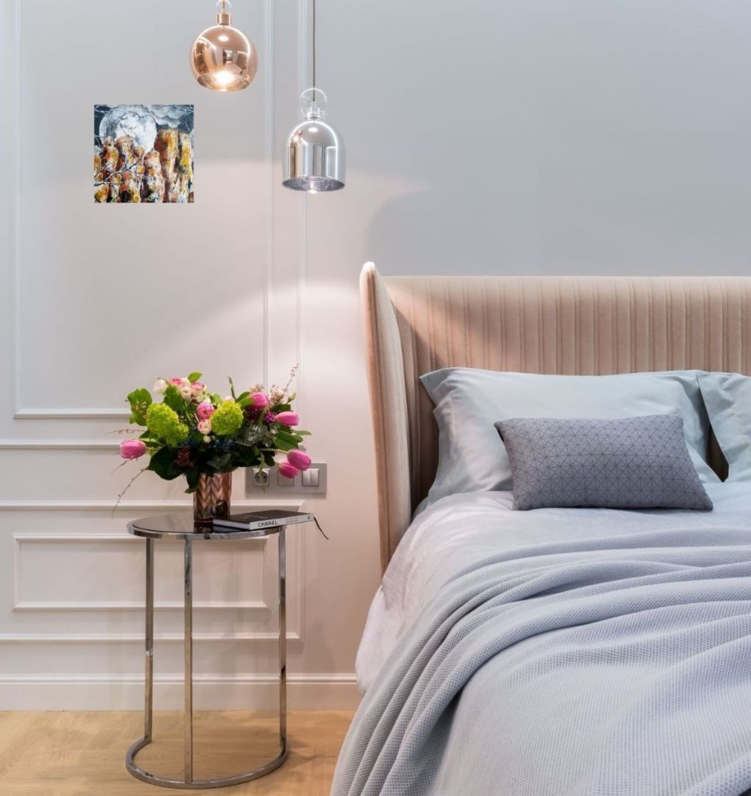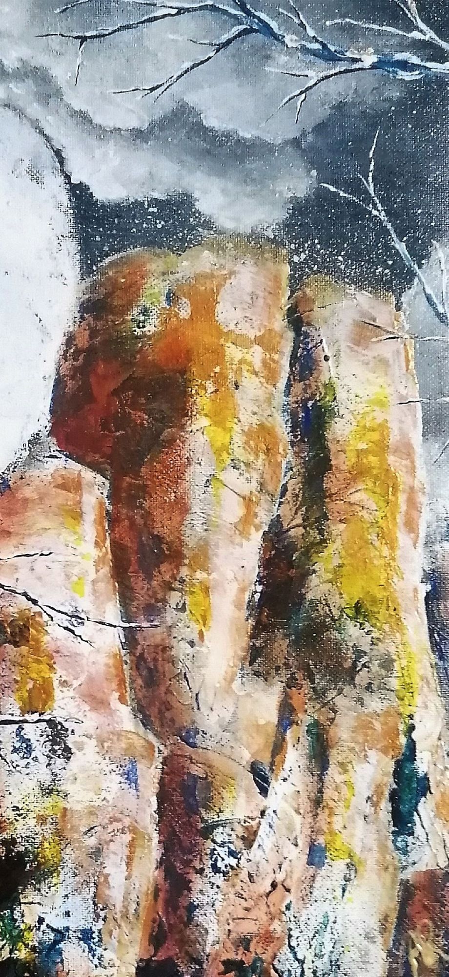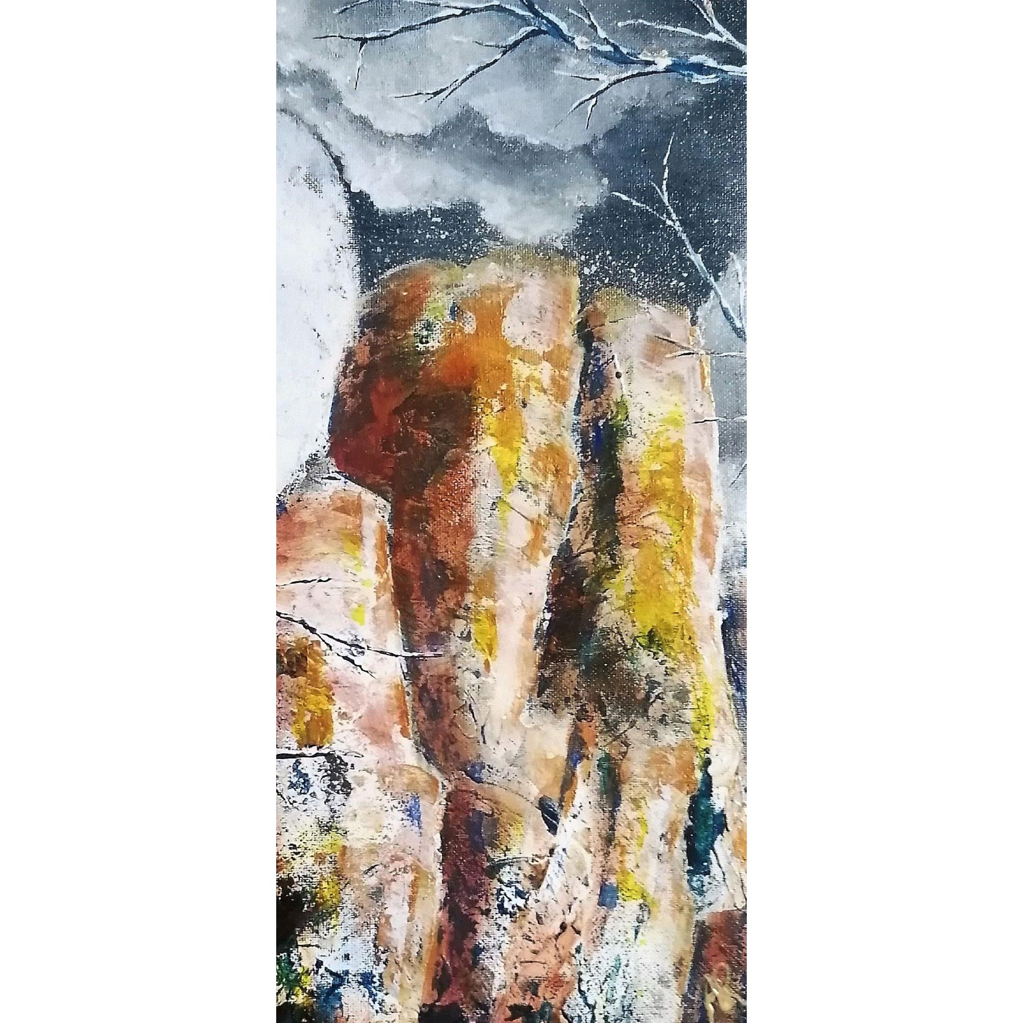 Une évocation de canyon sous la super lune, qui donne à cette toile peinte en acrylique et tendue sur planche de bois de 30x30 cm, un air d'évasion et de voyage au bout du monde. Finition vernis.