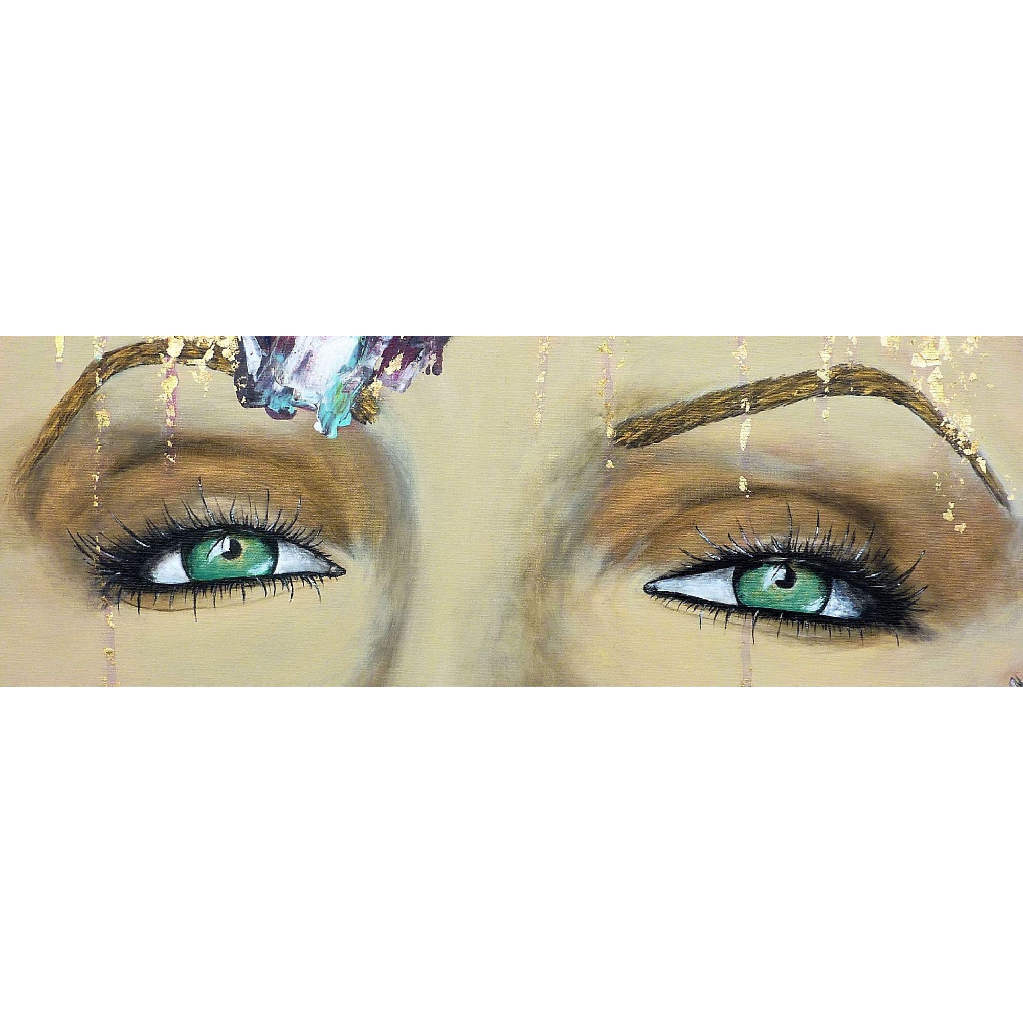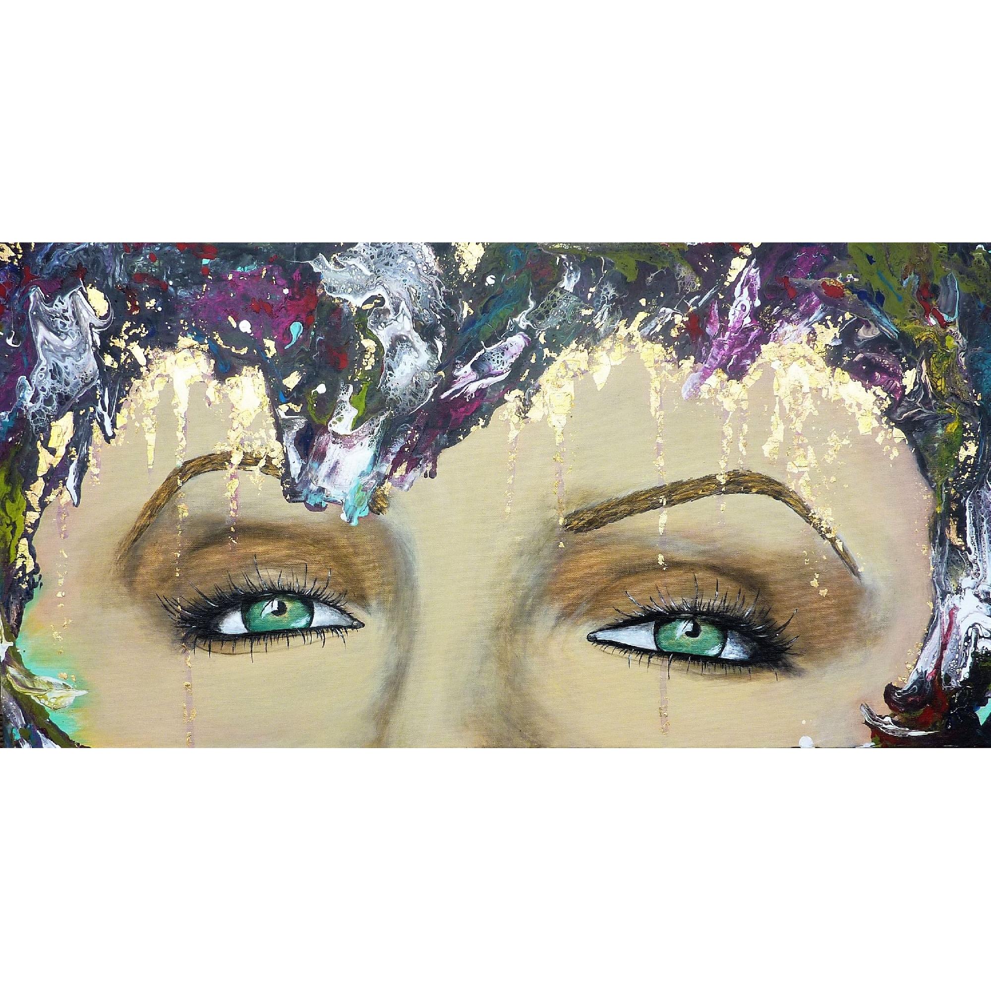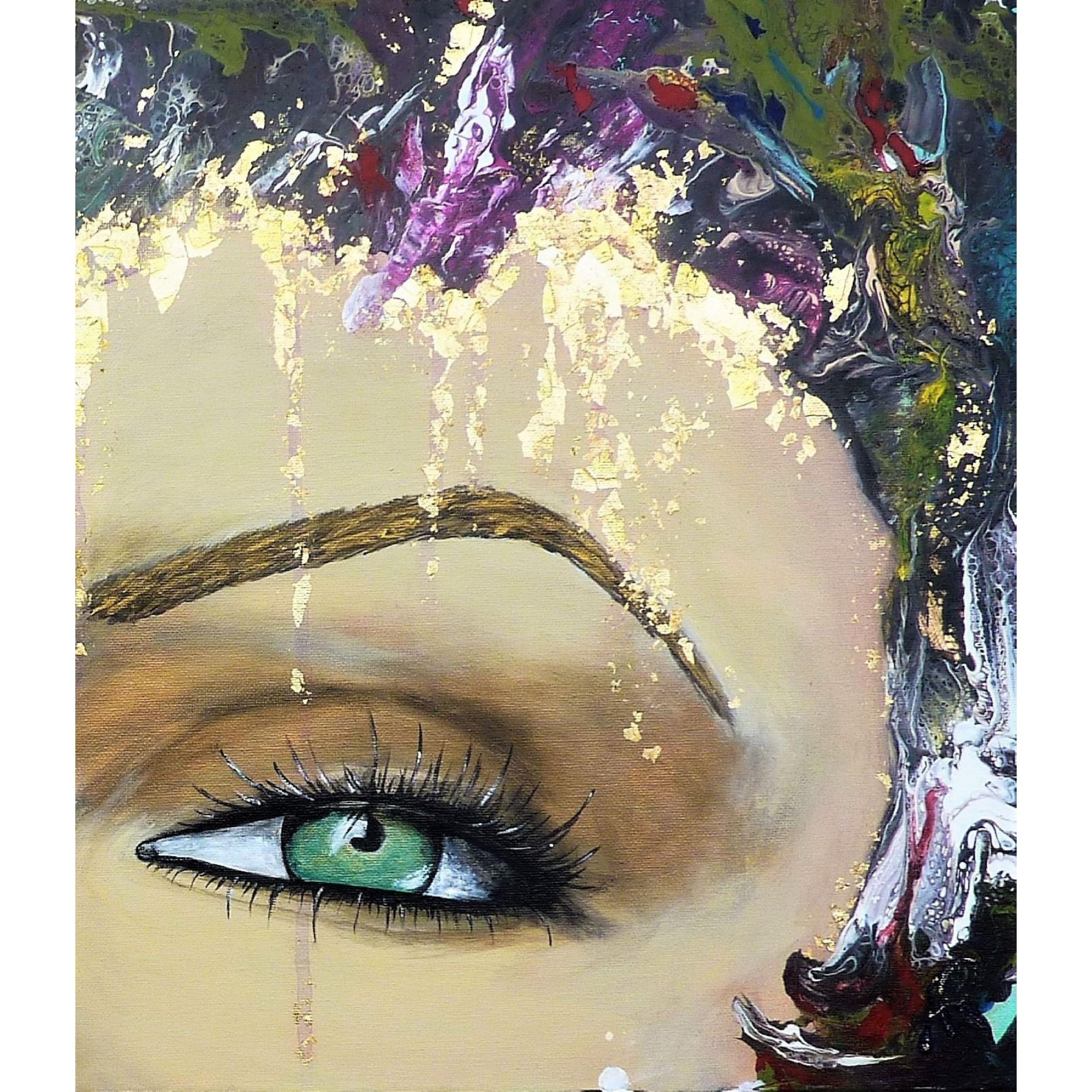 My way signifie à ma façon, ou encore mon chemin, ma voie. Cette jeune femme au beau regard vert affirme son identité et son indépendance en colorant ses cheveux à sa façon, elle suit ses propres envies, dans une palette de couleurs gaies et harmonieuses.Technique mixte, feuille dorée, finition vernis.