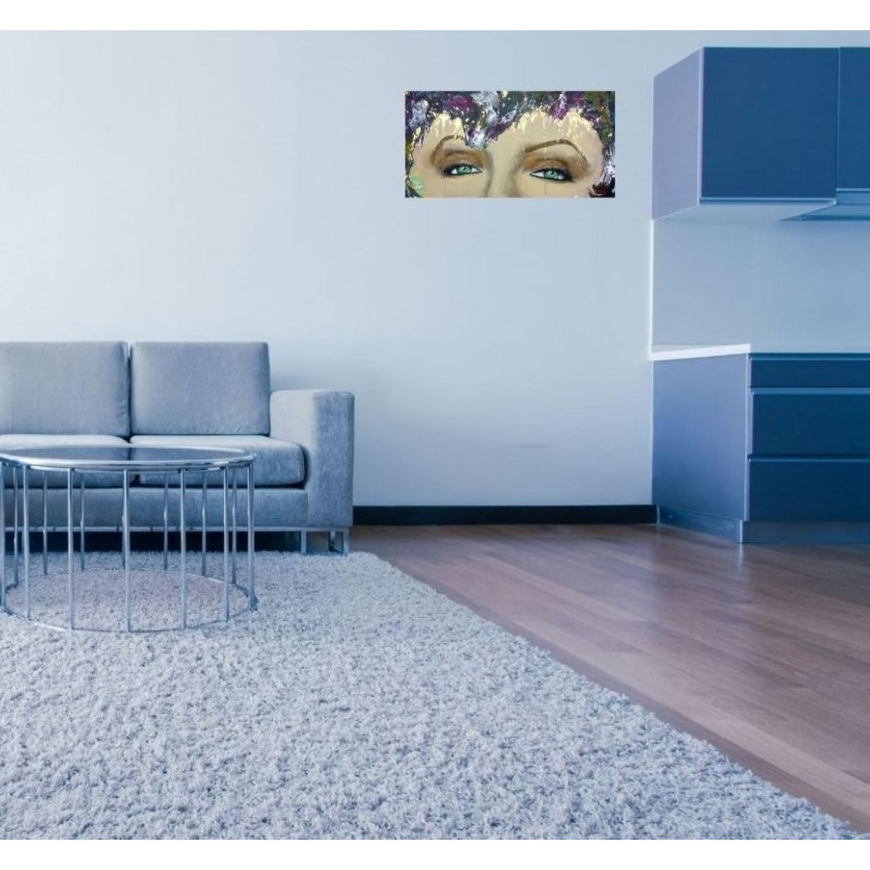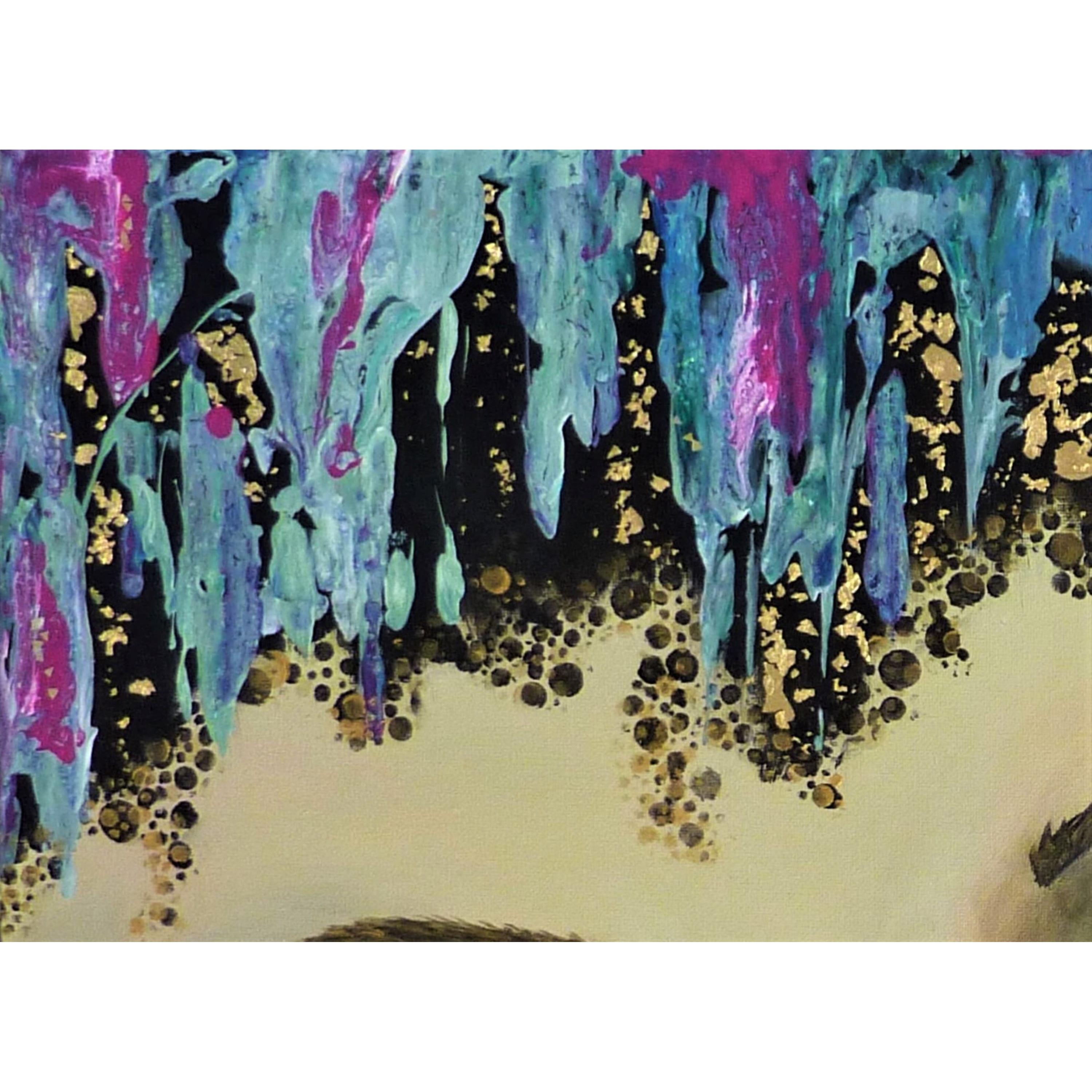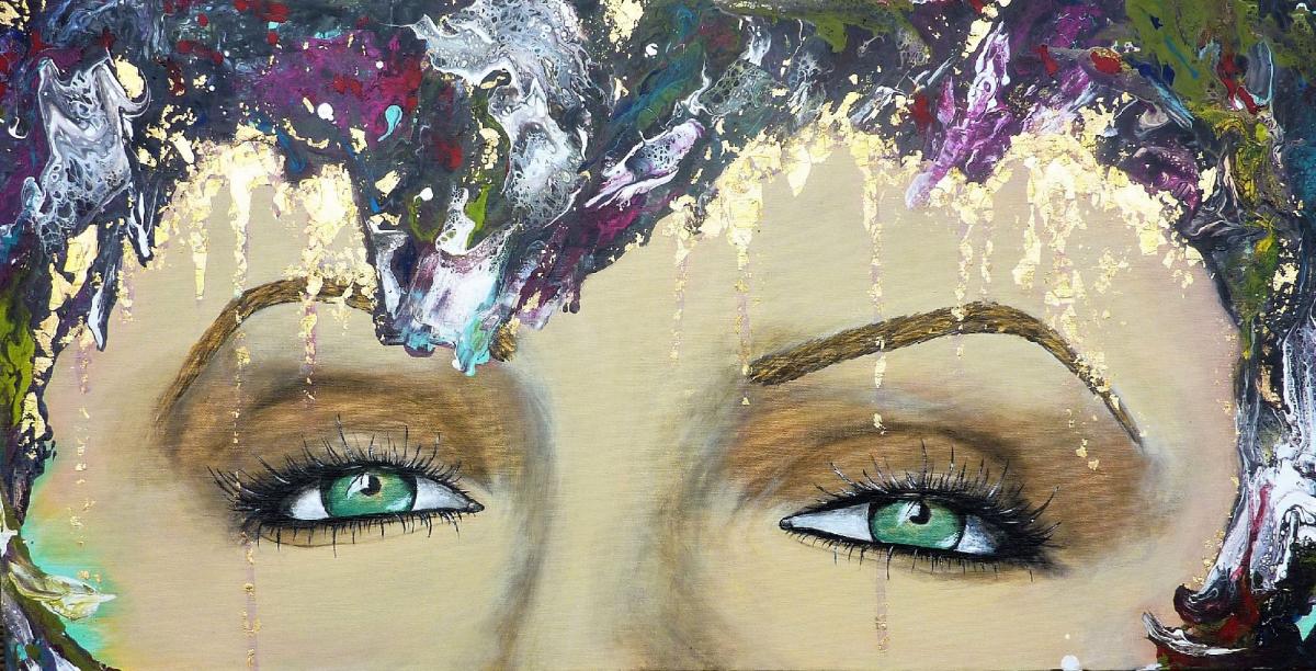 My way signifie à ma façon, ou encore mon chemin, ma voie. Cette jeune femme au beau regard vert affirme son identité et son indépendance en colorant ses cheveux à sa façon, elle suit ses propres envies, dans une palette de couleurs gaies et harmonieuses.Technique mixte, feuille dorée, finition vernis.