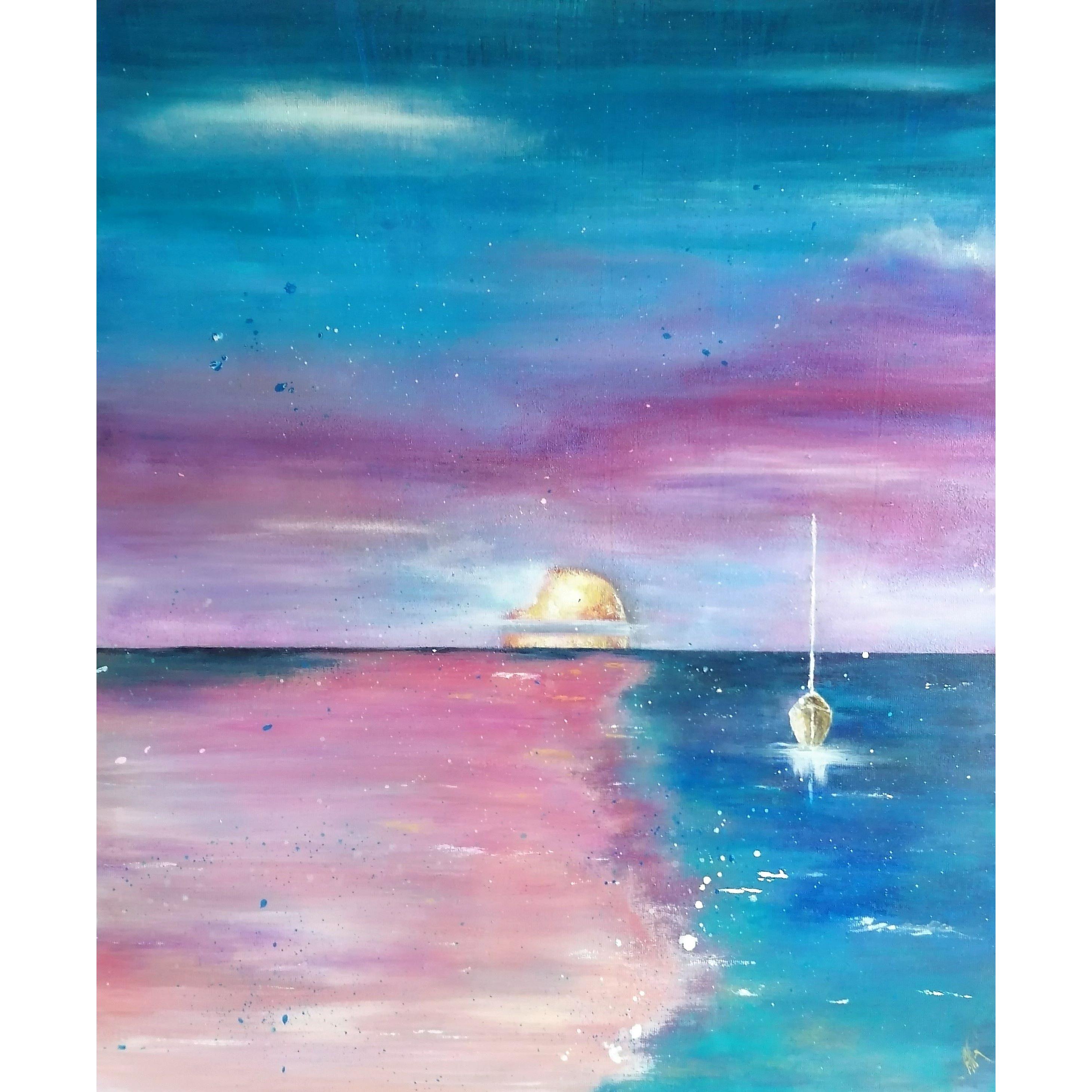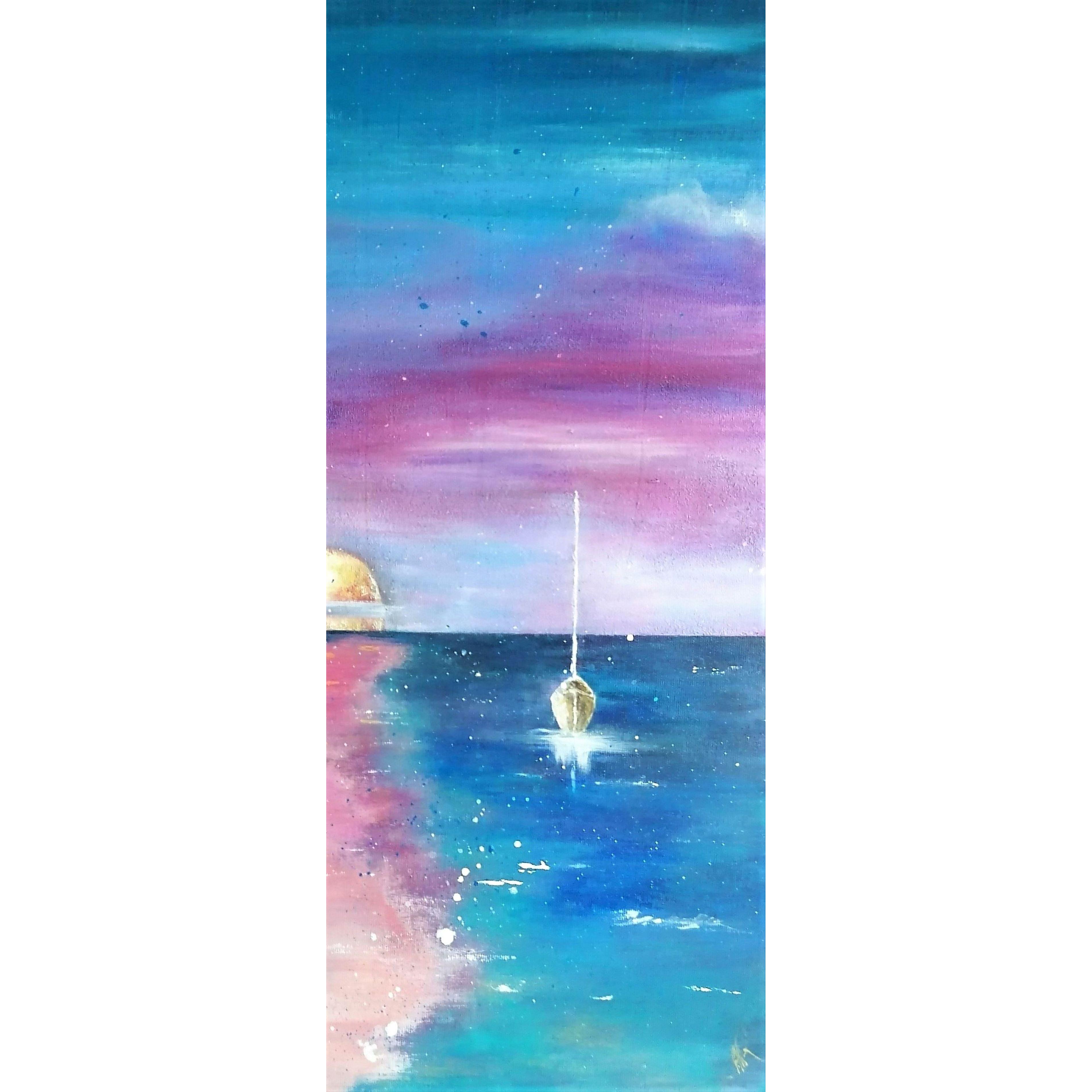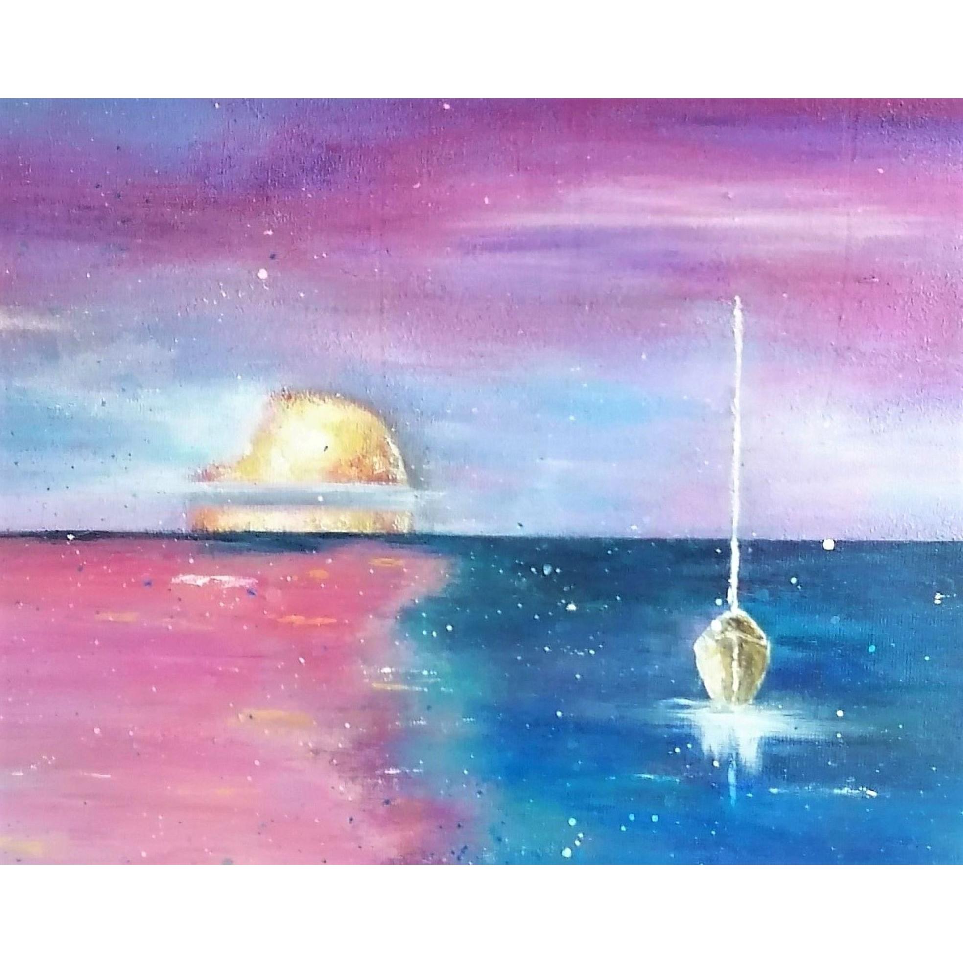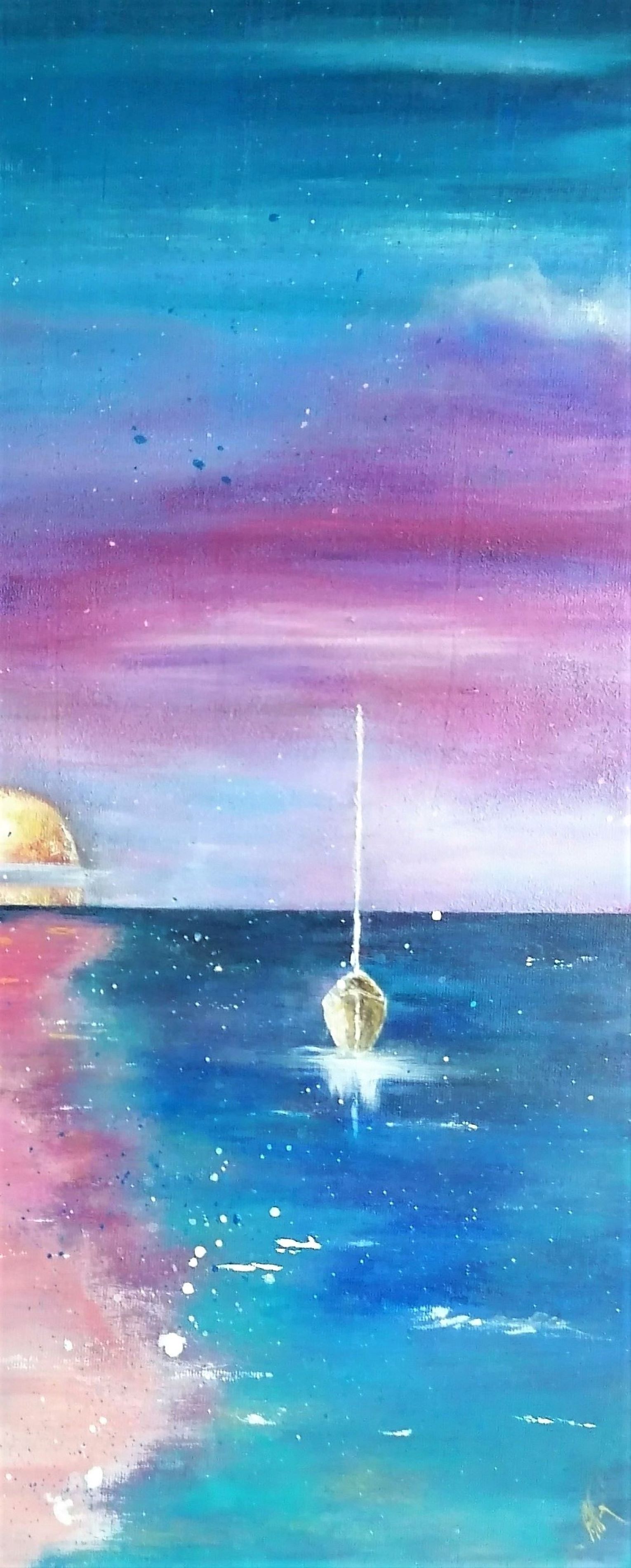 Plus figuratif que d' autres que j'ai pu faire, ce paysage de bord de mer reste dans l'esprit du rêve et de la quiétude, avec ce petit voilier isolé sur une mer calme profitant du spectacle d'un coucher de soleil sur la mer. Acrylique finition vernis