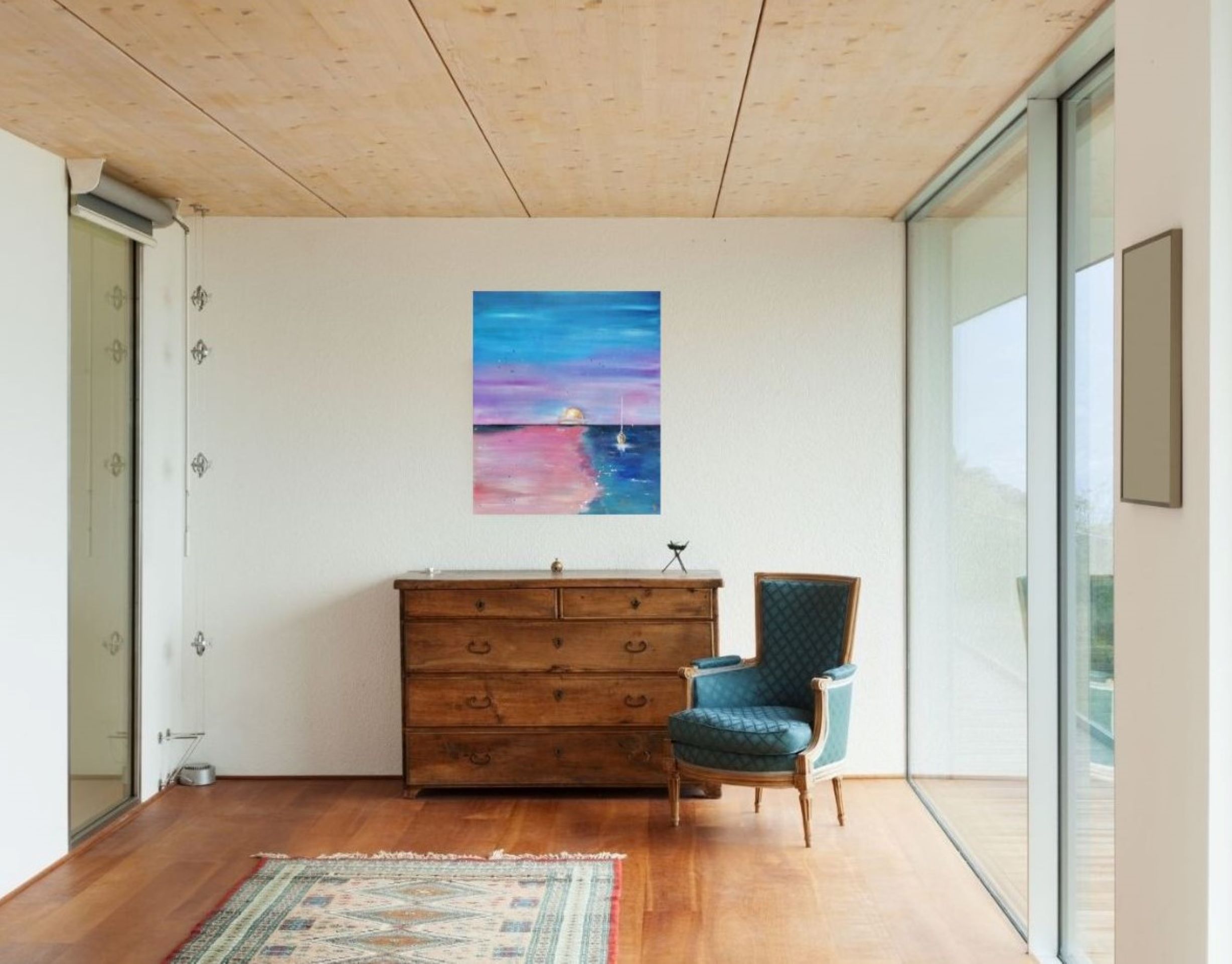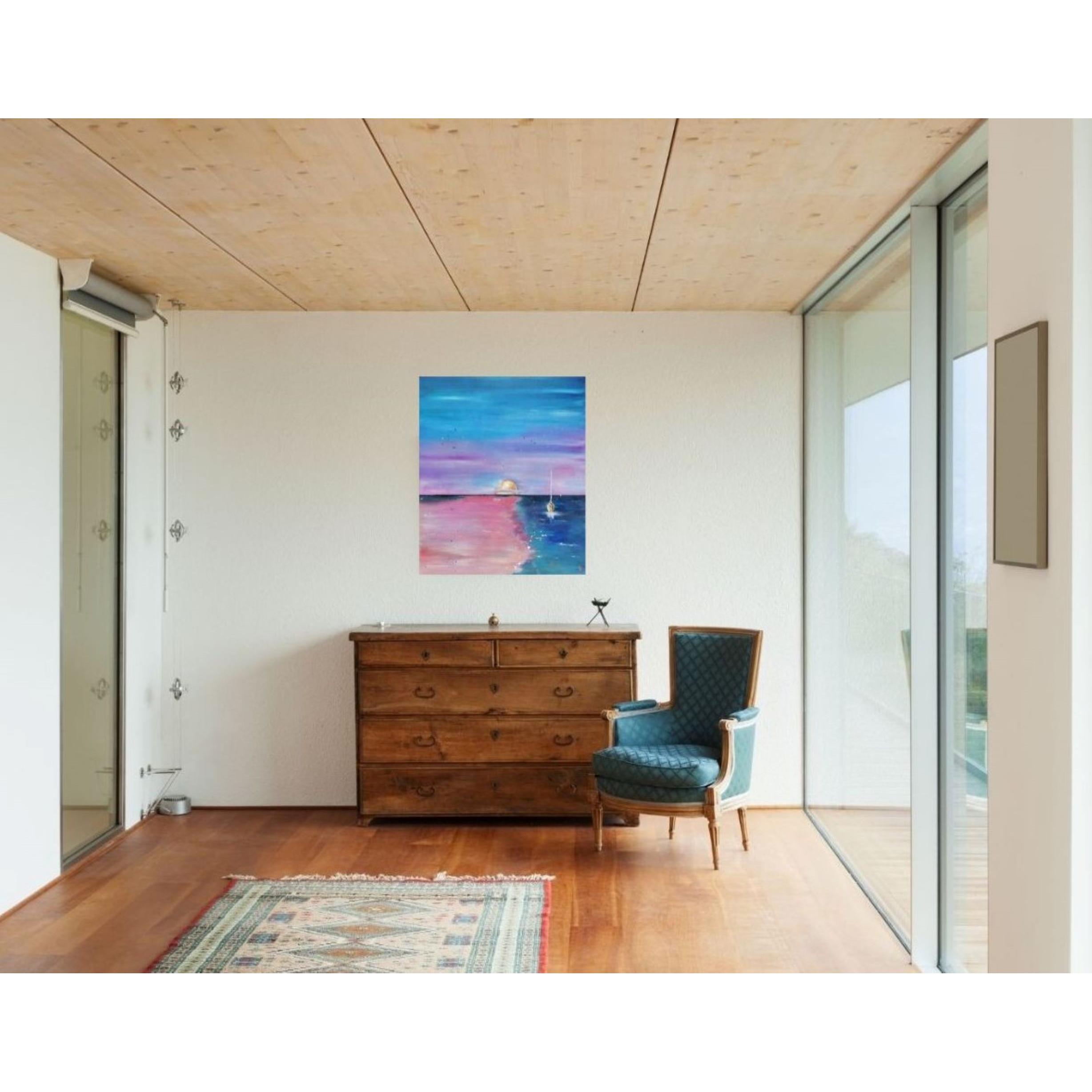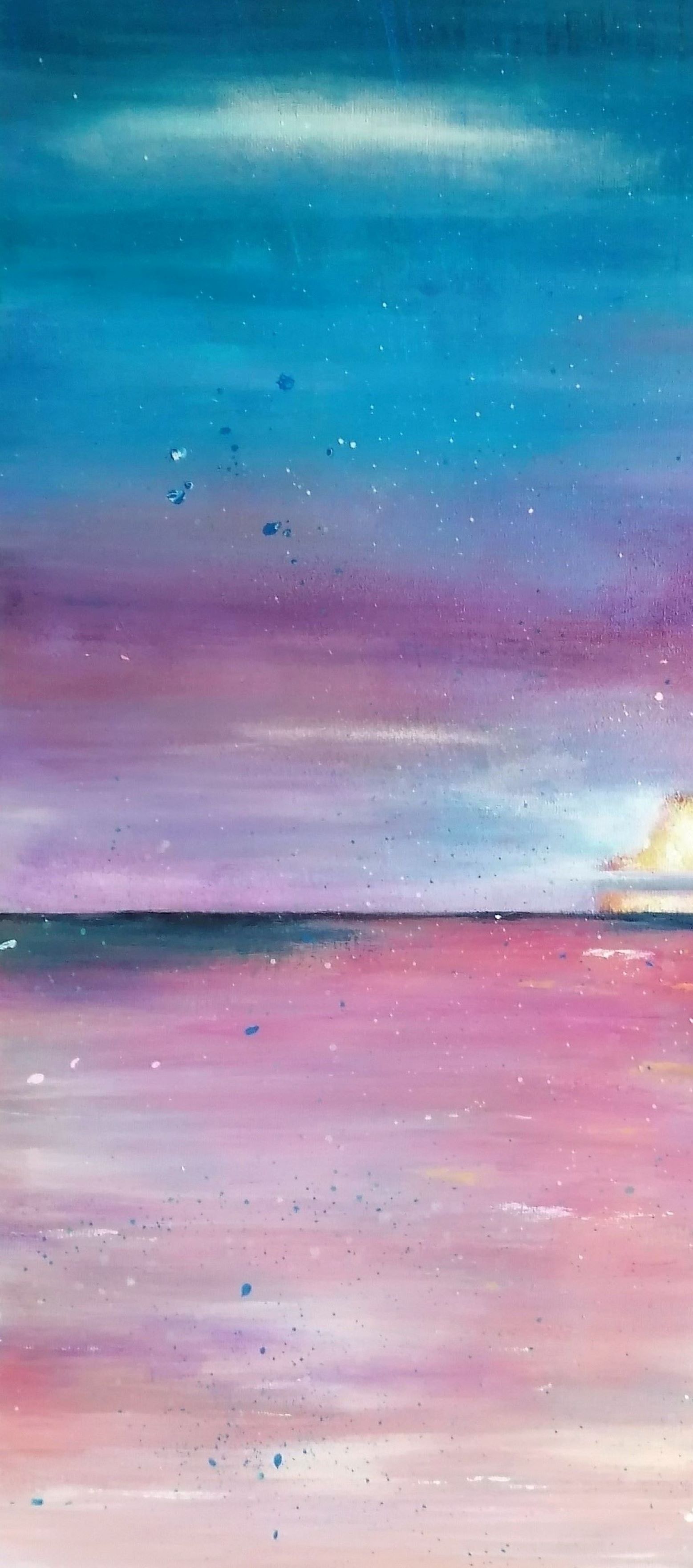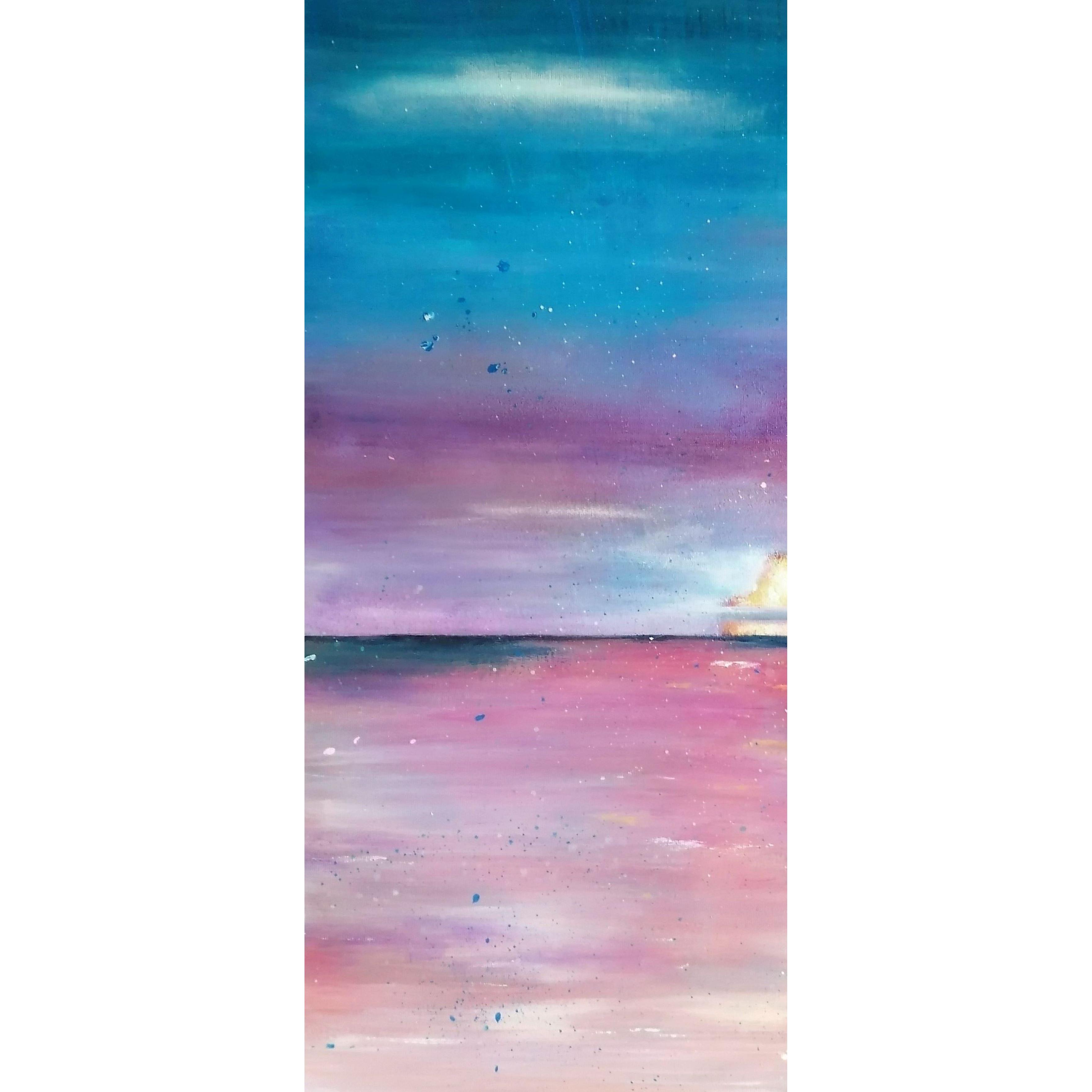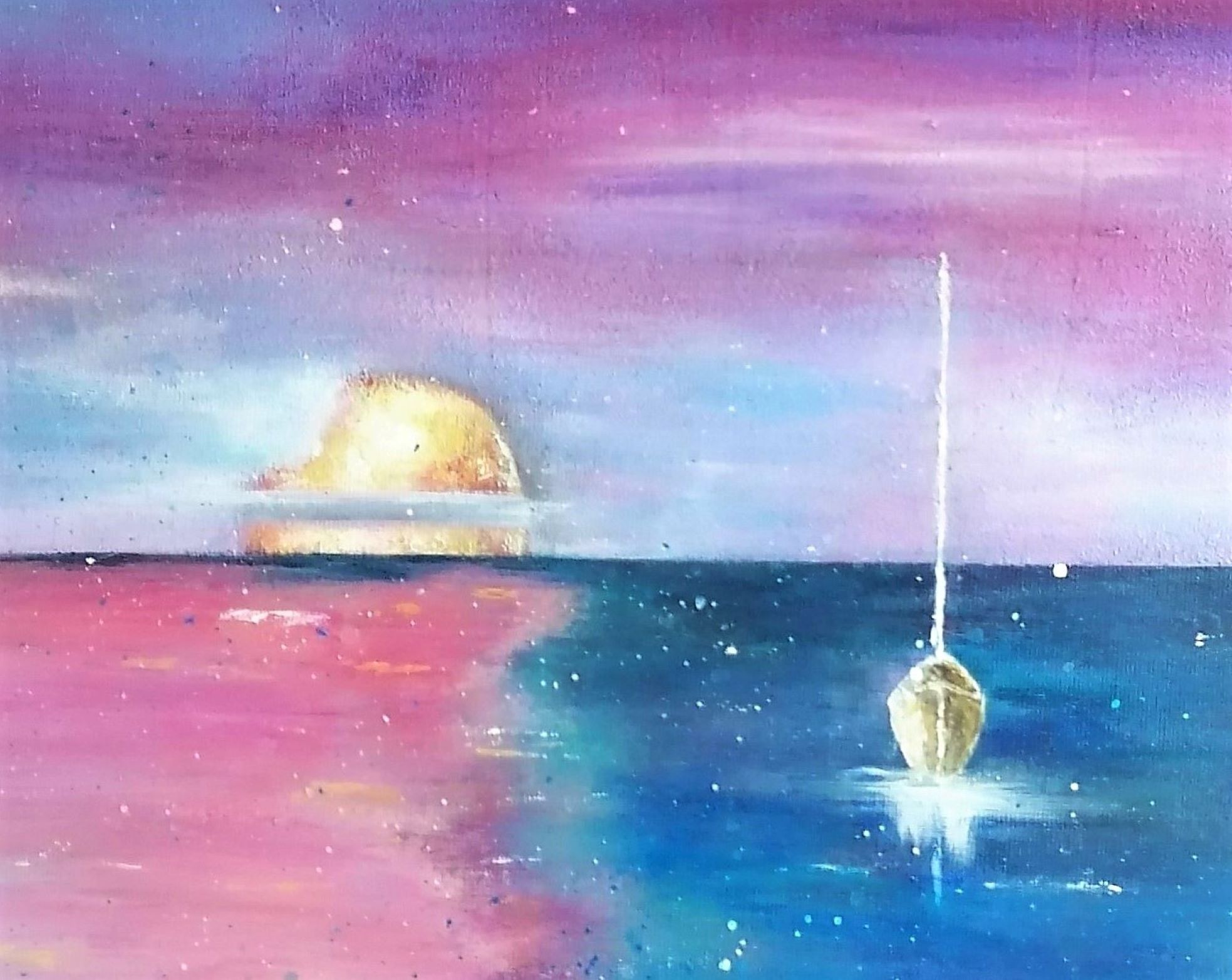 Plus figuratif que d' autres que j'ai pu faire, ce paysage de bord de mer reste dans l'esprit du rêve et de la quiétude, avec ce petit voilier isolé sur une mer calme profitant du spectacle d'un coucher de soleil sur la mer. Acrylique finition vernis