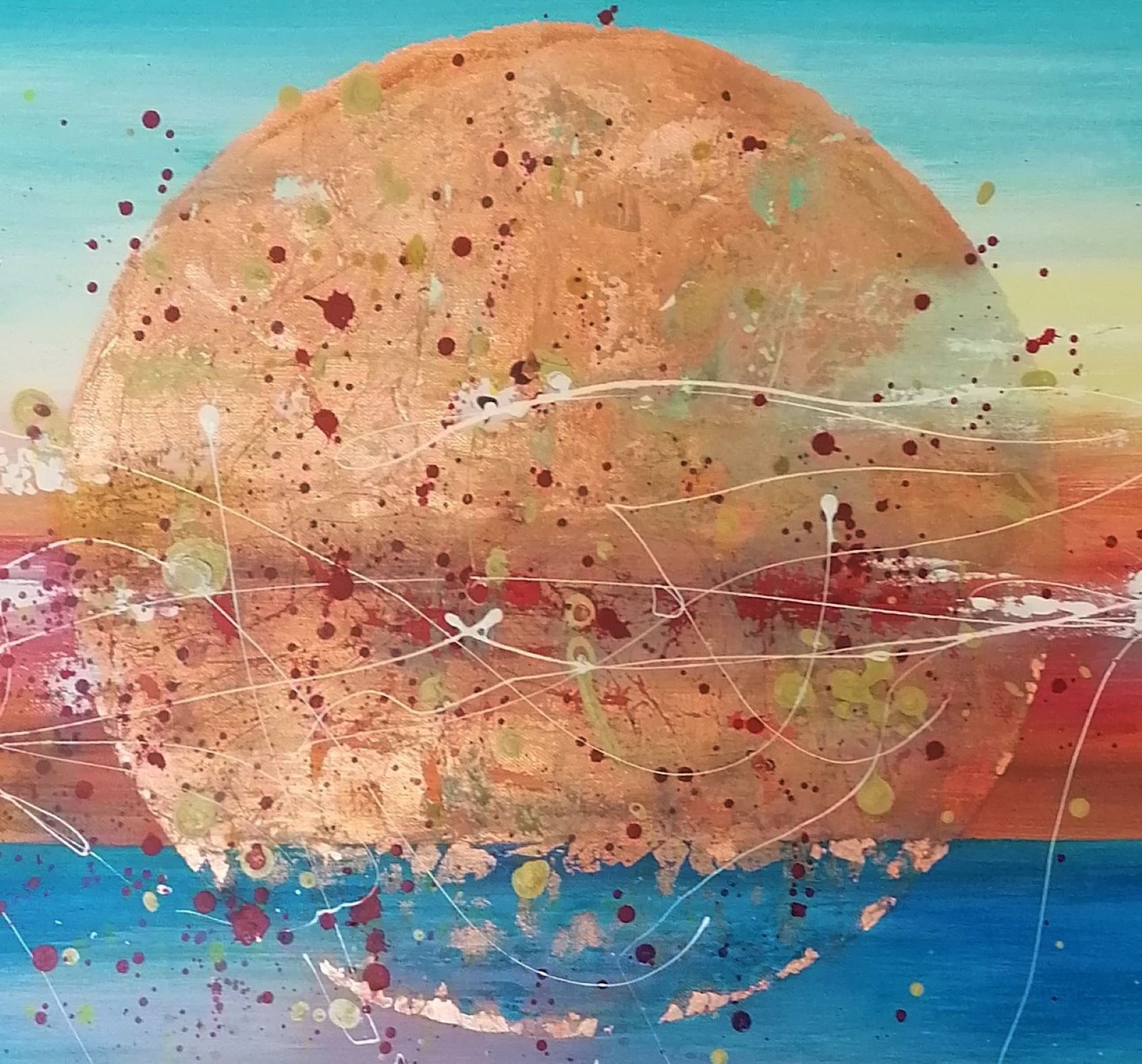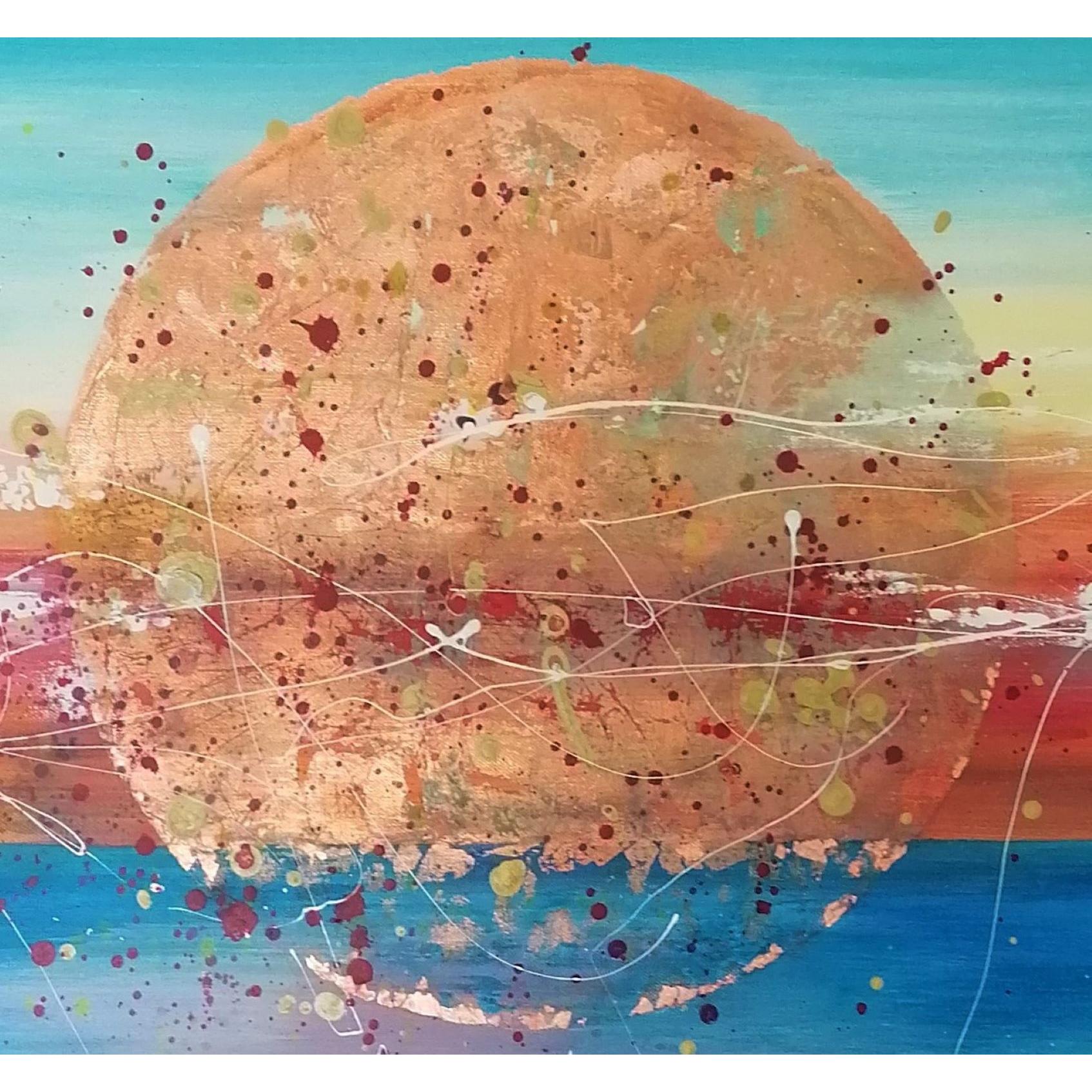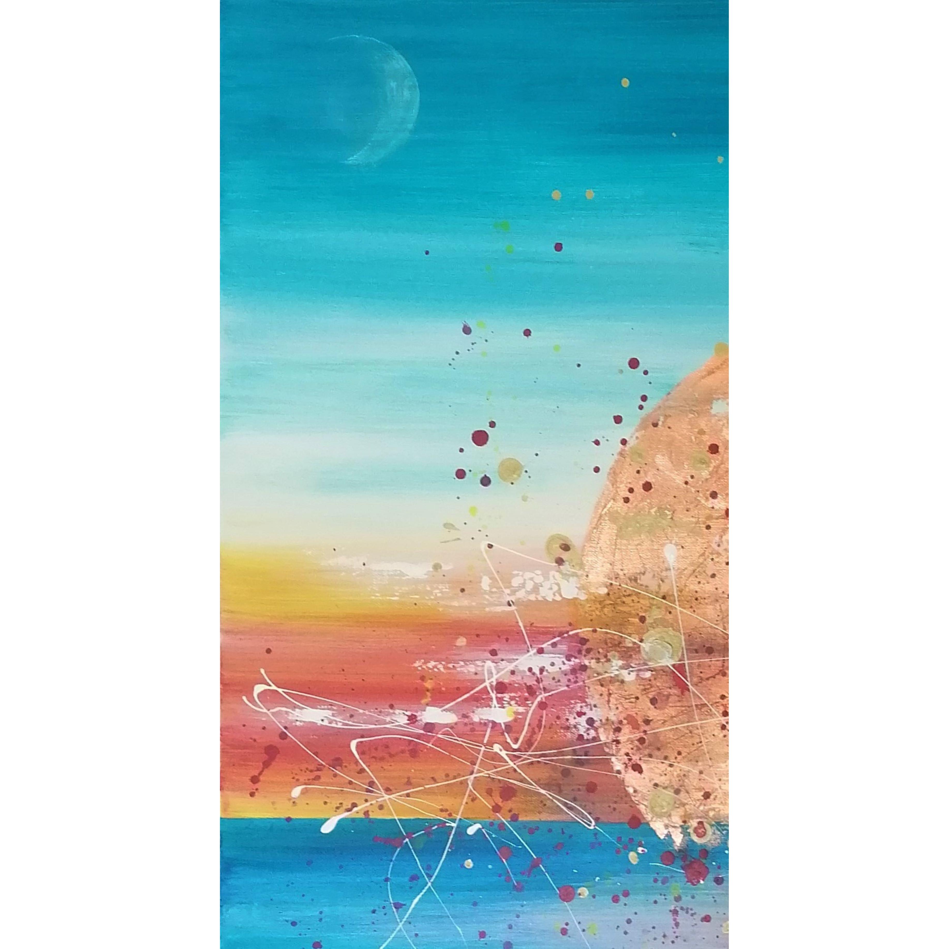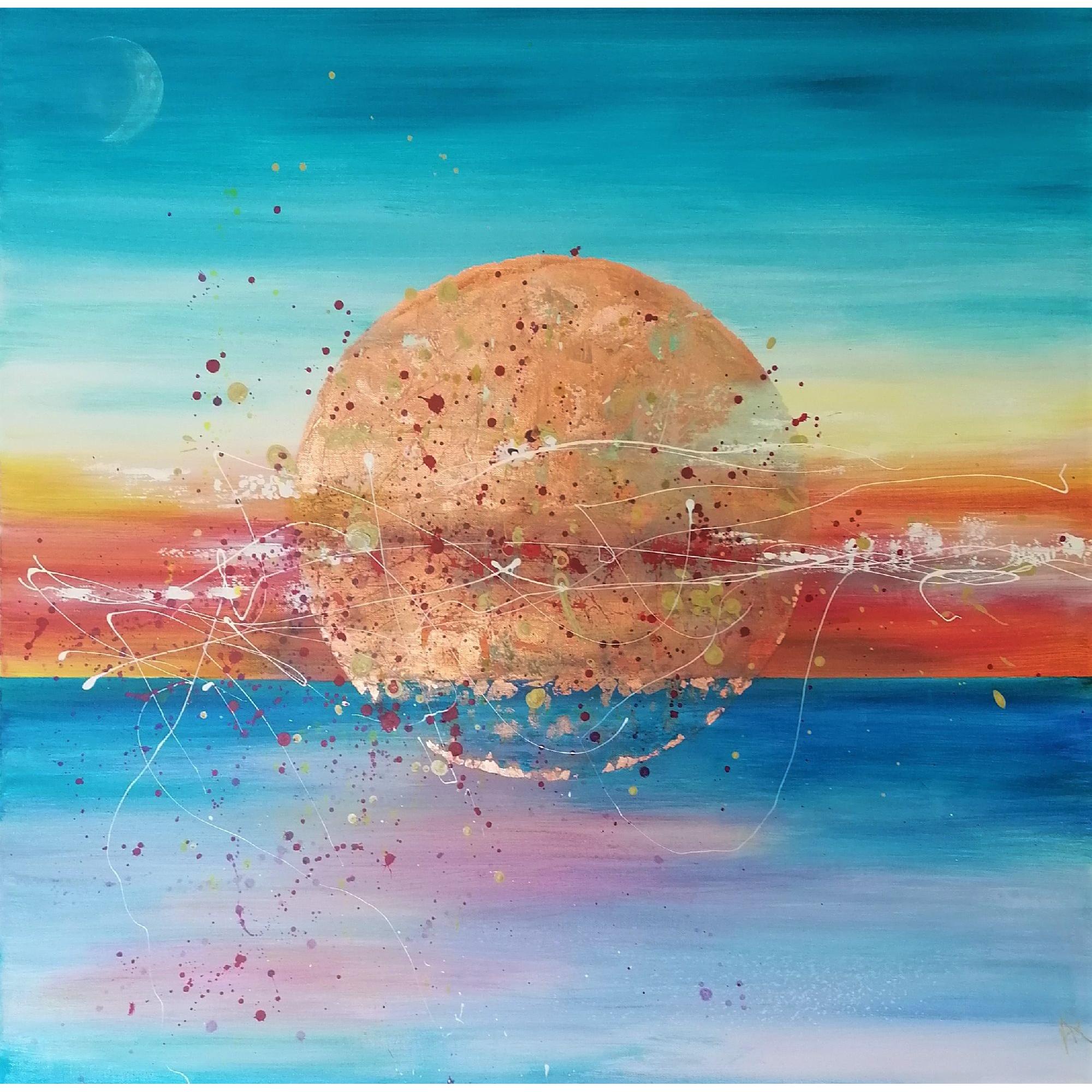 Le soleil a rendez-vous avec la lune. Et elle arrive ! Inspiration réalisée à ma façon des somptueux couchers de soleil bretons sur l'océan. Acrylique à la brosse et dripping, et feuille cuivrée sur châssis entoilé, finition vernis.