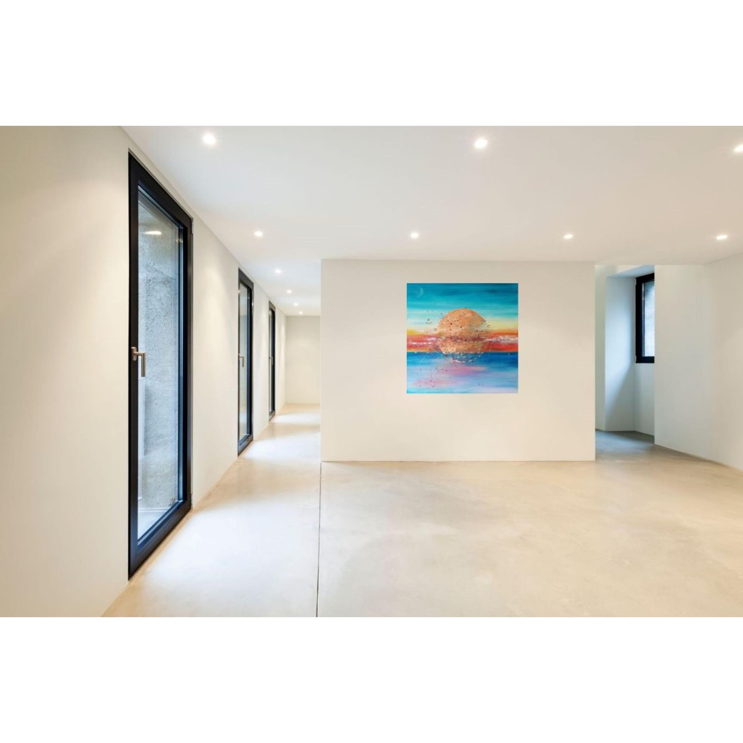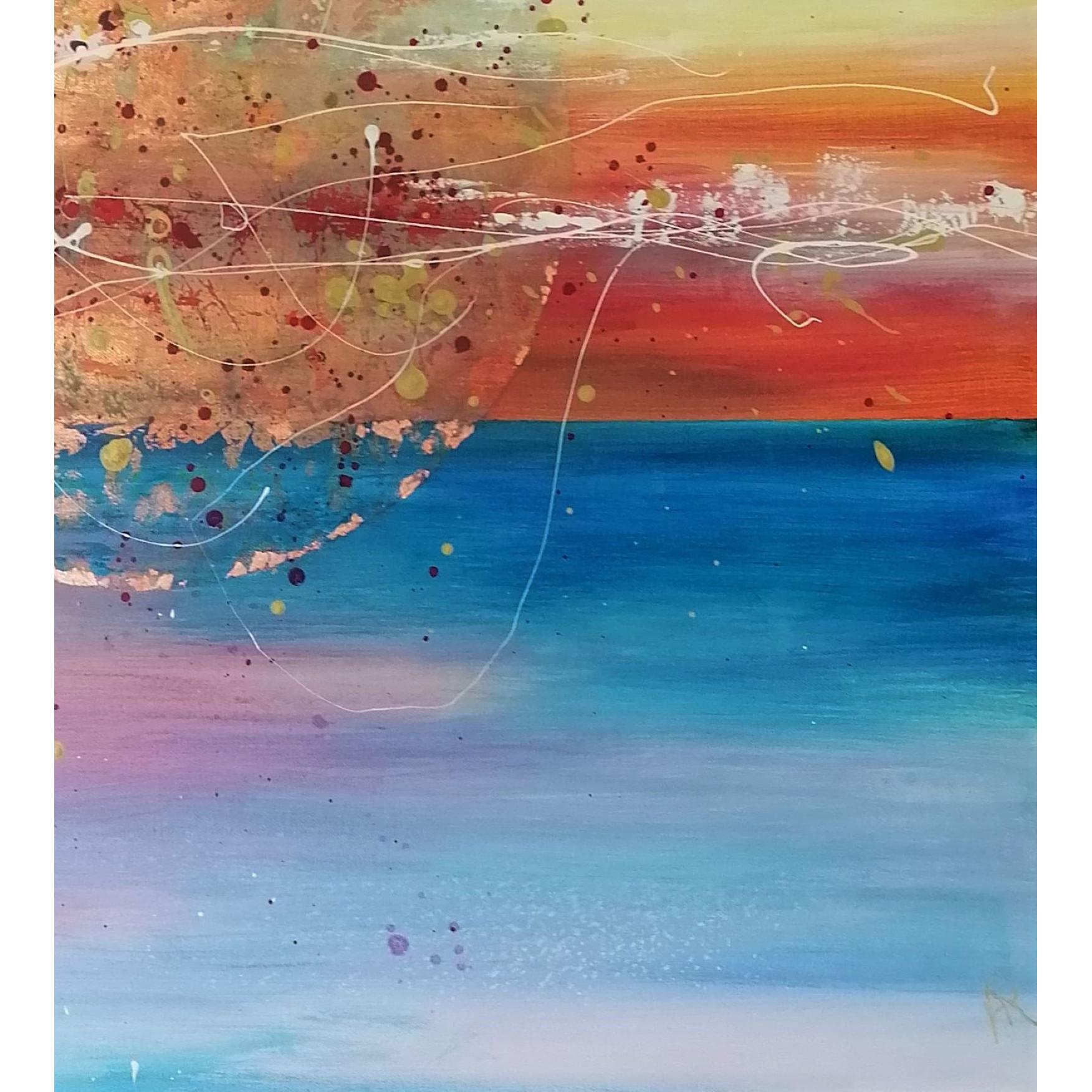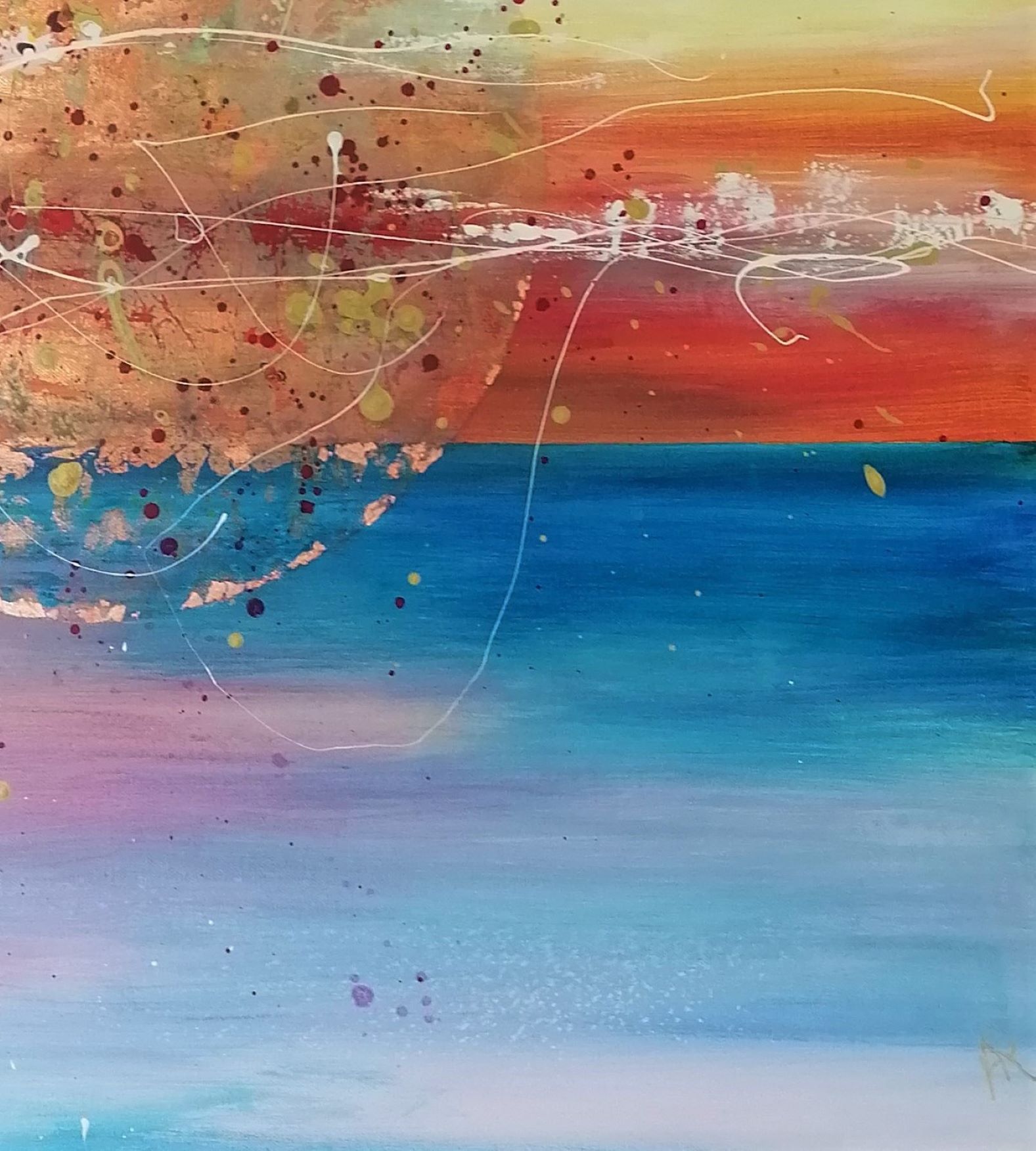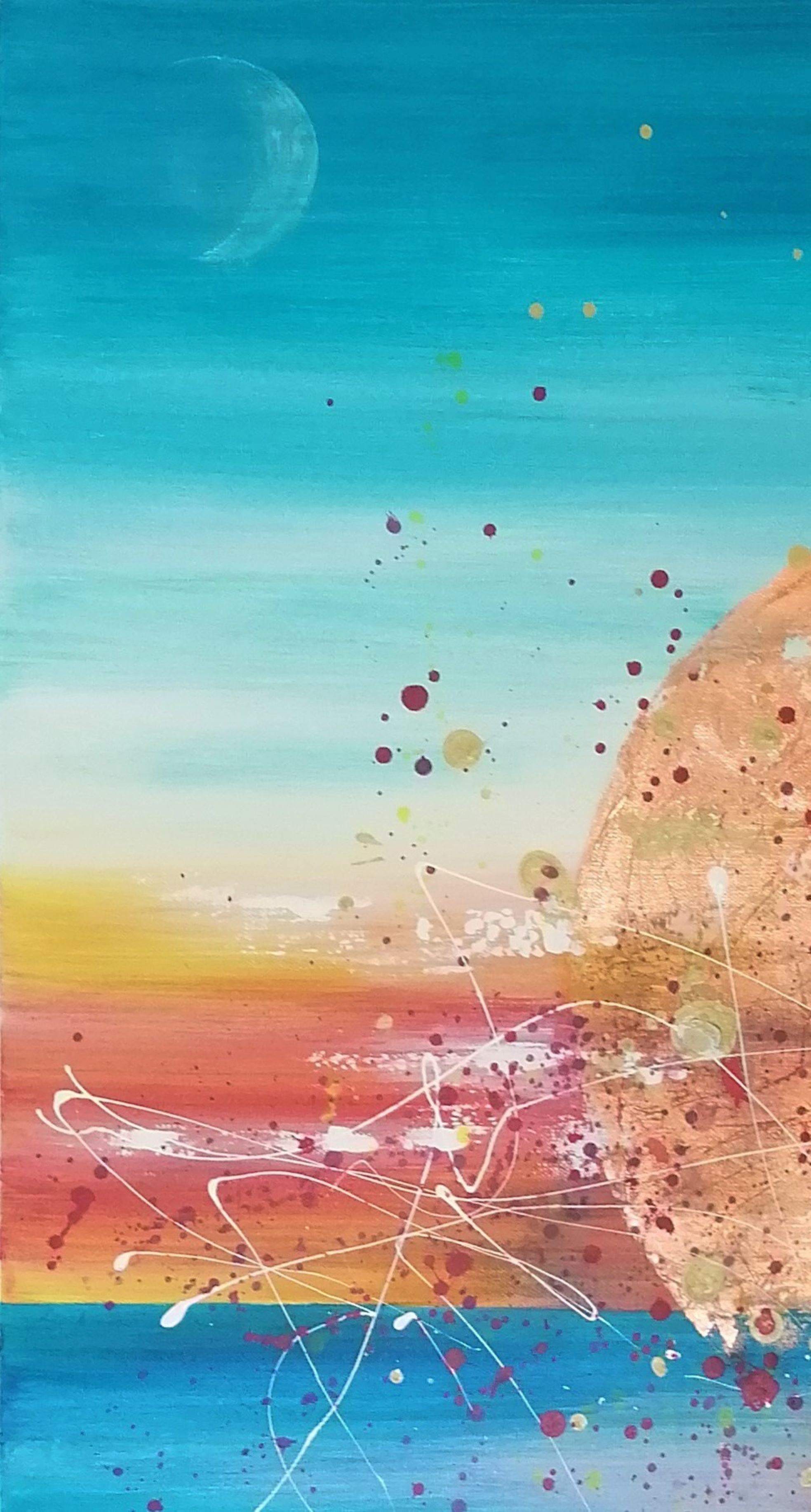 Le soleil a rendez-vous avec la lune. Et elle arrive ! Inspiration réalisée à ma façon des somptueux couchers de soleil bretons sur l'océan. Acrylique à la brosse et dripping, et feuille cuivrée sur châssis entoilé, finition vernis.