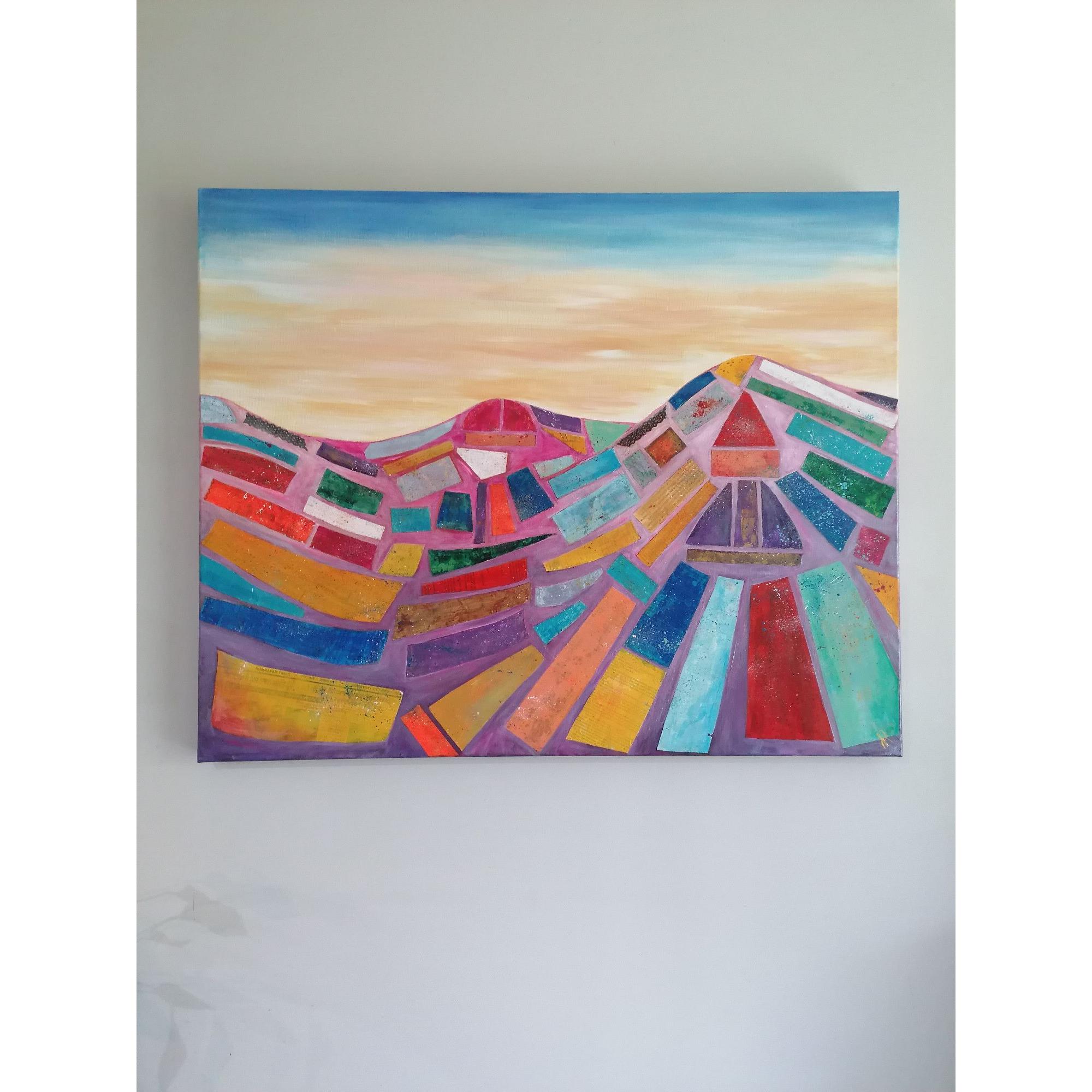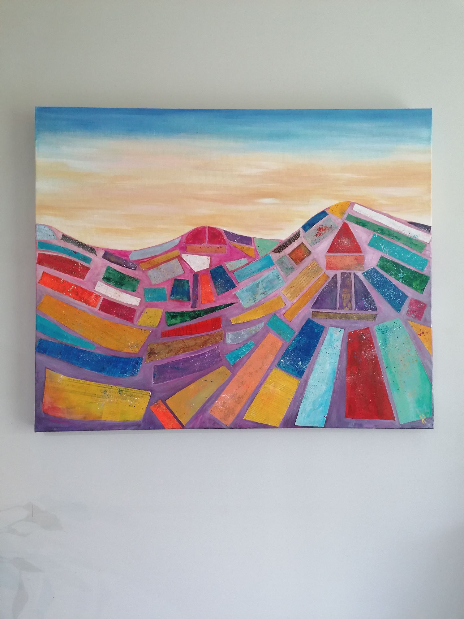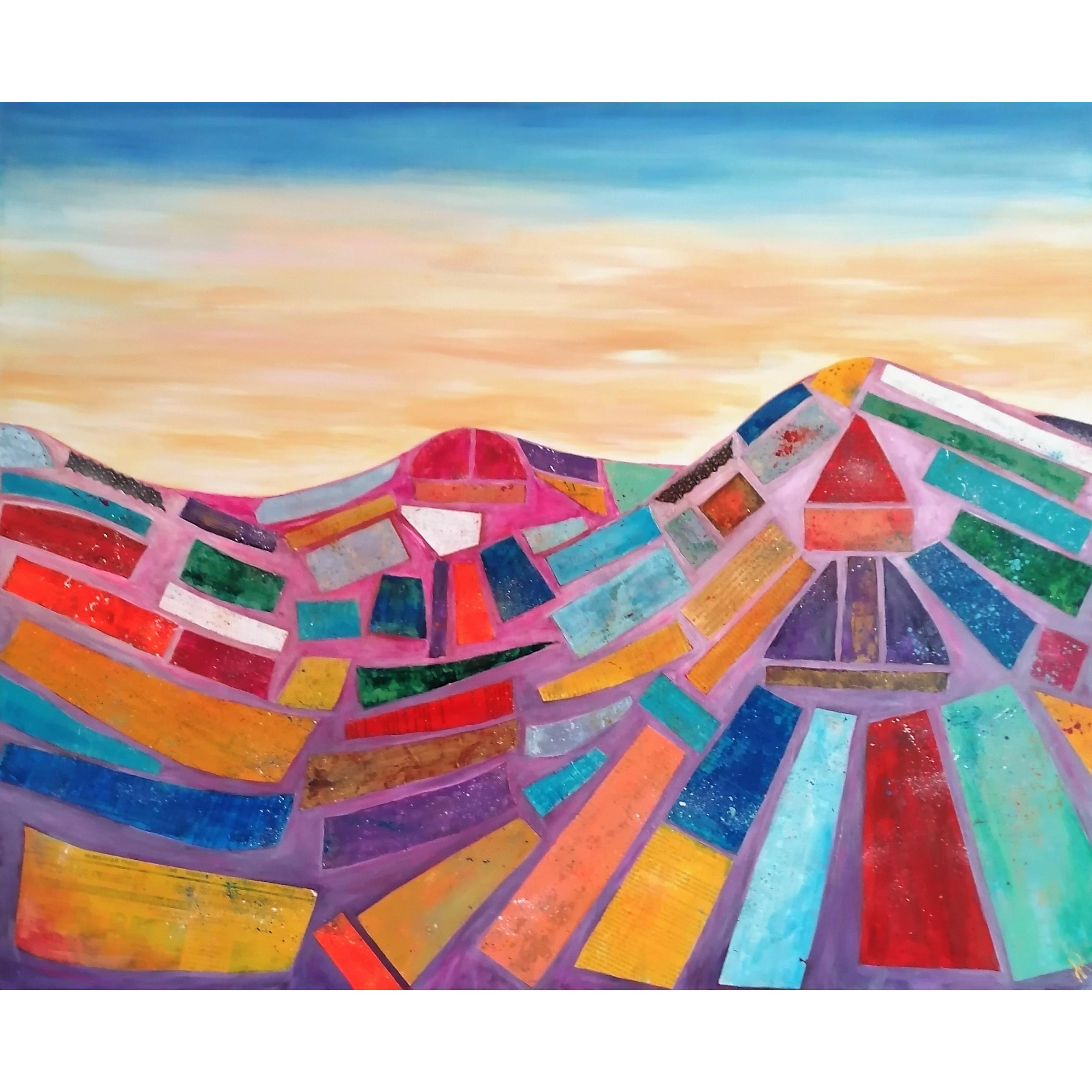 Inspiration des véritables montagnes arc-en-ciel, mais d'un visuel différent et dans un style naif, ces montagnes cachent des secrets derrière leurs couleurs, avec des effets de matières, collages d'images, de notes de musique ou de diverses calligraphies. Ces montagnes n'ont pas fini de nous surprendre. Acrylique, collages et empâtements, sur châssis entoilé 3D de 80x100x4 cm, finition vernis.