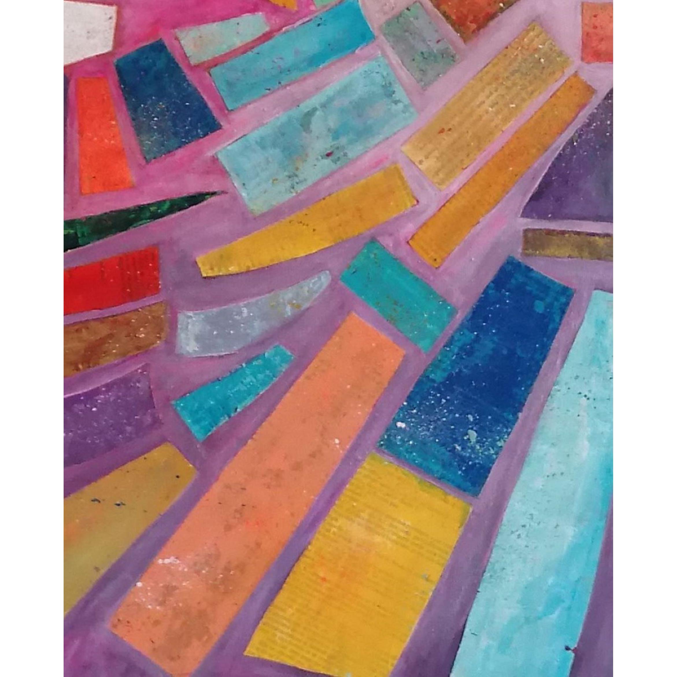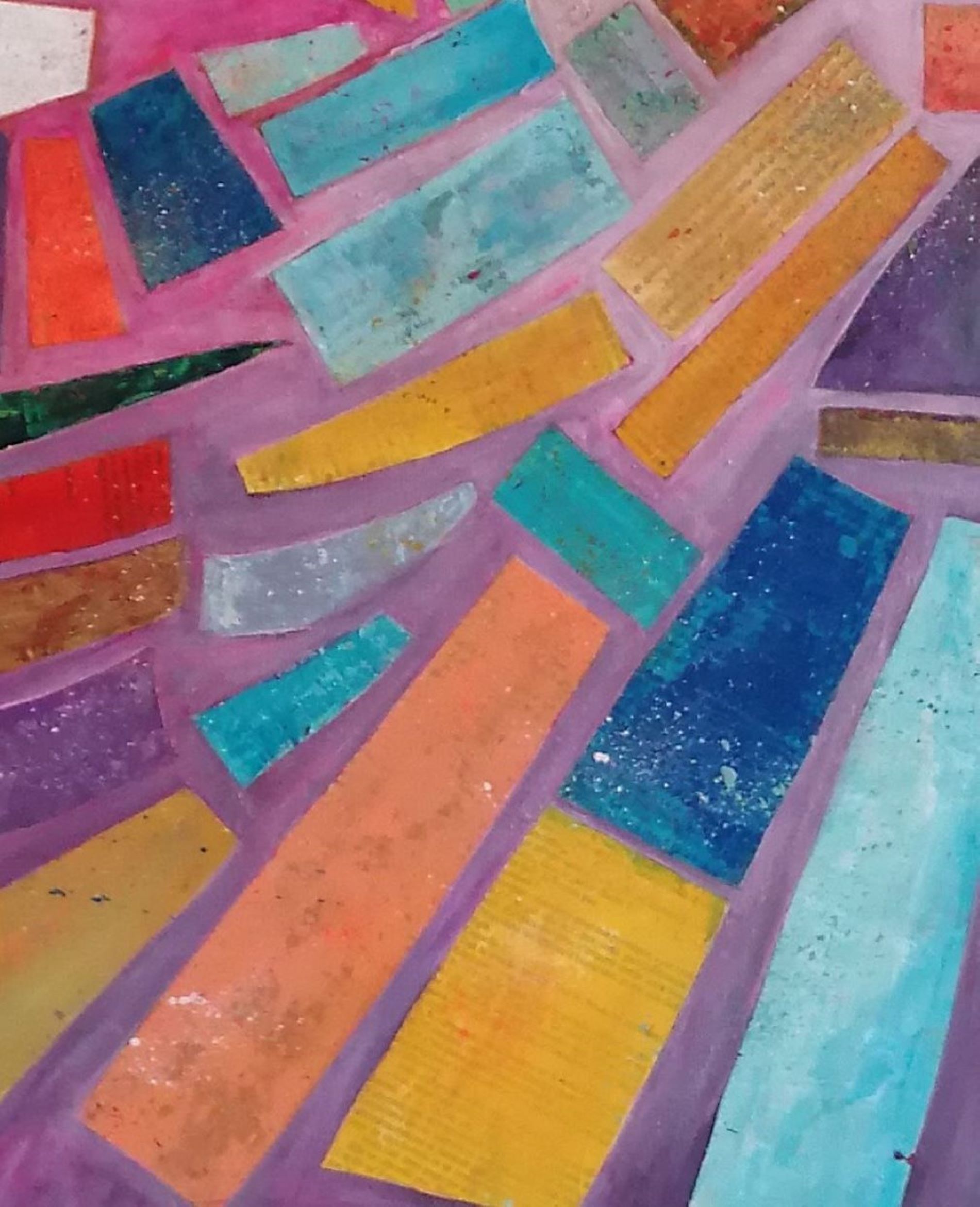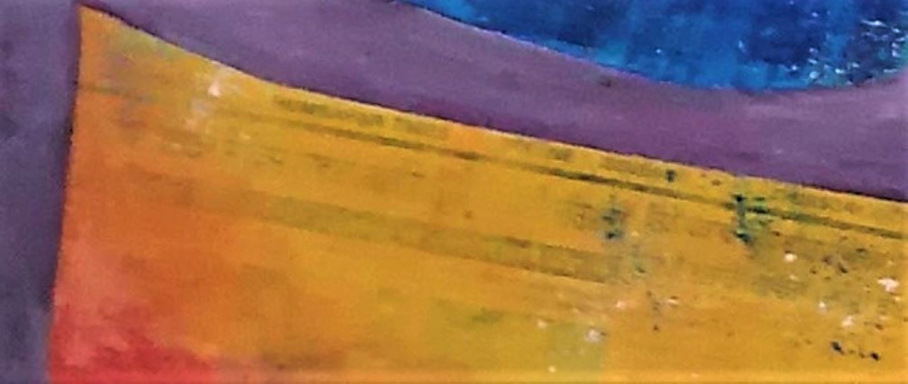 Inspiration des véritables montagnes arc-en-ciel, mais d'un visuel différent et dans un style naif, ces montagnes cachent des secrets derrière leurs couleurs, avec des effets de matières, collages d'images, de notes de musique ou de diverses calligraphies. Ces montagnes n'ont pas fini de nous surprendre. Acrylique, collages et empâtements, sur châssis entoilé 3D de 80x100x4 cm, finition vernis.