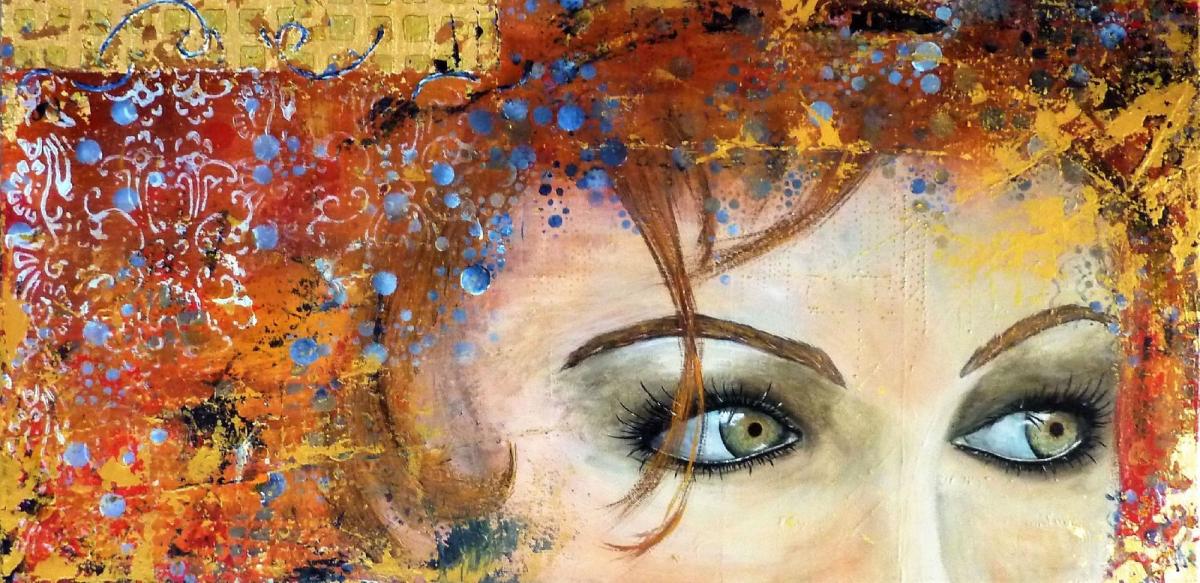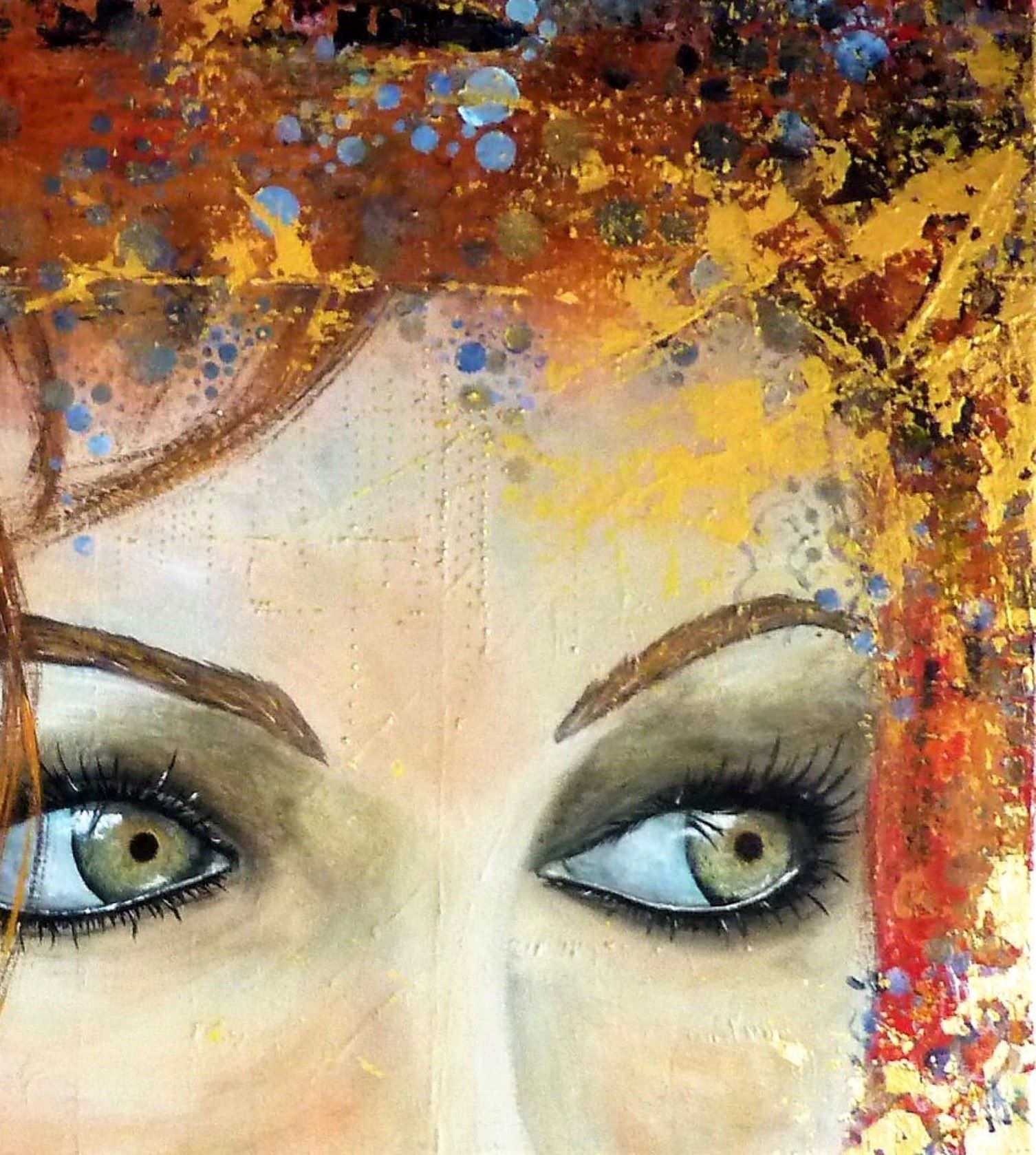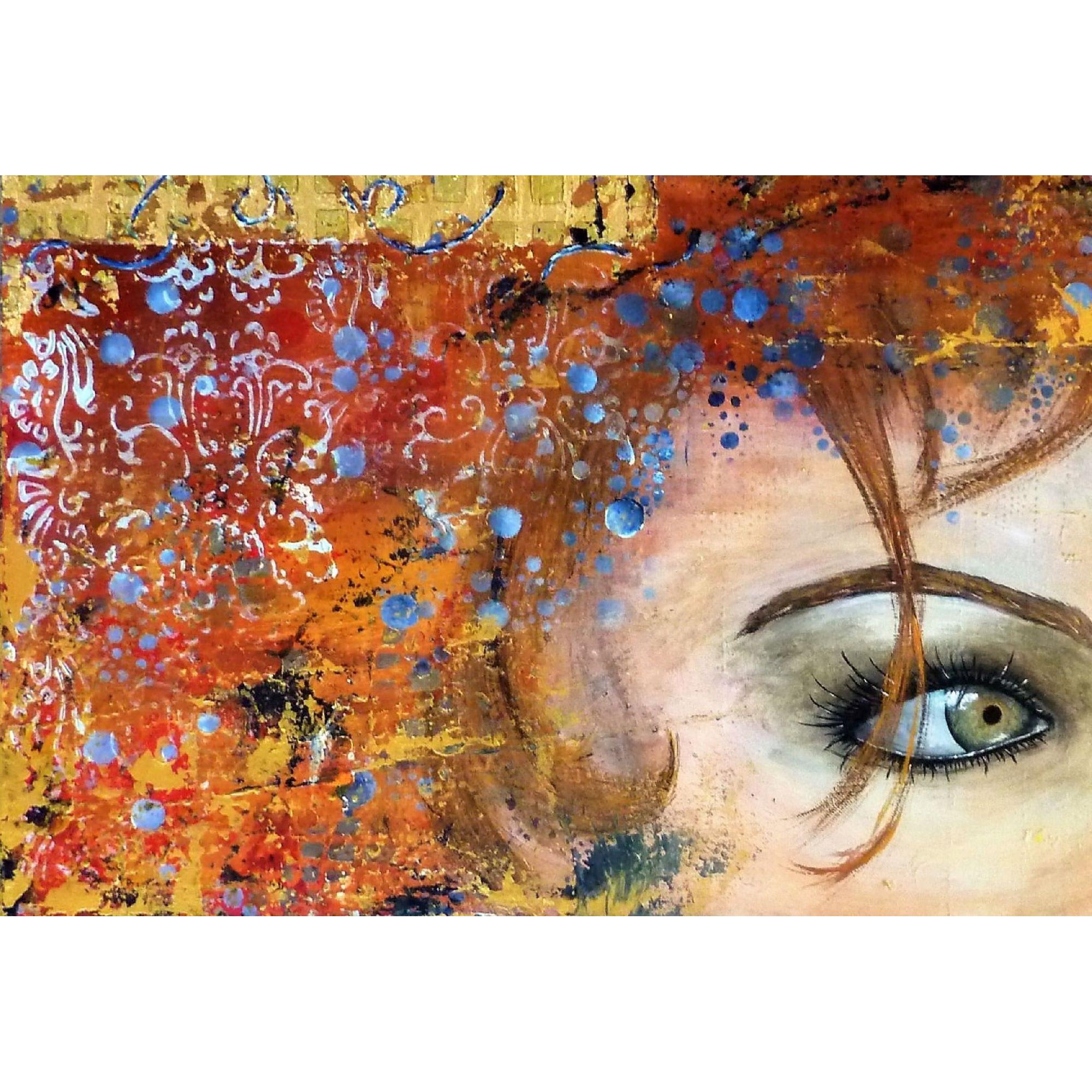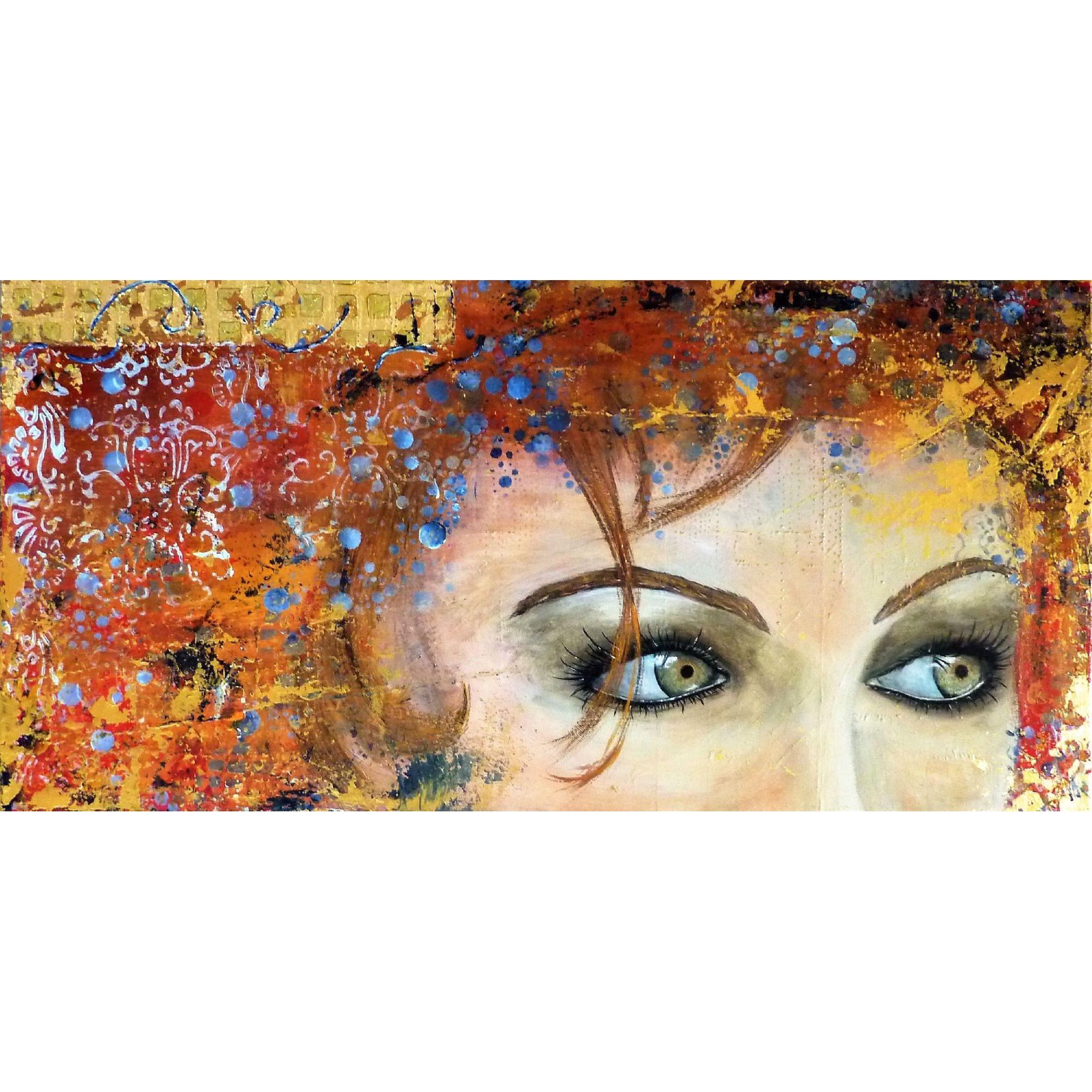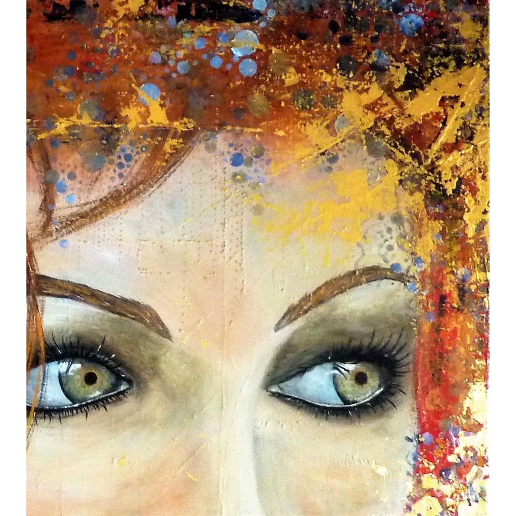 La puissance du regard. Ici une nostalgie un peu figée dans ces jolis yeux gris-verts, qui contraste avec les couleurs vives et gaies, les multiples motifs et le mouvement que cela dégage.Technique mixte sur une création aléatoire de nombreux petits reliefs, feuille dorée, finition vernis.