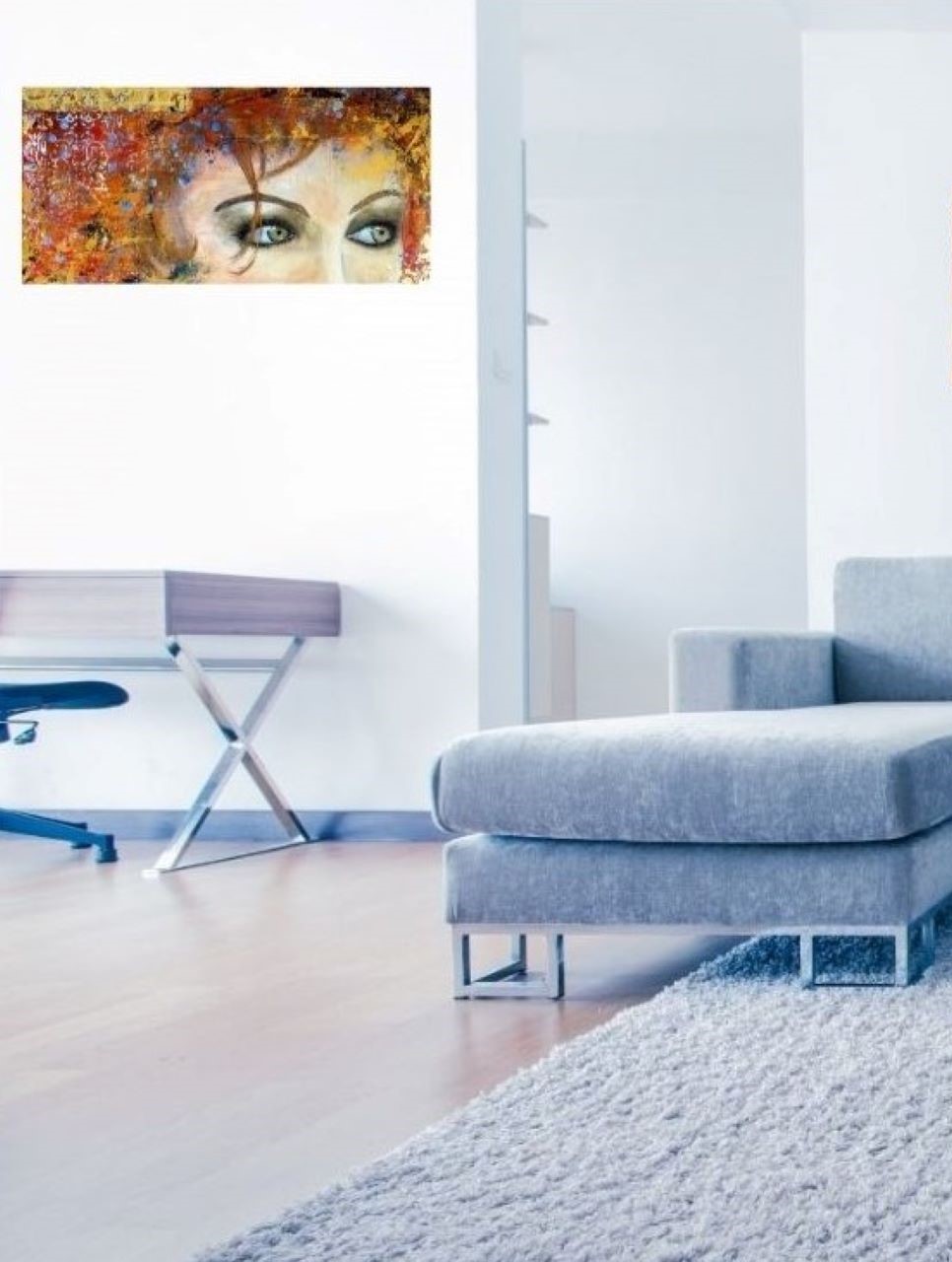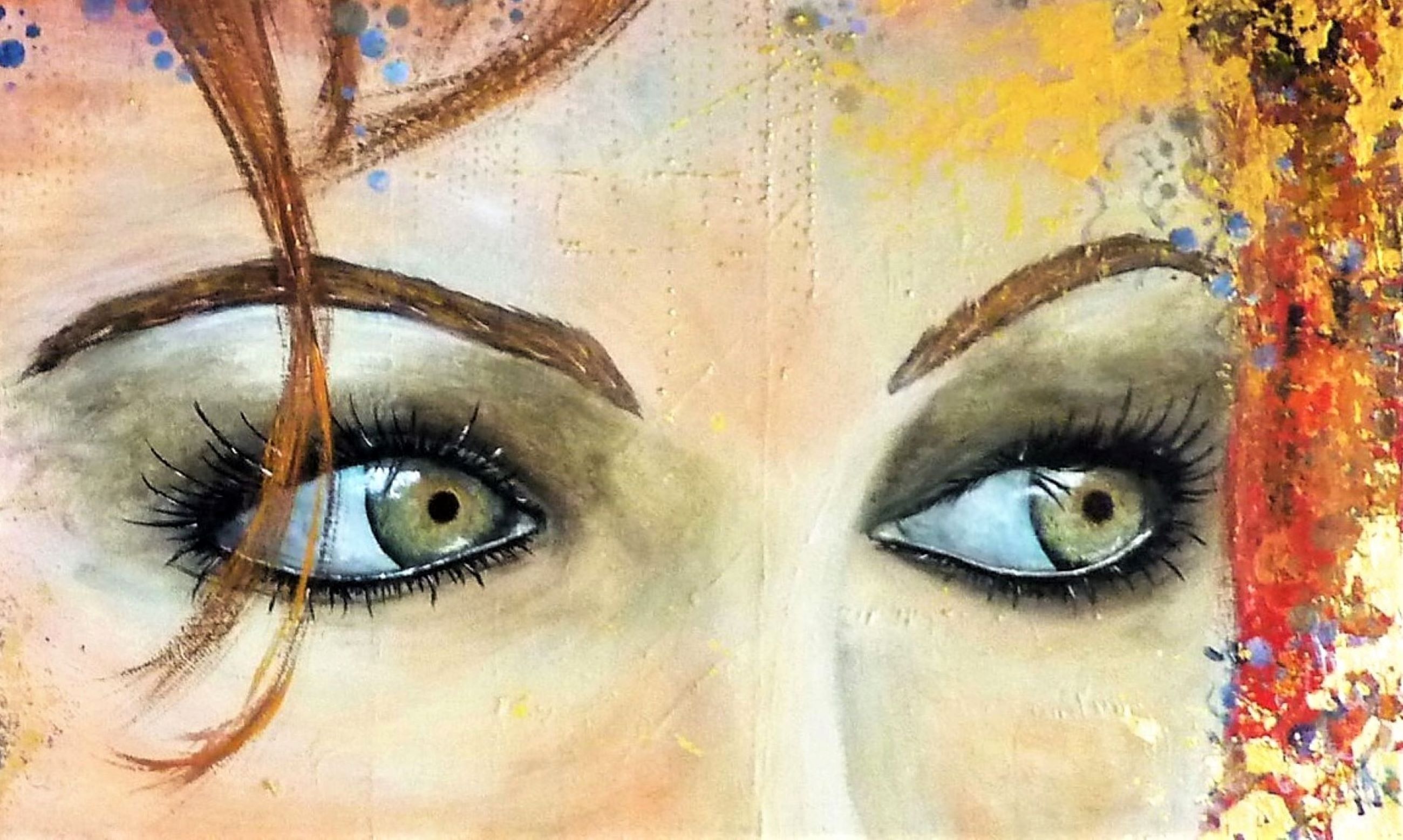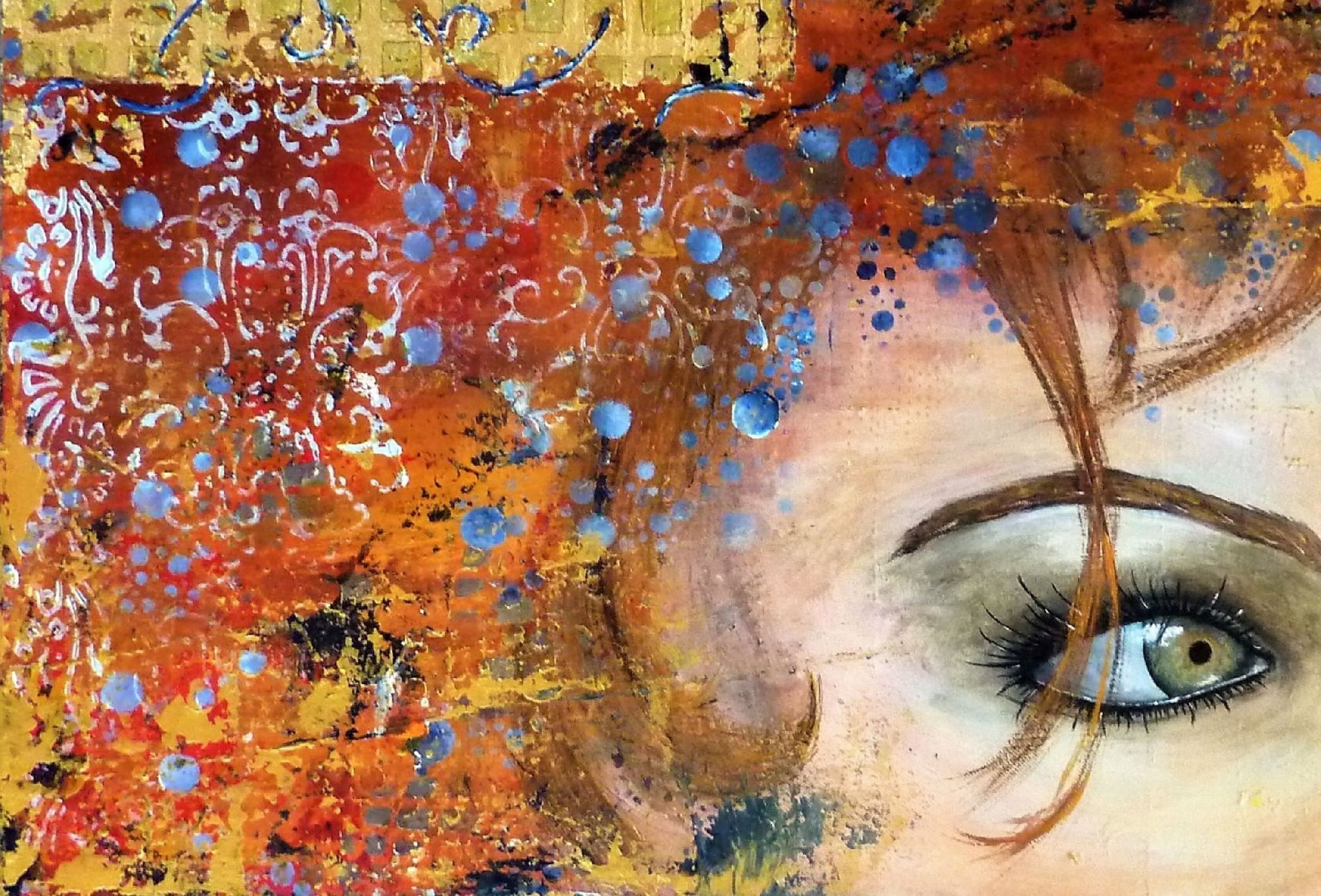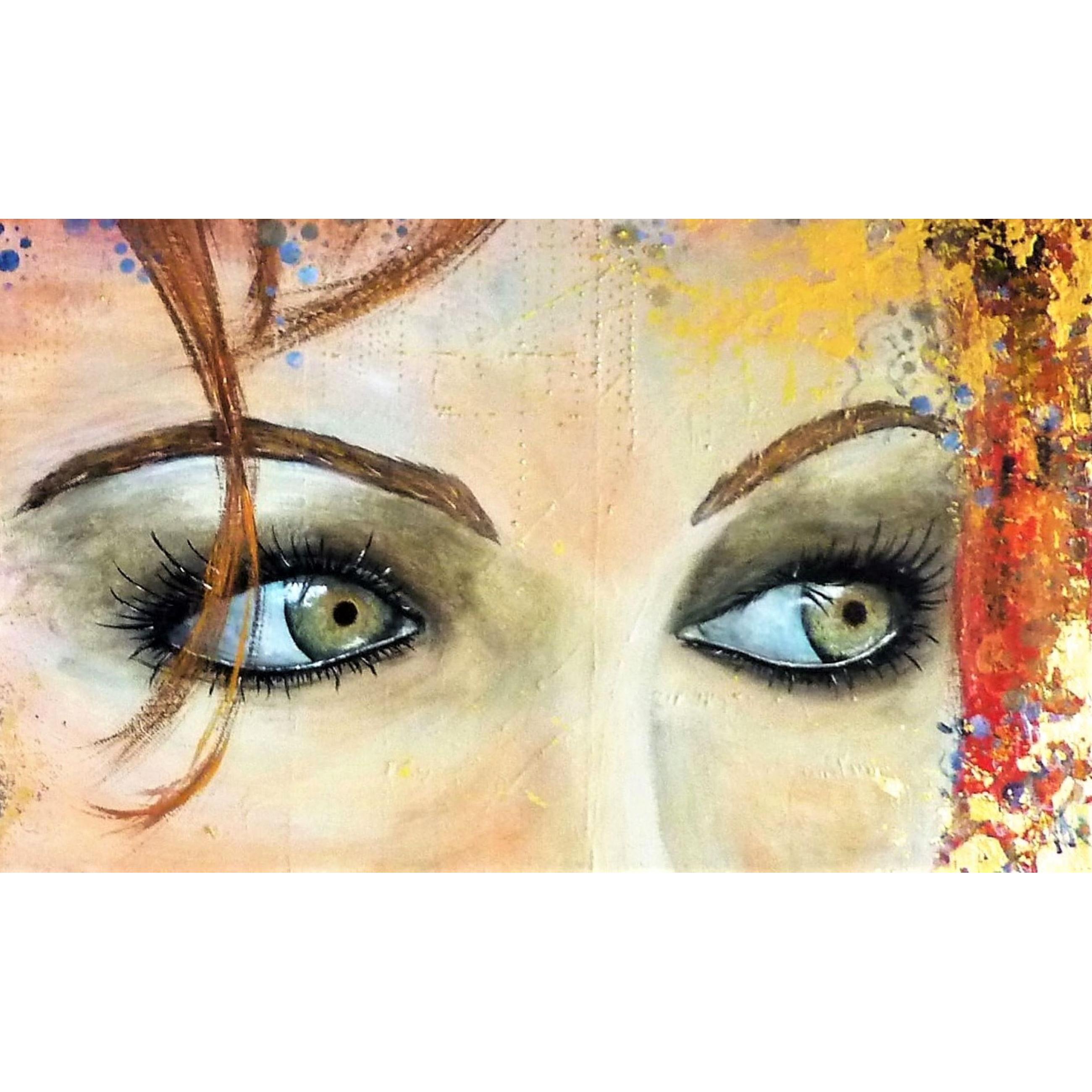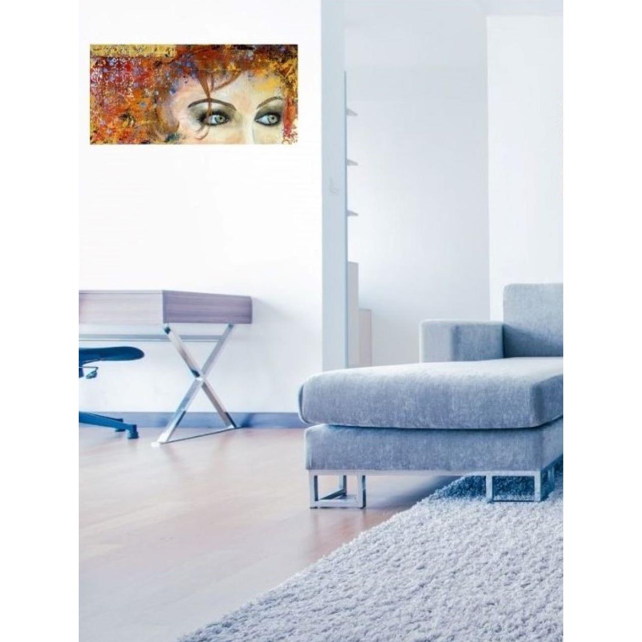 La puissance du regard. Ici une nostalgie un peu figée dans ces jolis yeux gris-verts, qui contraste avec les couleurs vives et gaies, les multiples motifs et le mouvement que cela dégage.Technique mixte sur une création aléatoire de nombreux petits reliefs, feuille dorée, finition vernis.
