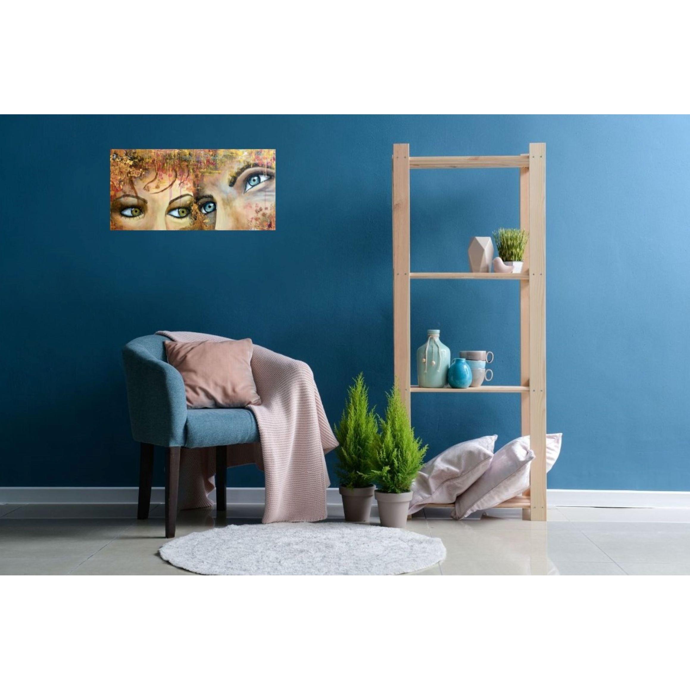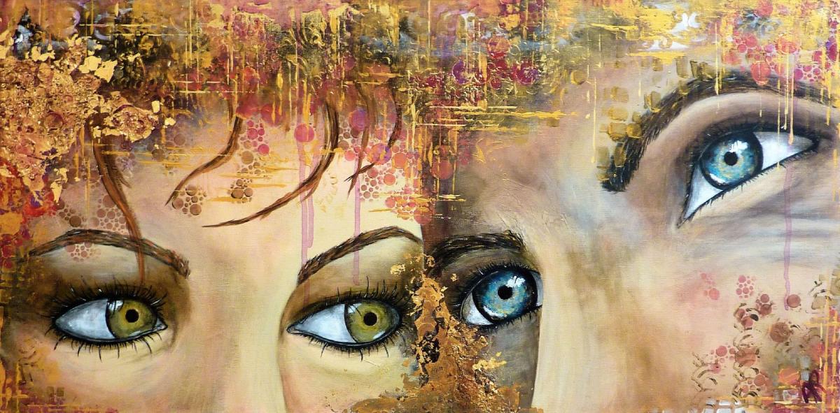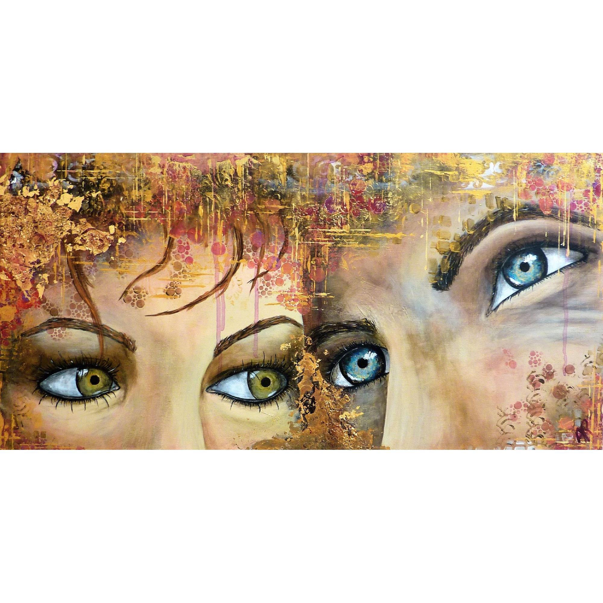 Pour une fois le couple est ici présenté. Avec sa tendresse et ses failles, ses regards, ses attentes, sa proximité et sa distance, l'ambivalence mais l'amour...Technique mixte sur châssis entoilé de 40x80x3 cm,reliefs, feuille dorée, craquelures, avec une finition vernis.