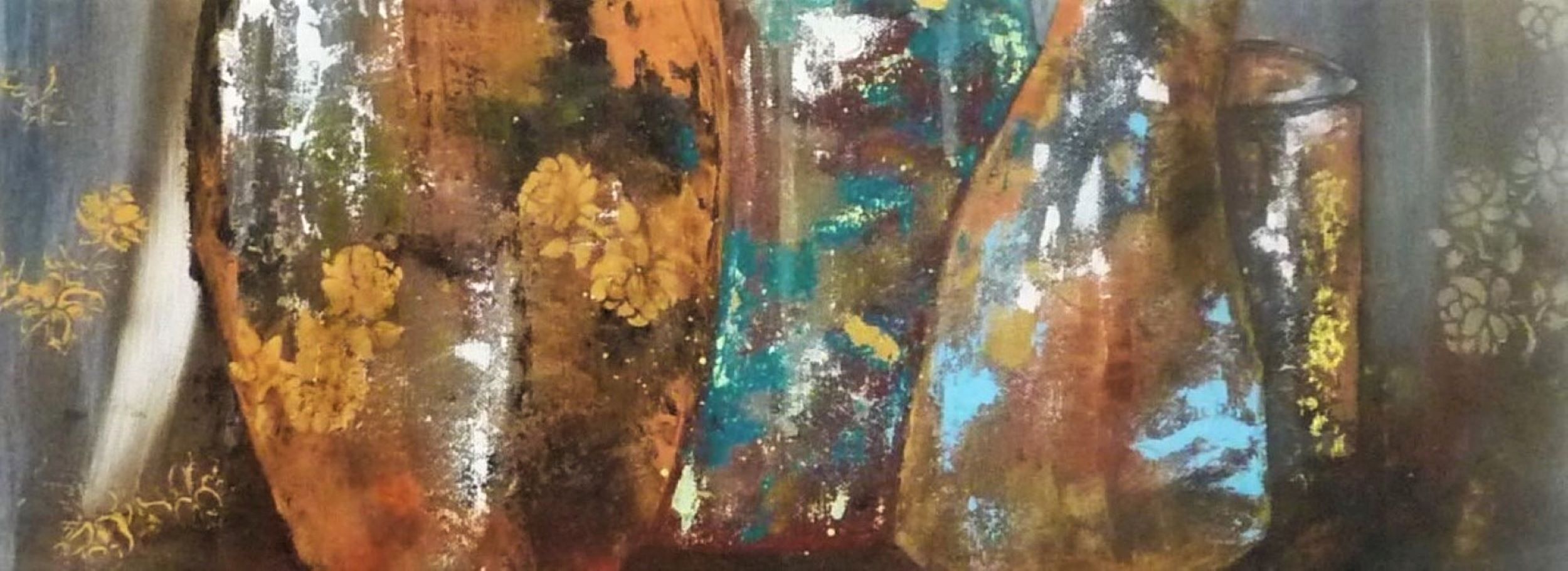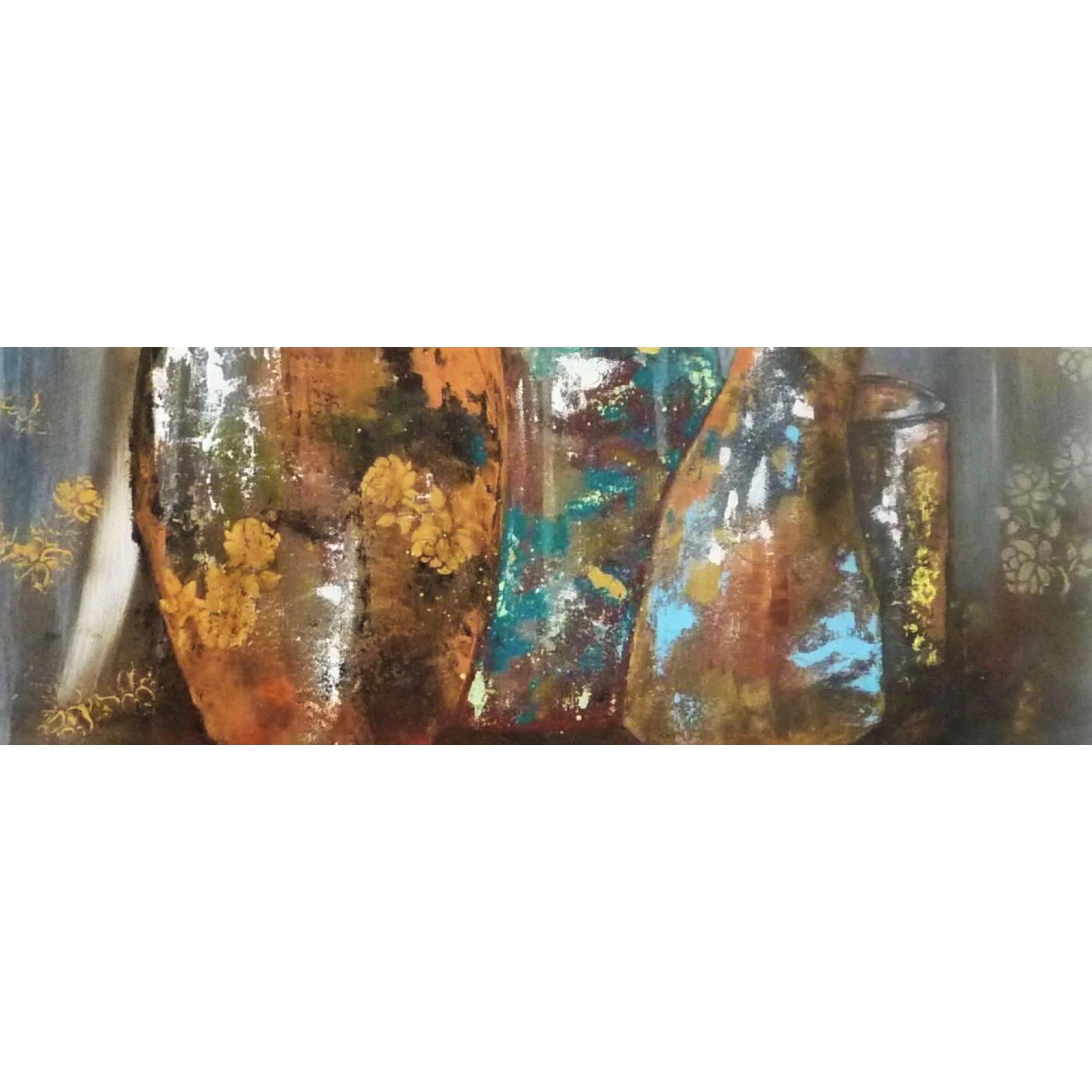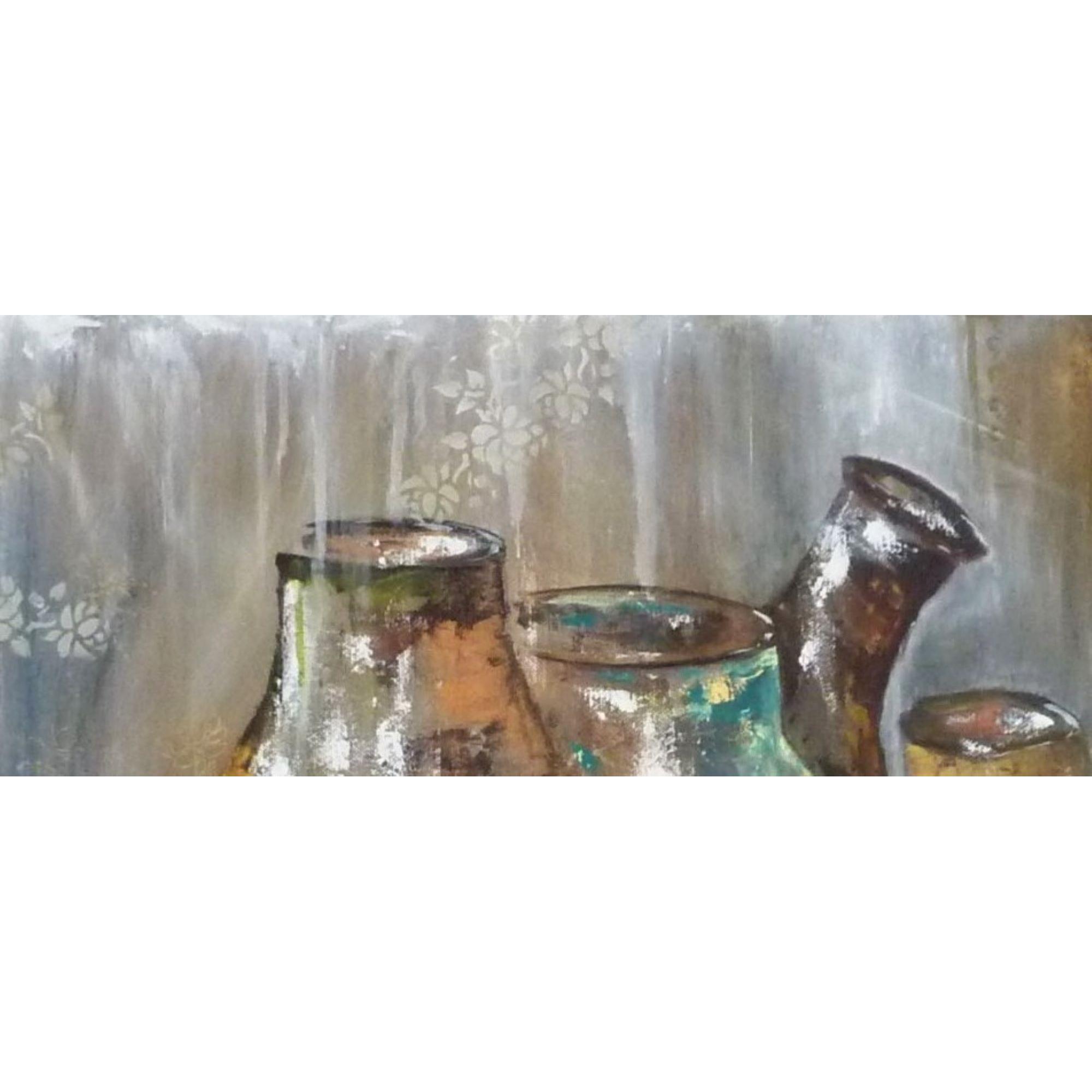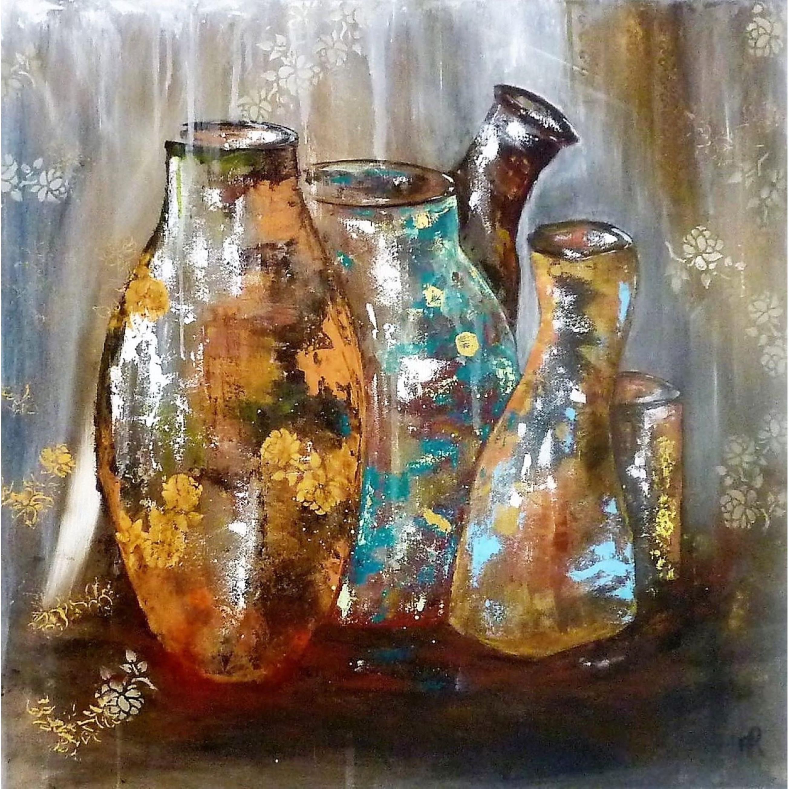 Vieux pots et jarres tout tordus, dans un esprit typiquement méditerranéen. Acrylique sur châssis entoilé format 3 D, avec des contrastes de tonalités et des jeux de transparences, coulures, sans oublier une touche dorée (peinture et feuille dorée) et cuivrée. Finition vernis.