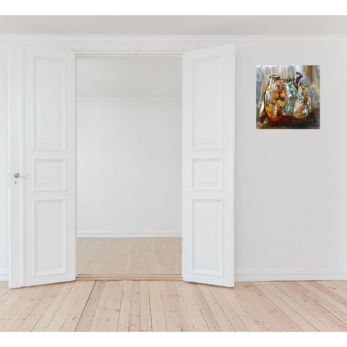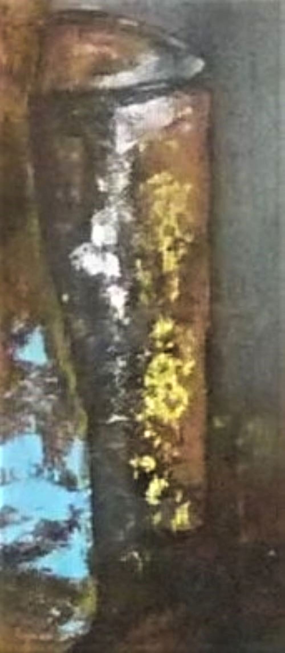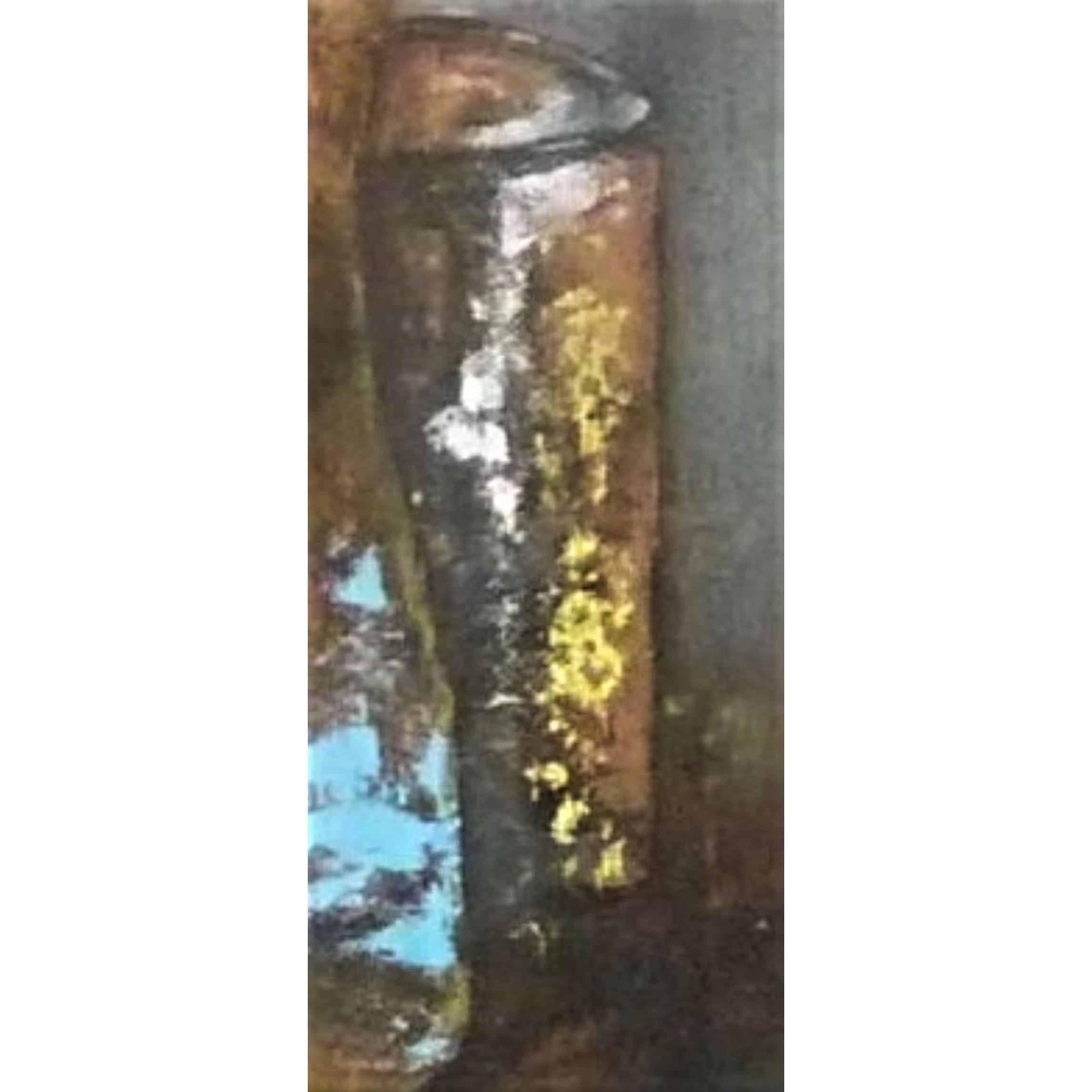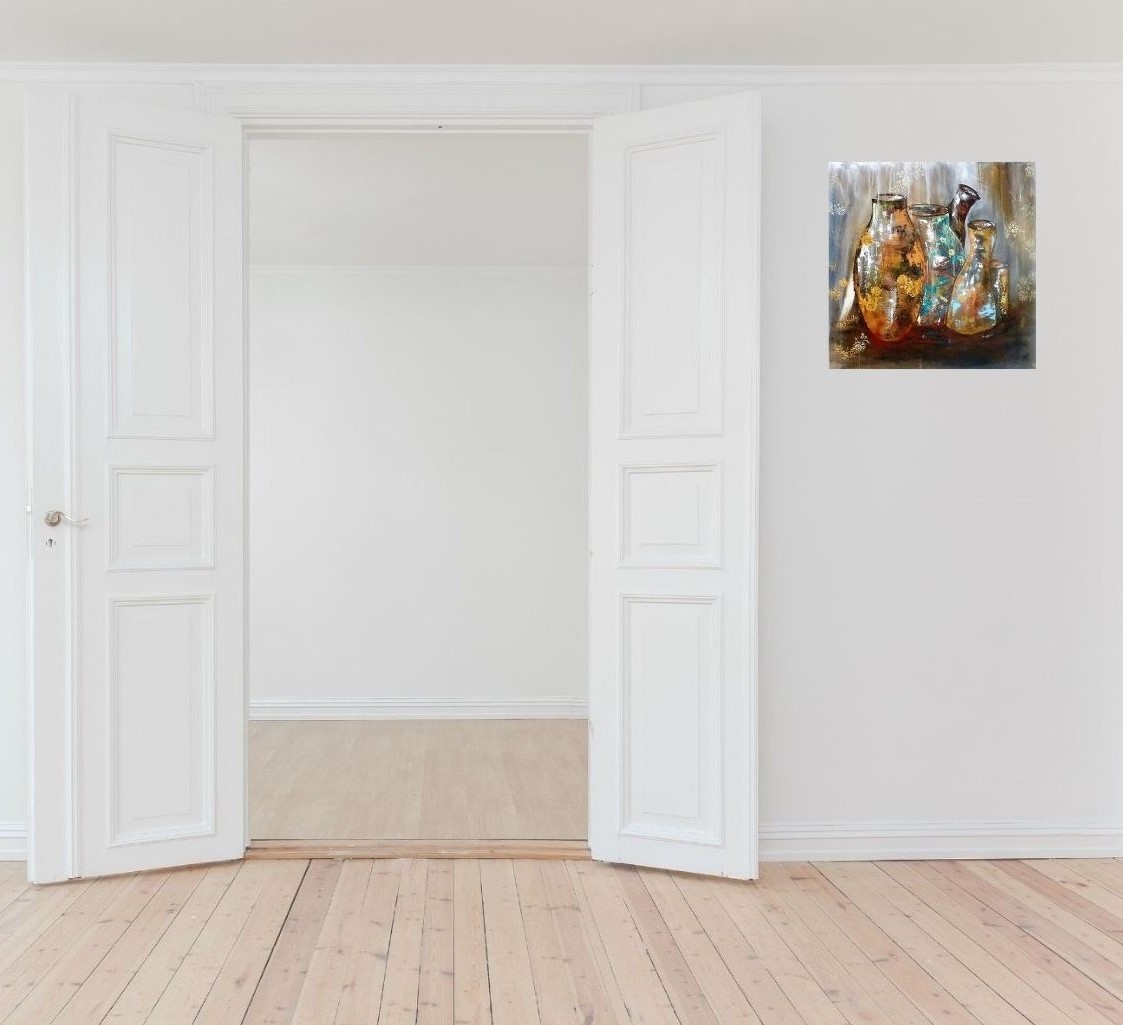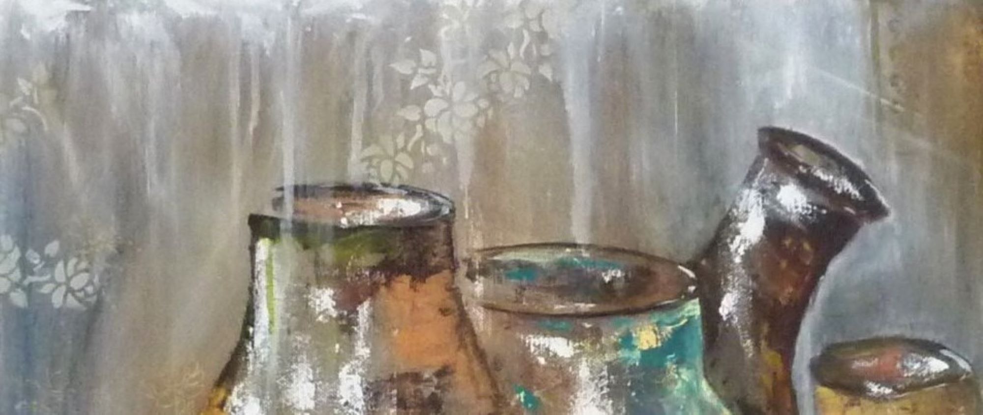 Vieux pots et jarres tout tordus, dans un esprit typiquement méditerranéen. Acrylique sur châssis entoilé format 3 D, avec des contrastes de tonalités et des jeux de transparences, coulures, sans oublier une touche dorée (peinture et feuille dorée) et cuivrée. Finition vernis.