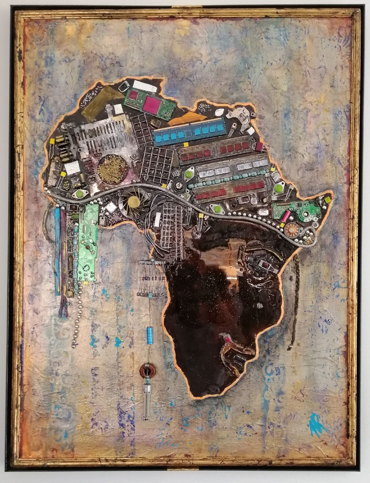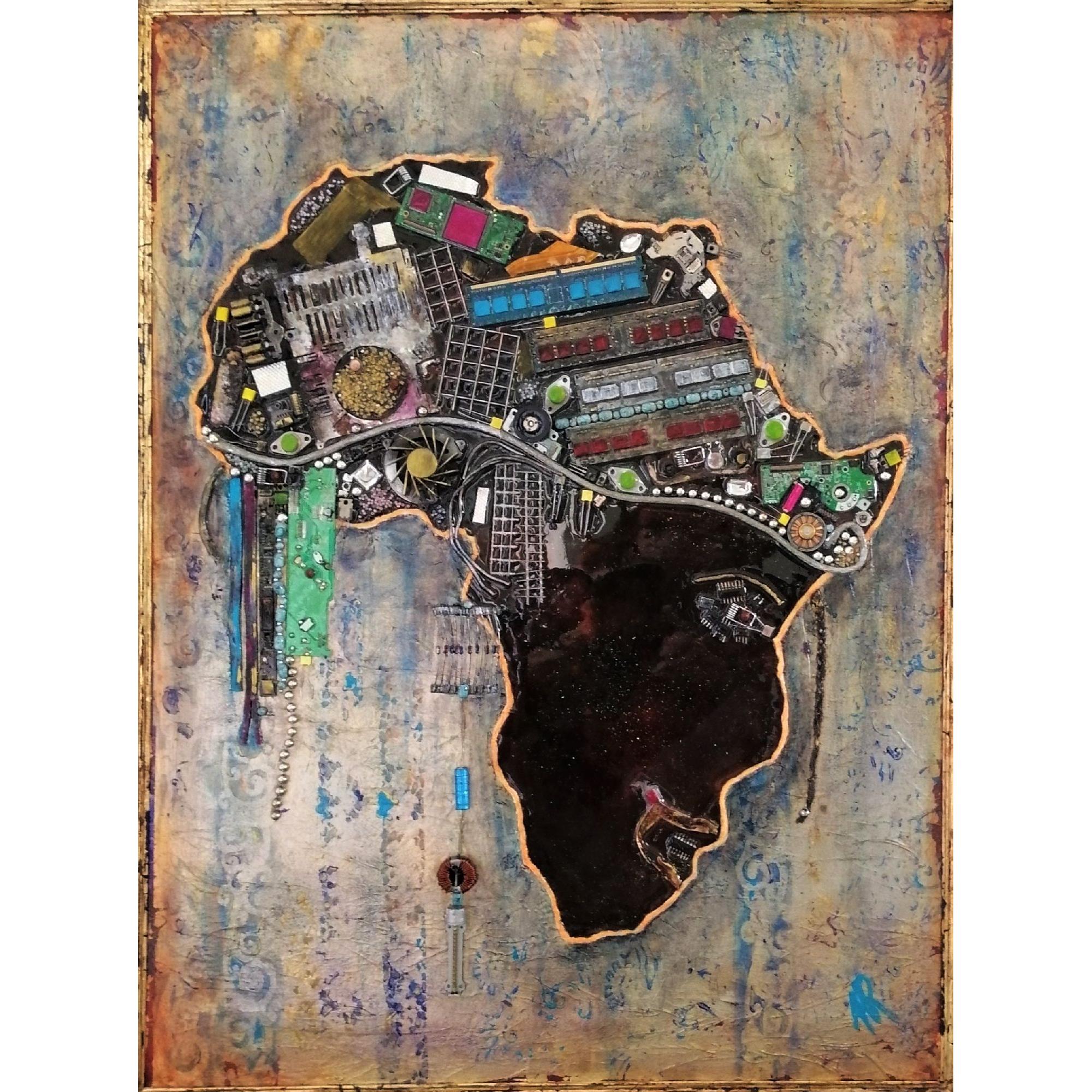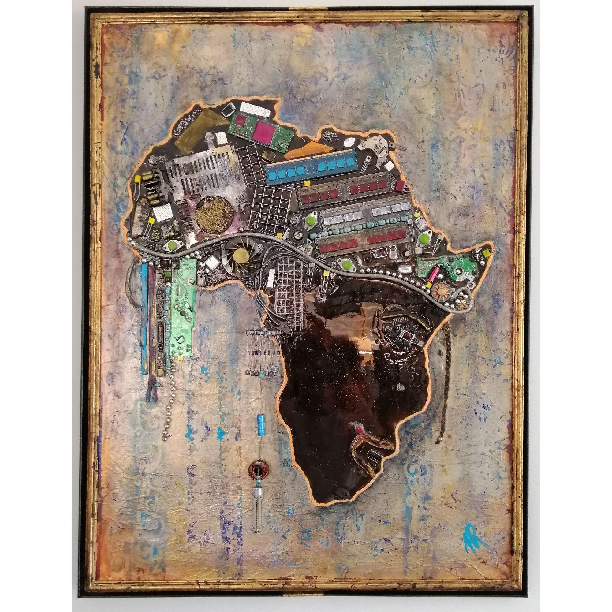 L'Afrique prend ici la forme d'un visage, à moins que ce ne soit l'inverse. La coiffe, toute de reliefs, est aussi un symbole, beaucoup d'éléments provenant du recyclage d'ordinateurs, ou d'objets représentant l'or, le diamant, finalement l'exploitation de l'Afrique. Technique mixte, collages avec fond de feuille métallique dorée sur toile renforcée de cartonnage à l'arrière, ainsi qu'une plaque bois, et montée sur châssis. Résine pour un collage sans faille et une brillance extrème sur certaines zones, finition vernis ailleurs. Double encadrement, l'un doré directement sur la toile, l'autre noir en style cadre américain. Dimensions encadré 84x66 cm. Finition vernis.