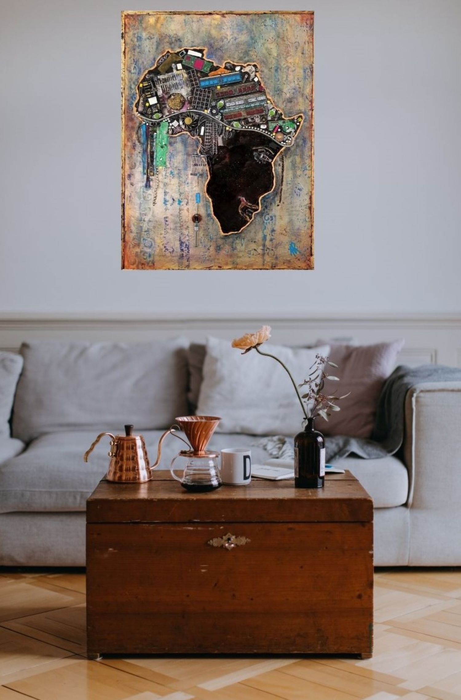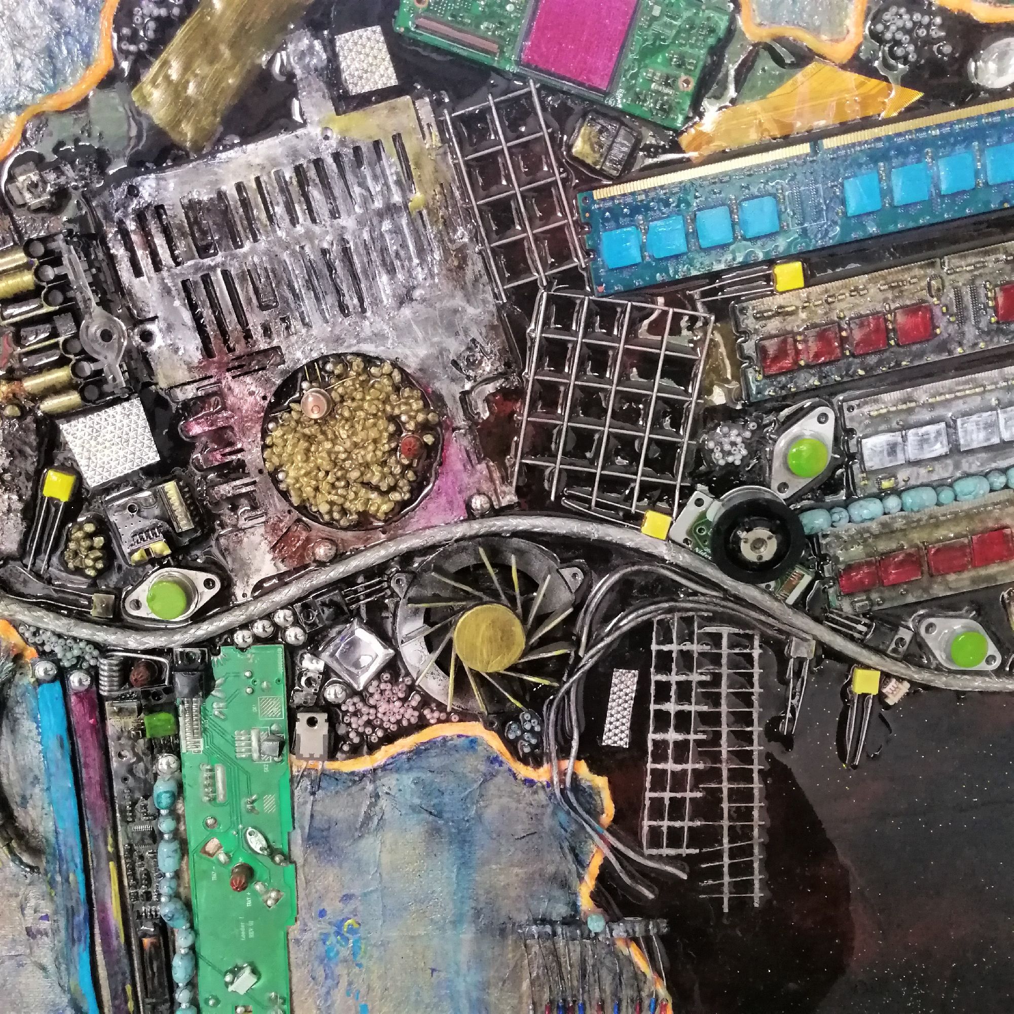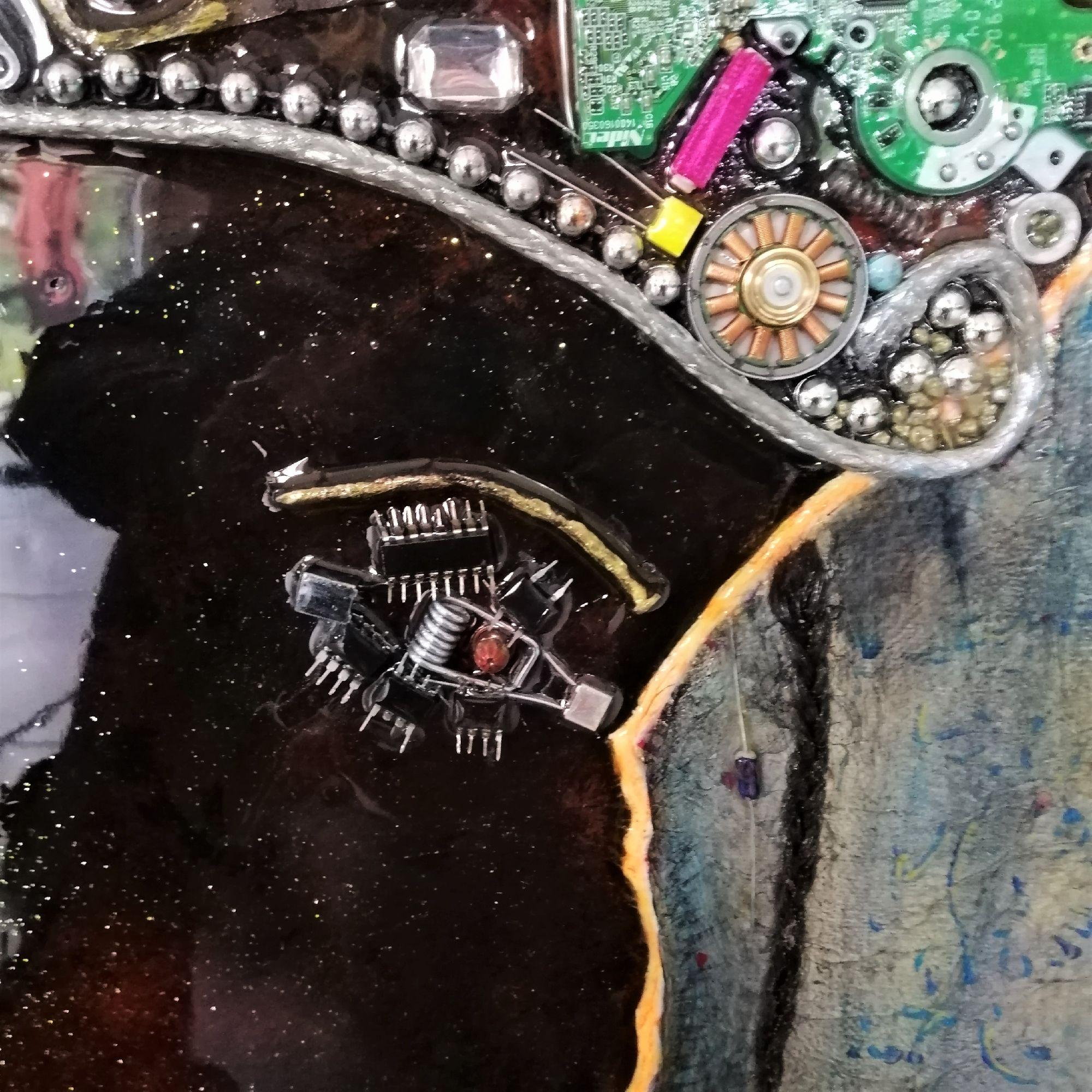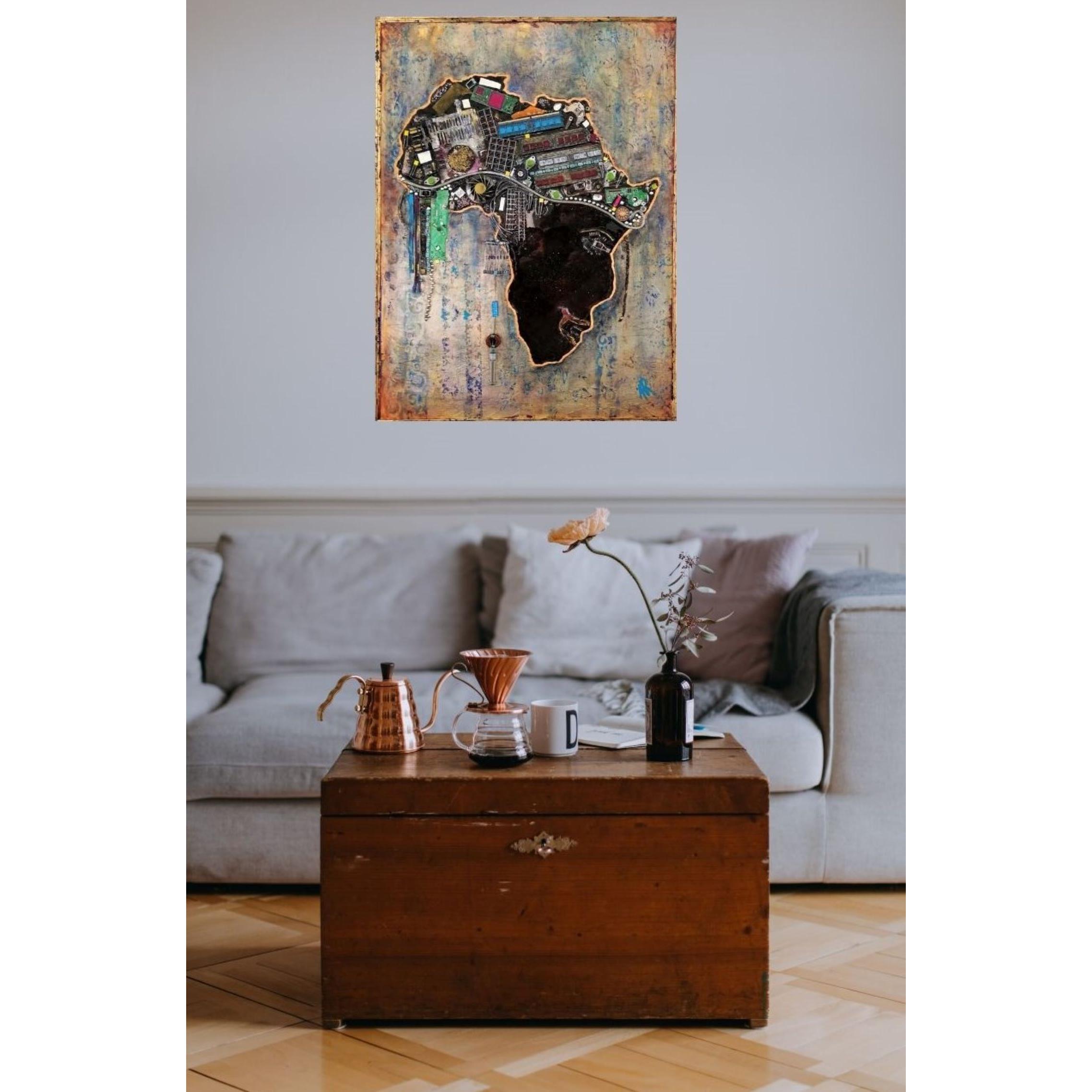 L'Afrique prend ici la forme d'un visage, à moins que ce ne soit l'inverse. La coiffe, toute de reliefs, est aussi un symbole, beaucoup d'éléments provenant du recyclage d'ordinateurs, ou d'objets représentant l'or, le diamant, finalement l'exploitation de l'Afrique. Technique mixte, collages avec fond de feuille métallique dorée sur toile renforcée de cartonnage à l'arrière, ainsi qu'une plaque bois, et montée sur châssis. Résine pour un collage sans faille et une brillance extrème sur certaines zones, finition vernis ailleurs. Double encadrement, l'un doré directement sur la toile, l'autre noir en style cadre américain. Dimensions encadré 84x66 cm. Finition vernis.
