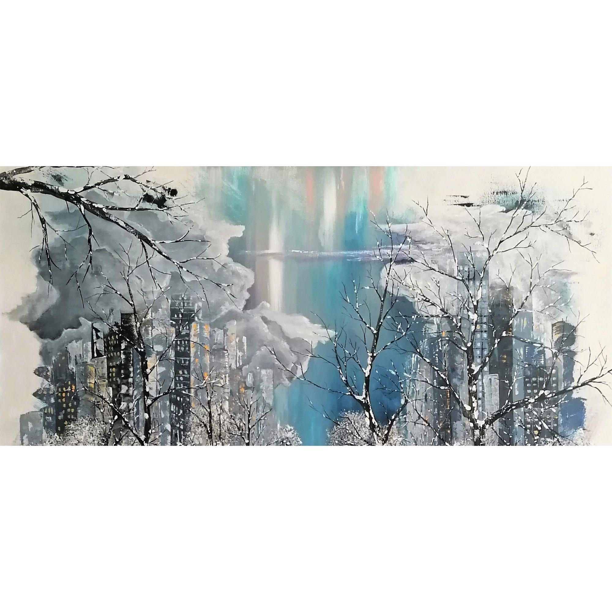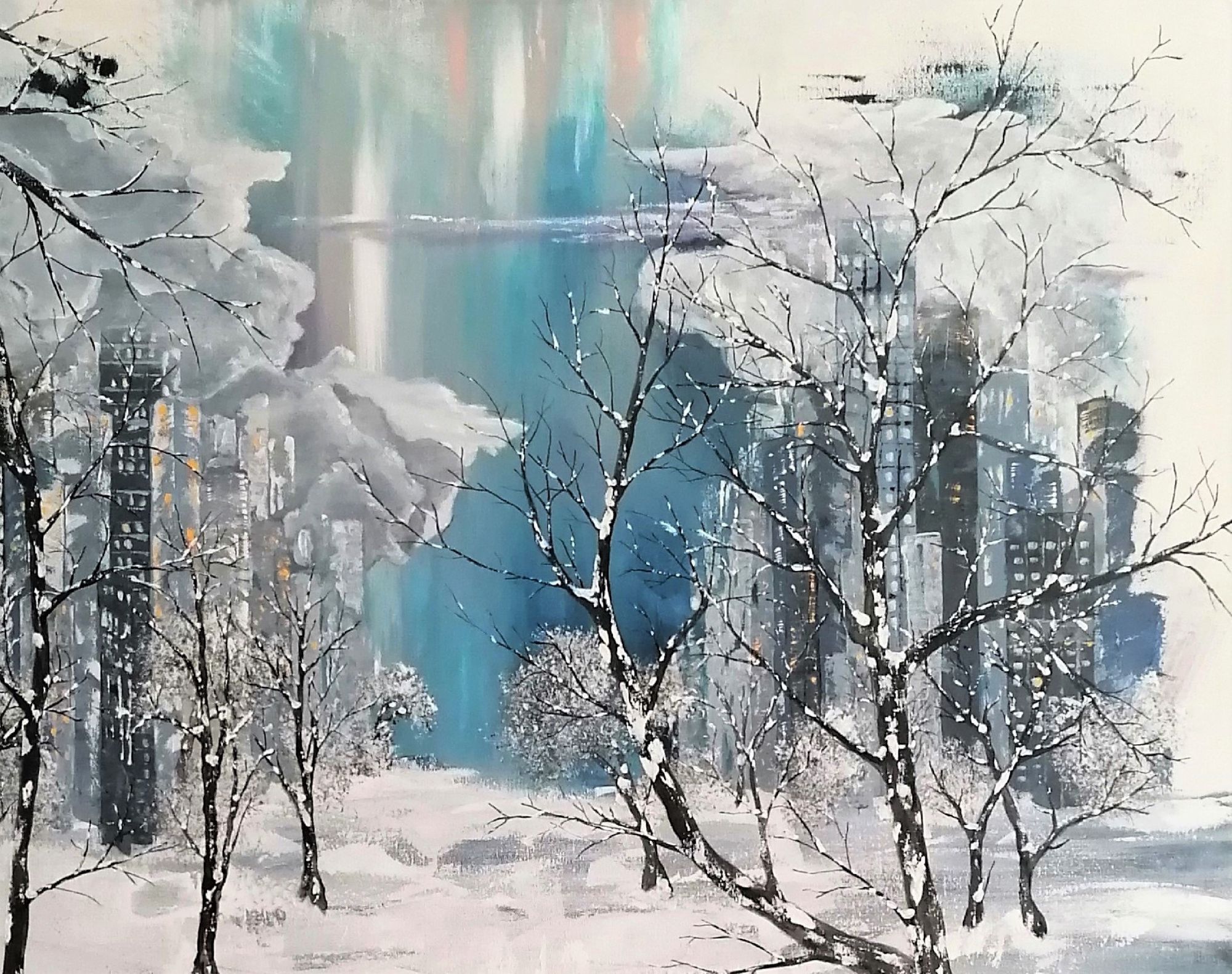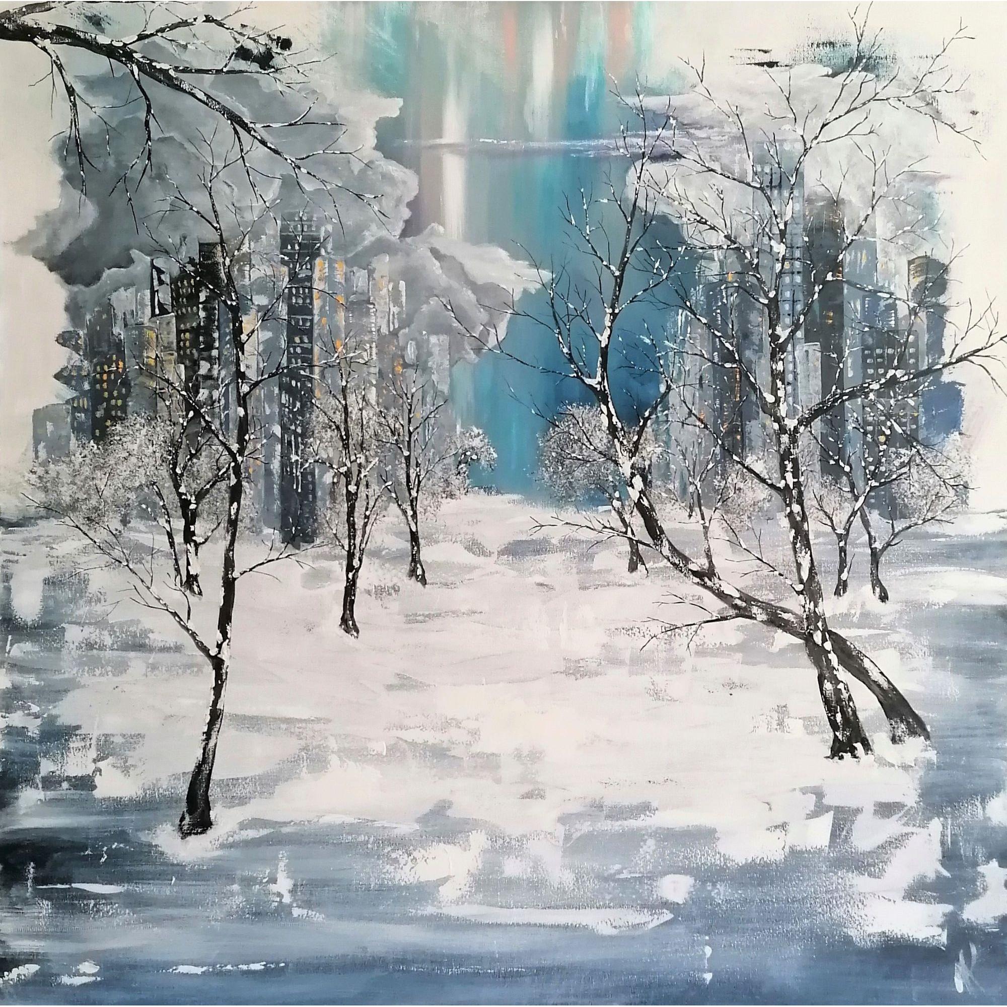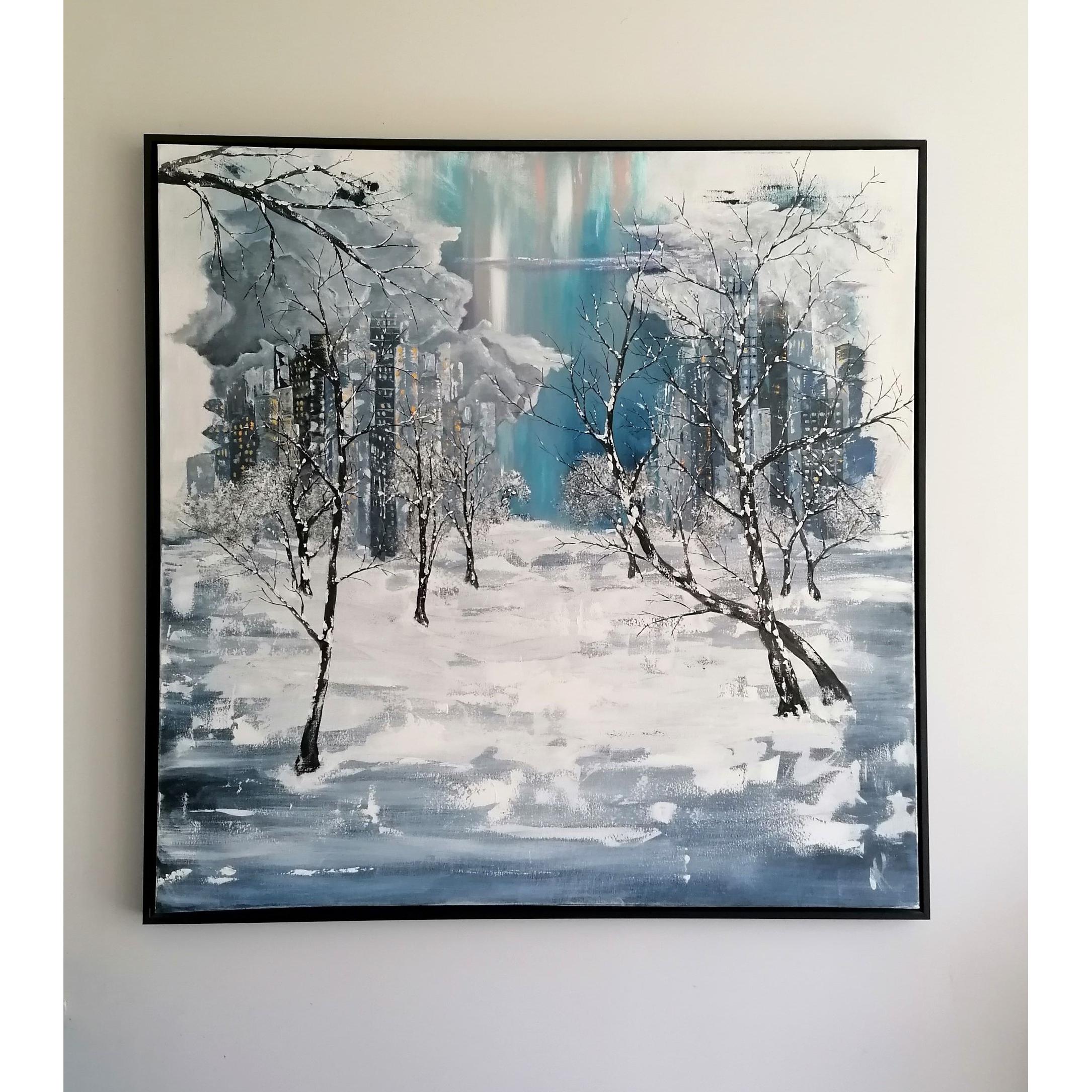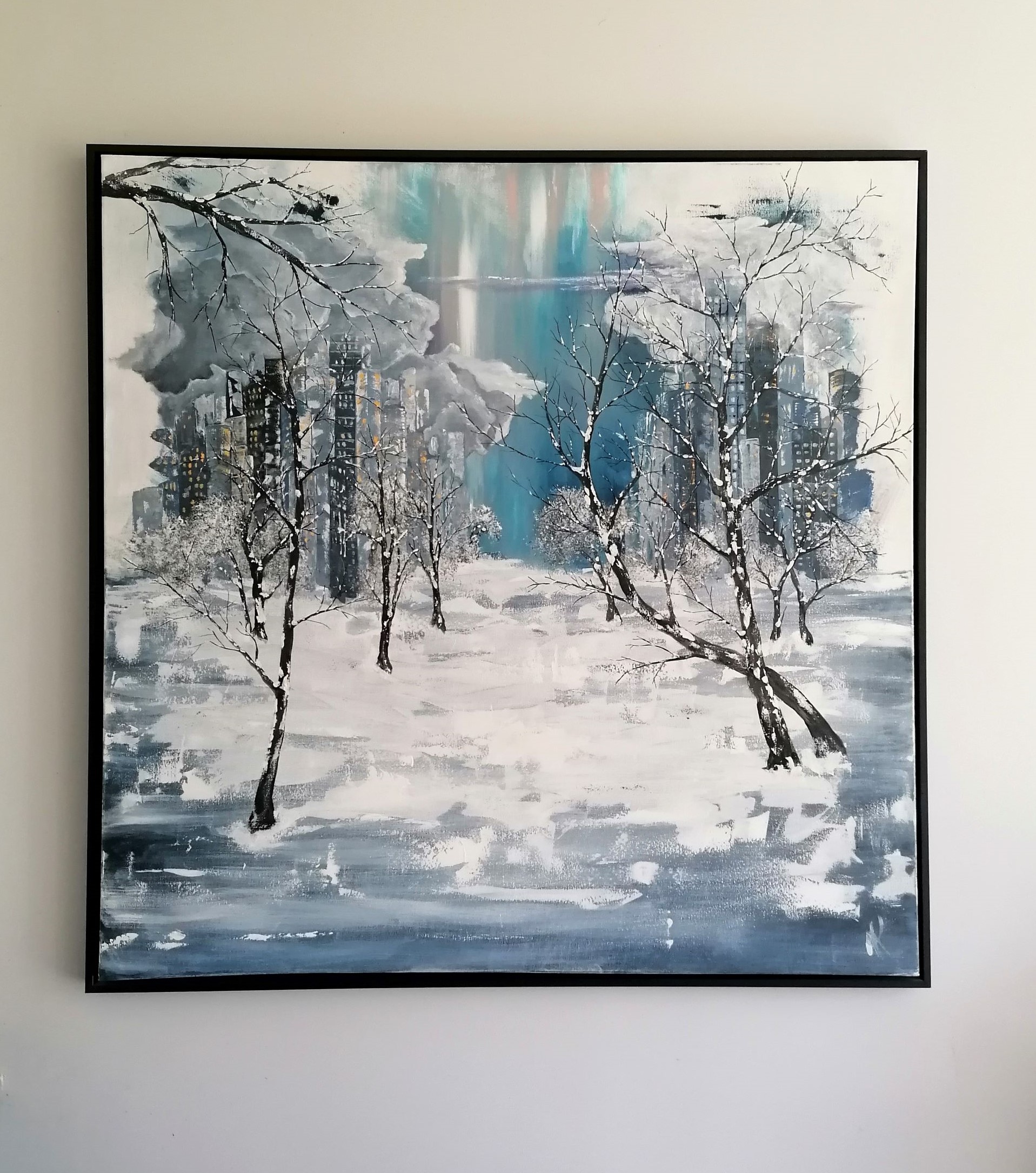 Viens, je t'emmène dans ma ville. New-York l'hiver? On entre dans ce tableau à travers la haie d'honneur formée par les arbres. Ca vaut le coup d'oeil, les nuages sont ici si particuliers...Peinture acrylique sur châssis entoilé et encadré dans un cadre américain noir (taille totale: 104x104 cm), finition vernis.
