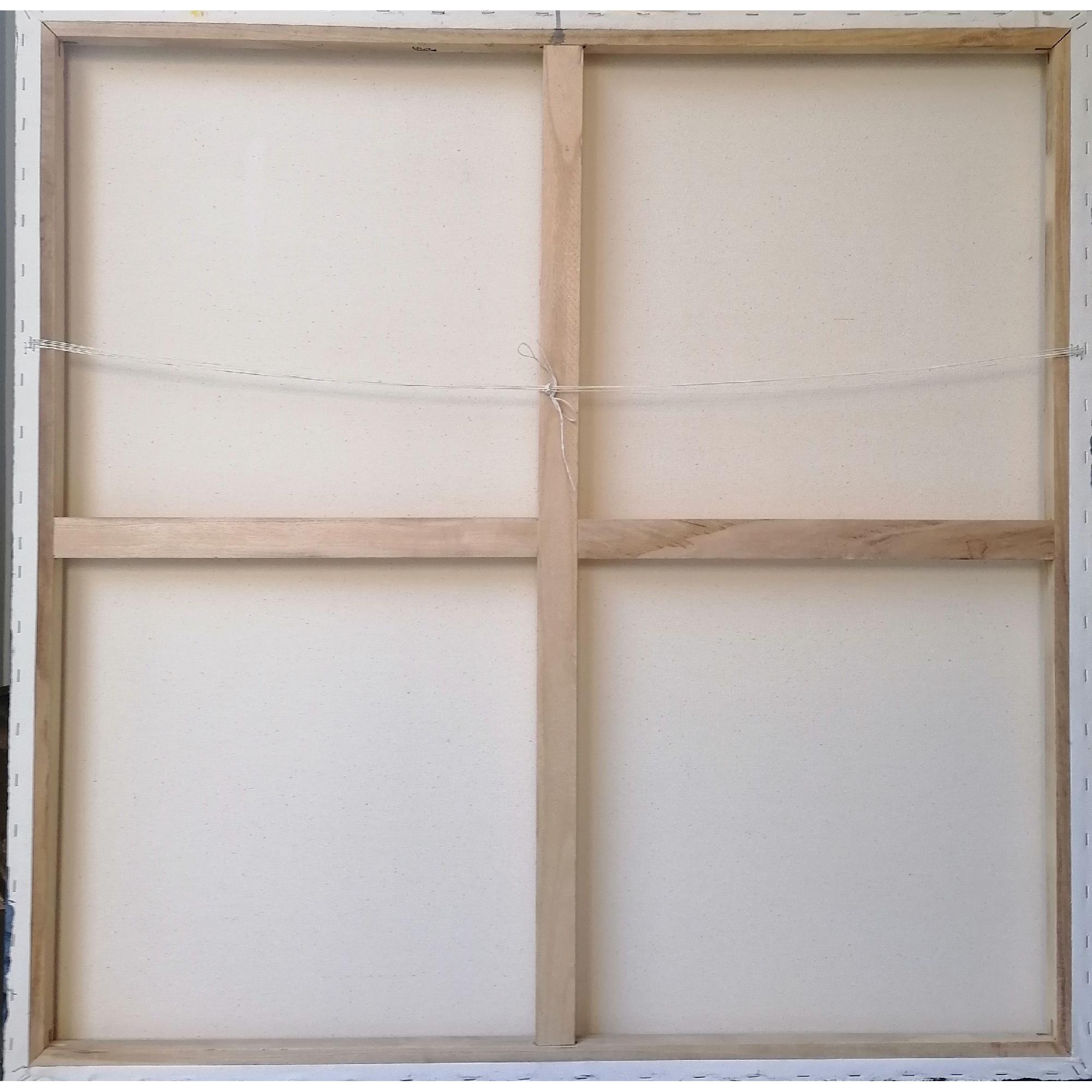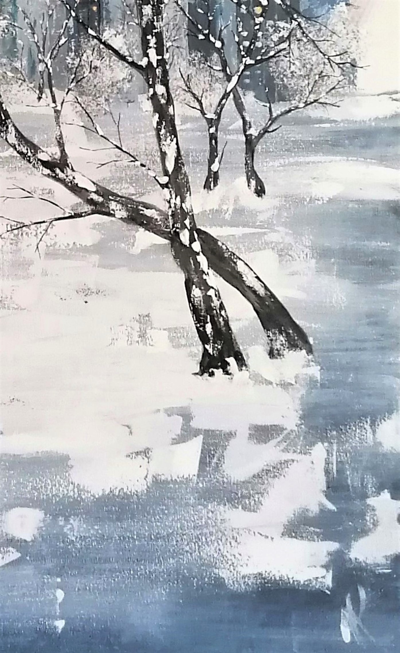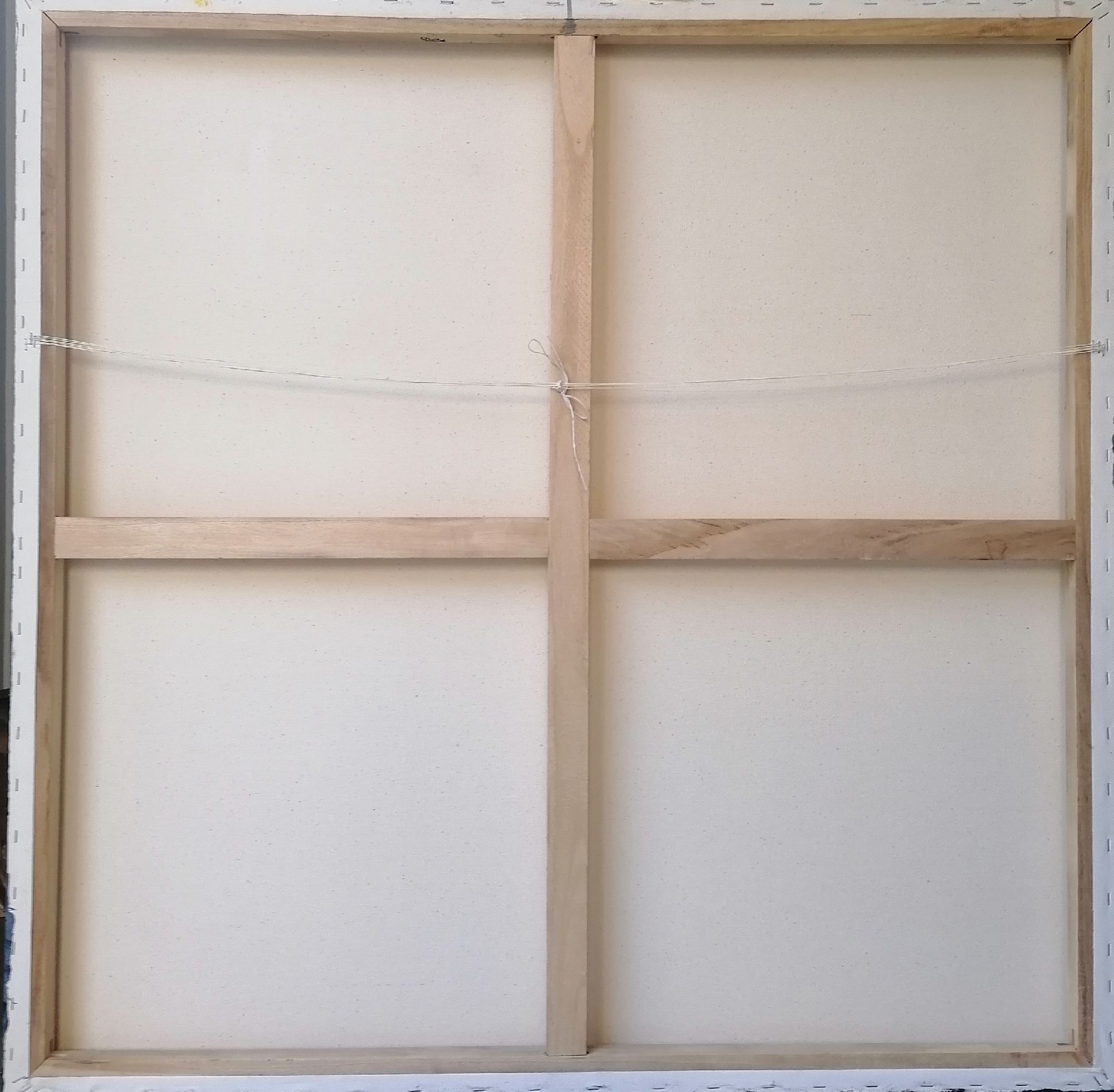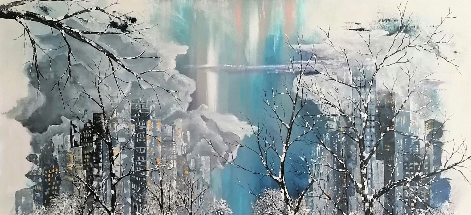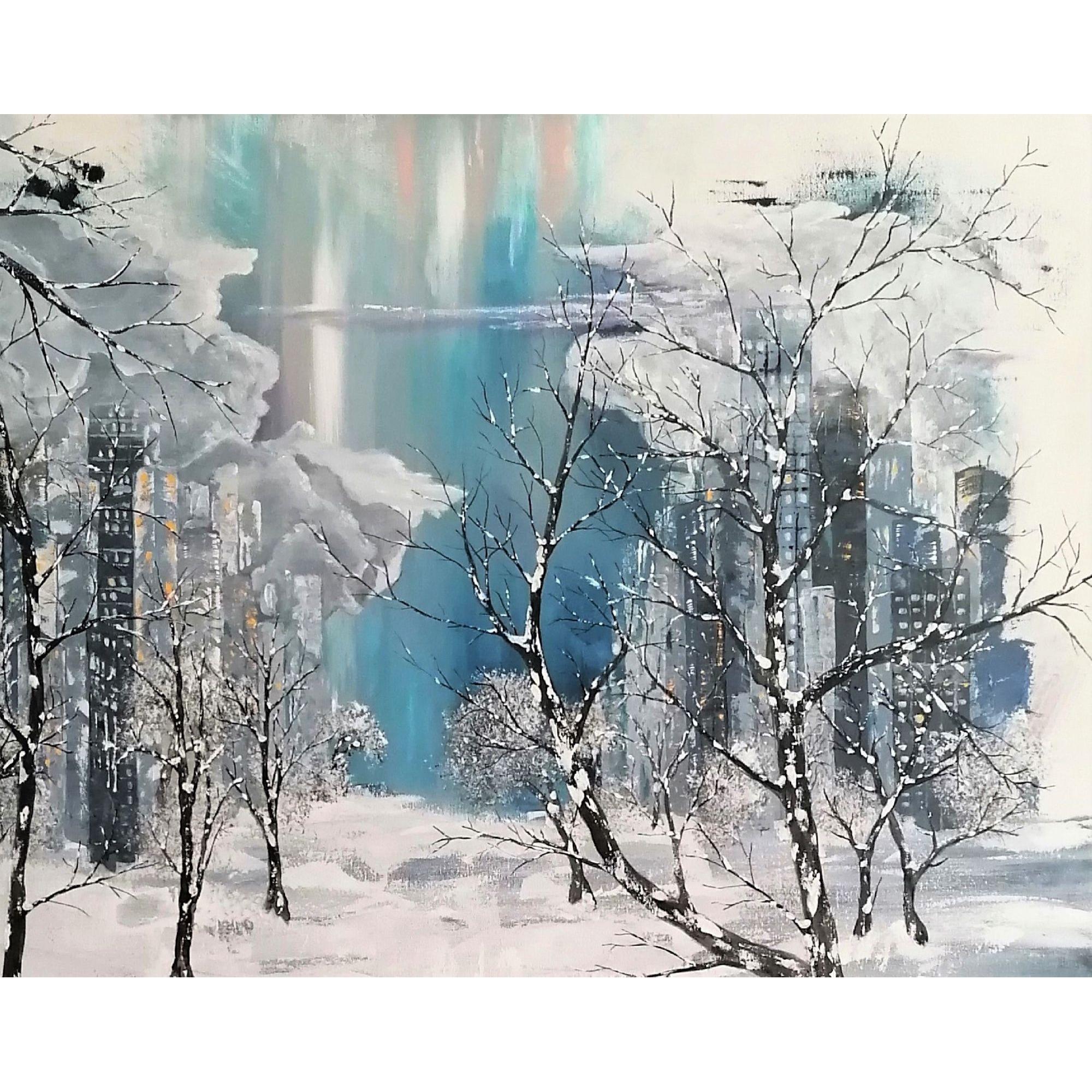 Viens, je t'emmène dans ma ville. New-York l'hiver? On entre dans ce tableau à travers la haie d'honneur formée par les arbres. Ca vaut le coup d'oeil, les nuages sont ici si particuliers...Peinture acrylique sur châssis entoilé et encadré dans un cadre américain noir (taille totale: 104x104 cm), finition vernis.