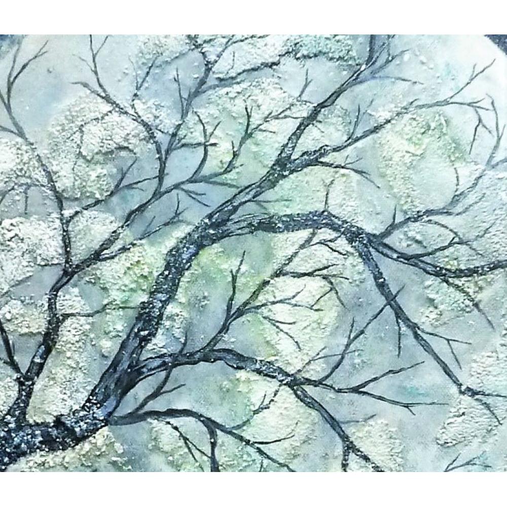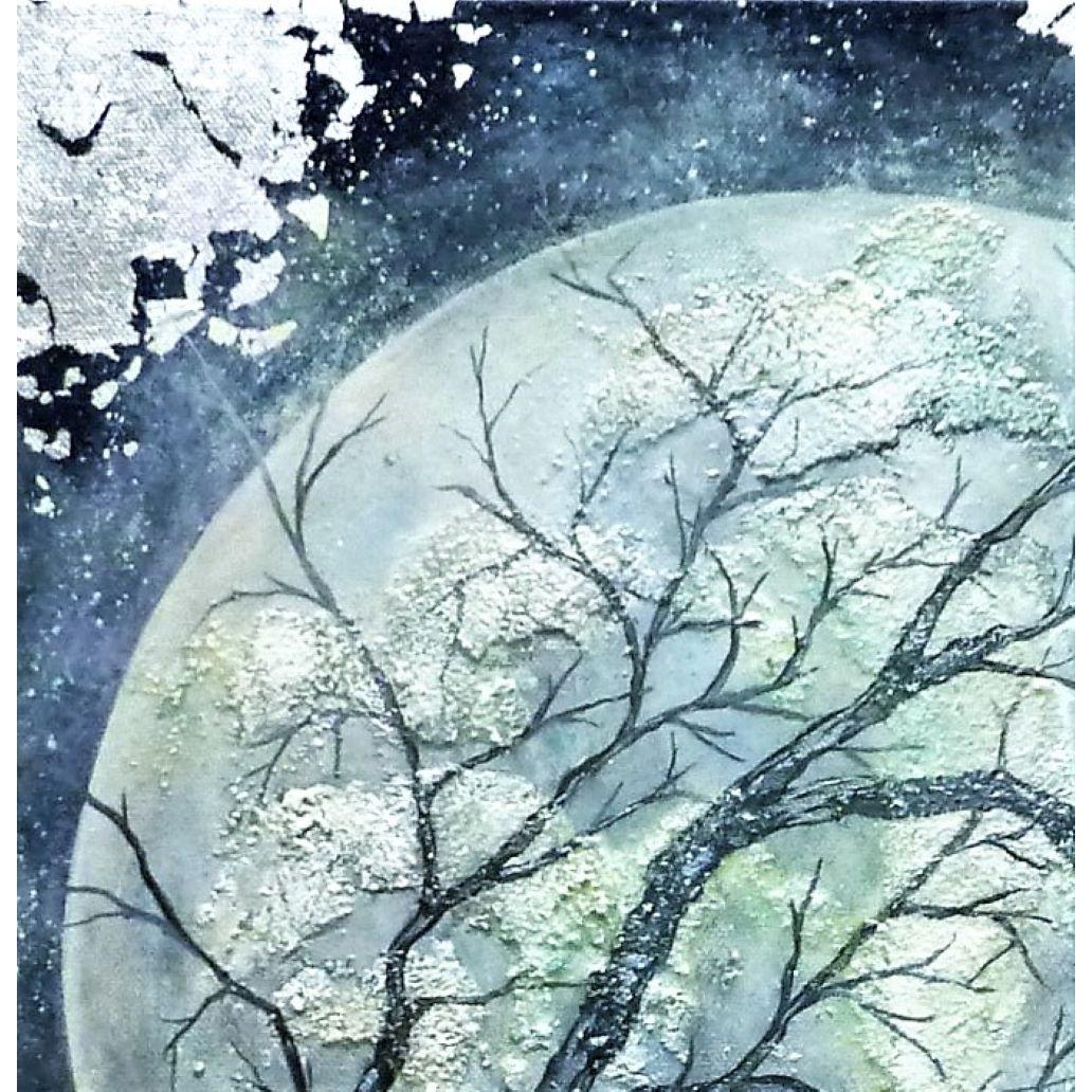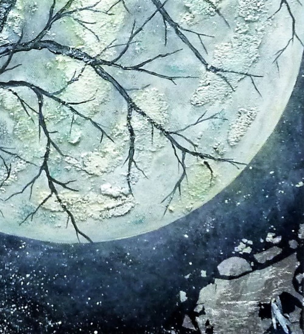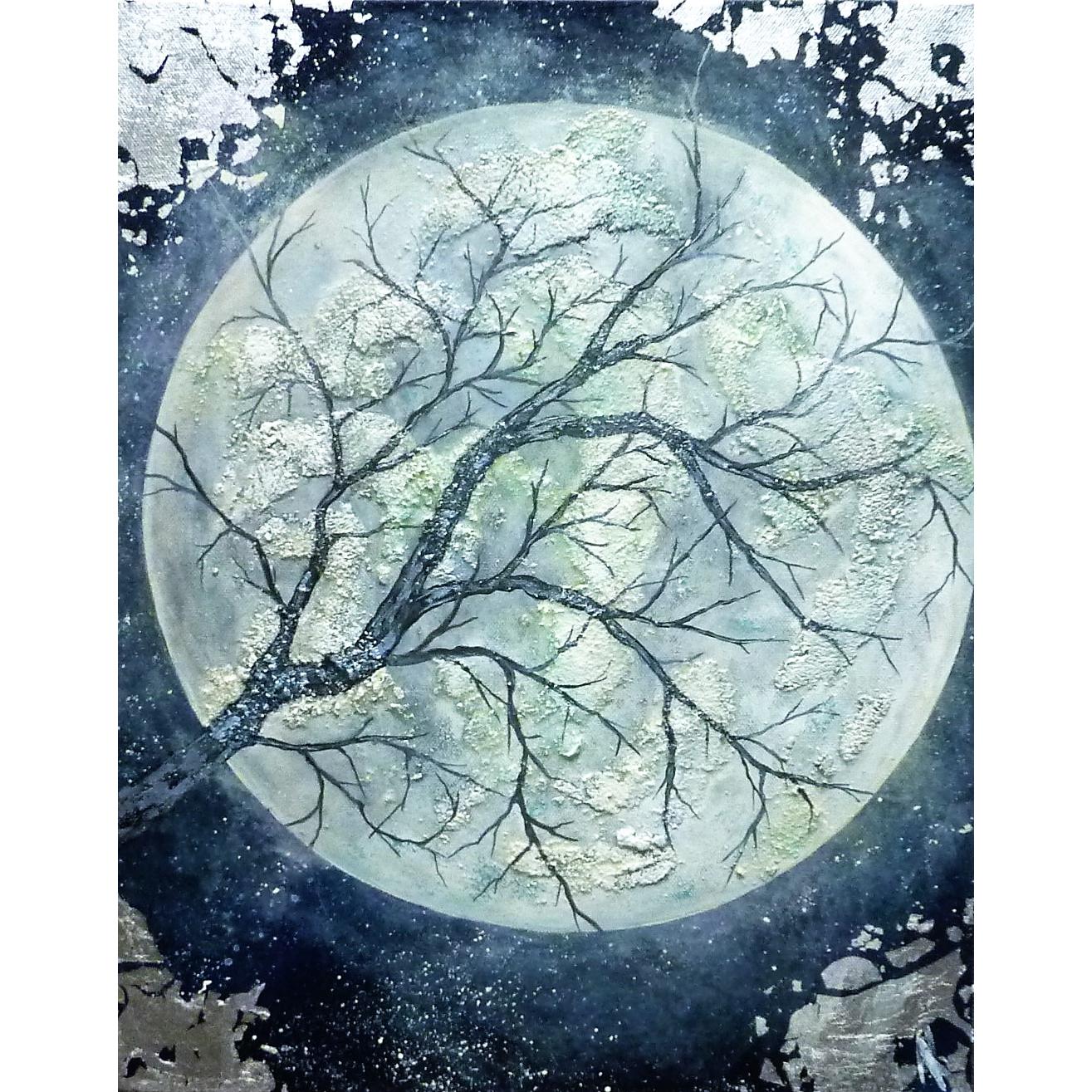 Les arbres, dans leur tenue d'hiver, faussement appelés des arbres morts puisqu'ils sont juste en dormance, sont fascinants. Tout comme la mystérieuse grande lune d'automne, ses reliefs et son halo de lumière. Réalisation en acrylique, avec feuille argentée, reliefs et résine. Finition vernis.