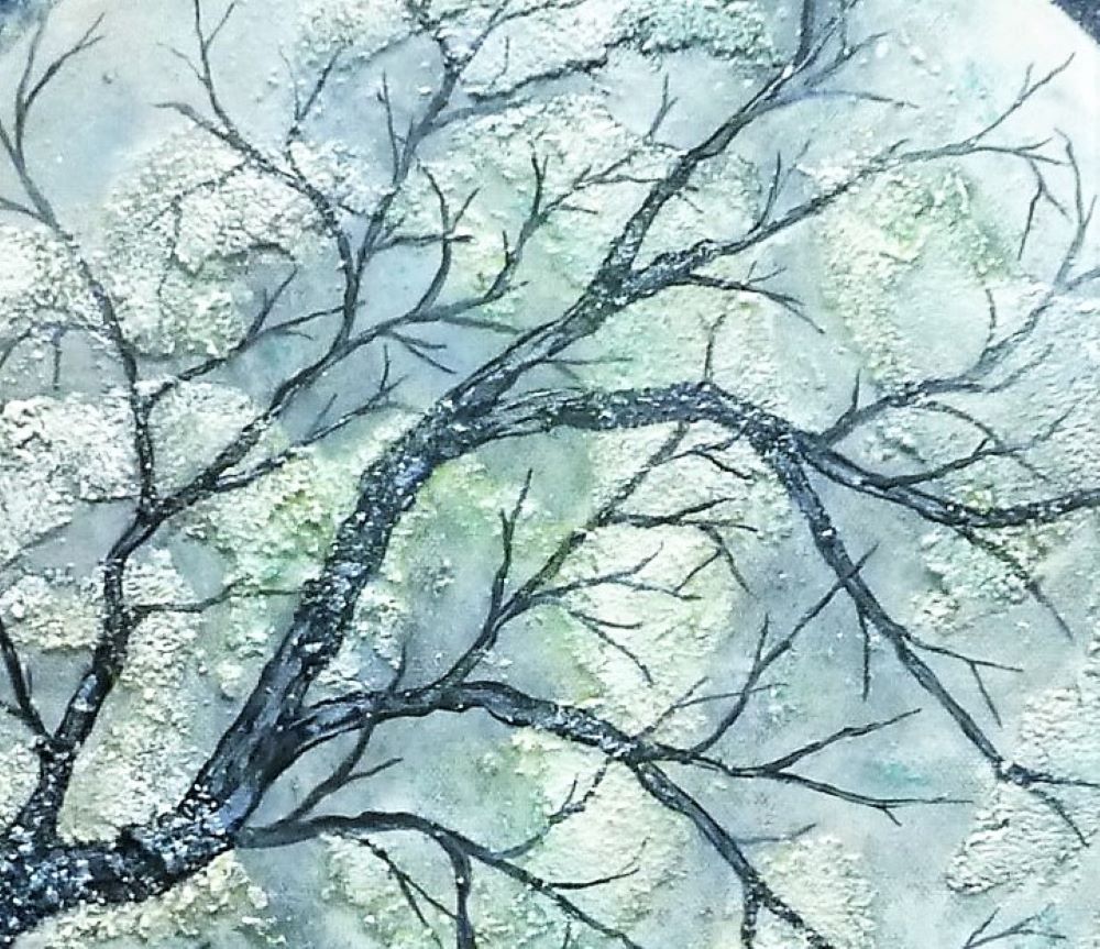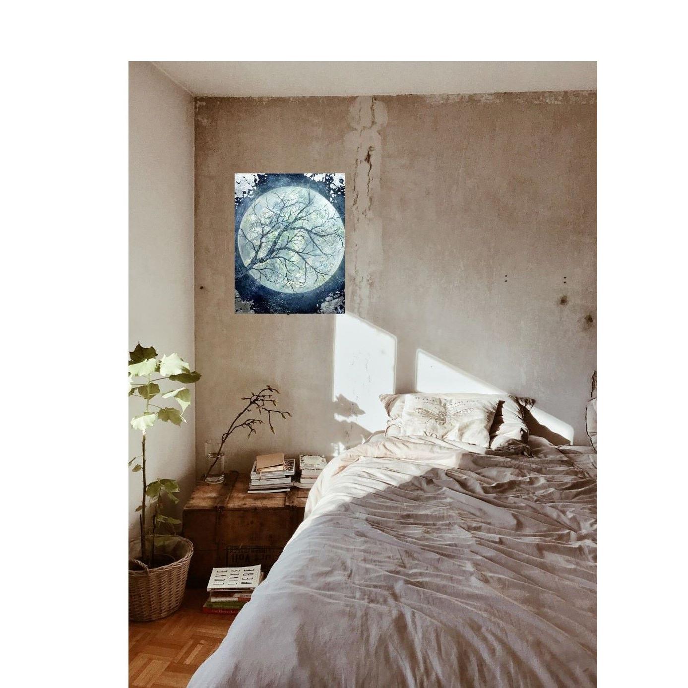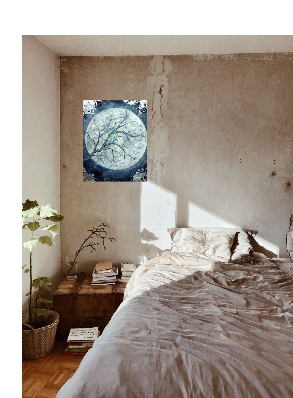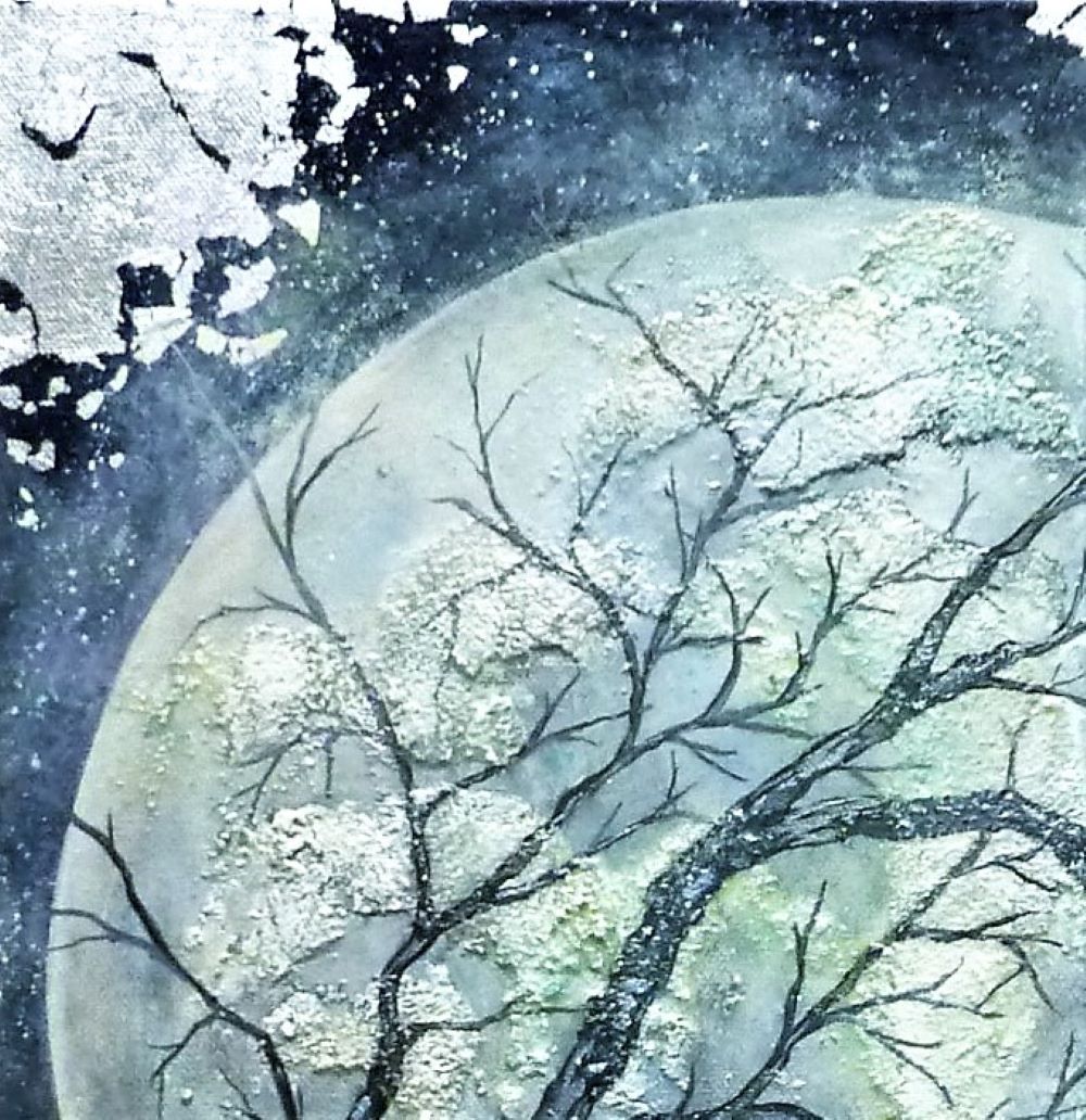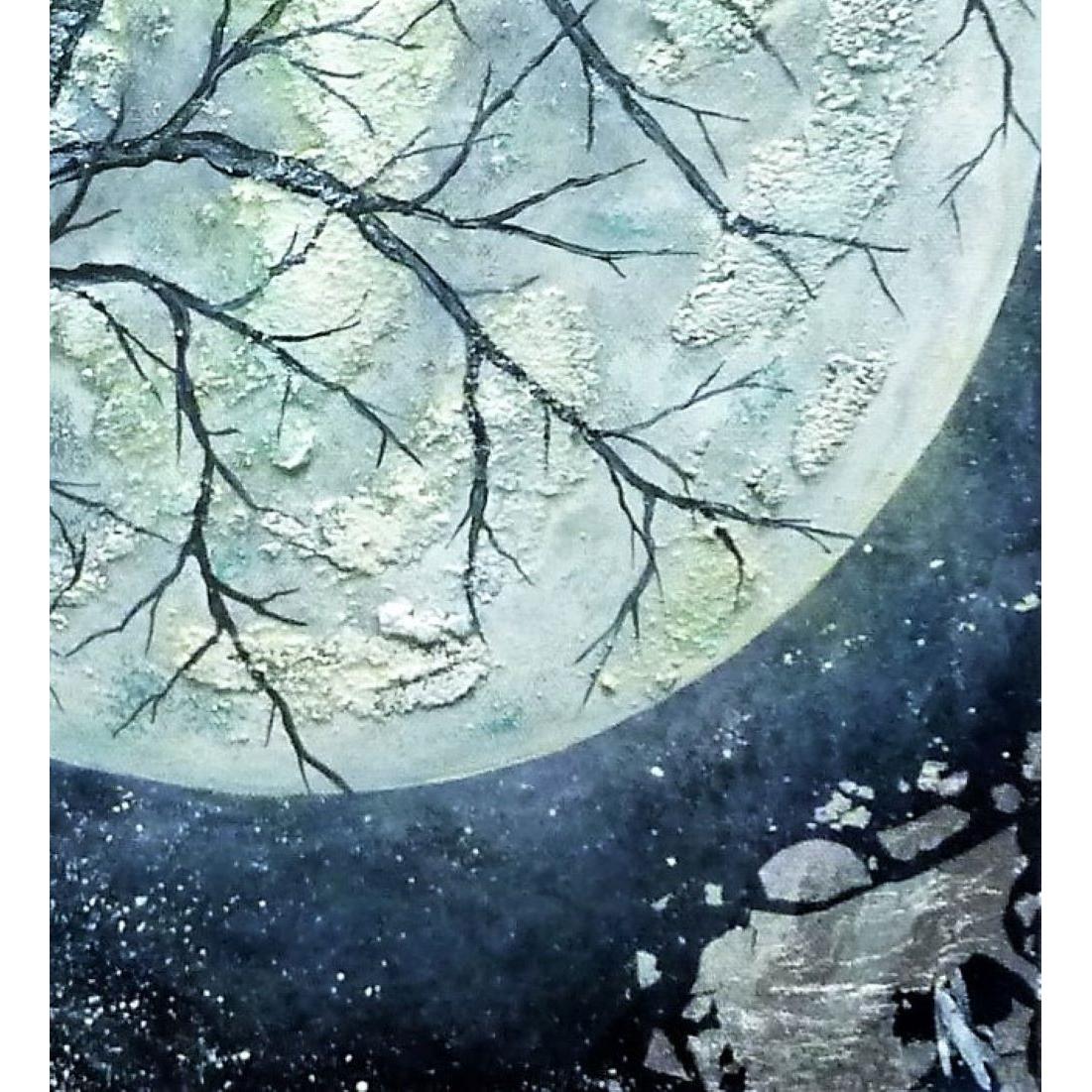 Les arbres, dans leur tenue d'hiver, faussement appelés des arbres morts puisqu'ils sont juste en dormance, sont fascinants. Tout comme la mystérieuse grande lune d'automne, ses reliefs et son halo de lumière. Réalisation en acrylique, avec feuille argentée, reliefs et résine. Finition vernis.
