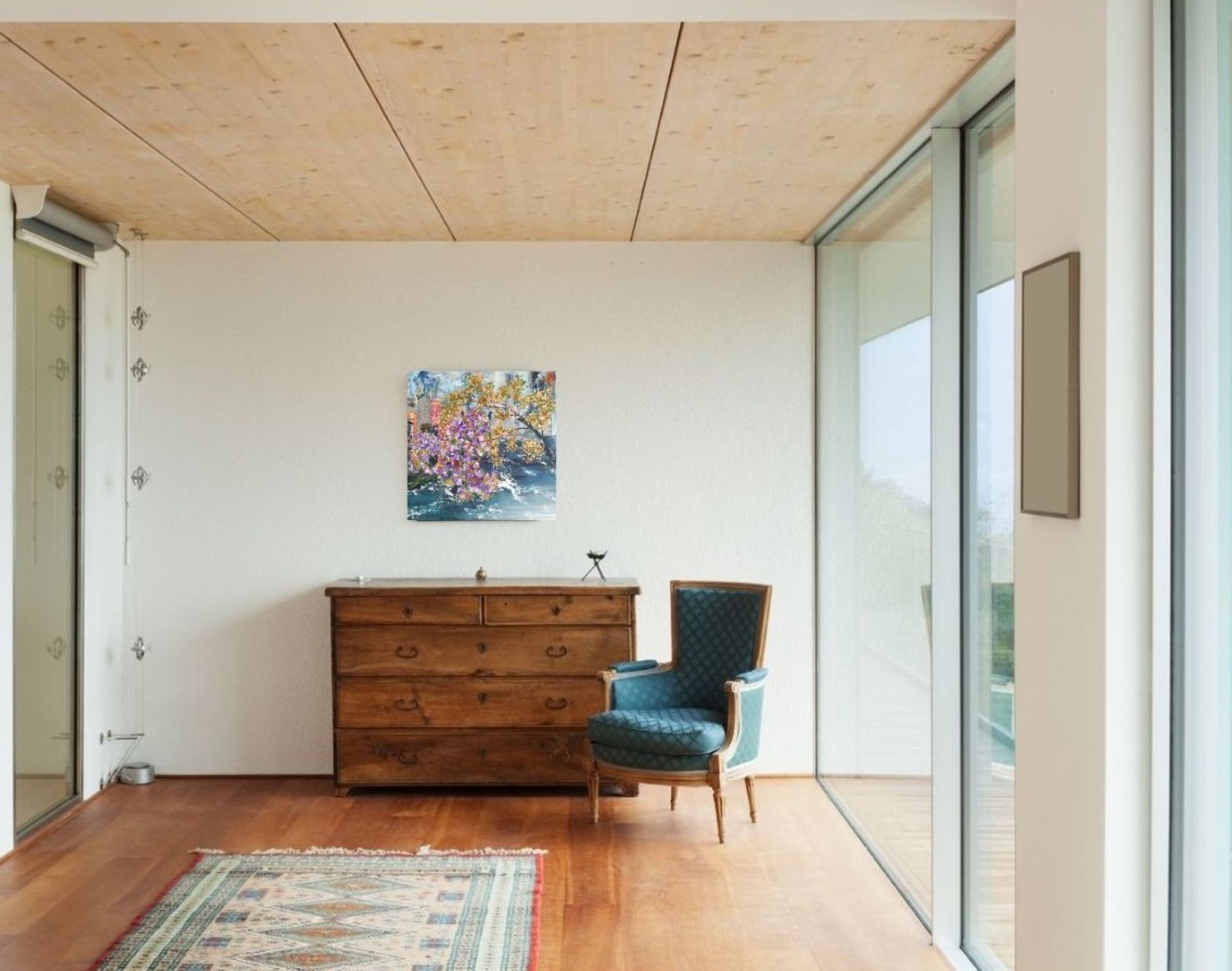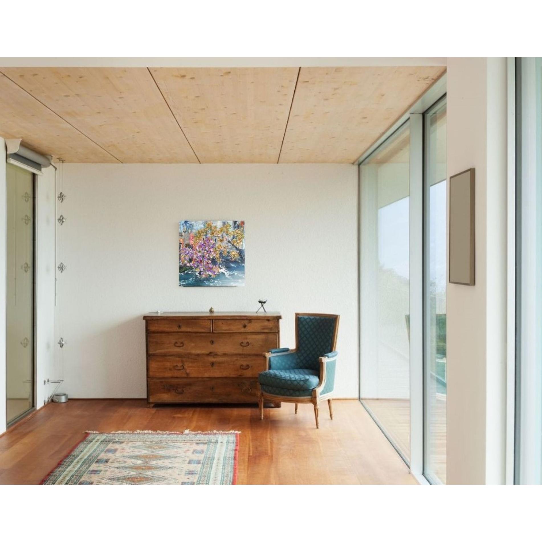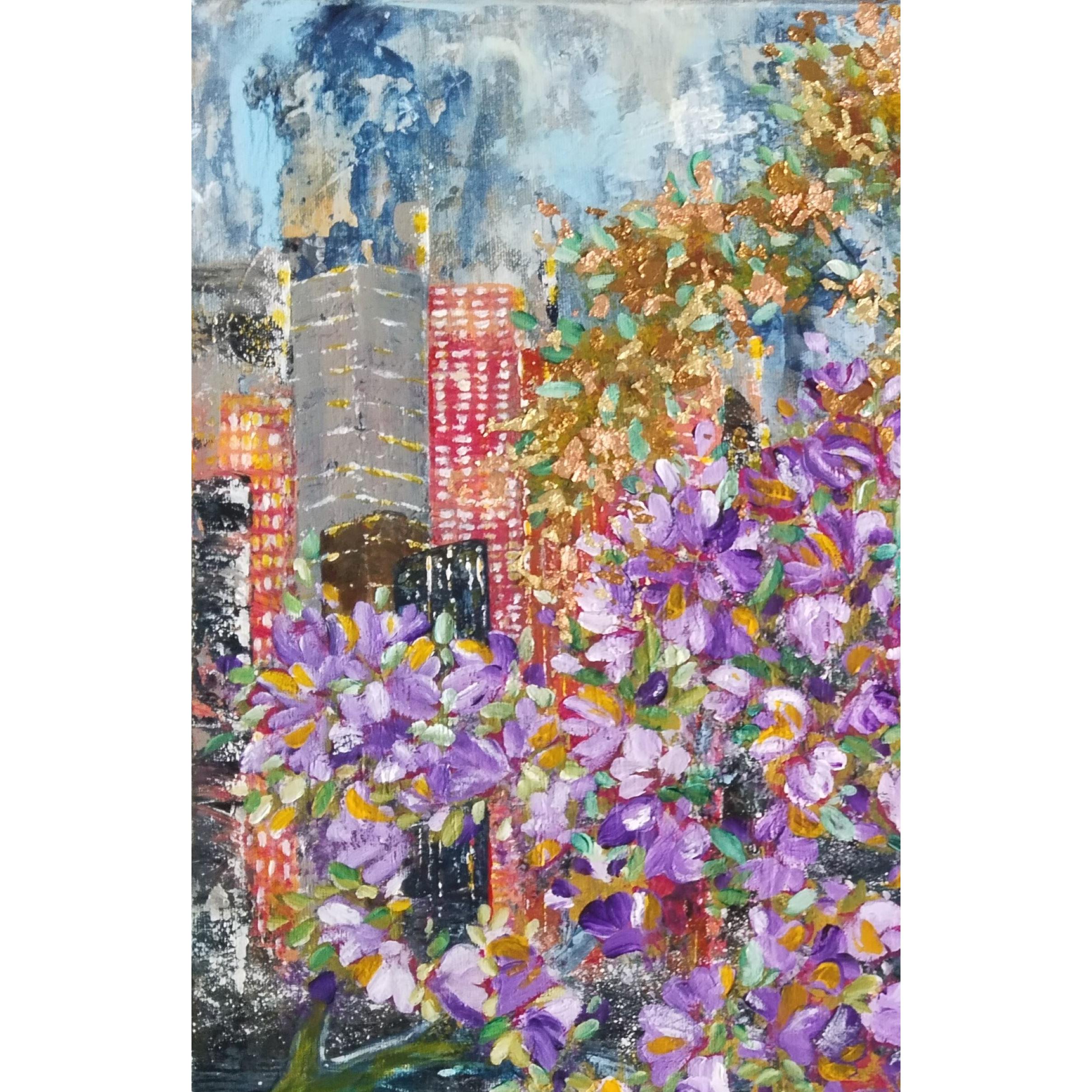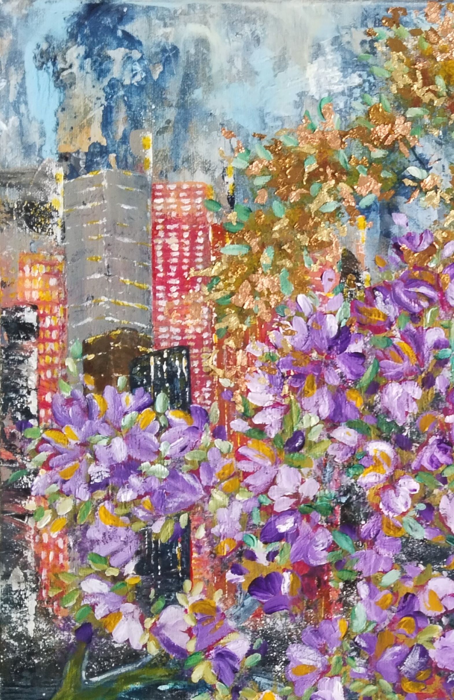 Un tableau dans lequel la mer s'enfonce sous une tempête imminente, des tours urbaines se profilent à l'horizon, tandis qu'au premier plan des arbres en fleurs ajoutent une touche de douceur naturelle. Le contraste entre nature luxuriante et urbanisme impose un équilibre délicat.