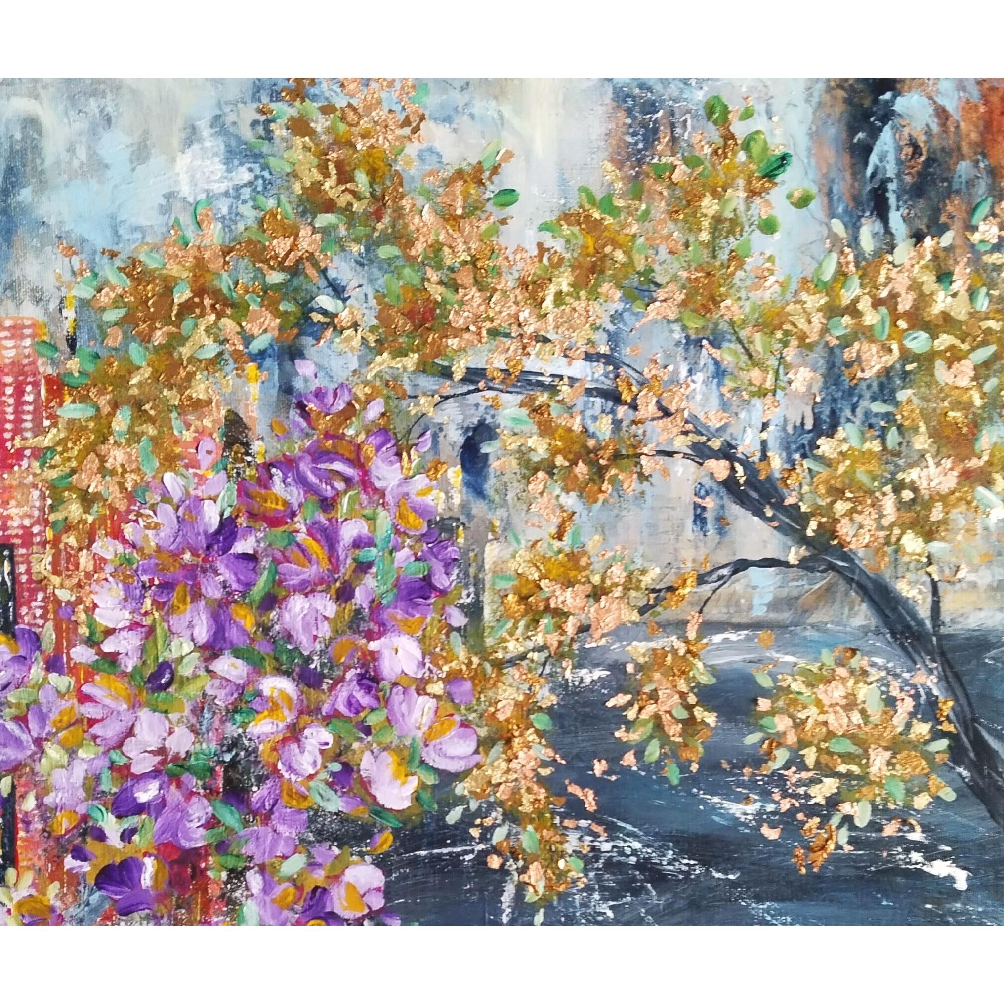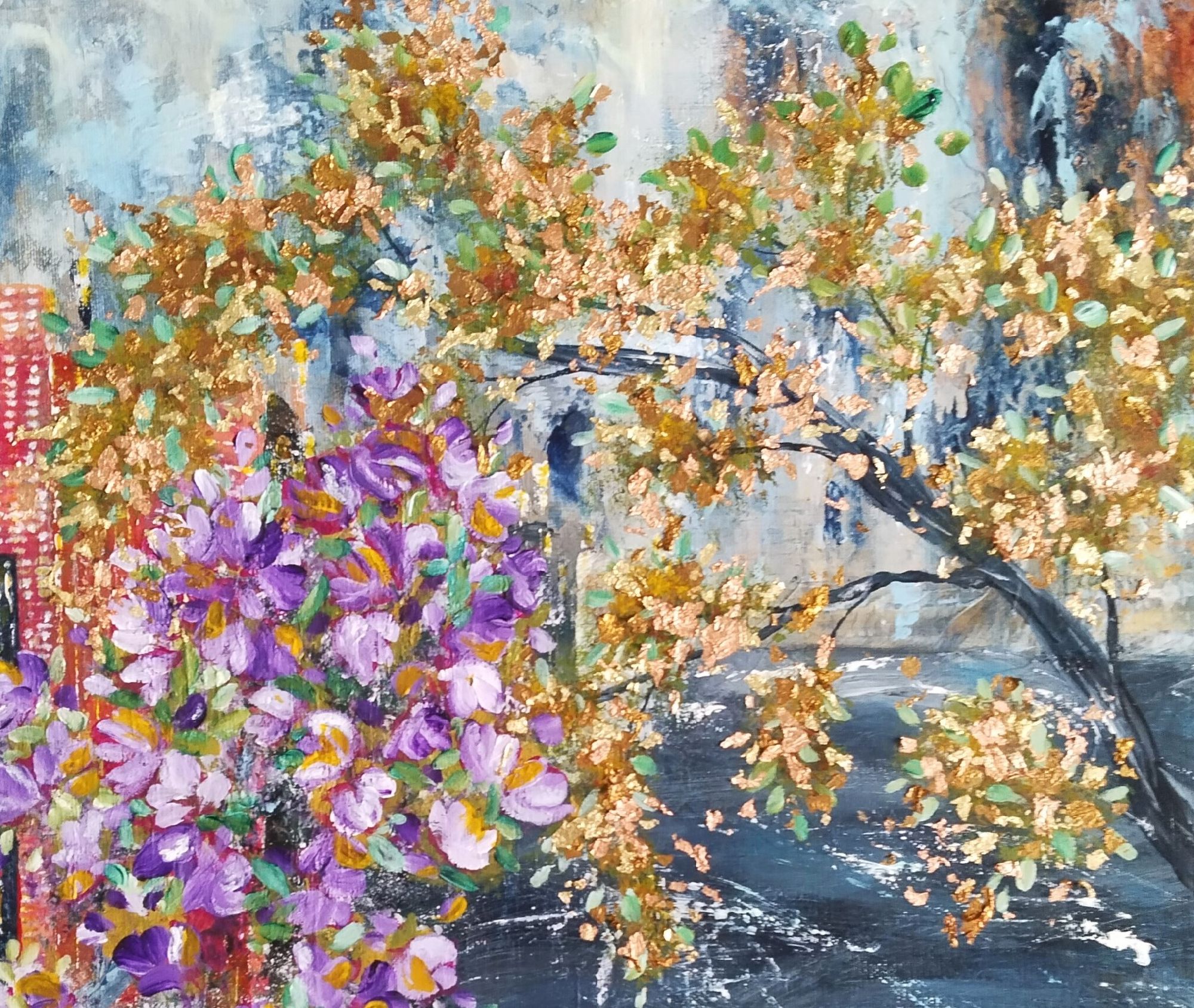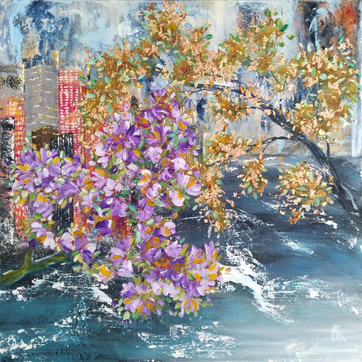 Acrylique sur châssis entoilé, feuilles et cuivrées dorées, finition vernis ....