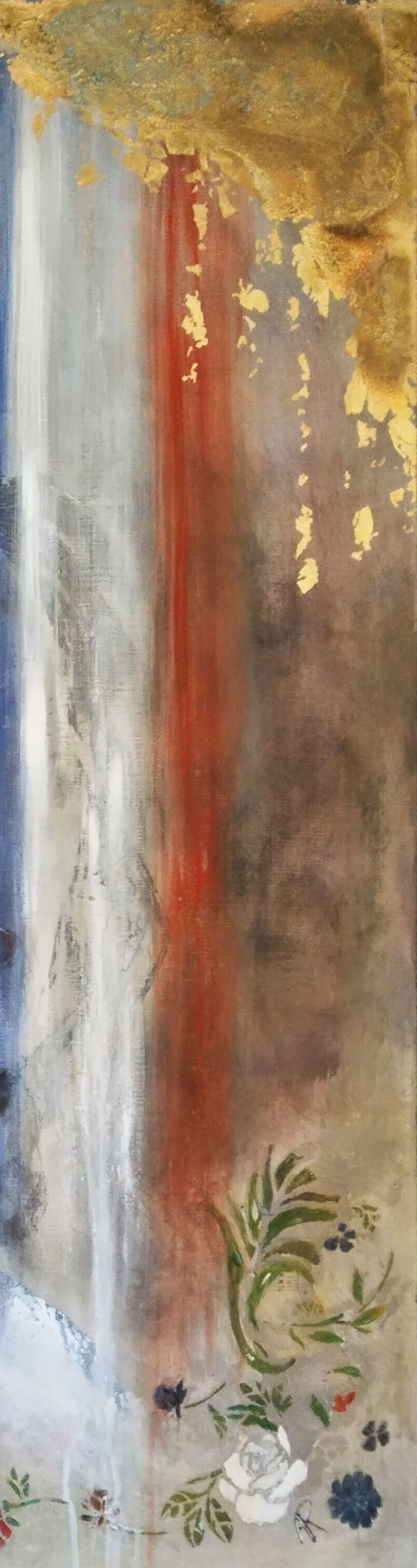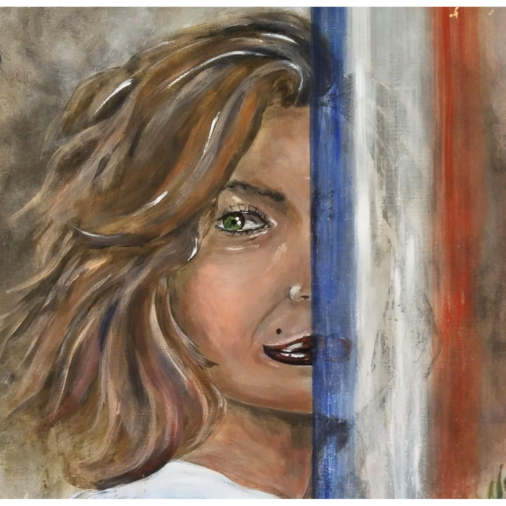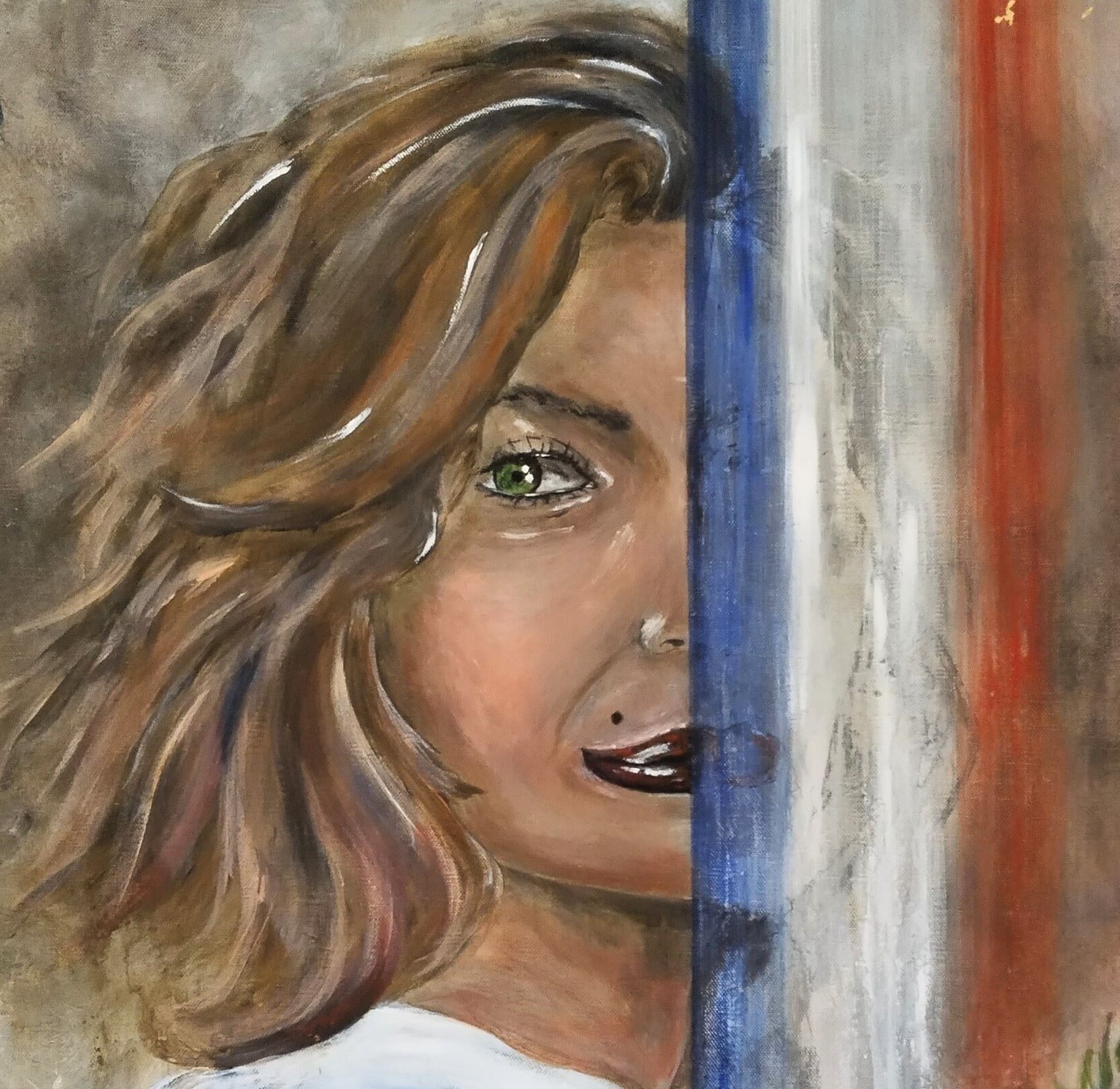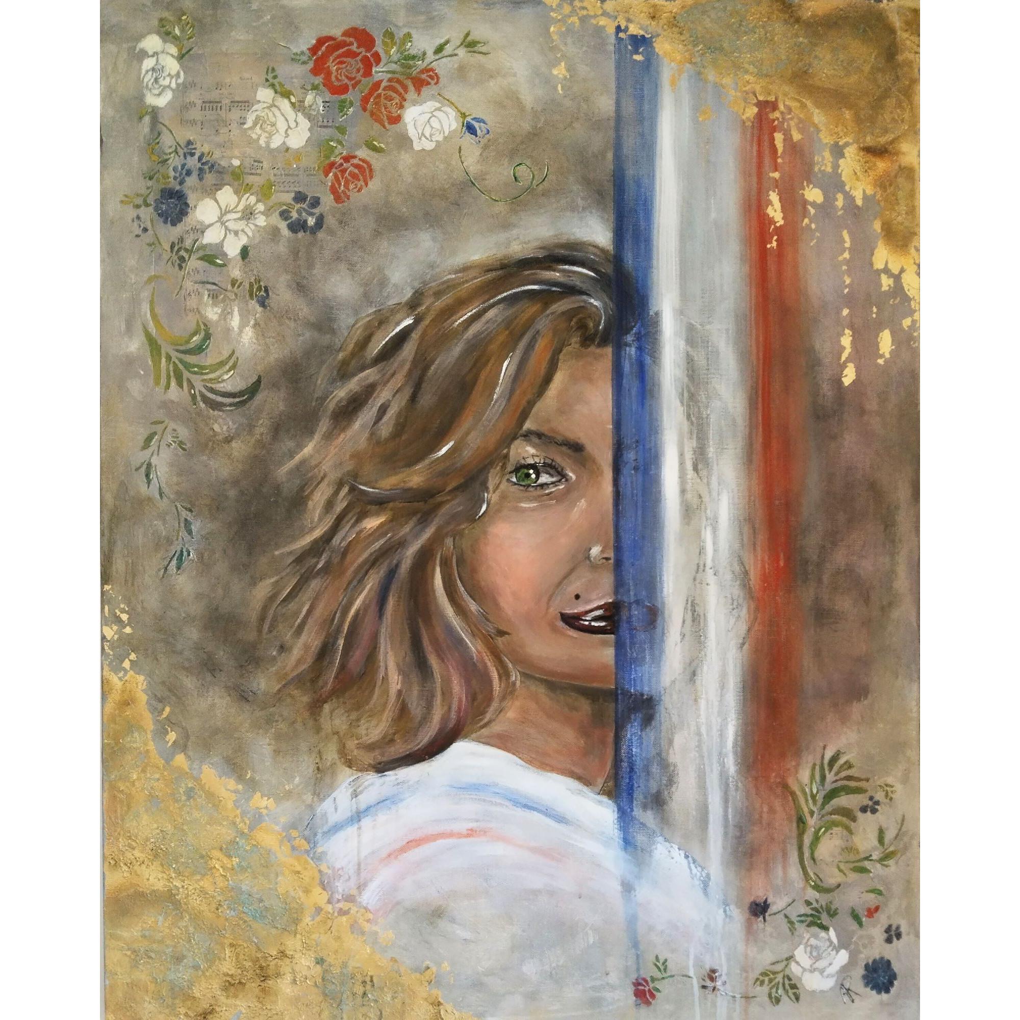 Marianne, le visage en partie dans l'ombre, a une expression à la fois sereine et déterminée. Les notes de musique en collage et les fleurs qui flottent autour d'elle, symbolisent l'espoir, la douceur et la renaissance, mais aussi la fragilité. Peinture acrylique, feuille d'or oxydée à la main, modeling past sur châssis entoilé (lin) de 92x73 cm, finition vernis.