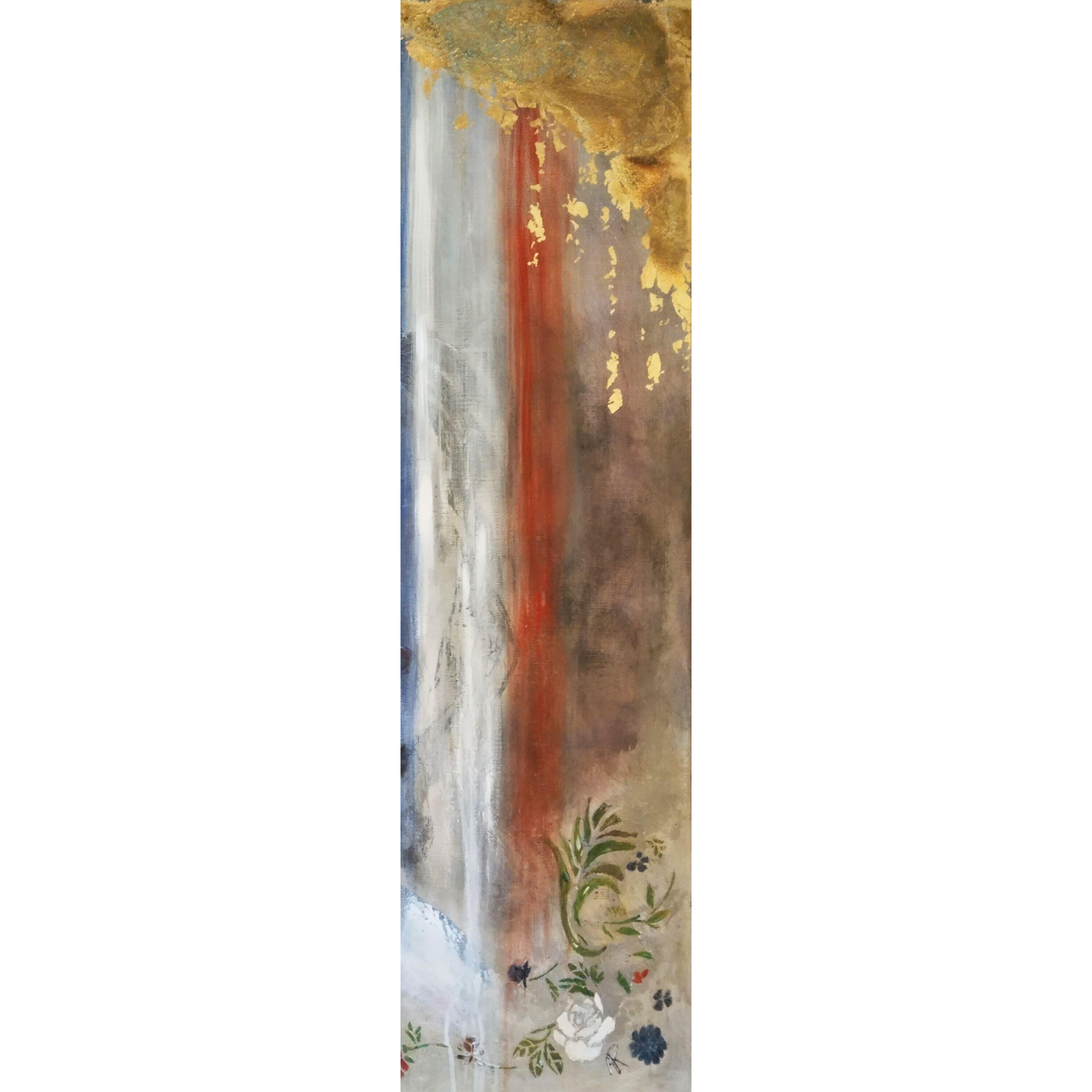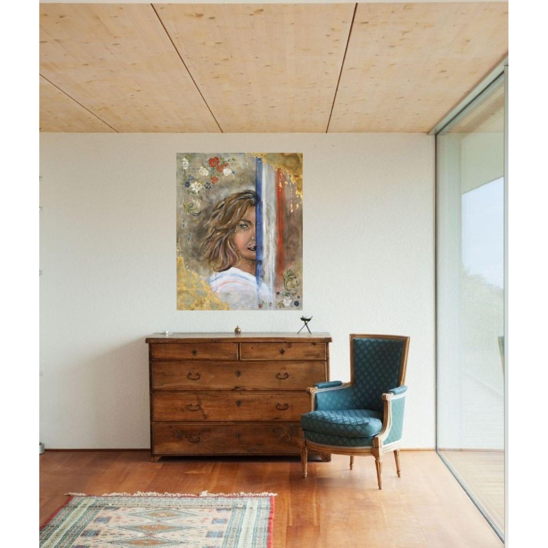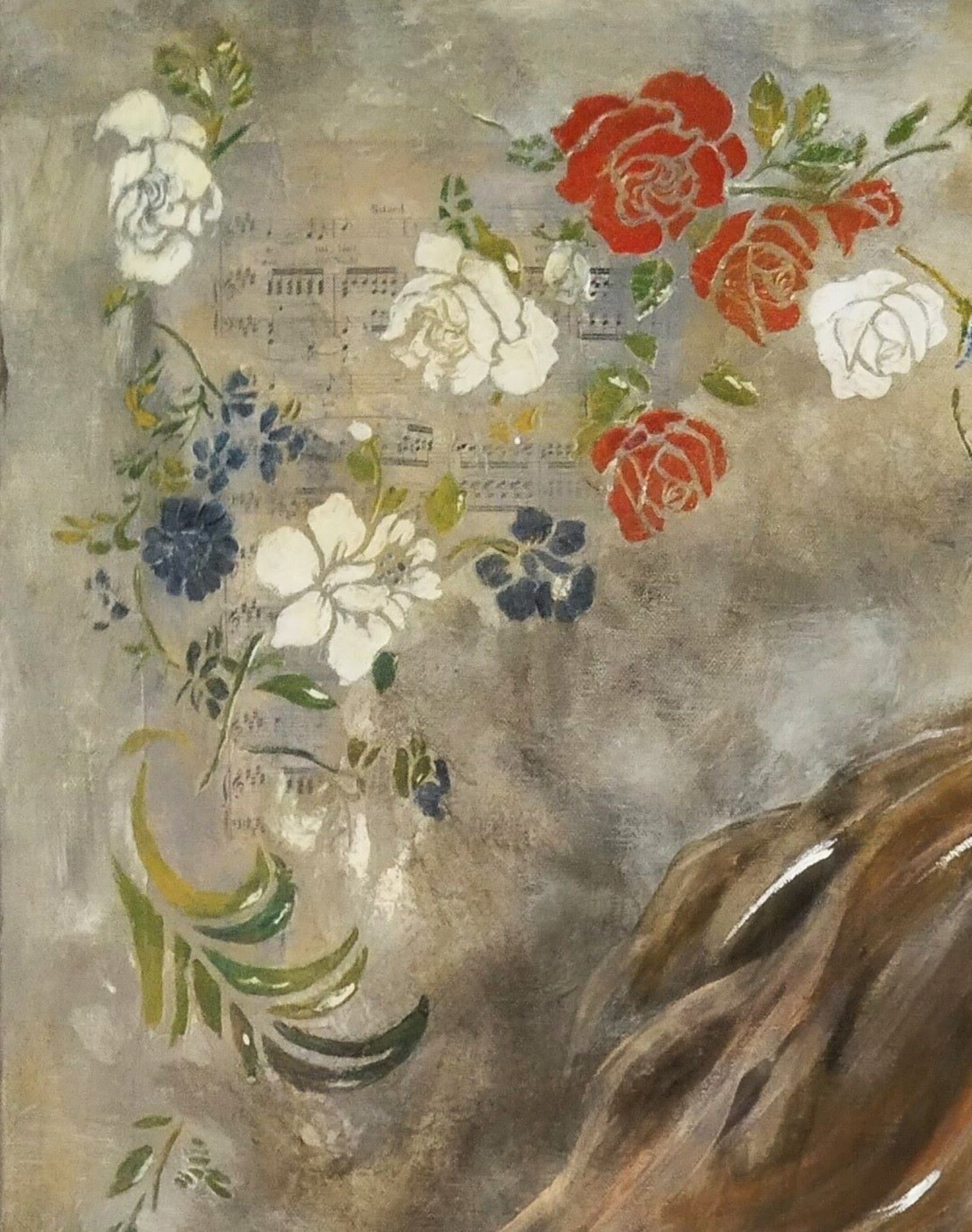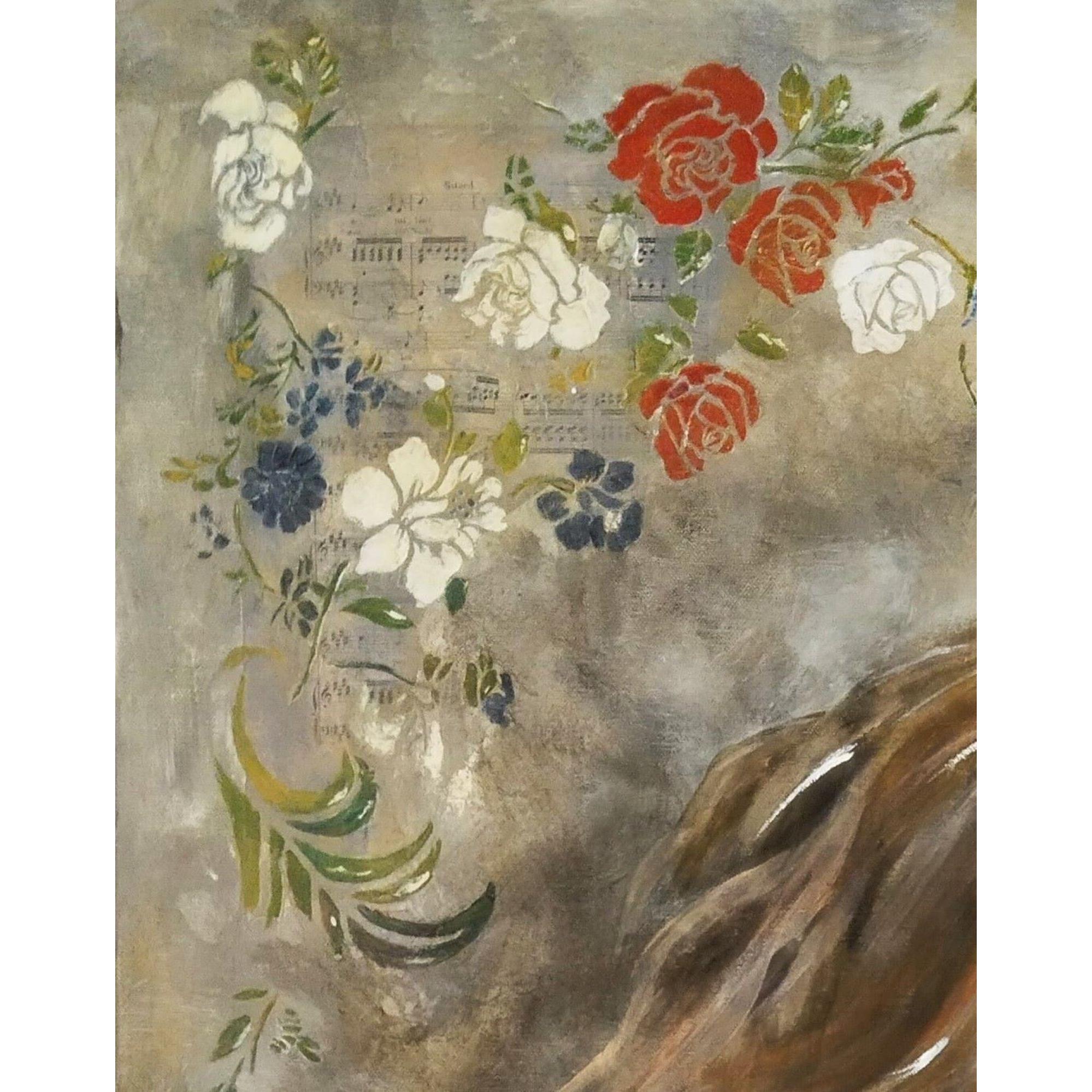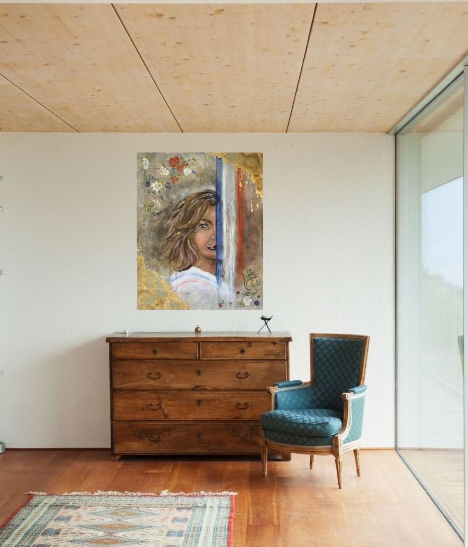 Marianne, le visage en partie dans l'ombre, a une expression à la fois sereine et déterminée. Les notes de musique en collage et les fleurs qui flottent autour d'elle, symbolisent l'espoir, la douceur et la renaissance, mais aussi la fragilité. Peinture acrylique, feuille d'or oxydée à la main, modeling past sur châssis entoilé (lin) de 92x73 cm, finition vernis.