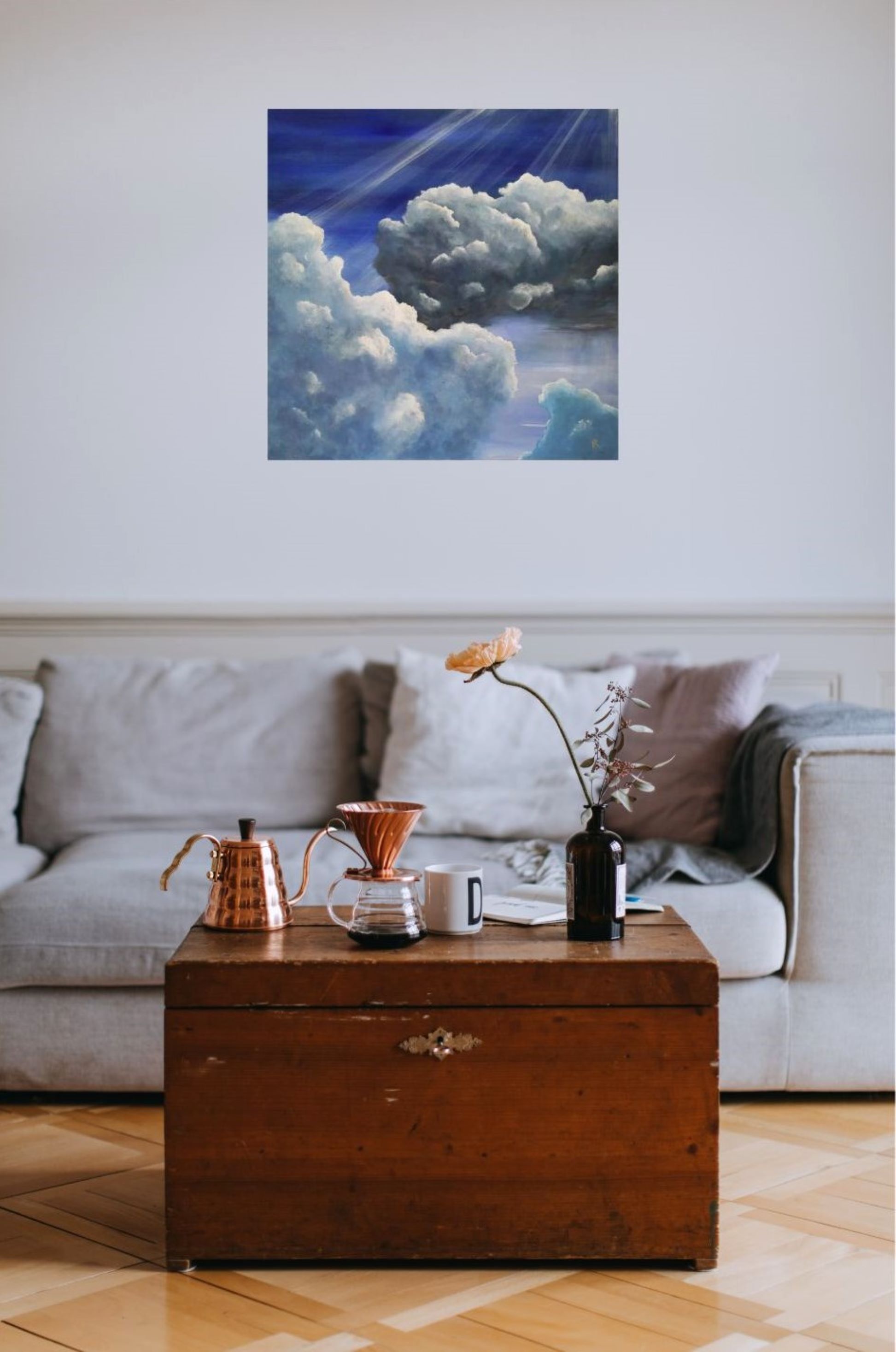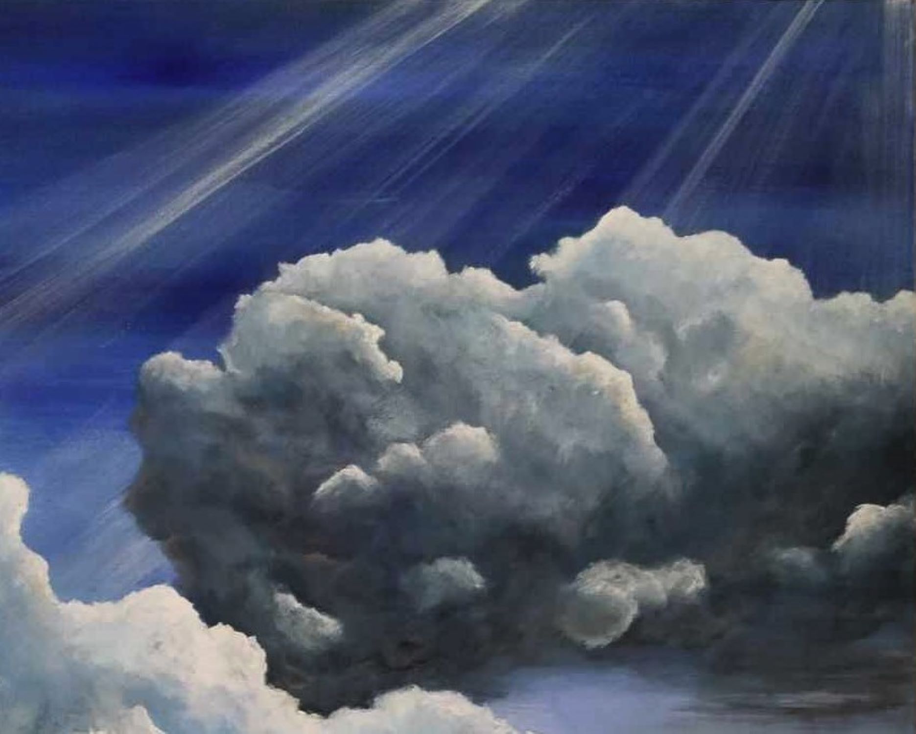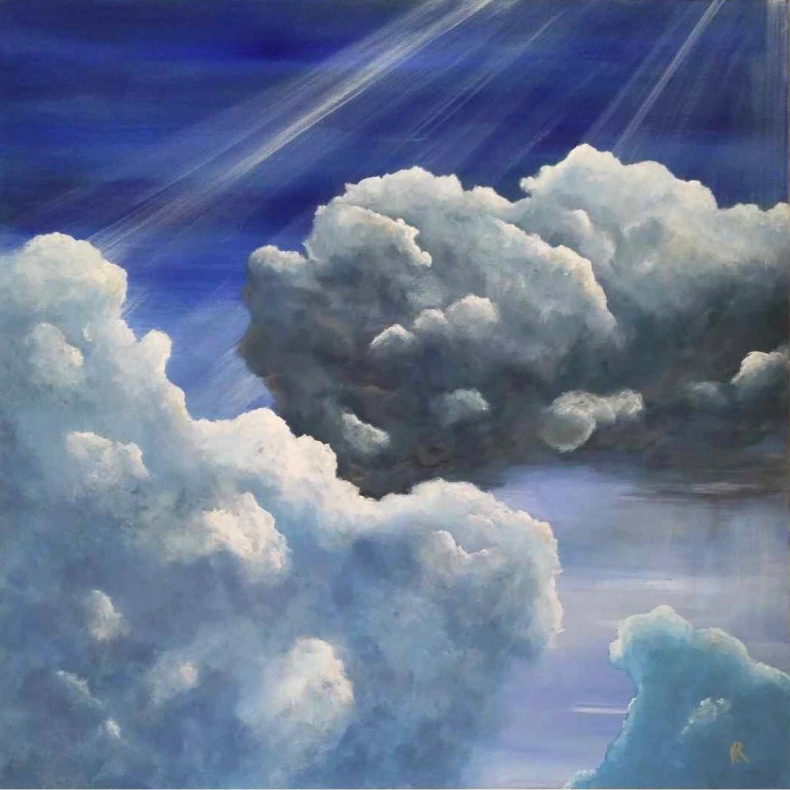 Des nuages qui semblent légers dans le ciel, certains plus sombres, d'autres plus clairs, créant des jeux d'ombres douces. Le bleu du ciel varie aussi, plus vif par endroits, plus pâle ailleurs, comme s'il se fondait avec les nuages. Des rayons de soleil brillent à travers les nuages, illuminant la scène avec douceur et incitant à la rêverie.