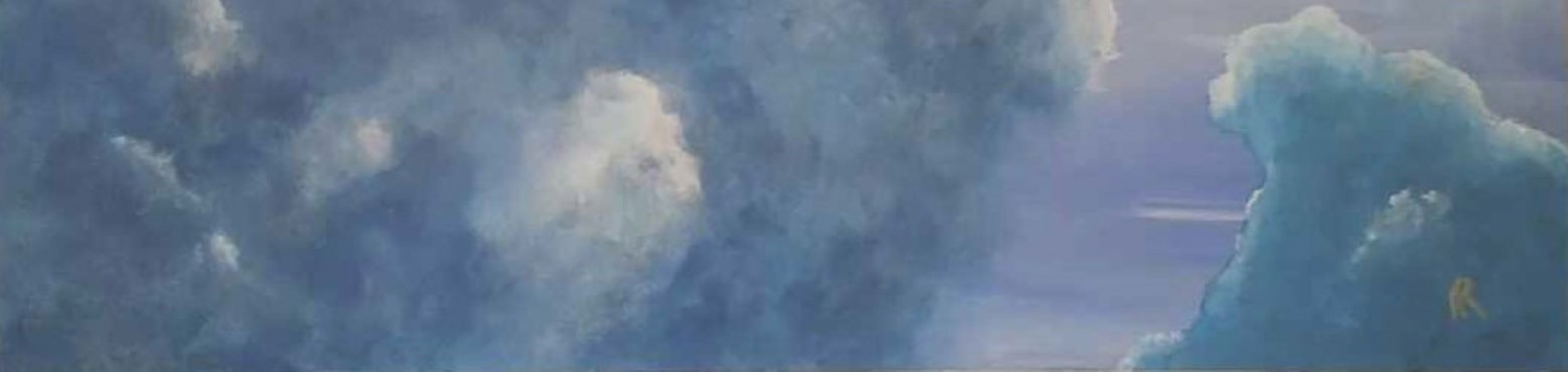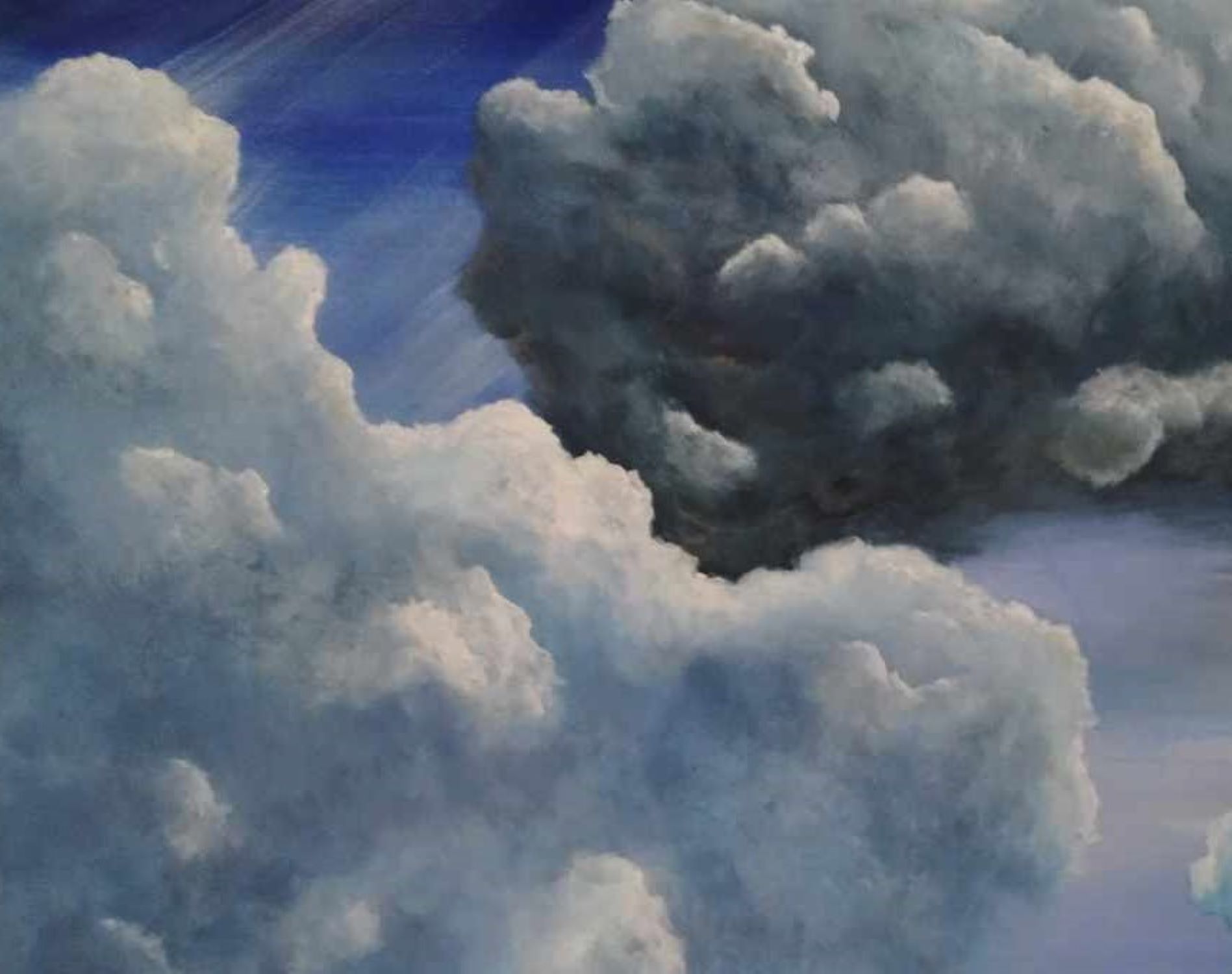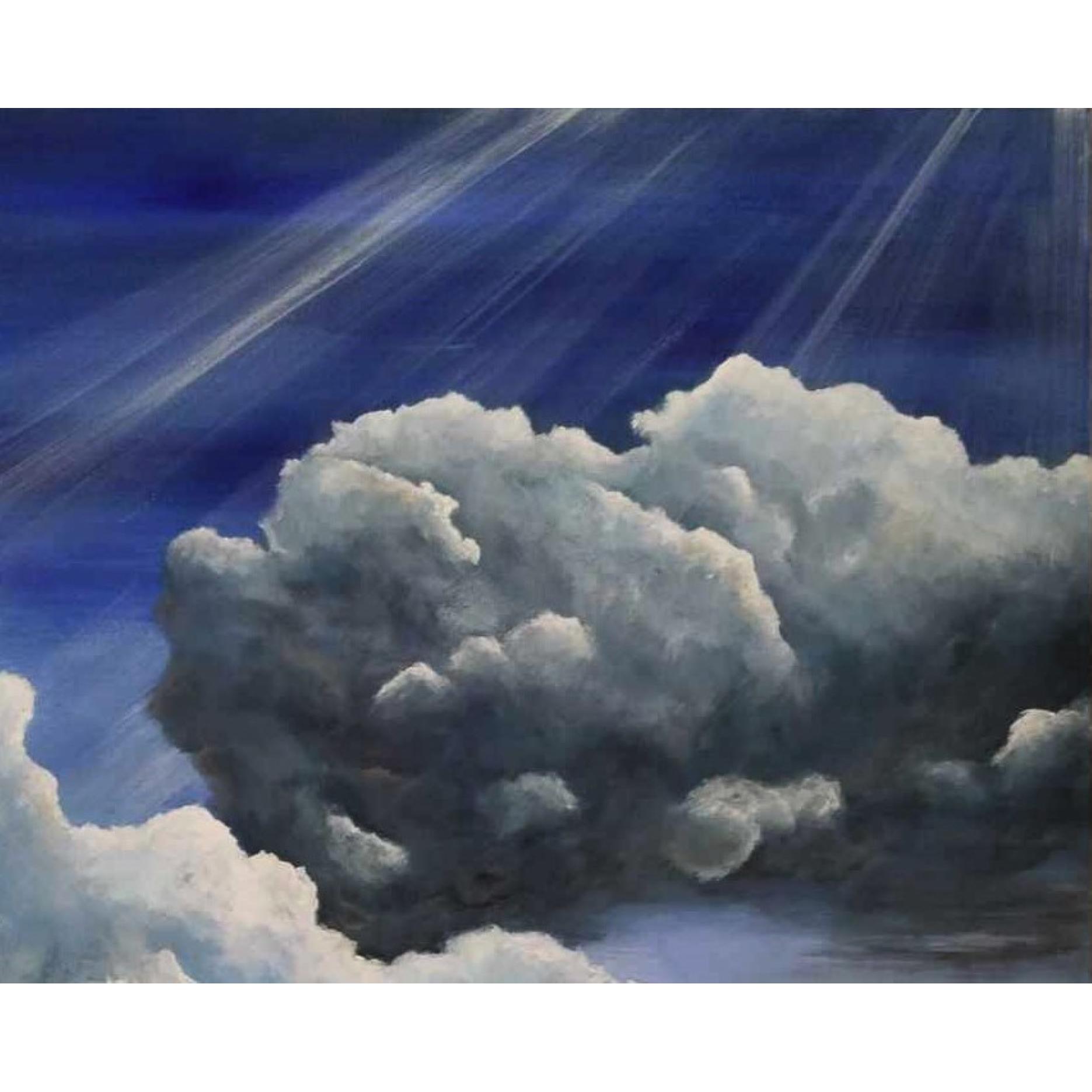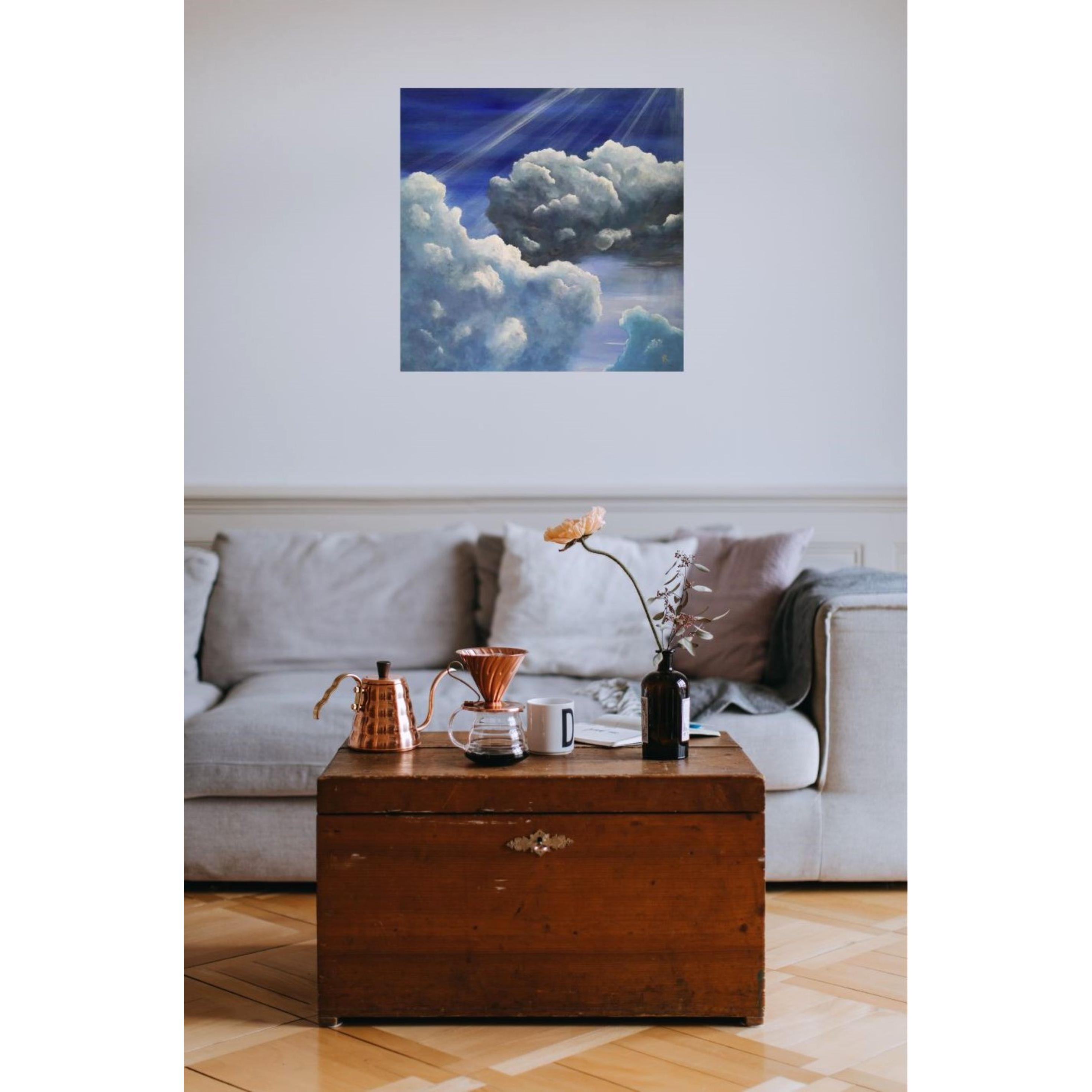 Des nuages qui semblent légers dans le ciel, certains plus sombres, d'autres plus clairs, créant des jeux d'ombres douces. Le bleu du ciel varie aussi, plus vif par endroits, plus pâle ailleurs, comme s'il se fondait avec les nuages. Des rayons de soleil brillent à travers les nuages, illuminant la scène avec douceur et incitant à la rêverie.