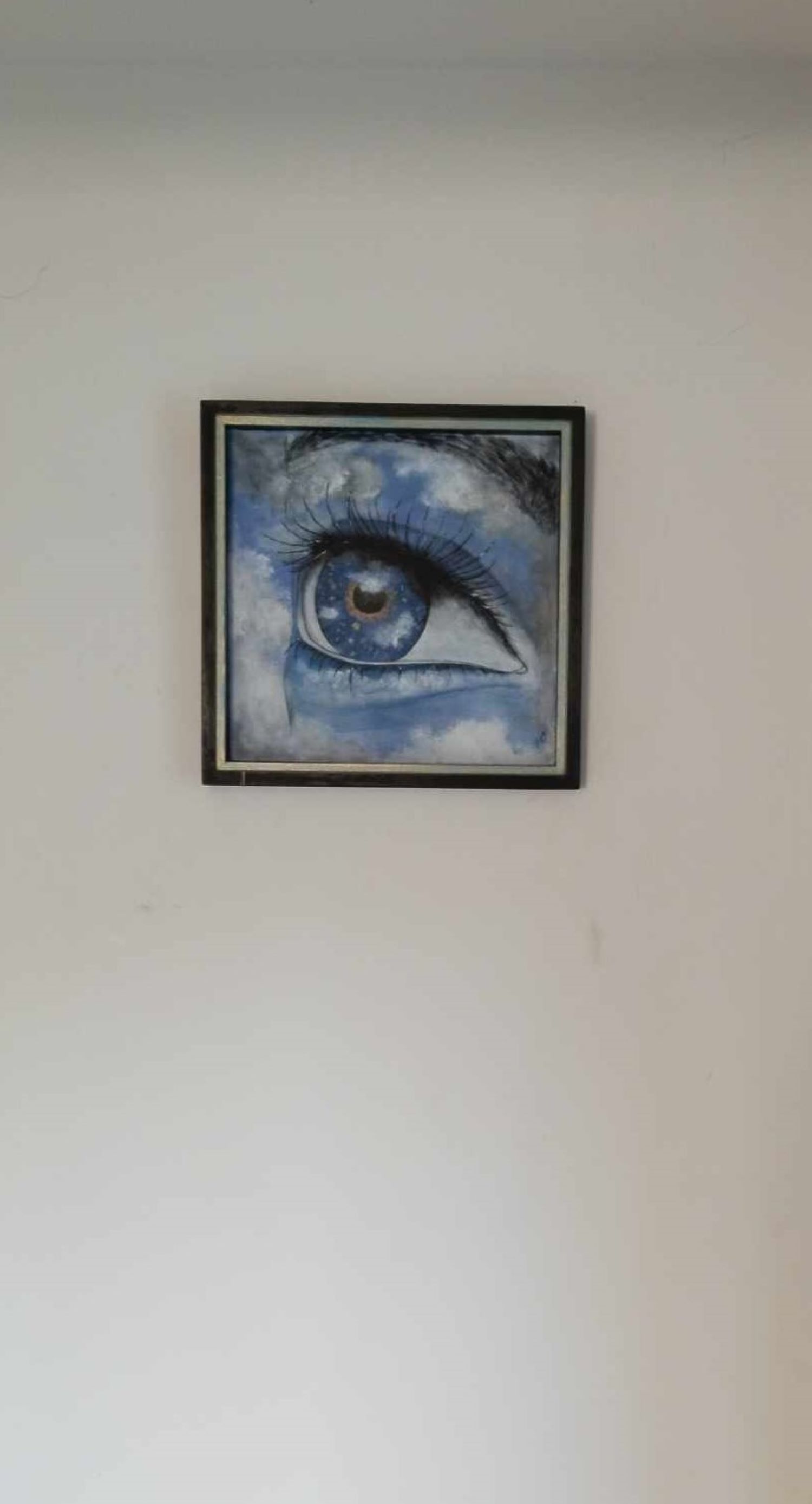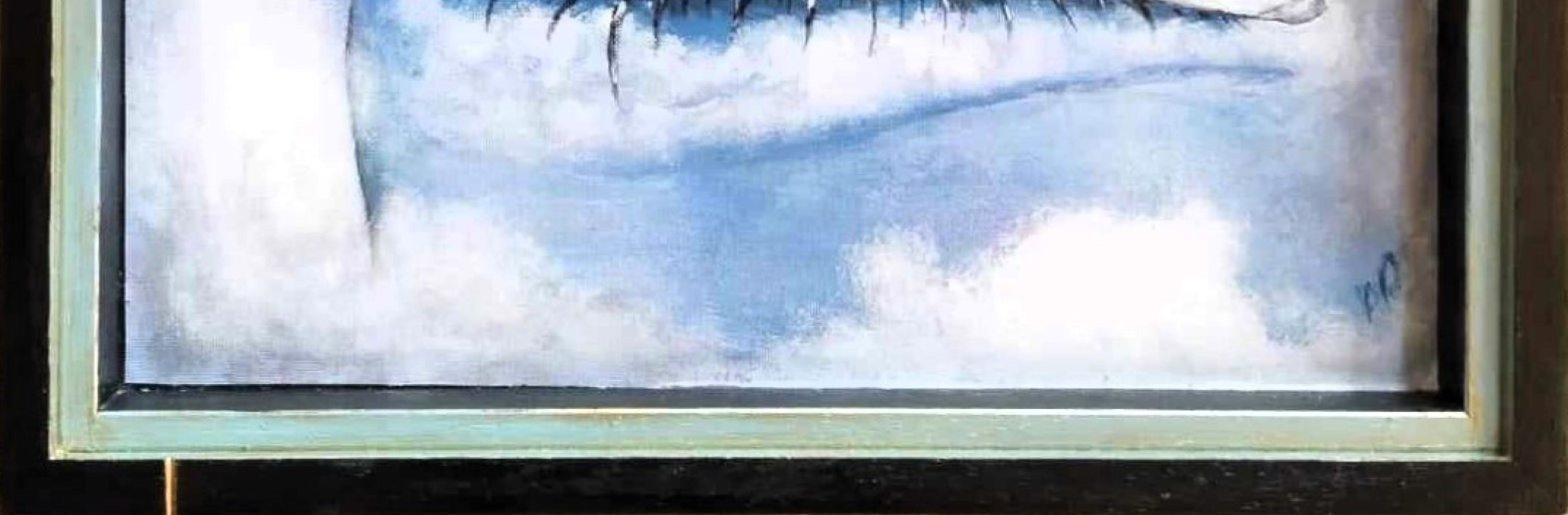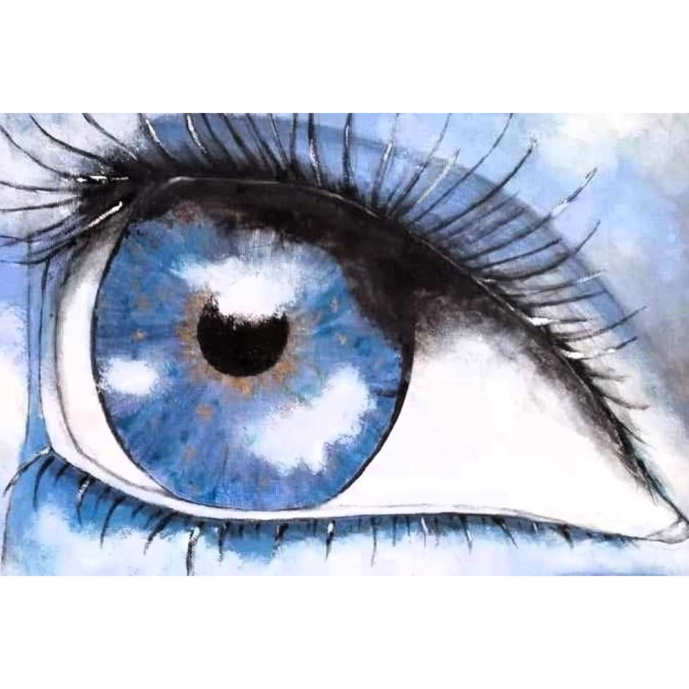 Un œil solitaire, pur comme l’air d’altitude et profondément mystérieux, flotte au centre d’un ciel de nuages vaporeux, évoquant une fusion entre l’humain et la nature, comme des reflets mutuels. Réalisé en acrylique sur toile marouflée sur châssis américain (toile 33,5x33,5 cm, dimensions finales 38x38 cm), le support rigide valorise la précision du trait et la profondeur de la composition. La finition vernis intensifie la lumière de l’œil et unifie l’atmosphère onirique, où le regard devient paysage et le ciel, conscience.