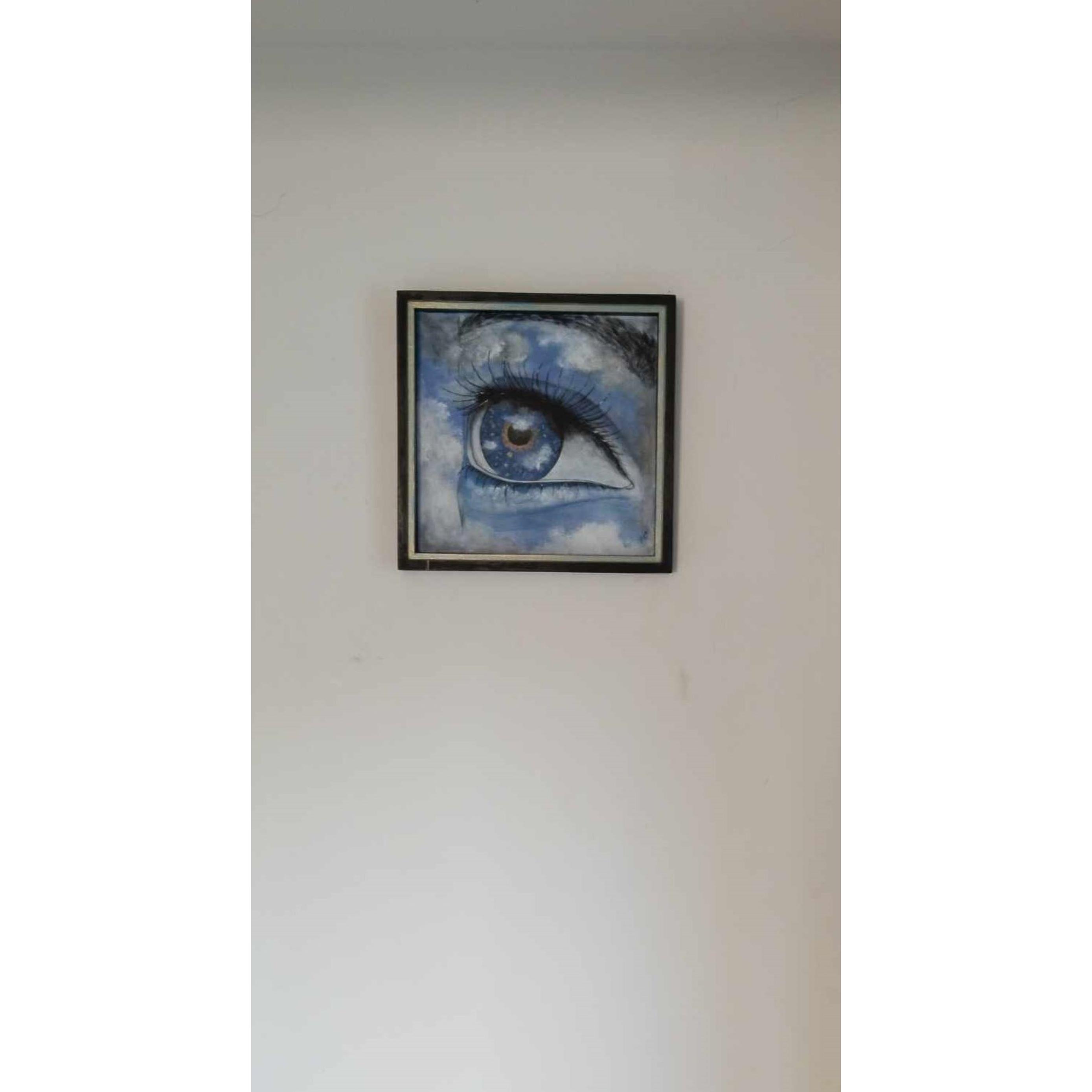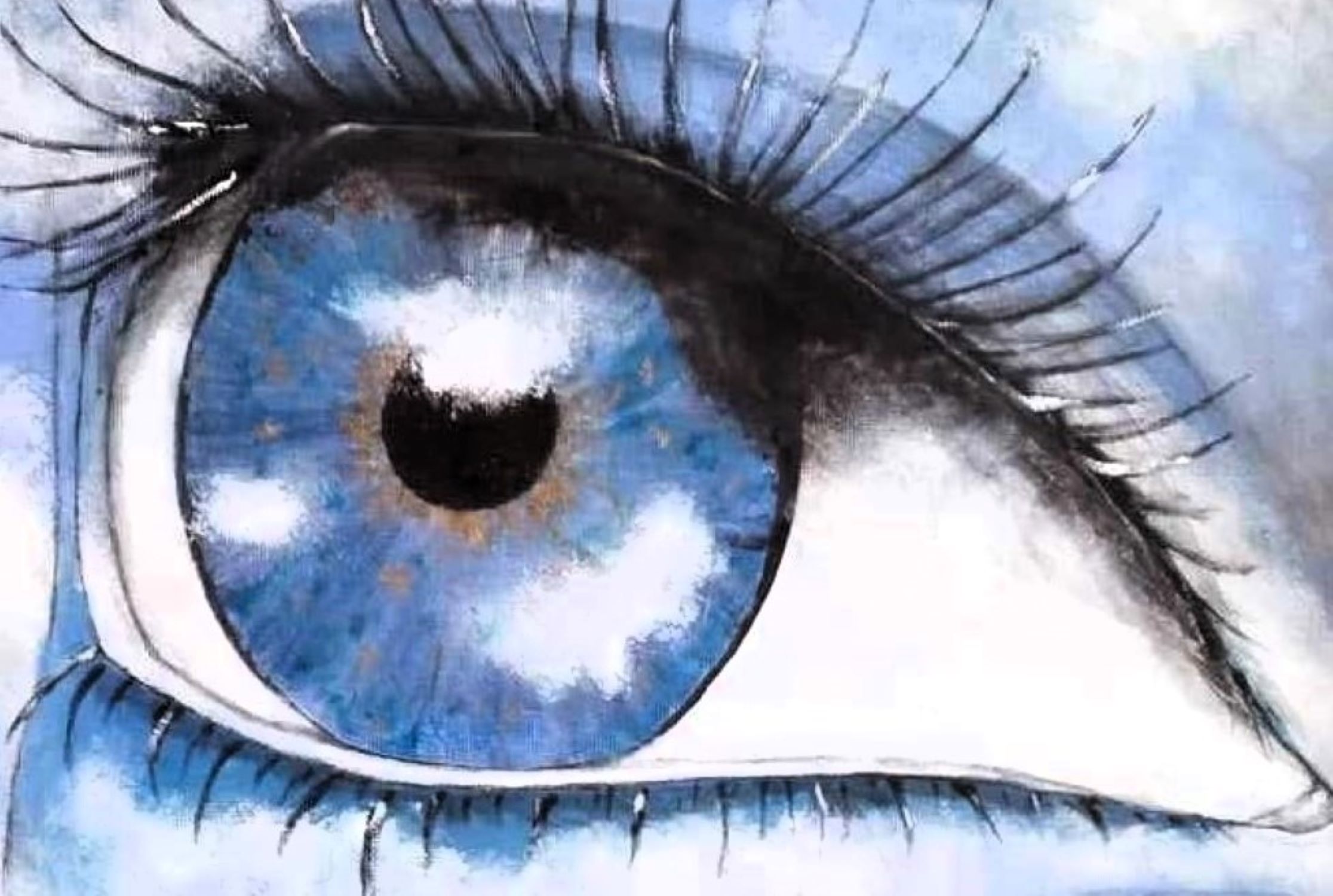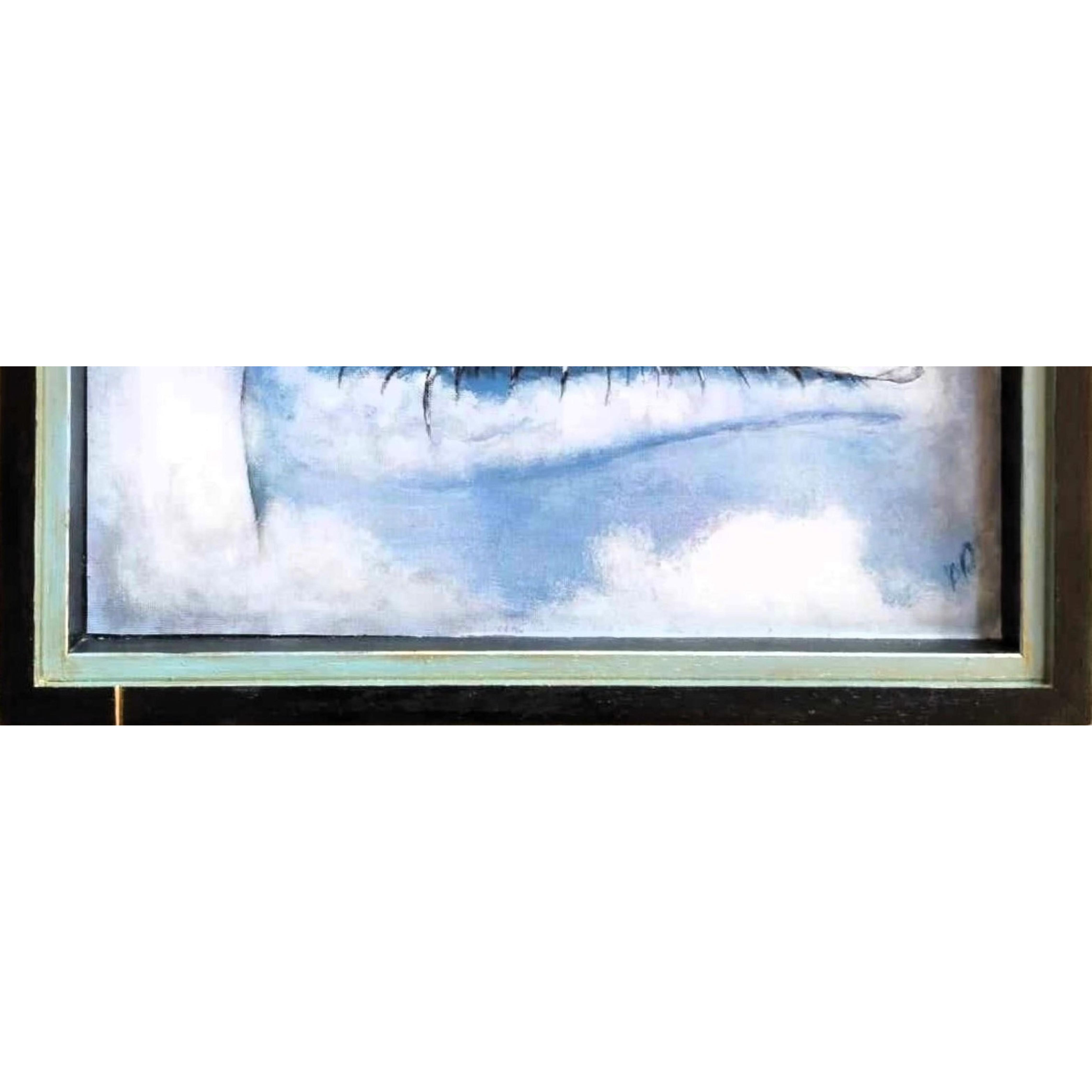 Un œil solitaire, pur comme l’air d’altitude et profondément mystérieux, flotte au centre d’un ciel de nuages vaporeux, évoquant une fusion entre l’humain et la nature, comme des reflets mutuels. Réalisé en acrylique sur toile marouflée sur châssis américain (toile 33,5x33,5 cm, dimensions finales 38x38 cm), le support rigide valorise la précision du trait et la profondeur de la composition. La finition vernis intensifie la lumière de l’œil et unifie l’atmosphère onirique, où le regard devient paysage et le ciel, conscience.