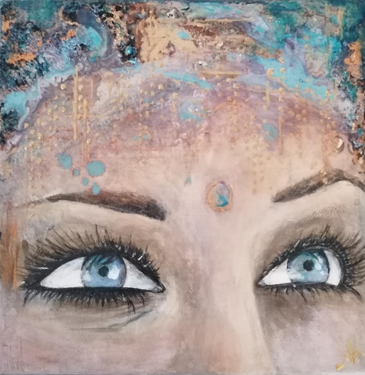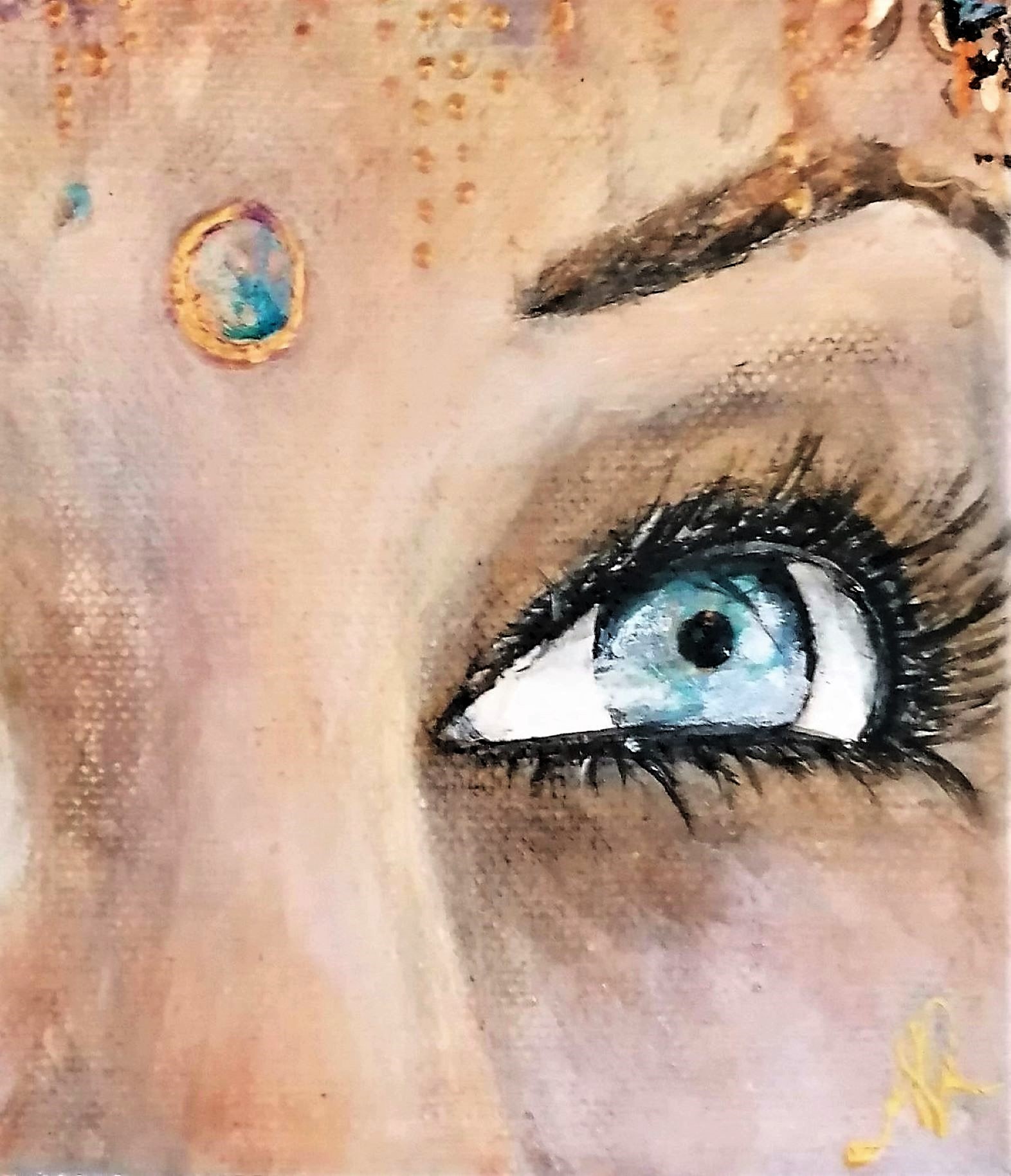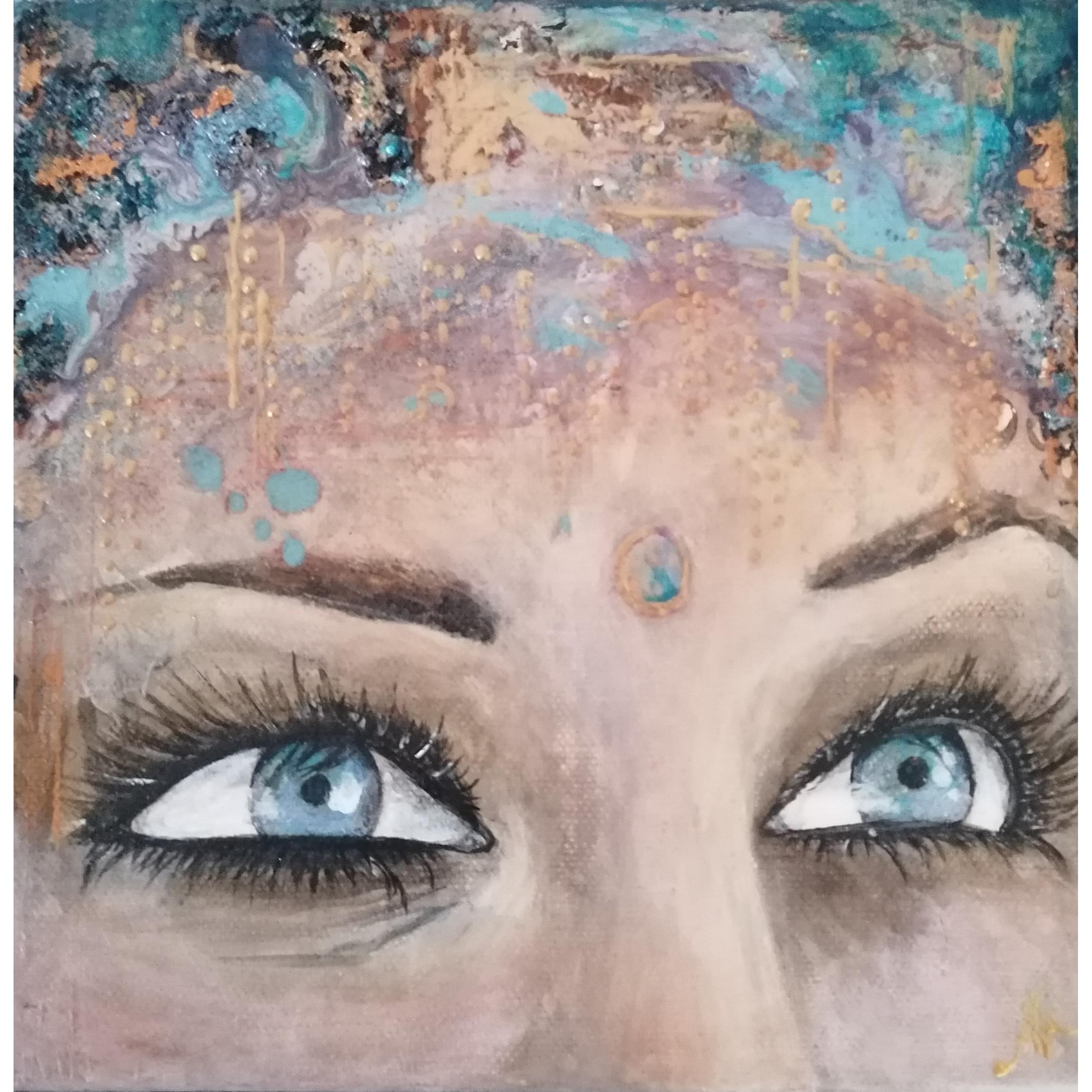 Cette toute petite toile de 20x20 cm, réalisée sur châssis en technique mixte à base acrylique, capture un joli sourire aux nuances bleutées. L’expression, à la fois douce et mystérieuse, évoque subtilement une inspiration indienne, mêlant tradition et modernité. L’œuvre joue sur les contrastes de teintes et de textures pour créer une présence intime et captivante. Finition vernis pour protéger la surface et sublimer les reflets, idéale pour une décoration murale raffinée.