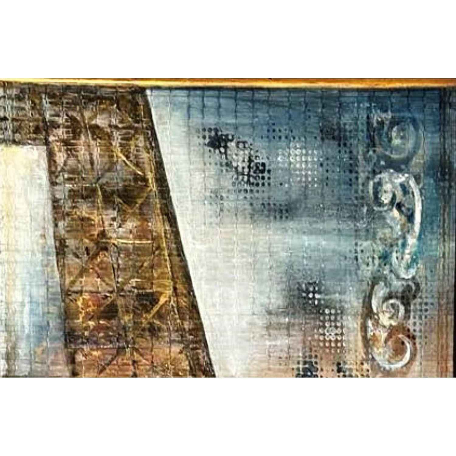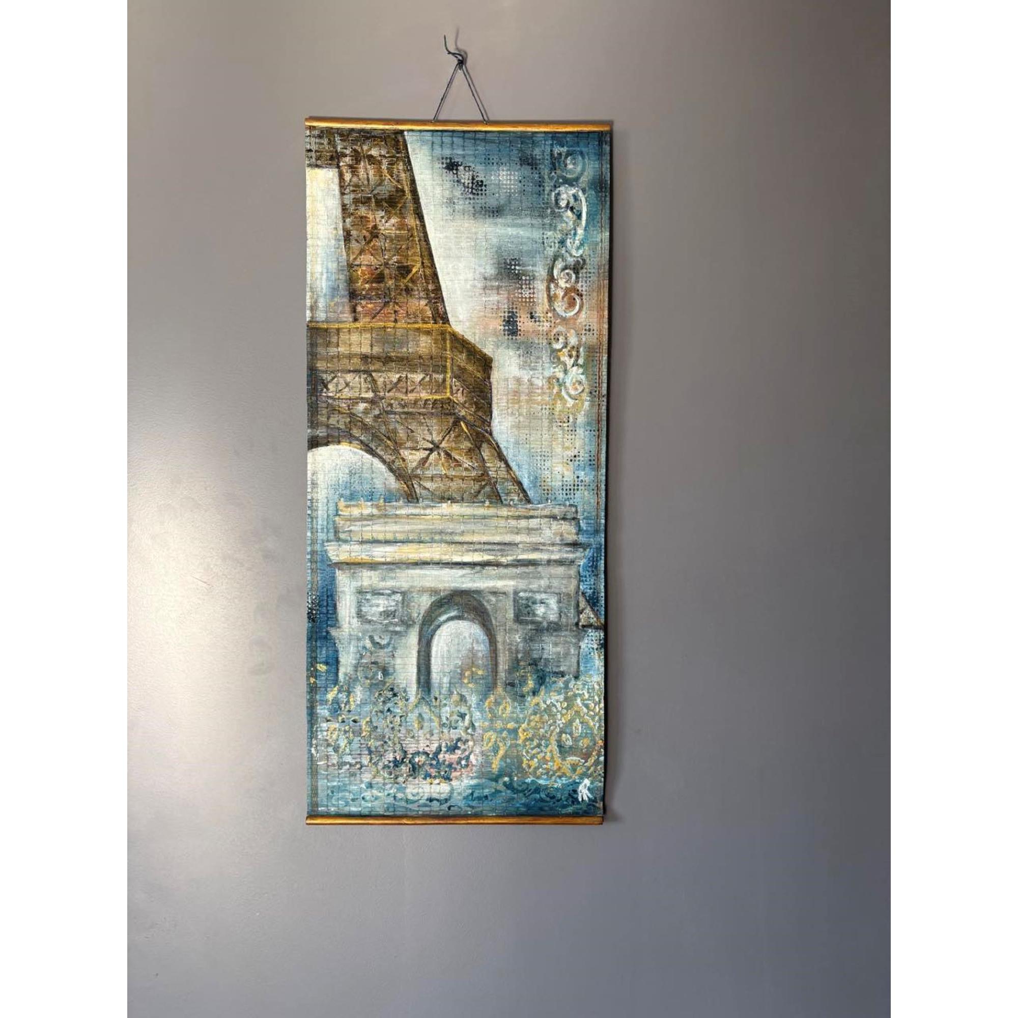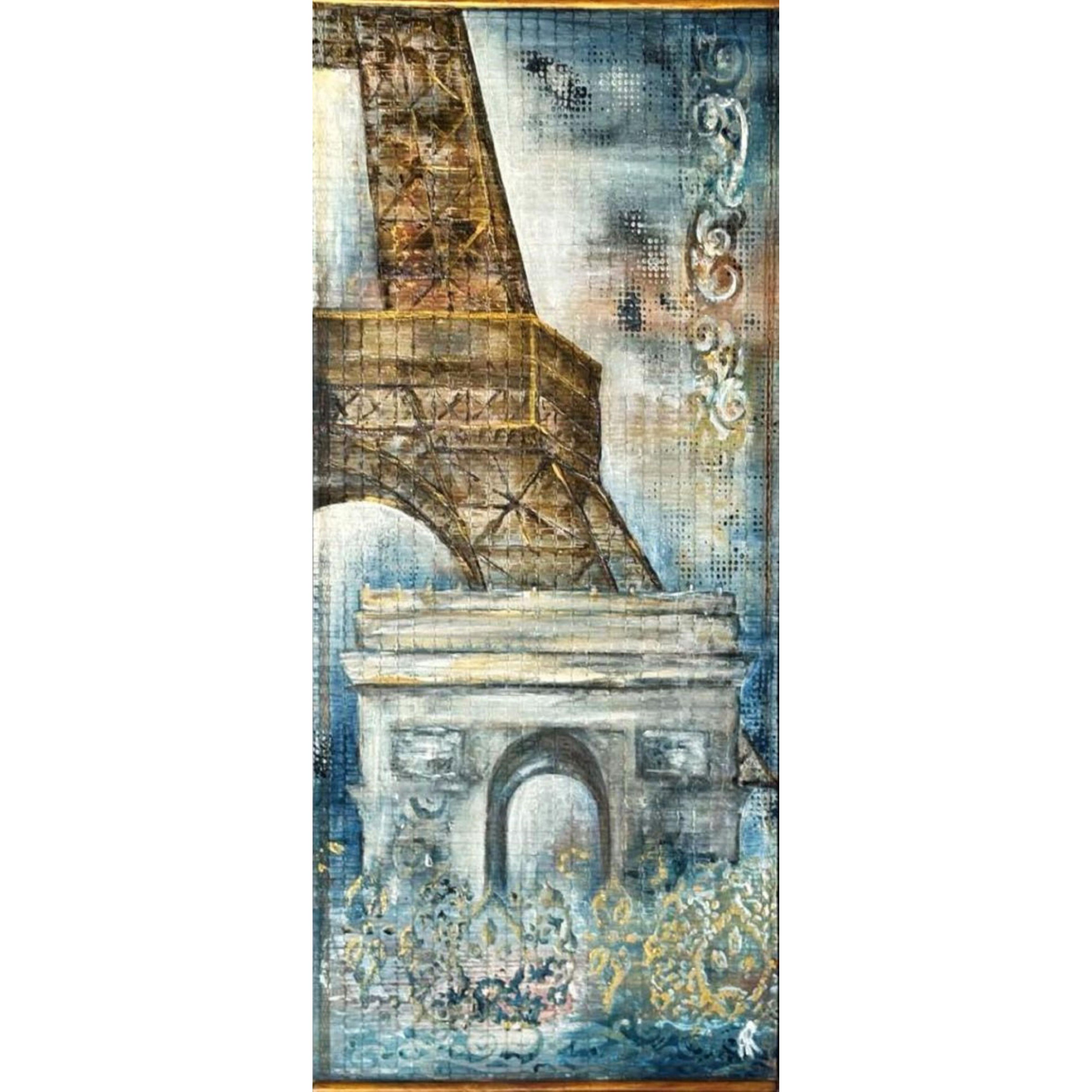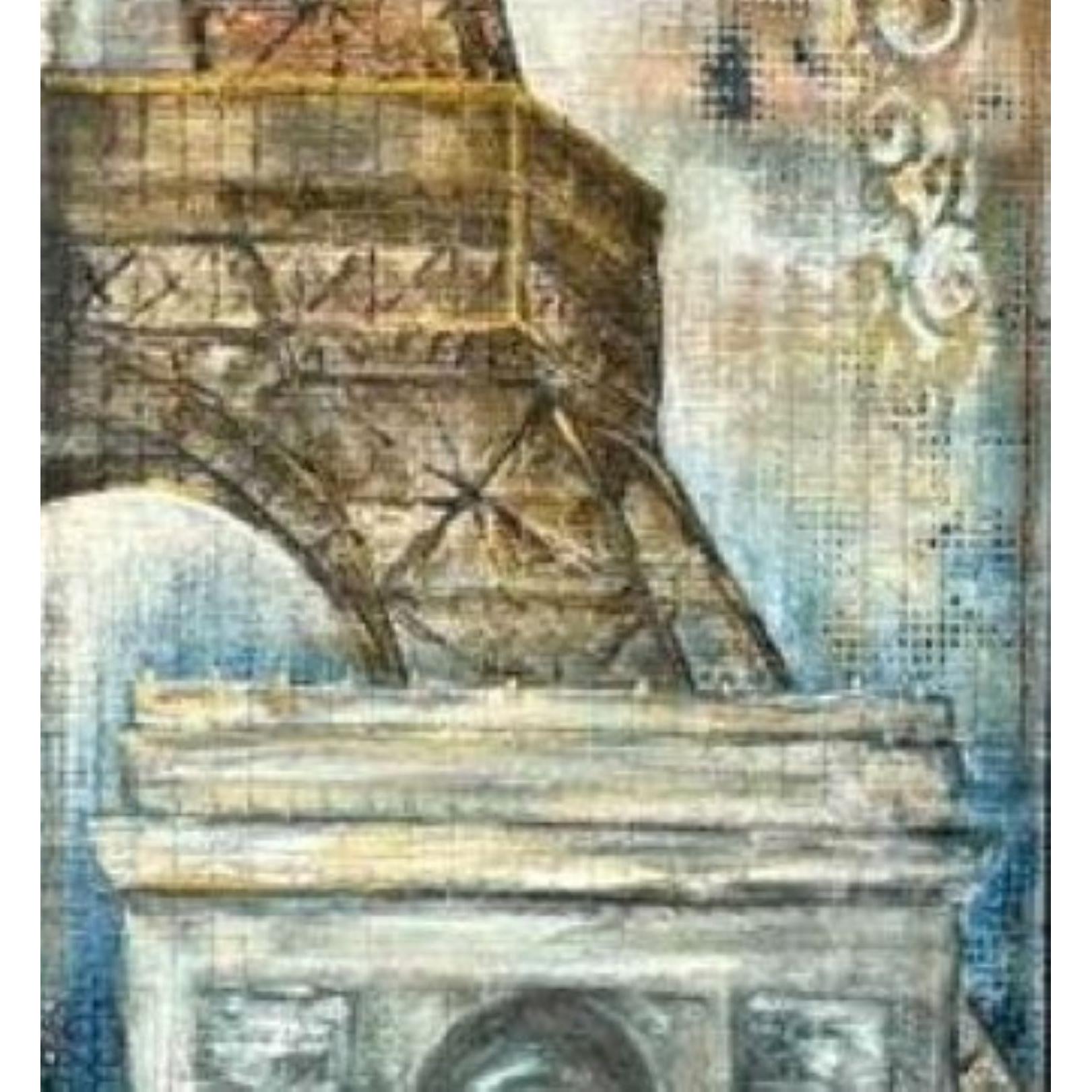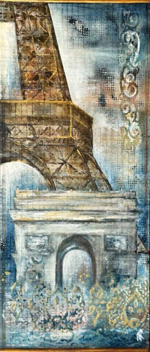Découvrez Paris à ma façon avec cette œuvre unique représentant deux monuments emblématiques dans un univers onirique et léger. Nuances de bleu, gris et blanc évoquent le ciel parisien, créant une atmosphère paisible et distante de l’agitation. Peinture acrylique et modeling paste sur support souple en bandes de bambou, format 74,5 x 32 cm, finition vernis.