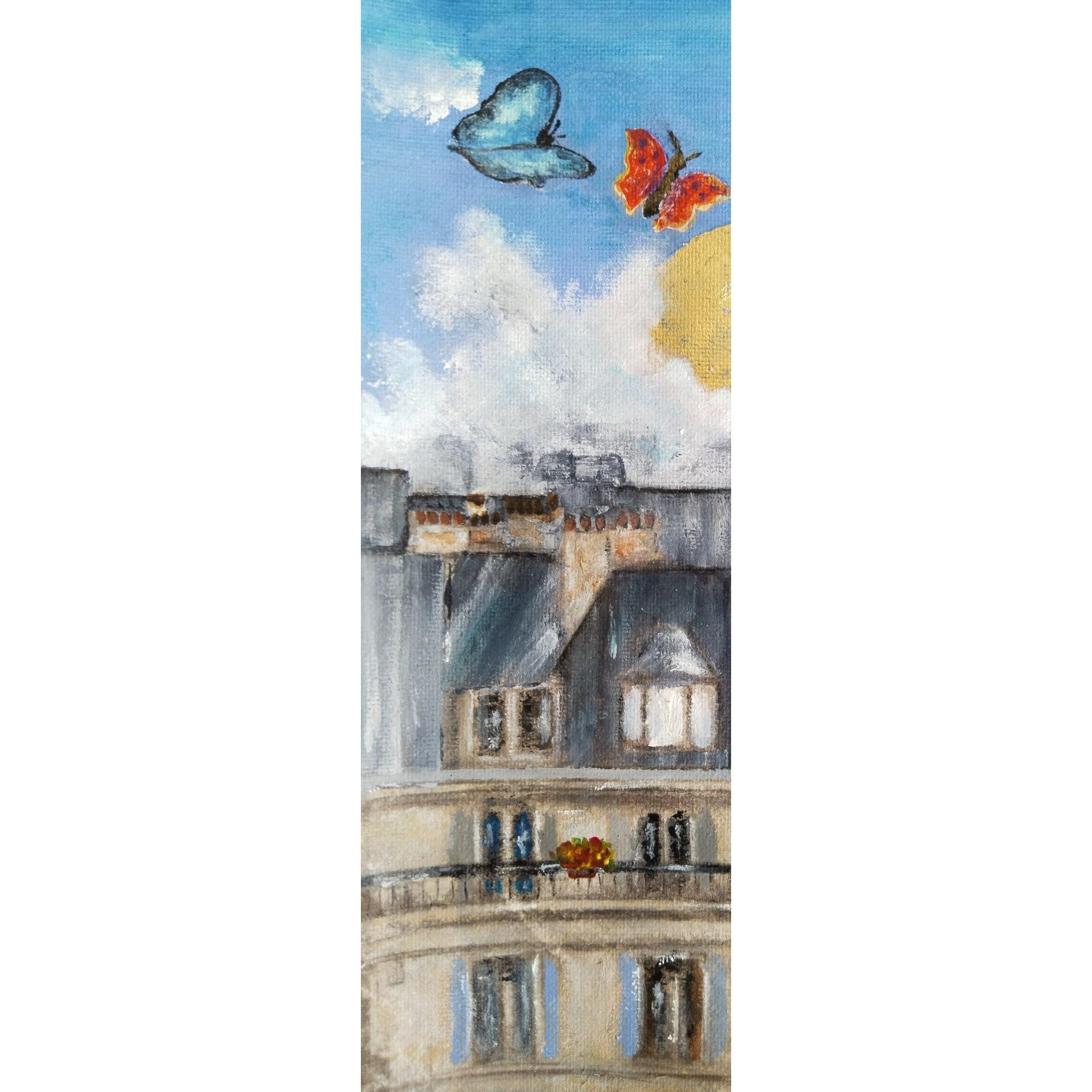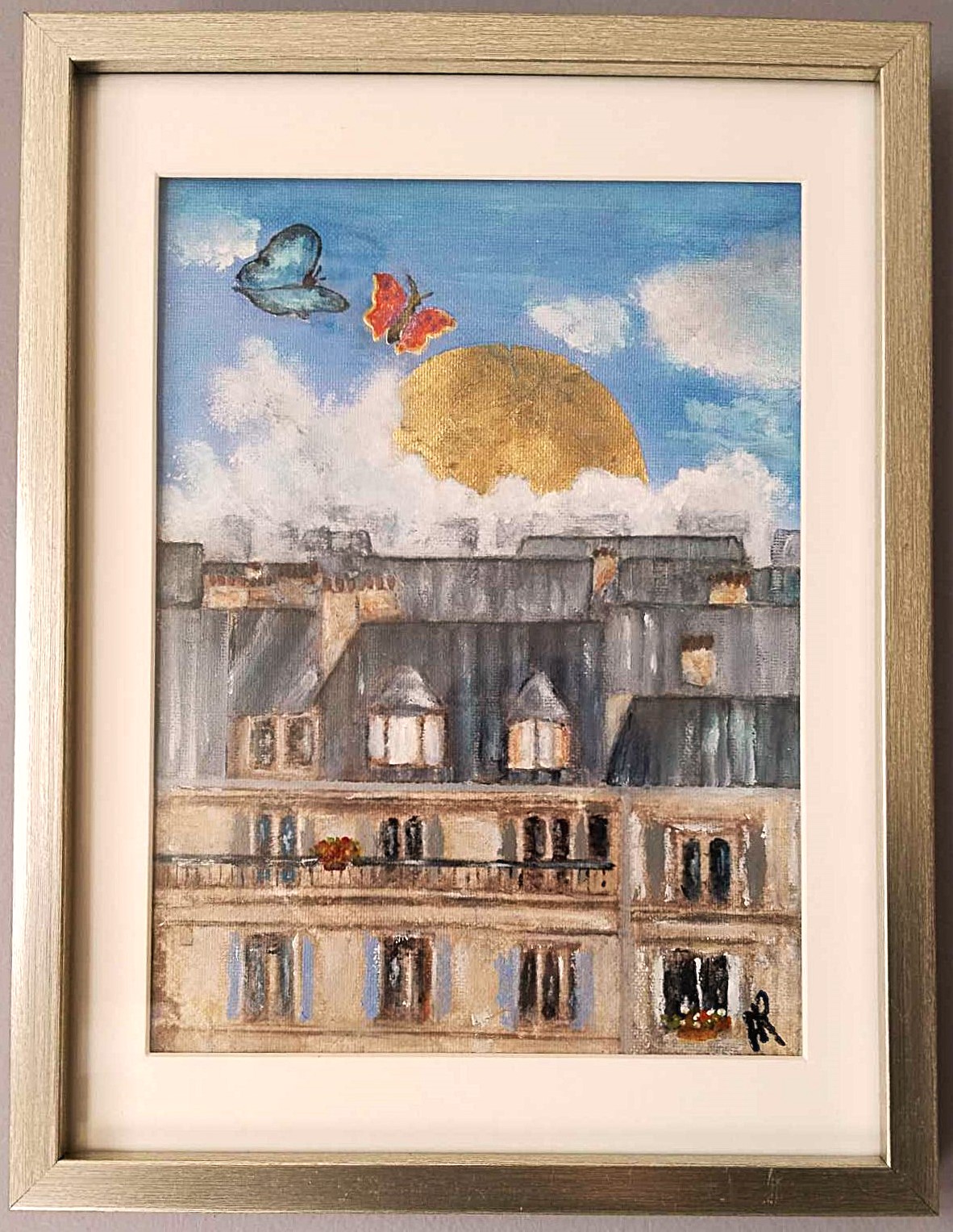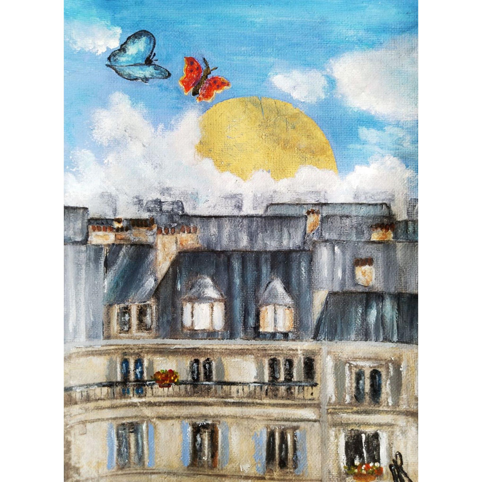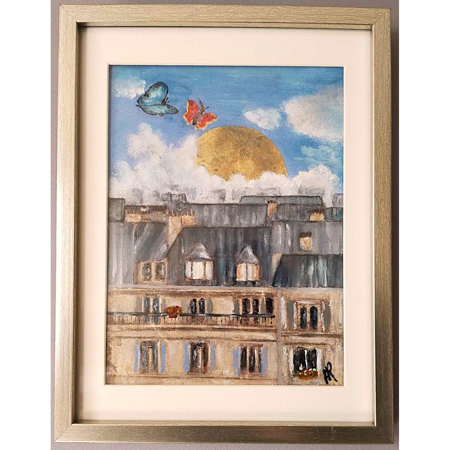 Cette peinture acrylique sur toile, sublimée par de la feuille dorée et protégée par une finition vernis, offre une vue poétique sur les toits de Paris. Un grand soleil éclaire le ciel bleu, ponctué de nuages légers, tandis que des papillons colorés apportent une touche de mouvement et de légèreté. L’œuvre, de 21 x 15 cm sans cadre, est présentée dans un cadre argenté sous verre avec passe-partout, pour une dimension finale de 26 x 20 cm, à poser ou accrocher. Idéale pour les amateurs d’art contemporain inspiré de Paris, cette création associe éclat lumineux, raffinement et modernité.