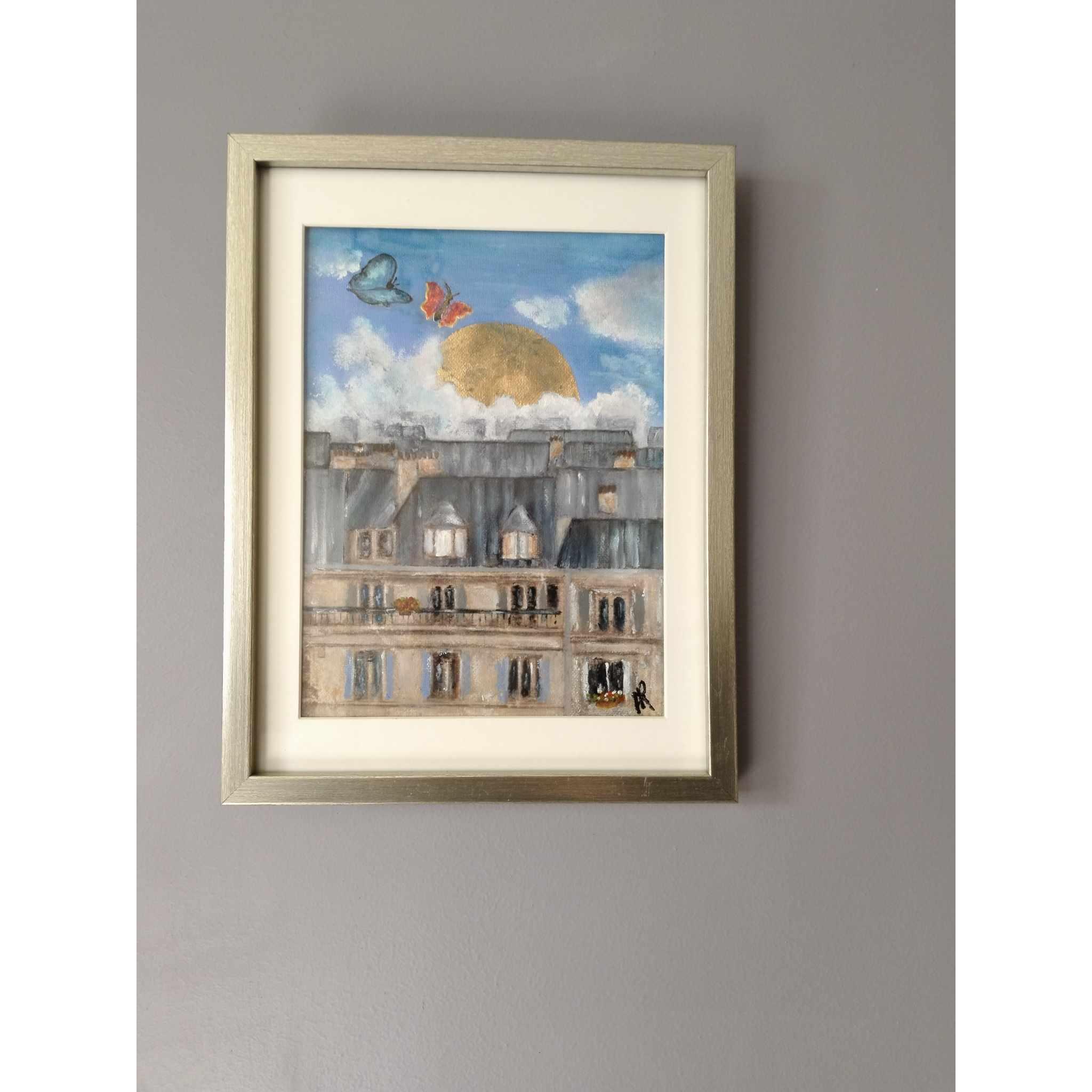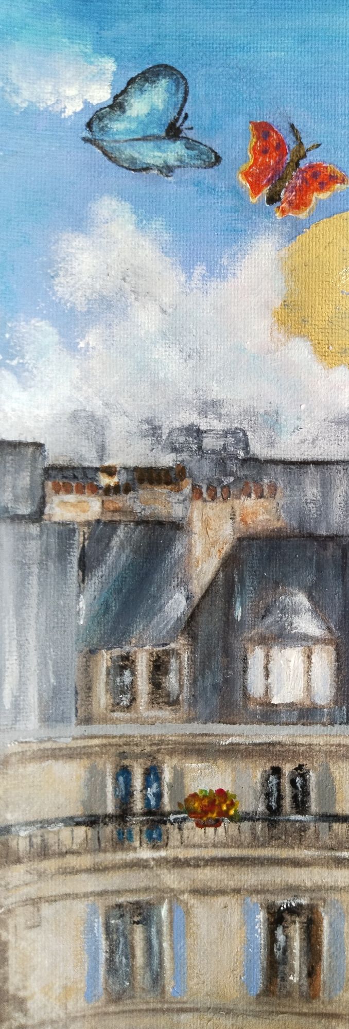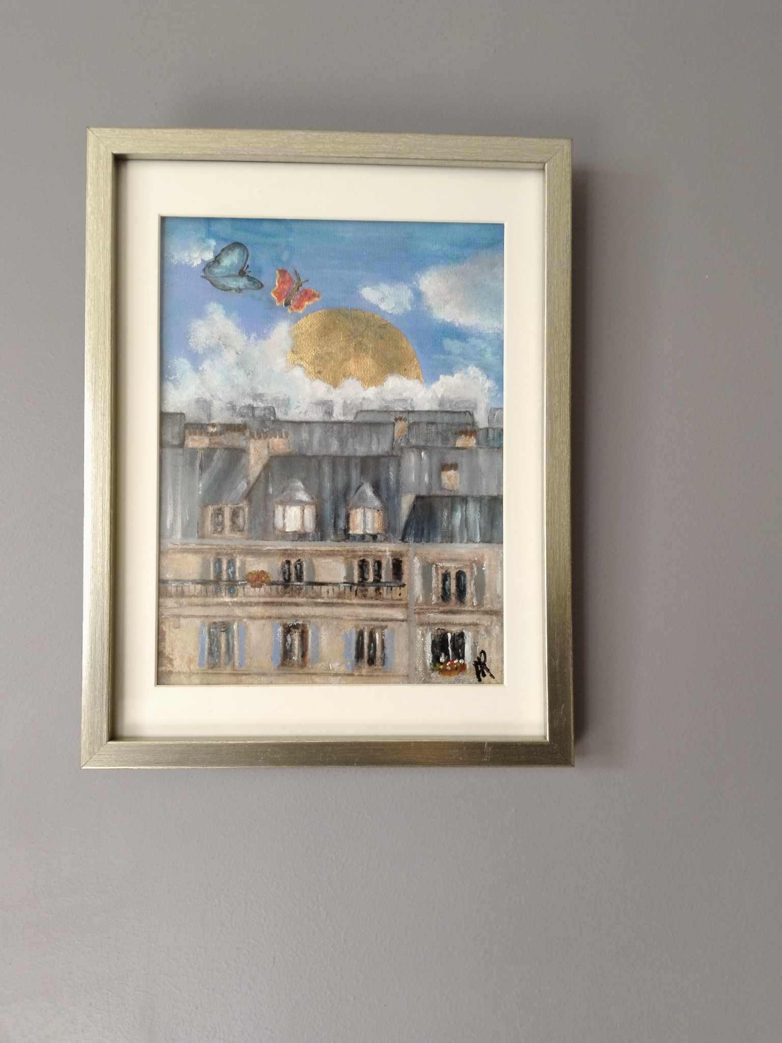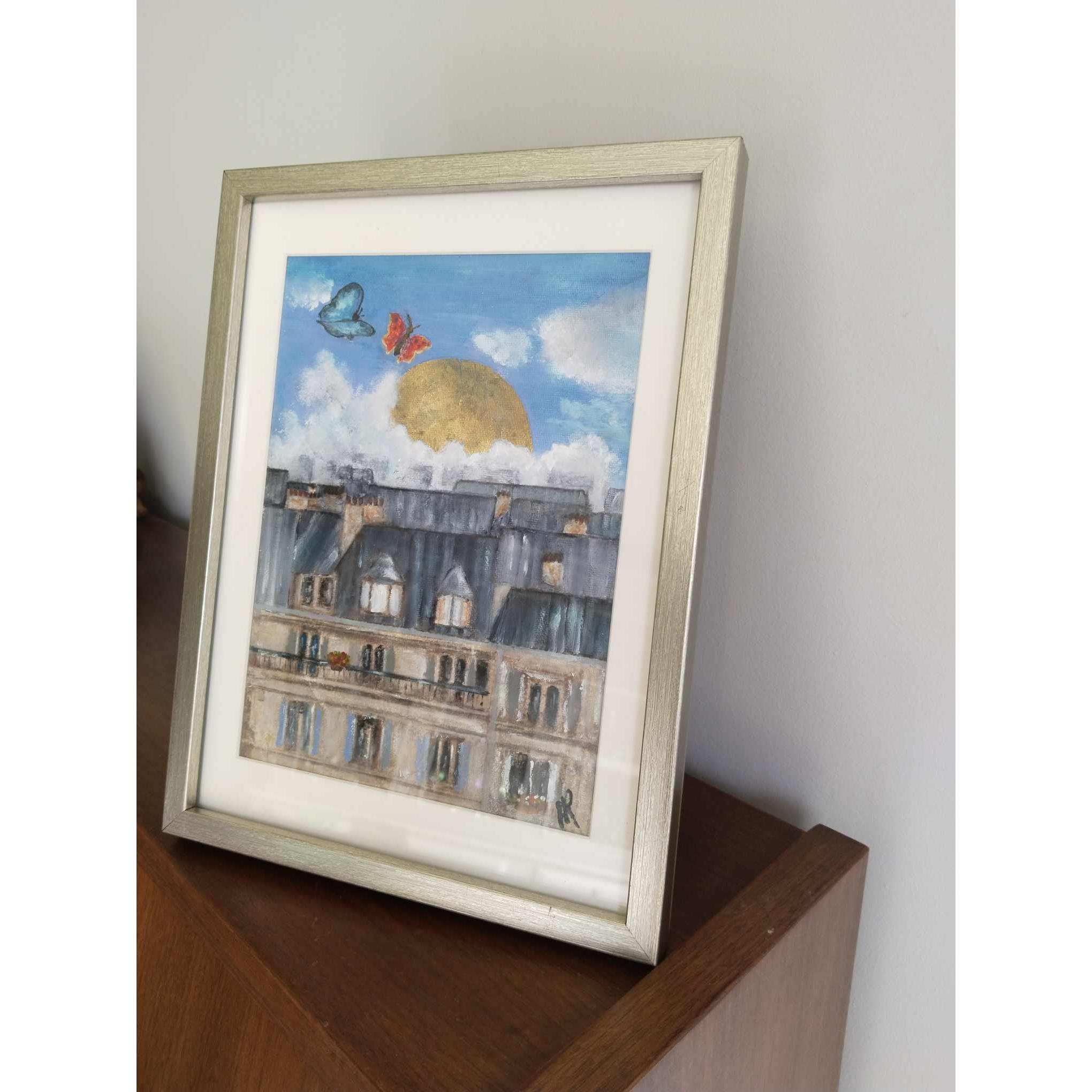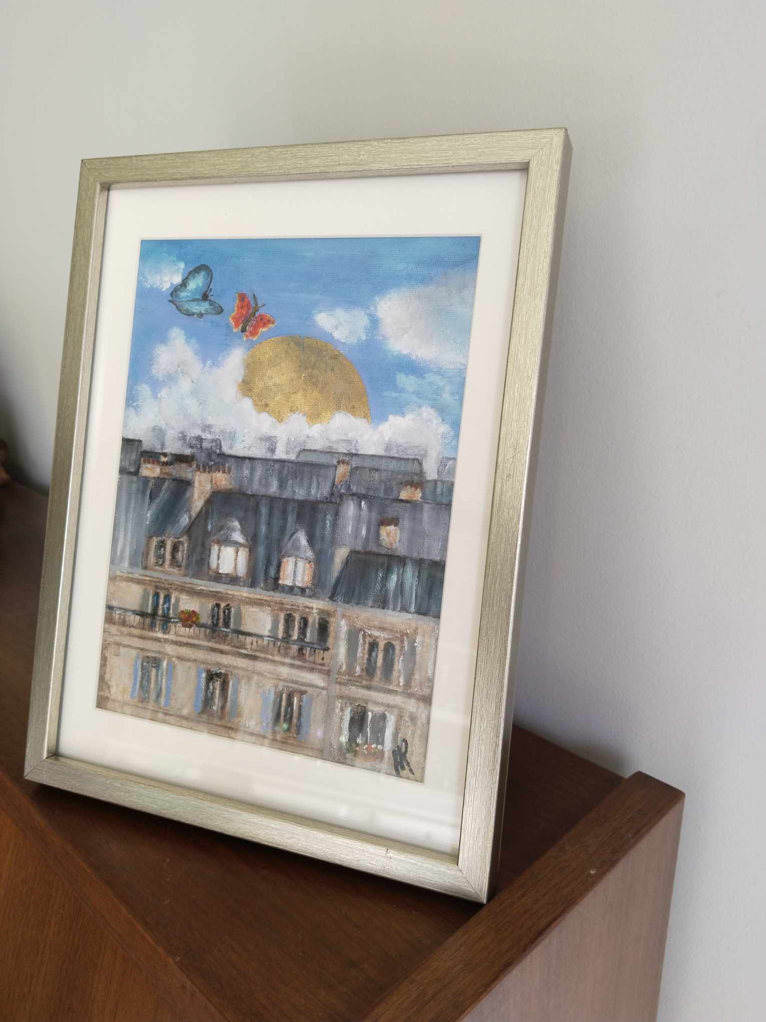 Cette peinture acrylique sur toile, sublimée par de la feuille dorée et protégée par une finition vernis, offre une vue poétique sur les toits de Paris. Un grand soleil éclaire le ciel bleu, ponctué de nuages légers, tandis que des papillons colorés apportent une touche de mouvement et de légèreté. L’œuvre, de 21 x 15 cm sans cadre, est présentée dans un cadre argenté sous verre avec passe-partout, pour une dimension finale de 26 x 20 cm, à poser ou accrocher. Idéale pour les amateurs d’art contemporain inspiré de Paris, cette création associe éclat lumineux, raffinement et modernité.