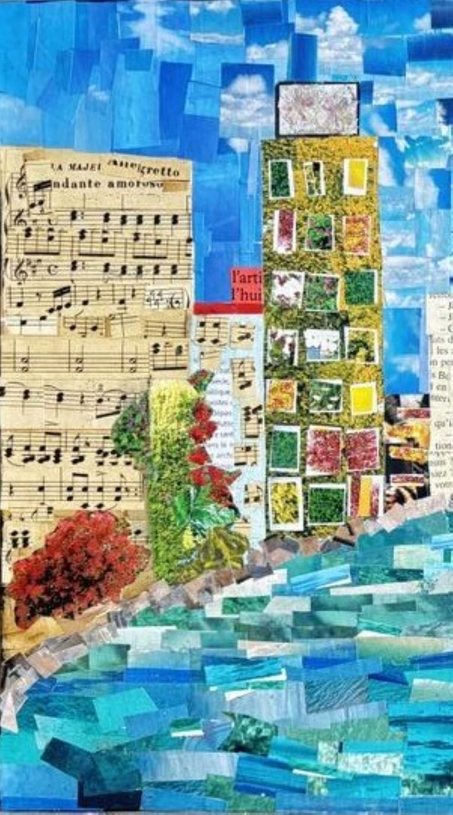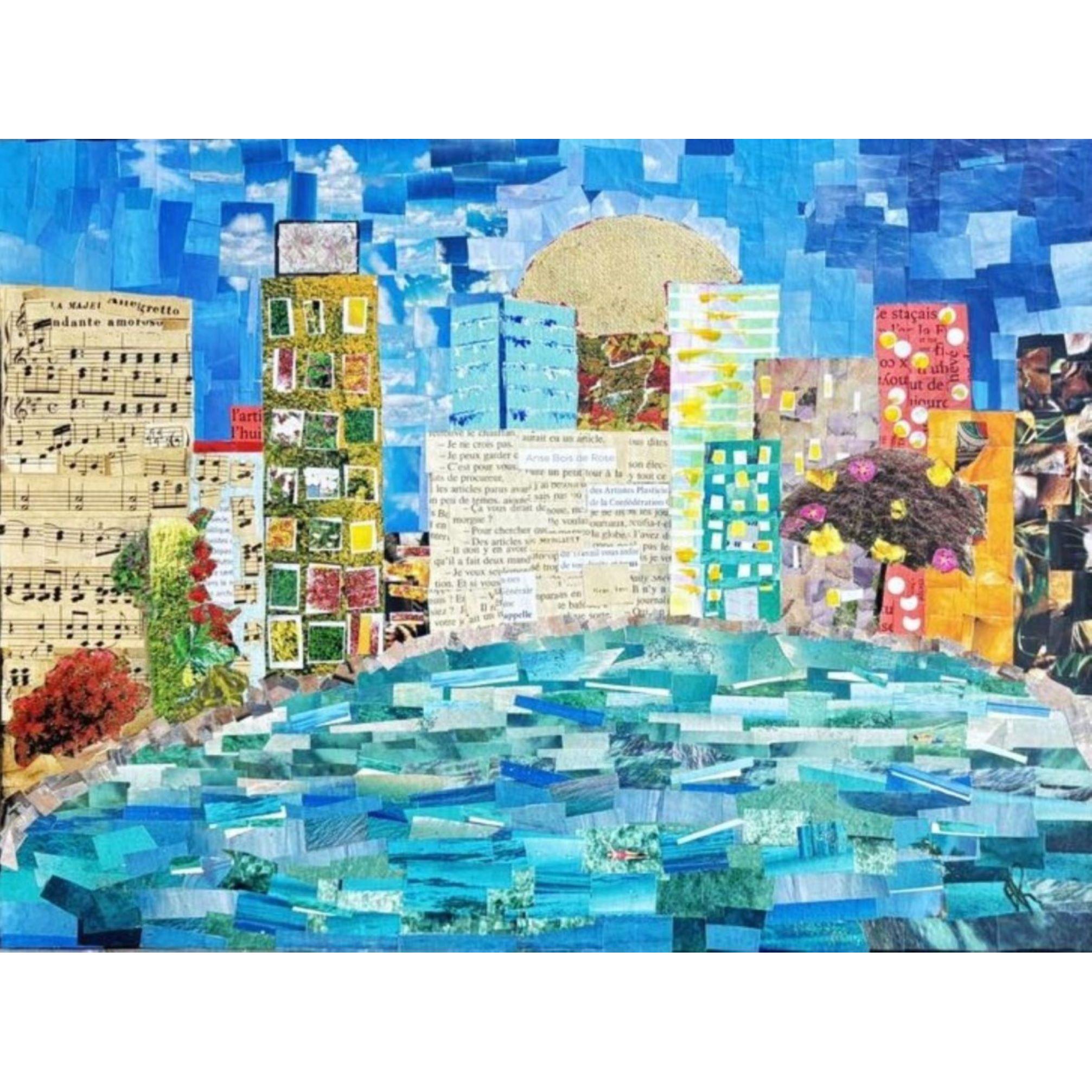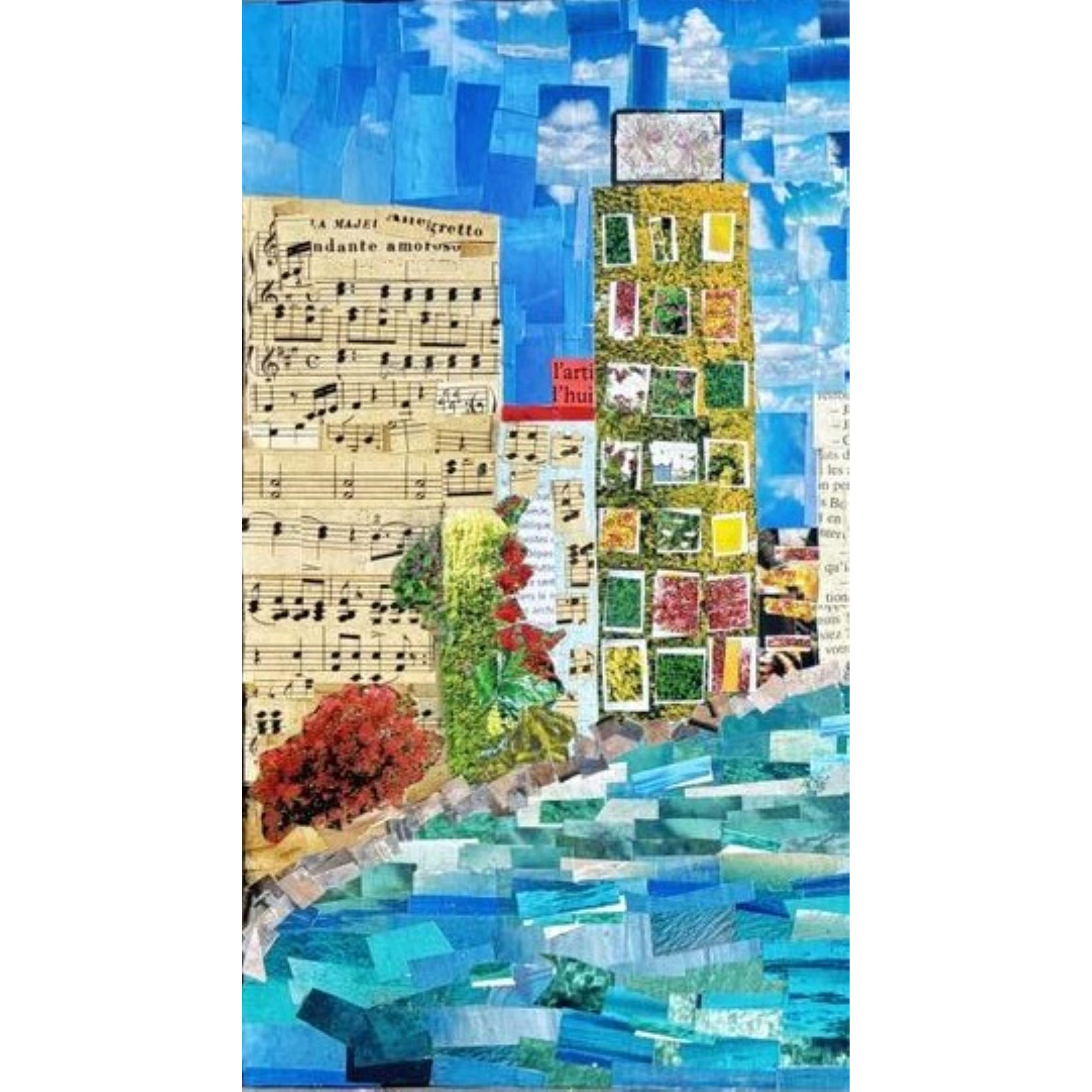 Sous un soleil d'or éclatant, ce petit tableau prend vie grâce à sa technique de collage figuratif et original, mêlant feuilles dorées et argentées ainsi que des paillettes scintillantes. Devant un rivage paisible, des tours élancées s’élèvent dans des nuances subtiles de bleu, chaque morceau de papier capturant une lumière différente. En s’approchant, on découvre deux petits nageurs qui jouent à se cacher, un détail malicieux qui invite à la curiosité et au rêve. La toile entoilée sur châssis mesure 30 x 40 cm, avec une finition vernis qui protège et fait briller l'ensemble.