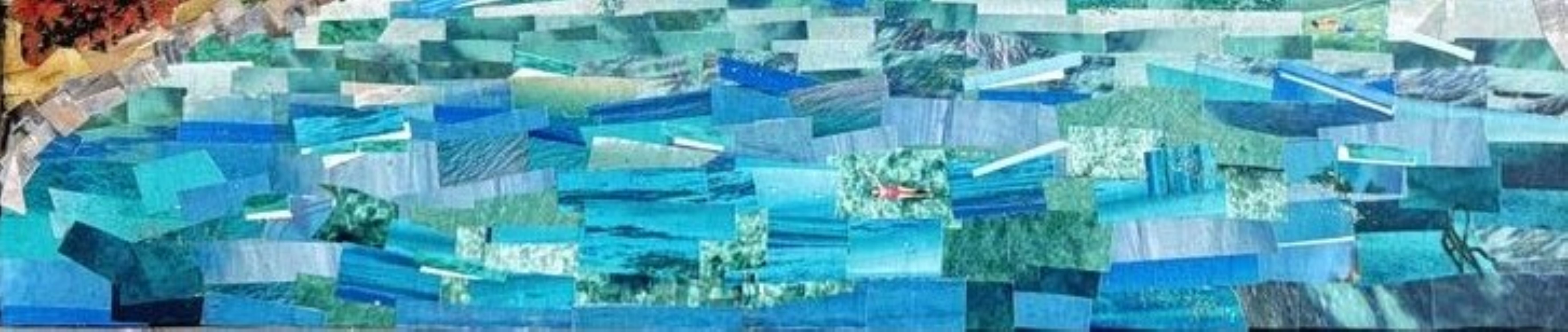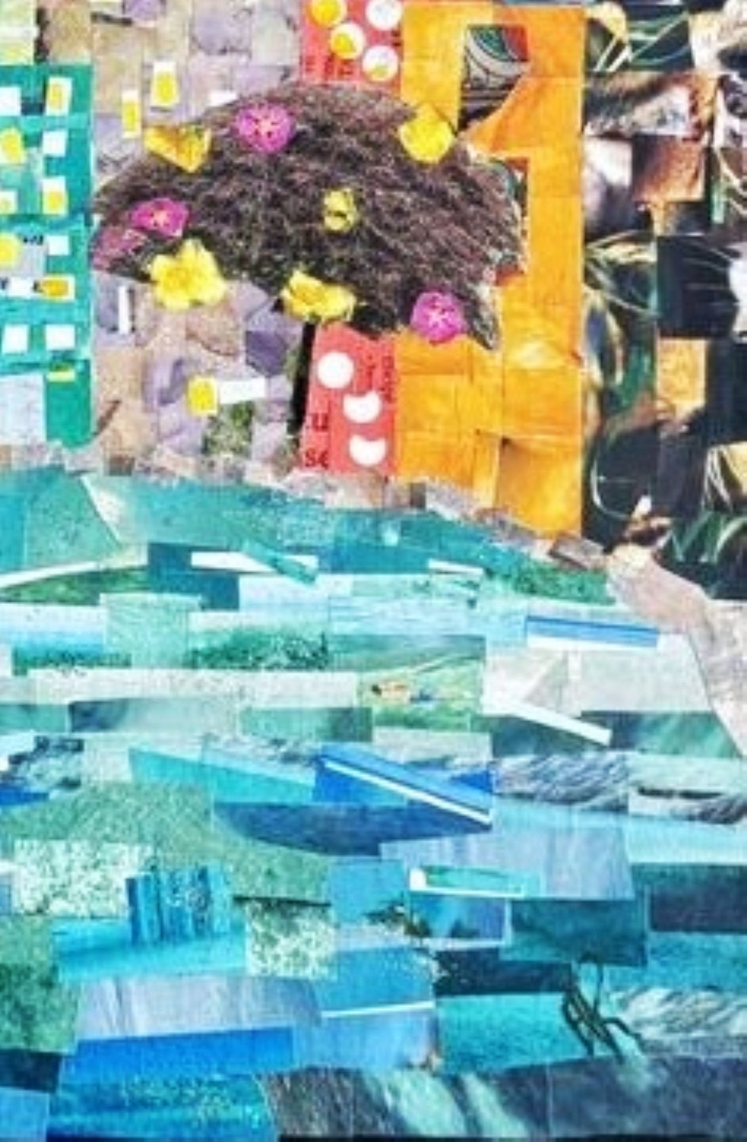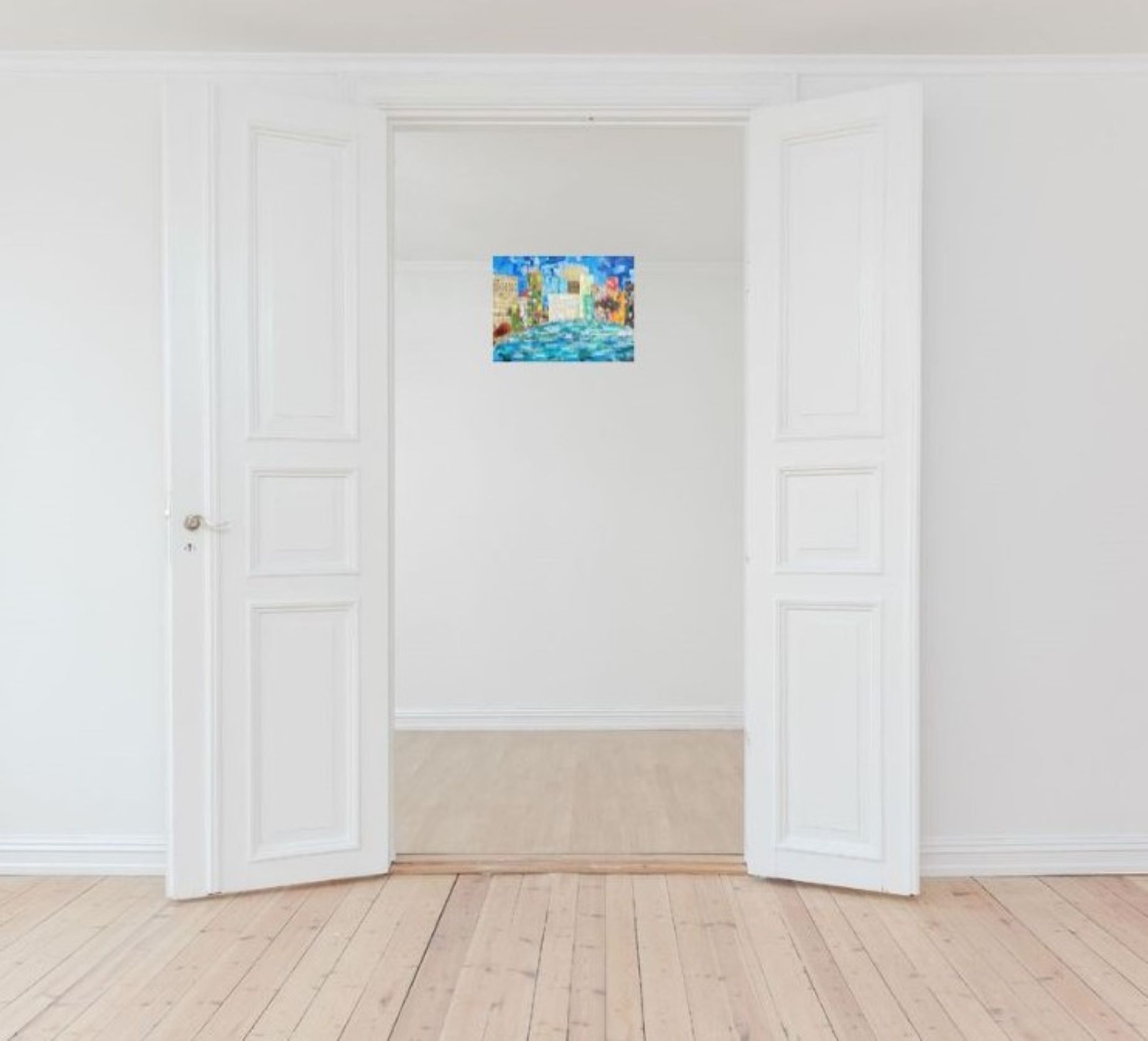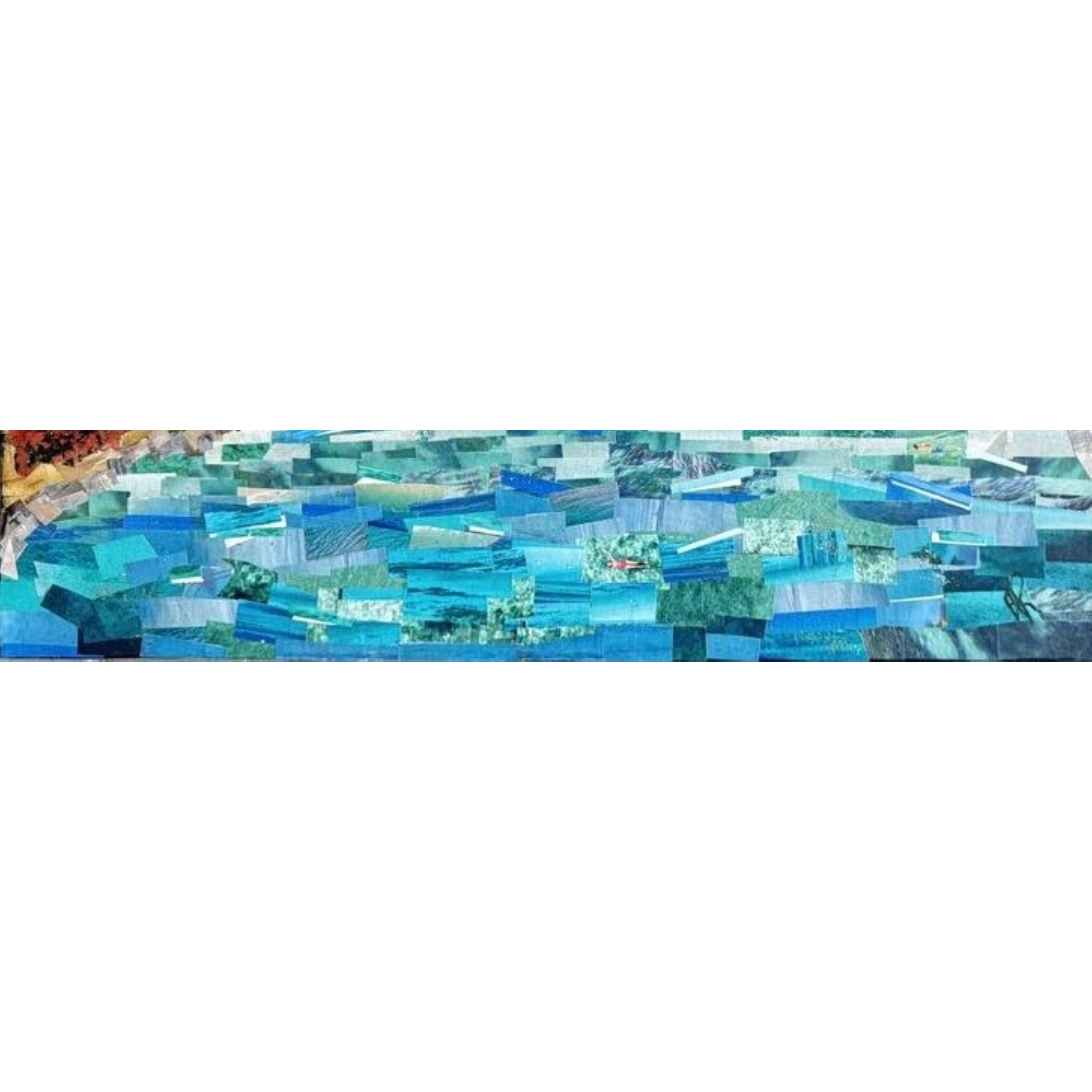 Sous un soleil d'or éclatant, ce petit tableau prend vie grâce à sa technique de collage figuratif et original, mêlant feuilles dorées et argentées ainsi que des paillettes scintillantes. Devant un rivage paisible, des tours élancées s’élèvent dans des nuances subtiles de bleu, chaque morceau de papier capturant une lumière différente. En s’approchant, on découvre deux petits nageurs qui jouent à se cacher, un détail malicieux qui invite à la curiosité et au rêve. La toile entoilée sur châssis mesure 30 x 40 cm, avec une finition vernis qui protège et fait briller l'ensemble.