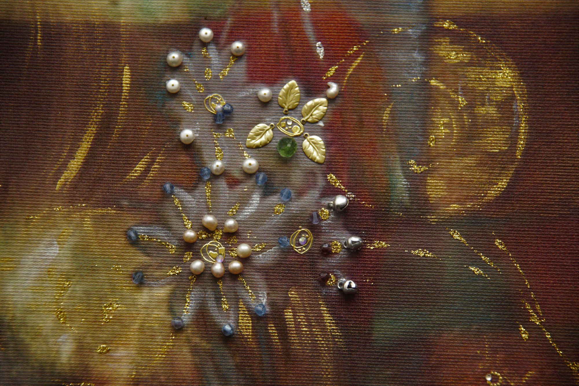 - Pittografia gioiello: Cristalli e perle applicati sulla tela