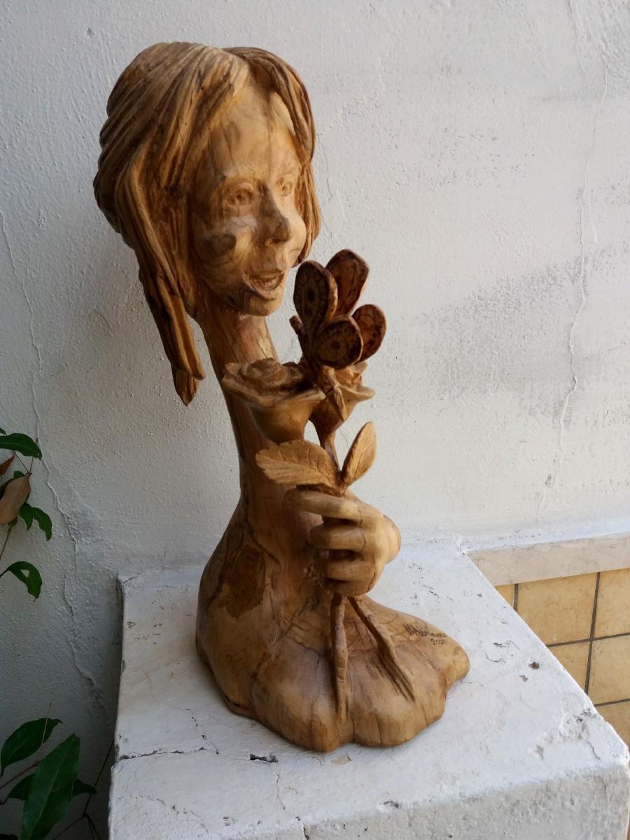 La scultura, realizzata su legno stagionato di ulivo, rappresenta un momento di incontro meraviglioso tra una bambina e una farfalla.