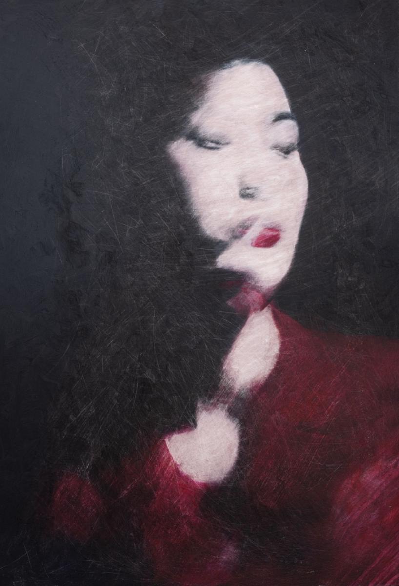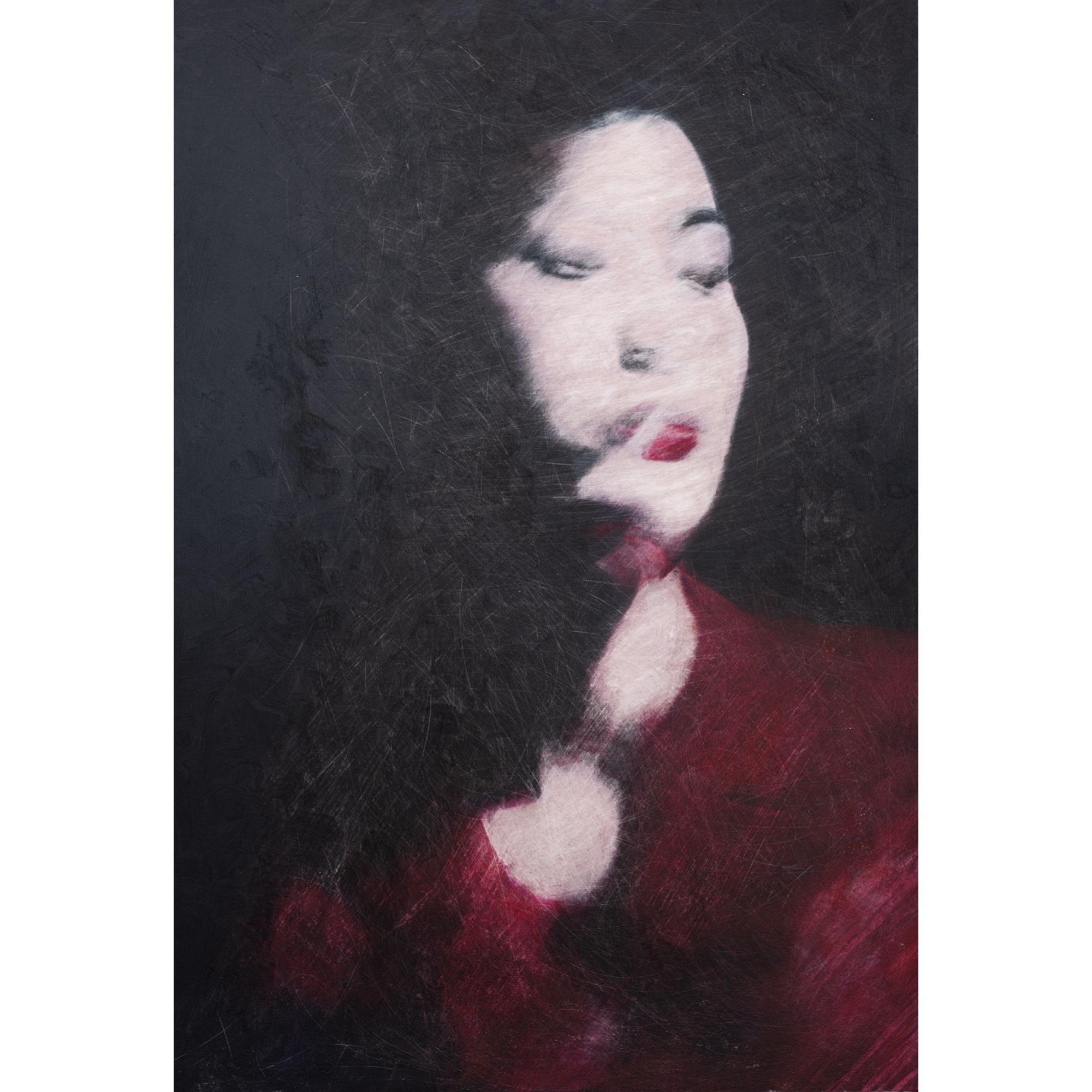 In quest’opera, Antonio Schiavano ha voluto esplorare il concetto di emersione e oscuramento. La figura femminile sembra scaturire direttamente da un buio assoluto, un vuoto profondo che tenta di riassorbirla. Il rosso vibrante dell’abito e delle labbra rappresenta, per l’artista, la pulsione vitale, la “bellezza” (the beauty) intesa come passione e presenza, che però appare quasi velata. Attraverso i graffi profondi e i segni abrasivi che infligge alla superficie, Schiavano cerca di dare corpo alla “rovina” (the bane): quel rumore di fondo che frammenta i nostri ricordi e le nostre certezze. Gli occhi della protagonista suggeriscono un ripiegamento interiore, un rifiuto del mondo esterno per preservare un’integrità che la realtà circostante graffia incessantemente. L’opera non è un ritratto statico, ma il fermo immagine di una metamorfosi: la bellezza non è qualcosa di intoccabile, ma un valore che splende con più forza proprio mentre viene consumato.