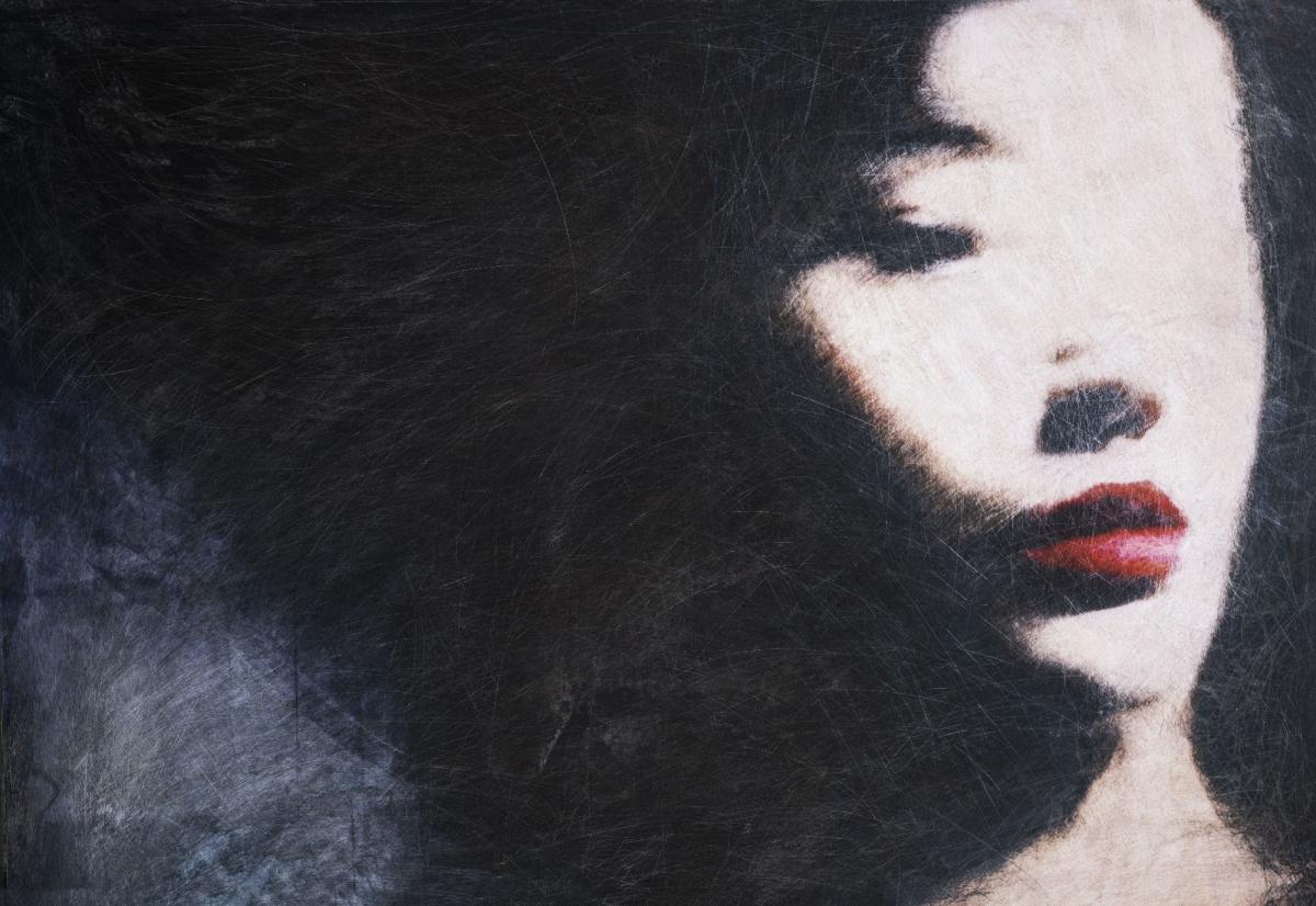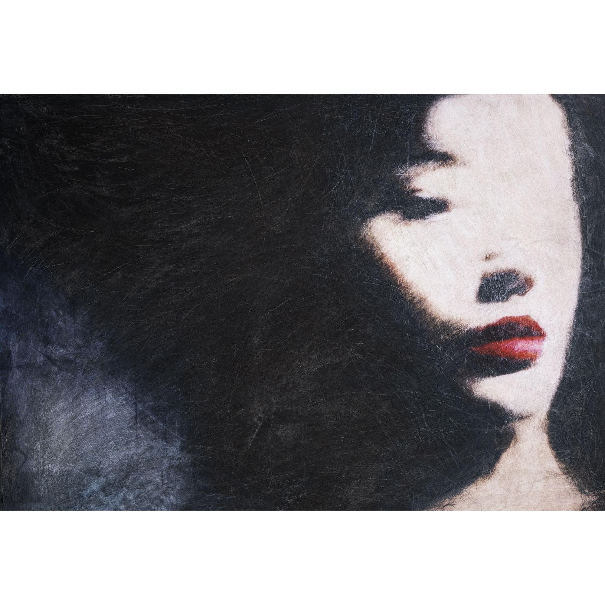 La composizione di quest'opera è dominata da un’ombra profonda e vibrante che sembra voler cancellare i tratti somatici, lasciando emergere solo i punti di massima tensione emotiva: il rosso intenso delle labbra e l’accenno degli occhi. In quest’opera, il concetto di “bellezza” (the beauty) è ridotto all’essenziale, a un ricordo sbiadito ma persistente che lotta per non essere inghiottito dall’oscurità circostante. Attraverso i segni che incide sulla superficie, Schiavano porta alla luce la “rovina” (the bane) non come elemento distruttivo, ma come parte integrante dell’identità. I graffi che attraversano il buio appaiono come lampi di consapevolezza o ferite aperte, rendendo il soggetto reale, tangibile e umano. L’opera si propone come un invito a smettere di cercare la perfezione e a trovare la verità nel contrasto, nel graffio, in ciò che resta quando tutto il superfluo viene rimosso. Non si tratta di un vuoto, ma di una presenza che si afferma con forza proprio attraverso il mistero di ciò che non viene svelato.