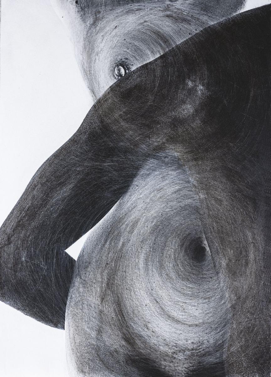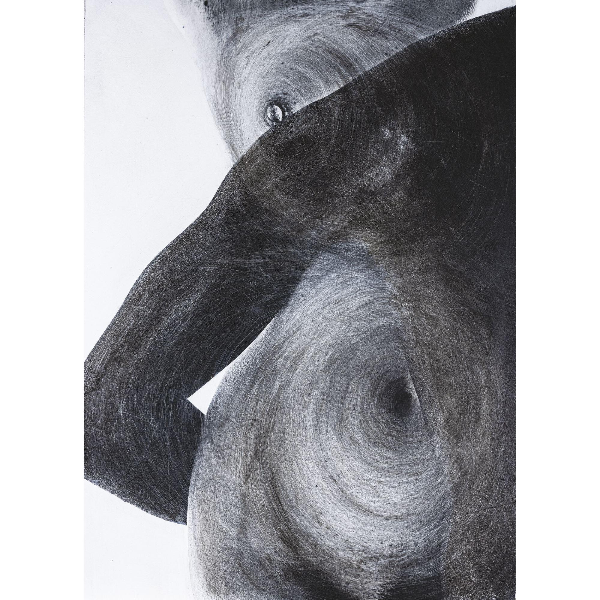 In quest’opera della serie OltreLaPelle, Antonio Schiavano ritrae una donna che si erge frontalmente, attraversata da segni che incidono la sua pelle come simboli. Attorno all’ombelico e a uno dei seni, i graffi disegnano quasi un infinito incompiuto, un circuito che parla di ciclicità e di ritorno. Il braccio dell’uomo che la cinge diventa il segno di un legame, di una promessa. Per l’artista, la nudità non è semplice esposizione, ma rivelazione: è nel corpo che si inscrive il dialogo tra differenza e somiglianza, tra lontananza e appartenenza. La bellezza, in quest’opera, è un segno che non si cancella.