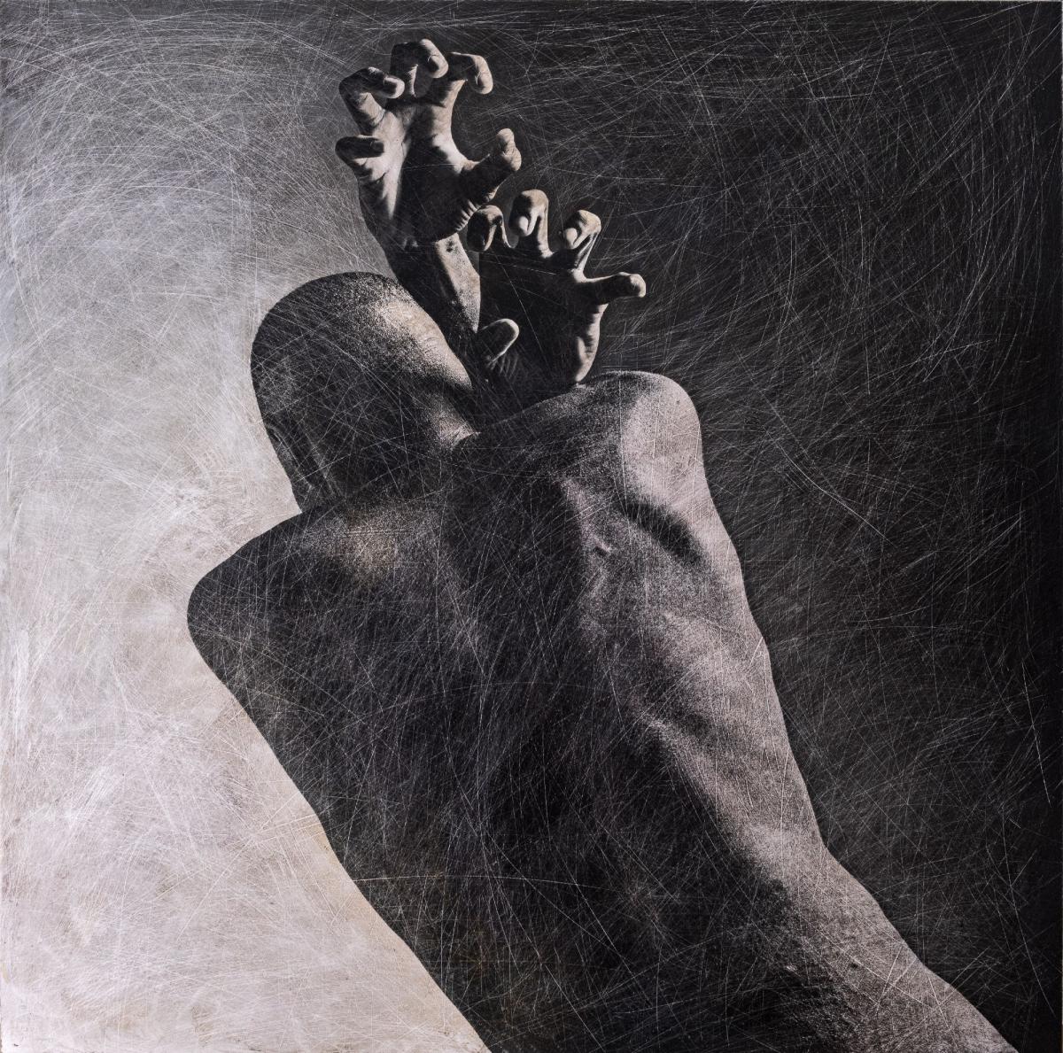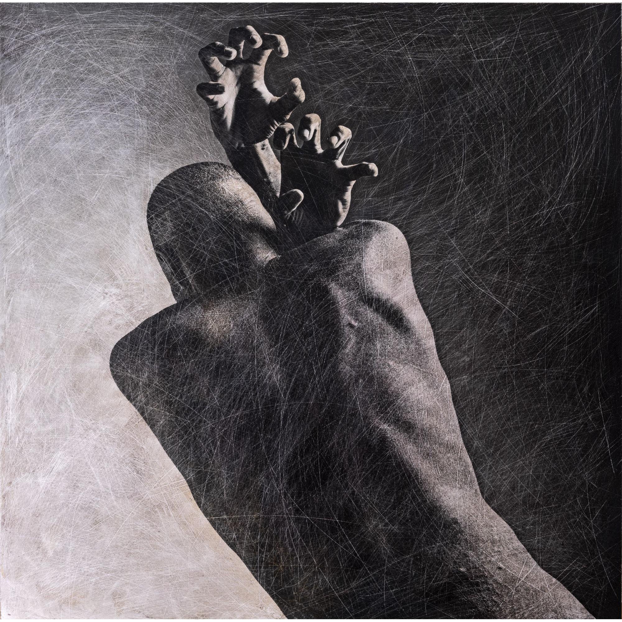 In quest’opera, Antonio Schiavano indaga l’eterno conflitto tra l’armonia della forma umana e il “flagello” dell’esistenza. L’artista utilizza la sua tecnica distintiva, la Fotomorfia: un’ibridazione in cui la fotografia incontra l’intervento materico diretto. Non si limita a scattare, ma viola la superficie della stampa graffiandola, creando una ragnatela di segni che simboleggiano il tempo e le ferite invisibili dell’anima. Schiavano sceglie di ritrarre il soggetto di spalle per universalizzarlo, spogliandolo dell’identità e concentrandosi sull’essenza. Il fulcro emotivo risiede nelle mani, tese e contratte, simili a radici o artigli che fendono l’aria sopra la testa. È una posa di estrema tensione, un gesto ambiguo tra la disperazione di chi cerca protezione e la forza di chi tenta di liberarsi da un peso invisibile. Attraverso la materia abrasa, l’artista racconta la resilienza: una bellezza che non solo sopravvive, ma si definisce proprio attraverso le sue cicatrici.